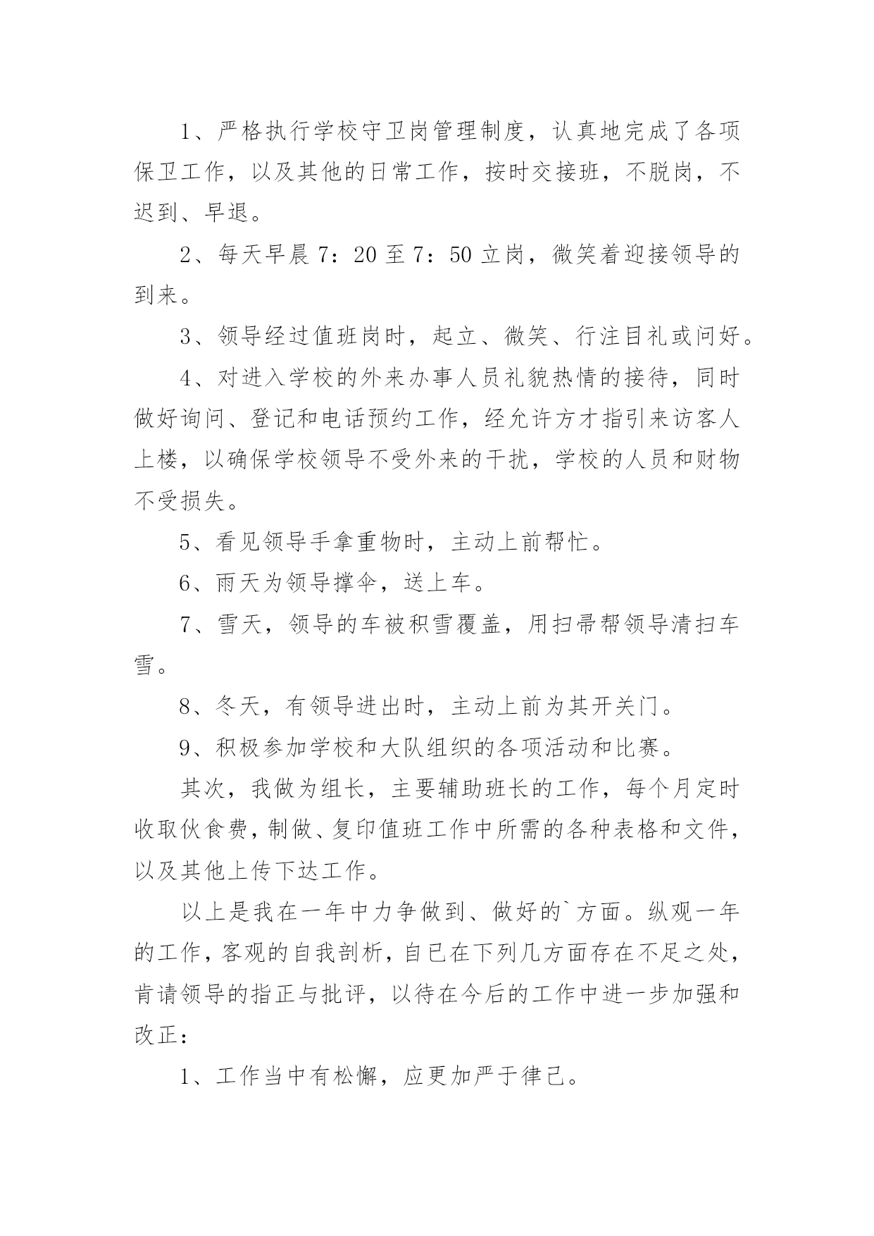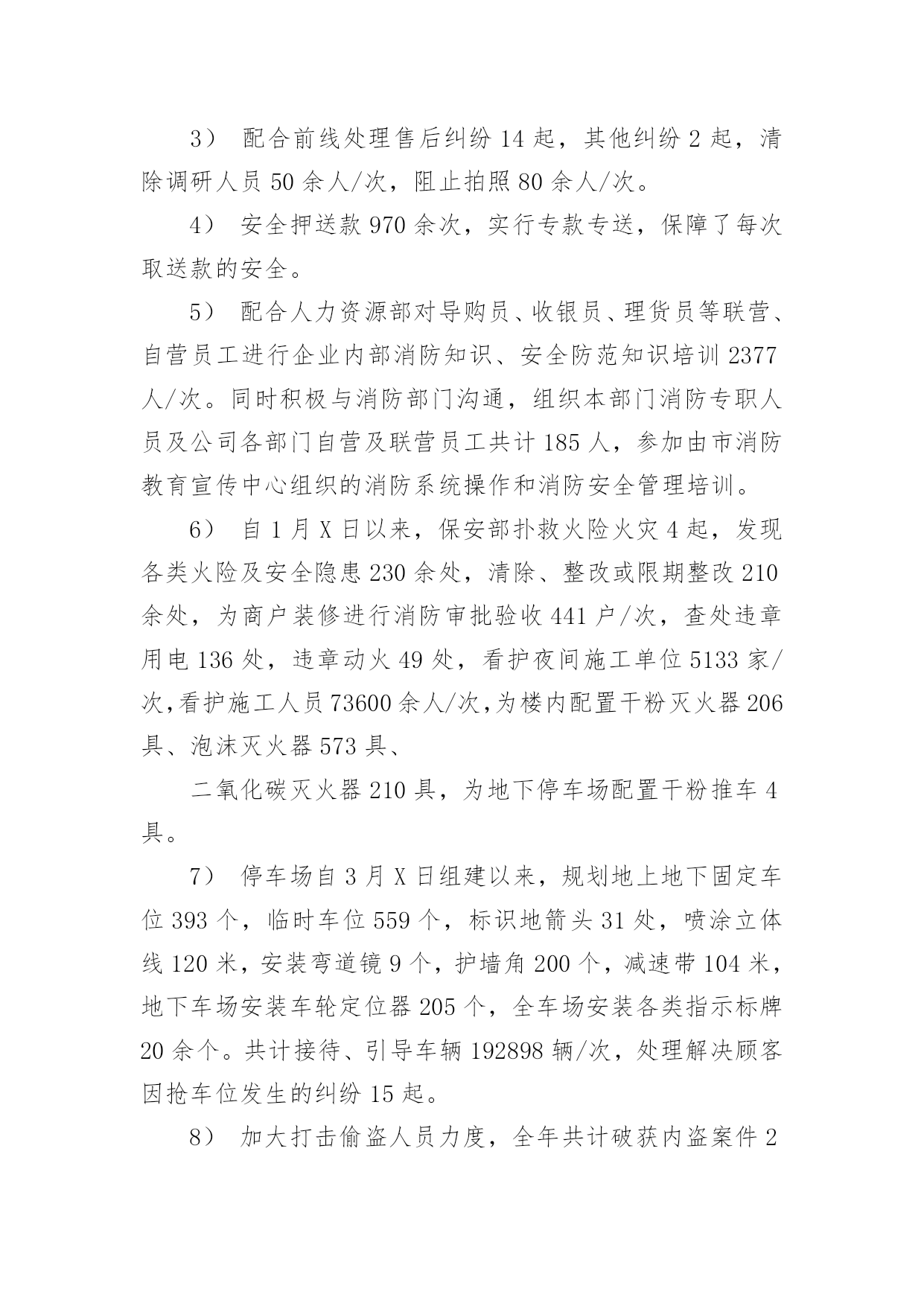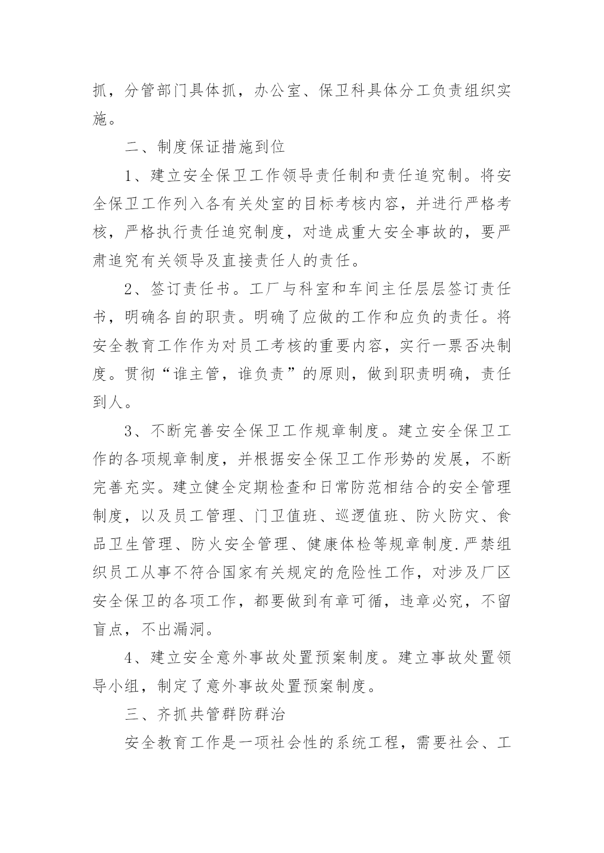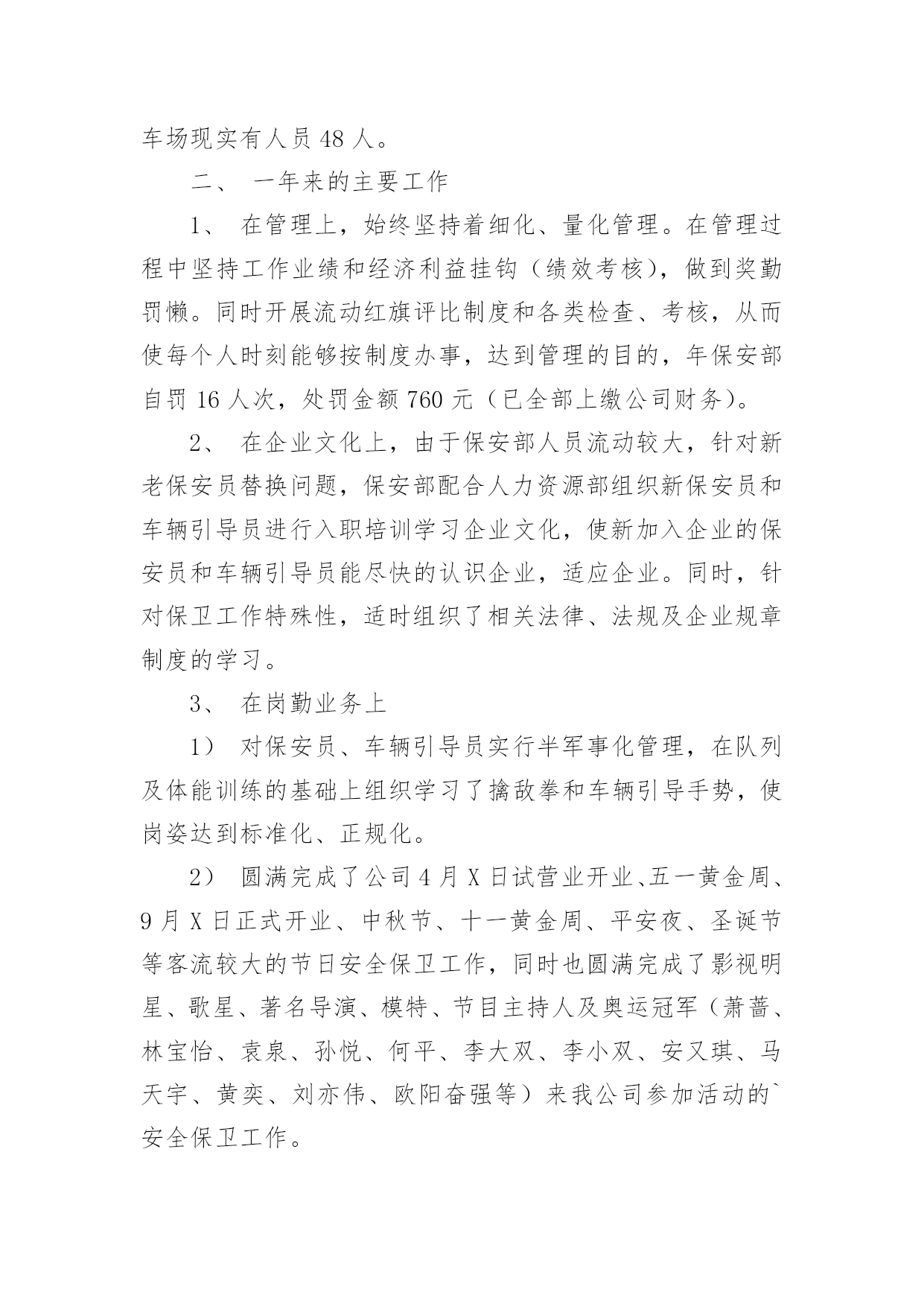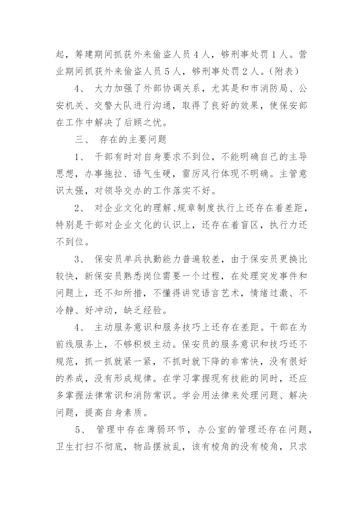 保安工作总结保安工作总结总结是事后对某一阶段的学习或工作情况作加以回顾检查并分析评价的书面材料,它可以有效锻炼我们的语言组织能力,因此我们需要回头归纳,写一份总结了。总结你想好怎么写了吗?下面是小编收集整理的保安工作总结,欢迎阅读,希望大家能够喜欢。保安工作总结篇120xx年过去了,新的一年又来了,为了把新的一年工作做得更好,现在对过去一年工作简要回顾并总结一下。一、20xx年工作回顾1、采用各种方式提高安保人员业务技能,提高质量的安保服务过去的一年是不平凡的一年。我们xxx的安保人员流动频繁,年龄偏大,平均年龄在50岁以上。文化水平、保安人员素质偏低。针对这一状况,在公司领导的大力支持下,我作为安保队长狠抓了安保人员技术业务素质的培训,,每周都进行队列、队形保安人员技能的培训,推行安保文明用语,限度为提供安保服务。2、根据不同的天气季节,采用灵活安排人员,抓住各项工作的重点,做好xxx的`安全防范工作xxx的安保工作重点为水面安全,公共设施安全防范以及防火防盗。这是一项长期的任务,白天的安保工作主要是水面设施的安全防范。时刻做好设施的监视,要求队员对重点岗点每两小时巡逻检查一次,发现问题及时向管理处、保安队长汇报并做好水面设施巡查记录。夜间安保工作重点做好湖面及公共设施的防盗工作,发现有偷盗行为立即向管理处的值班人员反应,拨打110电话,并配合派出所民警共同制止。秋冬季来临时,风景区比较干燥,时刻都有火情火险情况发生。我们保安队在这段时间除了做好队形队列保安技能培训外,有针对性的进行消防知识技能讲解及消防器材性能使用方法的培训,要求队员针对不同的险情选用不同的消防器材,做好火灾的扑救,降低火灾带来的财产损失。二、20xx工作打算新的一年开始了,我们xxx保安队今年的工作一是抓好人员的培训教育,提高安保人员的安保技能,二是积极与管理处配合,开展xxx的各种保安服务工作,为全面提升风景区公共形象做出应有的贡献。保安工作总结篇220xx年在工厂领导下,坚持预防为主、防治结合、加强教育、群防群治的原则,通过安全教育,增强员工的安全意识和自我防护能力;通过齐抓共管,营造员工关心和支持安全工作的局面,从而切实保障员工安全和财产不受损失,维护厂区正常的生产秩序。一、领导重视措施有力为进一步做好安全教育工作,切实加强对安全教育工作的.领导,把安全工作列入重要议事日程,工厂总经理直接抓,分管部门具体抓,办公室、保卫科具体分工负责组织实施。二、制度保证措施到位1、建立安全保卫工作领导责任制和责任追究制。将安全保卫工作列入各有关处室的目标考核内容,并进行严格考核,严格执行责任追究制度,对造成重大安全事故的,要严肃追究有关领导及直接责任人的责任。2、签订责任书。工厂与科室和车间主任层层签订责任书,明确各自的职责。明确了应做的工作和应负的责任。将安全教育工作作为对员工考核的重要内容,实行一票否决制度。贯彻“谁主管,谁负责”的原则,做到职责明确,责任到人。3、不断完善安全保卫工作规章制度。建立安全保卫工作的各项规章制度,并根据安全保卫工作形势的发展,不断完善充实。建立健全定期检查和日常防范相结合的安全管理制度,以及员工管理、门卫值班、巡逻值班、防火防灾、食品卫生管理、防火安全管理、健康体检等规章制度.严禁组织员工从事不符合国家有关规定的危险性工作,对涉及厂区安全保卫的各项工作,都要做到有章可循,违章必究,不留盲点,不出漏洞。4、建立安全意外事故处置预案制度。建立事故处置领导小组,制定了意外事故处置预案制度。三、齐抓共管群防群治安全教育工作是一项社会性的系统工程,需要社会、工厂、家庭的密切配合。我们积极与市公安、卫生、综合治理等部门通力合作,做好工厂安全保卫工作,学校组织开展一系列道德、法制教育活动,取得了良好的教育效果。四、加强教育,促进自护我们以安全教育周为重点,经常性地对员工开展安全教育,特别是抓好交通、大型活动等的安全教育。认真做好安全教育周工作。安全教育周以厂区安全为主题,在安全教育周期间,组织学习安全教育工作文件,对厂区易发事故类型、重点部位保护、工作薄弱环节、各类人员安全意识与安全技能等方面,开展深入全面的大检查,消除隐患,有针对地扎实地开展教育和防范工作。五、加强检查,及时整改开展常规检查。把安全教育工作作为重点检查内容之一。对厂区进行全面的安全检查。冬季工厂对电线和宿舍区进行防火安全检查。保安工作总结篇3光阴似箭日月如梭,转眼已近岁末,似乎去年圣诞的钟声还响在耳边,实感时间的飞逝,让我们的脚步也显得如此匆忙。可细细品味,却也发觉自己在不轻易间成熟了许多。回顾20xx年这一年来的工作,我的感受很多,收获也颇丰。在学校、大队以及小队领导的关心和领导下,在同事们的支持与帮助下,取得了一些成绩,现将这一年的工作总结如下:首先,我作为一名保安