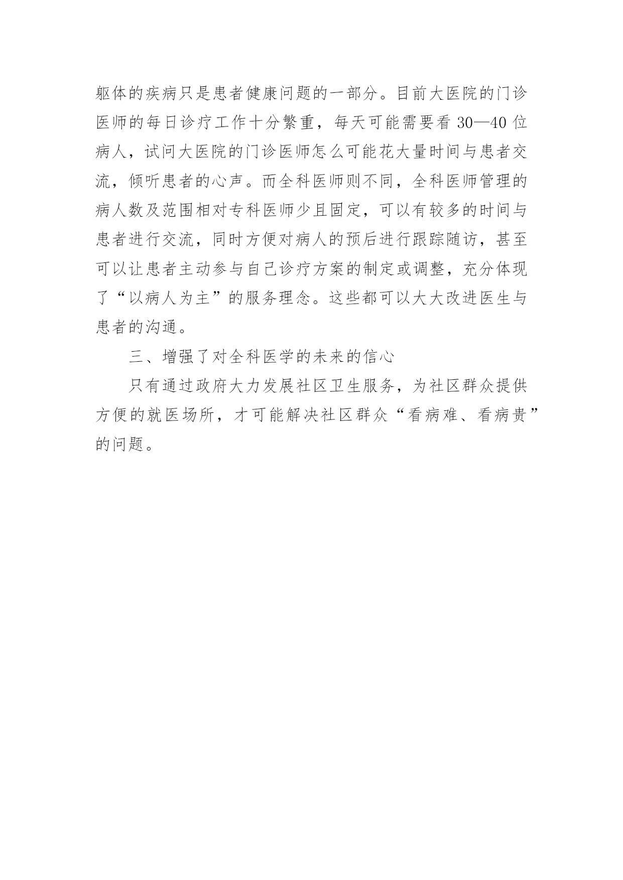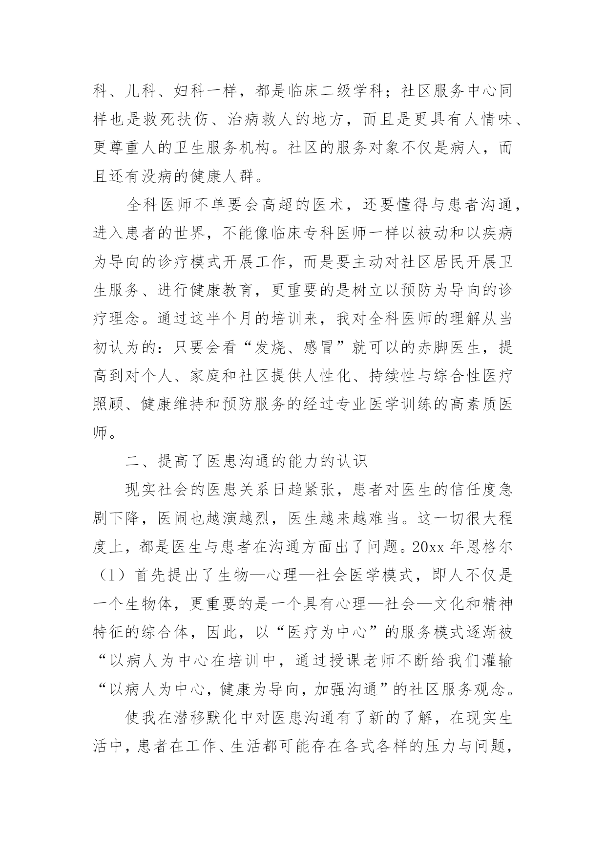 医生岗前培训心得医生岗前培训心得范文我们在一些事情上受到启发后,好好地写一份心得体会,这样有利于培养我们思考的习惯。那么如何写心得体会才能更有感染力呢?下面是小编帮大家整理的医生岗前培训心得范文,仅供参考,大家一起来看看吧。有幸参加了xx市举办的全科医师骨干培训。此次培训的目的是培养全科医师的全科医疗思维和社区服务理念、管理经营技巧和应变能力,通过对学员进行系统的现代全科专业知识的学习和技能的训练,提高了全科医师的管理、服务能力和水平,加强沟通技巧,塑造和谐、向上的全科团队精神和工作氛围。培训内容从全科医学概论、全科意思实践等方面分别进行了阐述,提出的观点清新隽永、思维的触角纵横腾跃,以浅显而富有说服力的举例和互动教学。让学员真正参与并积极思考,使这次培训取得了较好的效果,也使我受益匪浅。一、明确了全科医师的位置和任务全科医师、全科医学、社区中心在以前,对我来说还是一个模糊的概念,我以为全科医师只是在基层看看小病,开开药品的低水平医师。但通过了近一段时间的理论学习,我对全科医学有了一个正确的认识。全科医学和临床内科、外科、儿科、妇科一样,都是临床二级学科;社区服务中心同样也是救死扶伤、治病救人的地方,而且是更具有人情味、更尊重人的卫生服务机构。社区的服务对象不仅是病人,而且还有没病的健康人群。全科医师不单要会高超的医术,还要懂得与患者沟通,进入患者的世界,不能像临床专科医师一样以被动和以疾病为导向的诊疗模式开展工作,而是要主动对社区居民开展卫生服务、进行健康教育,更重要的是树立以预防为导向的诊疗理念。通过这半个月的培训来,我对全科医师的理解从当初认为的:只要会看“发烧、感冒”就可以的赤脚医生,提高到对个人、家庭和社区提供人性化、持续性与综合性医疗照顾、健康维持和预防服务的经过专业医学训练的高素质医师。二、提高了医患沟通的能力的认识现实社会的医患关系日趋紧张,患者对医生的信任度急剧下降,医闹也越演越烈,医生越来越难当。这一切很大程度上,都是医生与患者在沟通方面出了问题。20xx年恩格尔(l)首先提出了生物—心理—社会医学模式,即人不仅是一个生物体,更重要的是一个具有心理—社会—文化和精神特征的综合体,因此,以“医疗为中心”的服务模式逐渐被“以病人为中心在培训中,通过授课老师不断给我们灌输“以病人为中心,健康为导向,加强沟通”的社区服务观念。使我在潜移默化中对医患沟通有了新的了解,在现实生活中,患者在工作、生活都可能存在各式各样的压力与问题,躯体的疾病只是患者健康问题的一部分。目前大医院的门诊医师的每日诊疗工作十分繁重,每天可能需要看30—40位病人,试问大医院的门诊医师怎么可能花大量时间与患者交流,倾听患者的心声。而全科医师则不同,全科医师管理的病人数及范围相对专科医师少且固定,可以有较多的时间与患者进行交流,同时方便对病人的预后进行跟踪随访,甚至可以让患者主动参与自己诊疗方案的制定或调整,充分体现了“以病人为主”的服务理念。这些都可以大大改进医生与患者的沟通。三、增强了对全科医学的未来的信心只有通过政府大力发展社区卫生服务,为社区群众提供方便的就医场所,才可能解决社区群众“看病难、看病贵”的问题。
