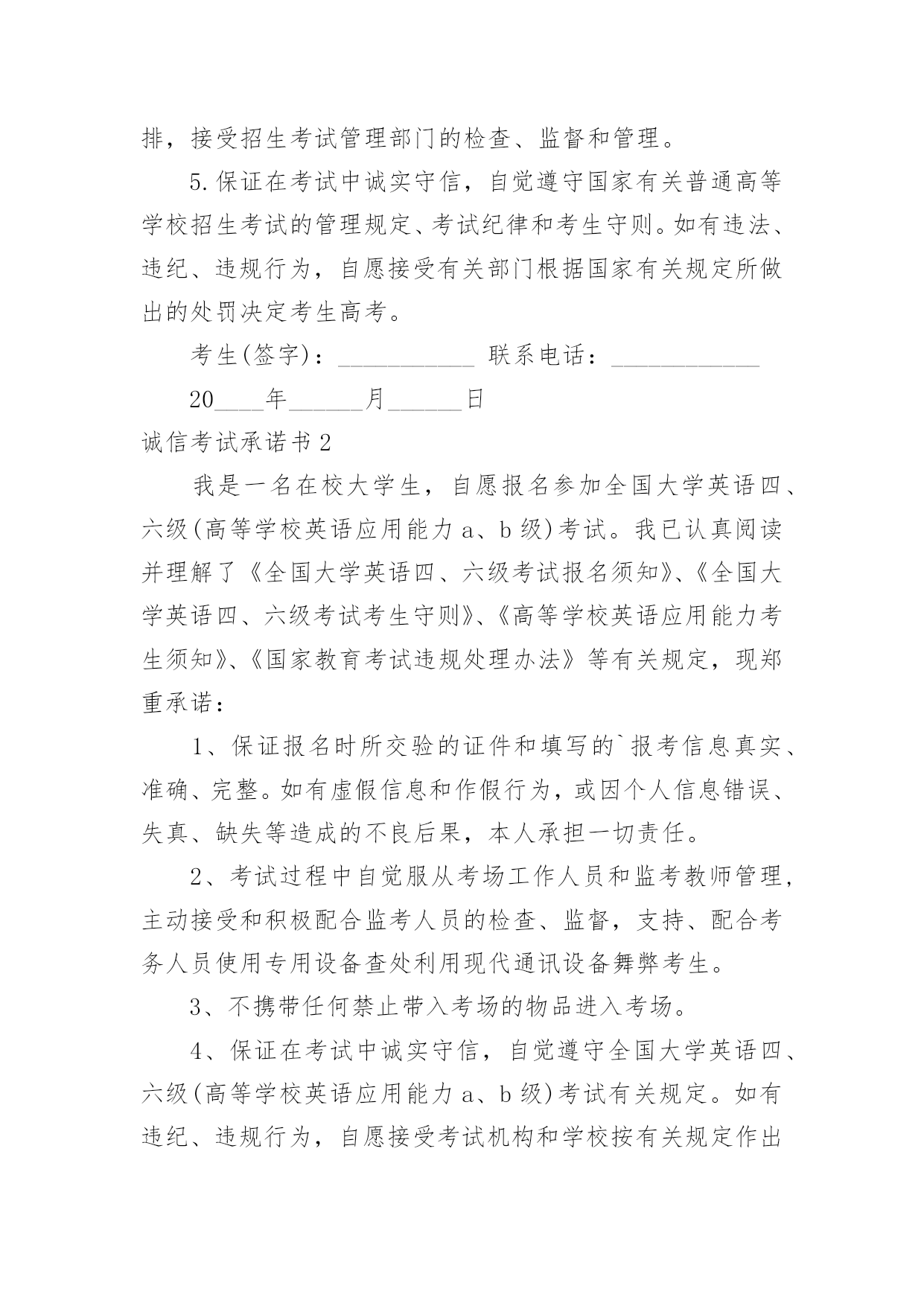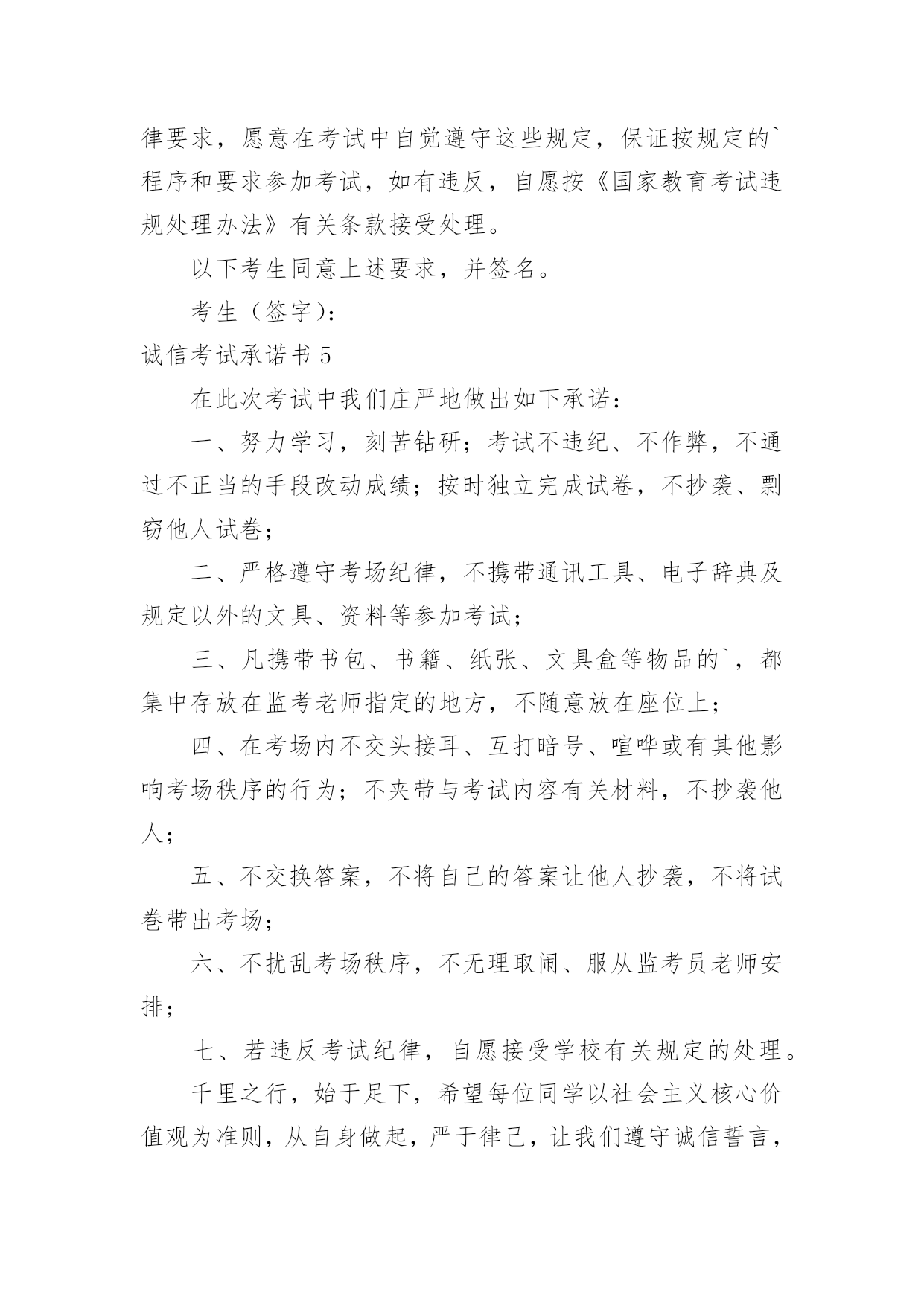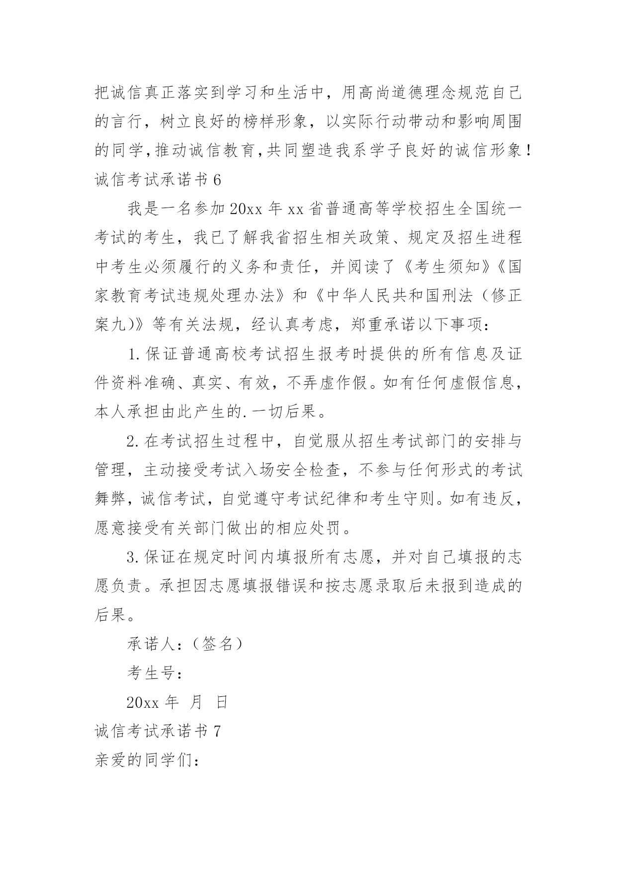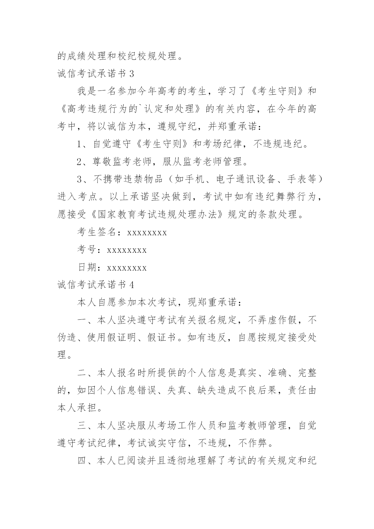 诚信考试承诺书【热】诚信考试承诺书在日常生活和工作中,越来越多人会去使用承诺书,承诺书仅是一方的声明及义务性的认可,其法律效力与合同是不同的。那要怎么写好承诺书呢?以下是小编精心整理的诚信考试承诺书,希望对大家有所帮助。诚信考试承诺书1我申请参加贵院20____年自主招生考试,已阅读和了解学校的《考生守则》、《对违反规定行为的处理》、《国家教育考试违规处理办法》等有关规定。根据这些规定,本人郑重承诺以下事项:1.自愿遵守浙江省教育考试院相关规定,只报考一所院校。若同时报考二所以上(含二所)院校,愿意承担由此引起的相关责任。本人被录取后不参加当年高考和高职单考单招。2.保证自己是符合高考或单考单招报考条件,并已办理高考或单考单招报名手续的高中毕业生,准确向贵院提供本人的真实信息,并愿意承担所提供信息与事实不符可能引起的相关责任。3.保证报名时所提交的报考材料和证件真实、准确。如有虚假信息和作假行为,本人承担由此而产生的`一切后果。4.在招生考试过程中,自觉服从招生考试管理部门的安排,接受招生考试管理部门的检查、监督和管理。5.保证在考试中诚实守信,自觉遵守国家有关普通高等学校招生考试的管理规定、考试纪律和考生守则。如有违法、违纪、违规行为,自愿接受有关部门根据国家有关规定所做出的处罚决定考生高考。考生(签字):___________联系电话:____________20____年______月______日诚信考试承诺书2我是一名在校大学生,自愿报名参加全国大学英语四、六级(高等学校英语应用能力a、b级)考试。我已认真阅读并理解了《全国大学英语四、六级考试报名须知》、《全国大学英语四、六级考试考生守则》、《高等学校英语应用能力考生须知》、《国家教育考试违规处理办法》等有关规定,现郑重承诺:1、保证报名时所交验的证件和填写的`报考信息真实、准确、完整。如有虚假信息和作假行为,或因个人信息错误、失真、缺失等造成的不良后果,本人承担一切责任。2、考试过程中自觉服从考场工作人员和监考教师管理,主动接受和积极配合监考人员的检查、监督,支持、配合考务人员使用专用设备查处利用现代通讯设备舞弊考生。3、不携带任何禁止带入考场的物品进入考场。4、保证在考试中诚实守信,自觉遵守全国大学英语四、六级(高等学校英语应用能力a、b级)考试有关规定。如有违纪、违规行为,自愿接受考试机构和学校按有关规定作出的成绩处理和校纪校规处理。诚信考试承诺书3我是一名参加今年高考的考生,学习了《考生守则》和《高考违规行为的`认定和处理》的有关内容,在今年的高考中,将以诚信为本,遵规守纪,并郑重承诺:1、自觉遵守《考生守则》和考场纪律,不违规违纪。2、尊敬监考老师,服从监考老师管理。3、不携带违禁物品(如手机、电子通讯设备、手表等)进入考点。以上承诺坚决做到,考试中如有违纪舞弊行为,愿接受《国家教育考试违规处理办法》规定的条款处理。考生签名:xxxxxxxx考号:xxxxxxxx日期:xxxxxxxx诚信考试承诺书4本人自愿参加本次考试,现郑重承诺:一、本人坚决遵守考试有关报名规定,不弄虚作假,不伪造、使用假证明、假证书。如有违反,自愿按规定接受处理。二、本人报名时所提供的个人信息是真实、准确、完整的,如因个人信息错误、失真、缺失造成不良后果,责任由本人承担。三、本人坚决服从考场工作人员和监考教师管理,自觉遵守考试纪律,考试诚实守信,不违规,不作弊。四、本人已阅读并且透彻地理解了考试的有关规定和纪律要求,愿意在考试中自觉遵守这些规定,保证按规定的`程序和要求参加考试,如有违反,自愿按《国家教育考试违规处理办法》有关条款接受处理。以下考生同意上述要求,并签名。考生(签字):诚信考试承诺书5在此次考试中我们庄严地做出如下承诺:一、努力学习,刻苦钻研;考试不违纪、不作弊,不通过不正当的手段改动成绩;按时独立完成试卷,不抄袭、剽窃他人试巻;二、严格遵守考场纪律,不携带通讯工具、电子辞典及规定以外的文具、资料等参加考试;三、凡携带书包、书籍、纸张、文具盒等物品的`,都集中存放在监考老师指定的地方,不随意放在座位上;四、在考场内不交头接耳、互打暗号、喧哗或有其他影响考场秩序的行为;不夹带与考试内容有关材料,不抄袭他人;五、不交换答案,不将自己的答案让他人抄袭,不将试巻带出考场;六、不扰乱考场秩序,不无理取闹、服从监考员老师安排;七、若违反考试纪律,自愿接受学校有关规定的处理。千里之行,始于足下,希望每位同学以社会主义核心价值观为准则,从自身做起,严于律己,让我们遵守诚信誓言,把诚信真正落实到学习和生活中,用高尚道德理念规范自己的言行,树立良好的榜样形象,以实际行动带动和影响周围的同学,推动诚信教育,共同塑造我系学子良好的诚信形象!诚信考试承诺书6我是一名参加20xx年xx省普通高