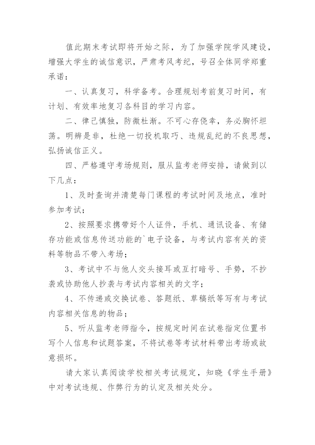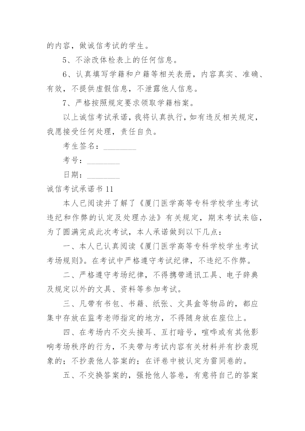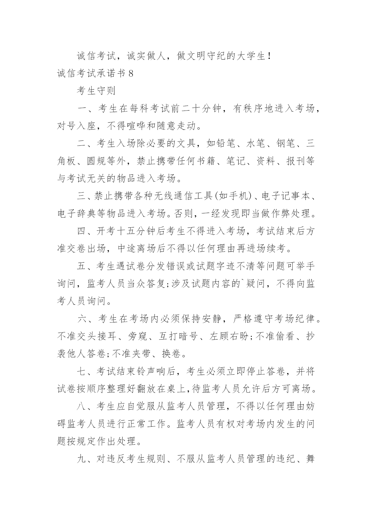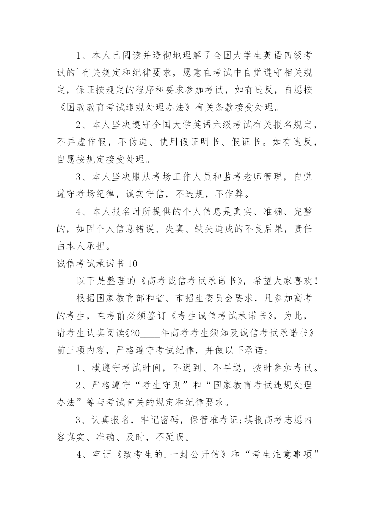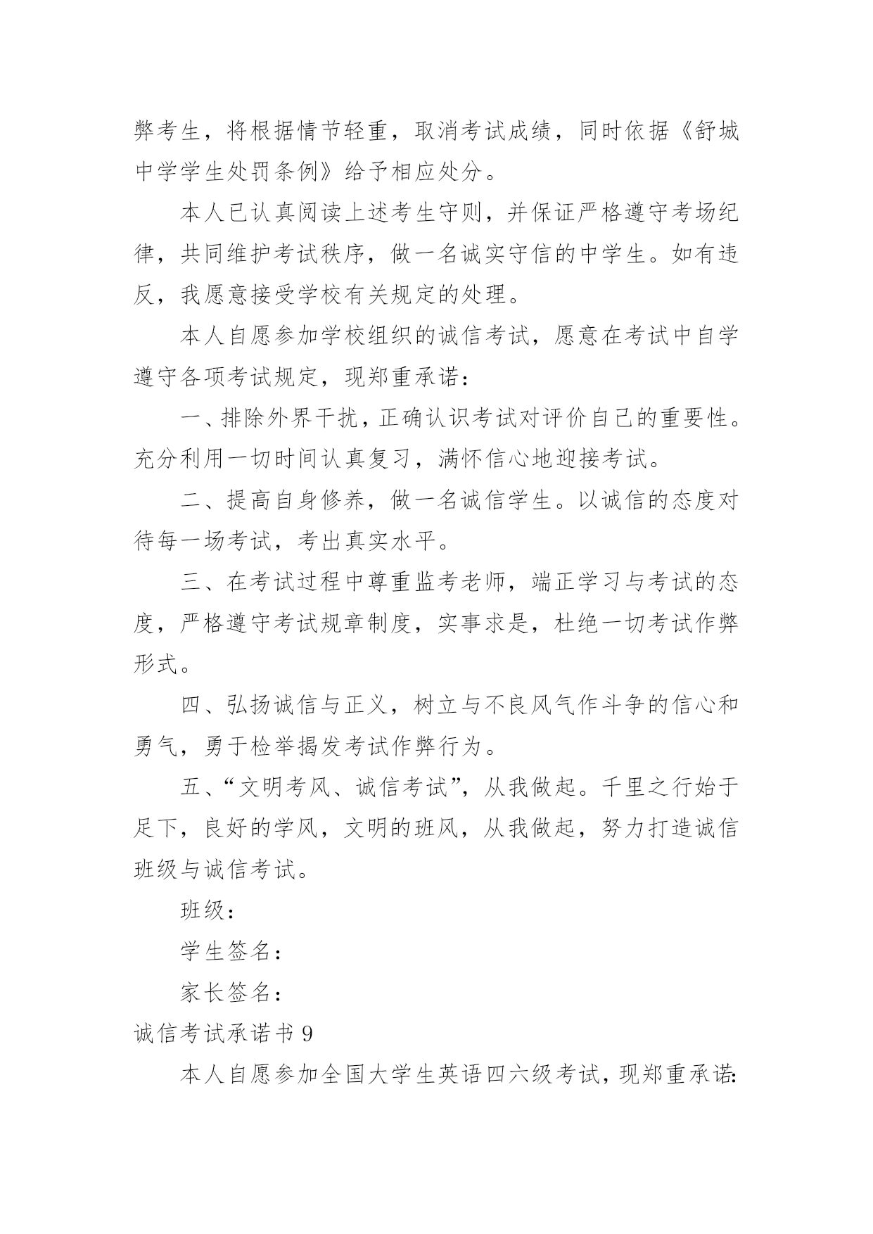诚信考试承诺书【热】诚信考试承诺书在日常生活和工作中,越来越多人会去使用承诺书,承诺书仅是一方的声明及义务性的认可,其法律效力与合同是不同的。那要怎么写好承诺书呢?以下是小编精心整理的诚信考试承诺书,希望对大家有所帮助。诚信考试承诺书1我申请参加贵院20____年自主招生考试,已阅读和了解学校的《考生守则》、《对违反规定行为的处理》、《国家教育考试违规处理办法》等有关规定。根据这些规定,本人郑重承诺以下事项:1.自愿遵守浙江省教育考试院相关规定,只报考一所院校。若同时报考二所以上(含二所)院校,愿意承担由此引起的相关责任。本人被录取后不参加当年高考和高职单考单招。2.保证自己是符合高考或单考单招报考条件,并已办理高考或单考单招报名手续的高中毕业生,准确向贵院提供本人的真实信息,并愿意承担所提供信息与事实不符可能引起的相关责任。3.保证报名时所提交的报考材料和证件真实、准确。如有虚假信息和作假行为,本人承担由此而产生的`一切后果。4.在招生考试过程中,自觉服从招生考试管理部门的安排,接受招生考试管理部门的检查、监督和管理。5.保证在考试中诚实守信,自觉遵守国家有关普通高等学校招生考试的管理规定、考试纪律和考生守则。如有违法、违纪、违规行为,自愿接受有关部门根据国家有关规定所做出的处罚决定考生高考。考生(签字):___________联系电话:____________20____年______月______日诚信考试承诺书2我是一名在校大学生,自愿报名参加全国大学英语四、六级(高等学校英语应用能力a、b级)考试。我已认真阅读并理解了《全国大学英语四、六级考试报名须知》、《全国大学英语四、六级考试考生守则》、《高等学校英语应用能力考生须知》、《国家教育考试违规处理办法》等有关规定,现郑重承诺:1、保证报名时所交验的证件和填写的`报考信息真实、准确、完整。如有虚假信息和作假行为,或因个人信息错误、失真、缺失等造成的不良后果,本人承担一切责任。2、考试过程中自觉服从考场工作人员和监考教师管理,主动接受和积极配合监考人员的检查、监督,支持、配合考务人员使用专用设备查处利用现代通讯设备舞弊考生。3、不携带任何禁止带入考场的物品进入考场。4、保证在考试中诚实守信,自觉遵守全国大学英语四、六级(高等学校英语应用能力a、b级)考试有关规定。如有违纪、违规行为,自愿接受考试机构和学校按有关规定作出的成绩处理和校纪校规处理。诚信考试承诺书3我是一名参加今年高考的考生,学习了《考生守则》和《高考违规行为的`认定和处理》的有关内容,在今年的高考中,将以诚信为本,遵规守纪,并郑重承诺:1、自觉遵守《考生守则》和考场纪律,不违规违纪。2、尊敬监考老师,服从监考老师管理。3、不携带违禁物品(如手机、电子通讯设备、手表等)进入考点。以上承诺坚决做到,考试中如有违纪舞弊行为,愿接受《国家教育考试违规处理办法》规定的条款处理。考生签名:xxxxxxxx考号:xxxxxxxx日期:xxxxxxxx诚信考试承诺书4本人自愿参加本次考试,现郑重承诺:一、本人坚决遵守考试有关报名规定,不弄虚作假,不伪造、使用假证明、假证书。如有违反,自愿按规定接受处理。二、本人报名时所提供的个人信息是真实、准确、完整的,如因个人信息错误、失真、缺失造成不良后果,责任由本人承担。三、本人坚决服从考场工作人员和监考教师管理,自觉遵守考试纪律,考试诚实守信,不违规,不作弊。四、本人已阅读并且透彻地理解了考试的有关规定和纪律要求,愿意在考试中自觉遵守这些规定,保证按规定的`程序和要求参加考试,如有违反,自愿按《国家教育考试违规处理办法》有关条款接受处理。以下考生同意上述要求,并签名。考生(签字):诚信考试承诺书5在此次考试中我们庄严地做出如下承诺:一、努力学习,刻苦钻研;考试不违纪、不作弊,不通过不正当的手段改动成绩;按时独立完成试卷,不抄袭、剽窃他人试巻;二、严格遵守考场纪律,不携带通讯工具、电子辞典及规定以外的文具、资料等参加考试;三、凡携带书包、书籍、纸张、文具盒等物品的`,都集中存放在监考老师指定的地方,不随意放在座位上;四、在考场内不交头接耳、互打暗号、喧哗或有其他影响考场秩序的行为;不夹带与考试内容有关材料,不抄袭他人;五、不交换答案,不将自己的答案让他人抄袭,不将试巻带出考场;六、不扰乱考场秩序,不无理取闹、服从监考员老师安排;七、若违反考试纪律,自愿接受学校有关规定的处理。千里之行,始于足下,希望每位同学以社会主义核心价值观为准则,从自身做起,严于律己,让我们遵守诚信誓言,把诚信真正落实到学习和生活中,用高尚道德理念规范自己的言行,树立良好的榜样形象,以实际行动带动和影响周围的同学,推动诚信教育,共同塑造我系学子良好的诚信形象!诚信考试承诺书6我是一名参加20xx年xx省普通高