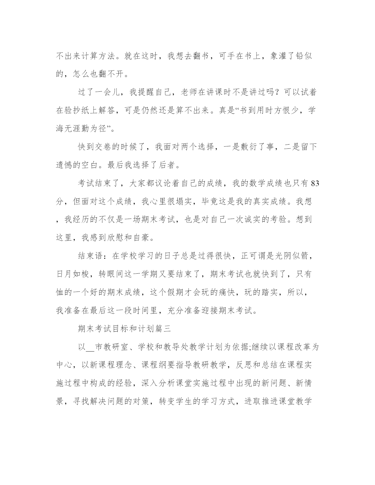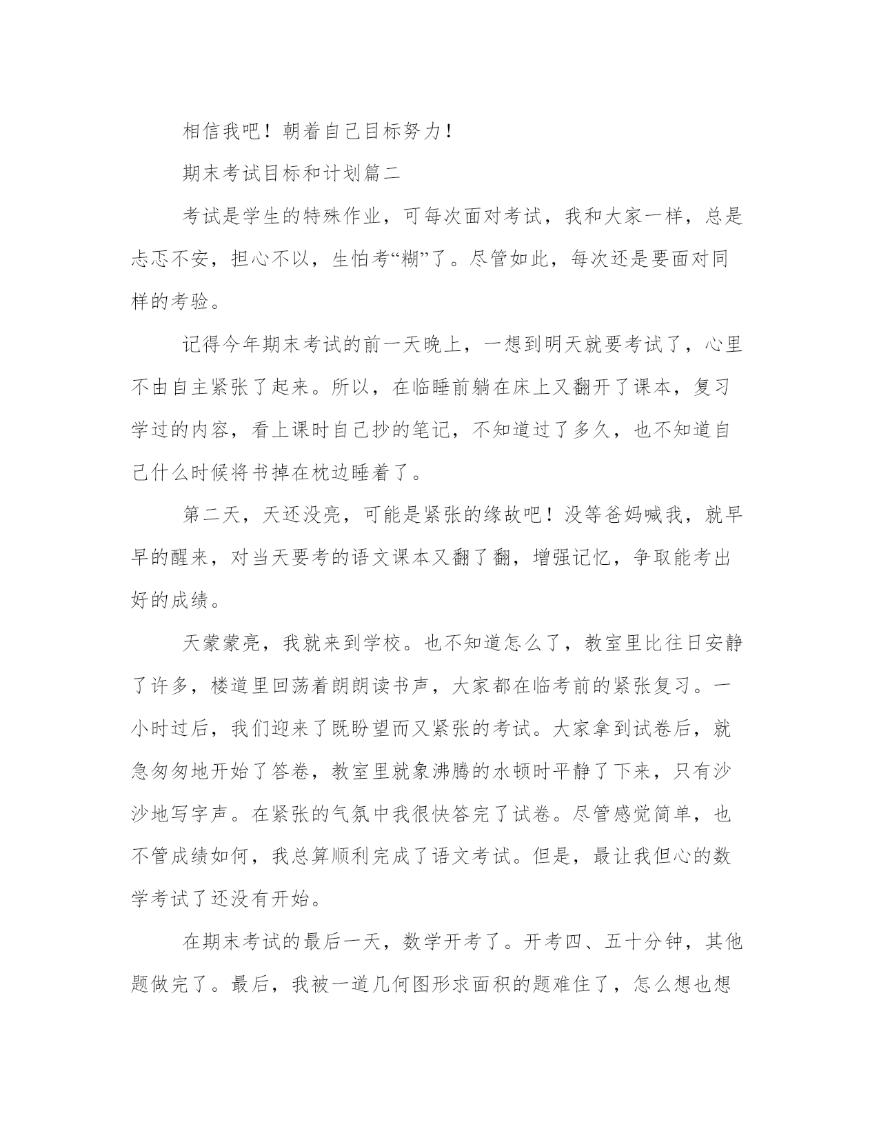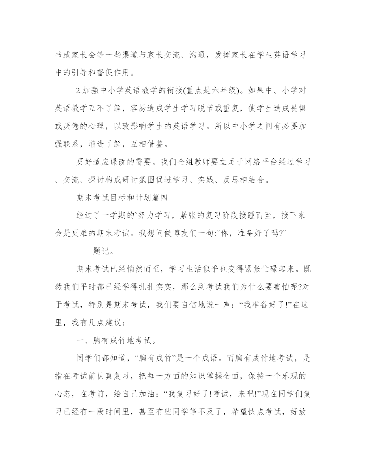 期末考试目标和计划期末考试目标(模板12篇)光阴的迅速,一眨眼就过去了,很快就要开展新的工作了,来为今后的学习制定一份计划。通过制定计划,我们可以将时间、有限的资源分配给不同的任务,并设定合理的限制。这样,我们就能够提高工作效率。下面是小编整理的个人今后的计划范文,欢迎阅读分享,希望对大家有所帮助。期末考试目标和计划篇一快要期期末考试了。我们班每个人都订下了自己的目标、我也来说一说我的期末目标吧。首先。不说超过别人。先要超过自己。我要超过自己上次的分数。具体到底多少分记不清了。反正呢、名词一定要比上次期中考试考前。要是能比上学期期中考试名词考前的话。我非得美死呢——加油!然后呢、分着每一科来说一说。数学:咱三角形学的不好。加上三角形又那么重要……哎……80分是我的目标。英语:咱数学语文不行。咱英语行呀!想当年要不是英语考了超高的分数。我怎么能进入班级前十呢?所以我的目标是、95分以上!并且班级第一。朝着年级英语状元的方向努力!地理、生物:及格就好吧……因为我实在是听不懂老师讲的……。相信我吧!朝着自己目标努力!期末考试目标和计划篇二考试是学生的特殊作业,可每次面对考试,我和大家一样,总是忐忑不安,担心不以,生怕考“糊”了。尽管如此,每次还是要面对同样的考验。记得今年期末考试的前一天晚上,一想到明天就要考试了,心里不由自主紧张了起来。所以,在临睡前躺在床上又翻开了课本,复习学过的内容,看上课时自己抄的笔记,不知道过了多久,也不知道自己什么时候将书掉在枕边睡着了。第二天,天还没亮,可能是紧张的缘故吧!没等爸妈喊我,就早早的醒来,对当天要考的语文课本又翻了翻,增强记忆,争取能考出好的成绩。天蒙蒙亮,我就来到学校。也不知道怎么了,教室里比往日安静了许多,楼道里回荡着朗朗读书声,大家都在临考前的紧张复习。一小时过后,我们迎来了既盼望而又紧张的考试。大家拿到试卷后,就急匆匆地开始了答卷,教室里就象沸腾的水顿时平静了下来,只有沙沙地写字声。在紧张的气氛中我很快答完了试卷。尽管感觉简单,也不管成绩如何,我总算顺利完成了语文考试。但是,最让我但心的数学考试了还没有开始。在期末考试的最后一天,数学开考了。开考四、五十分钟,其他题做完了。最后,我被一道几何图形求面积的题难住了,怎么想也想不出来计算方法。就在这时,我想去翻书,可手在书上,象灌了铅似的,怎么也翻不开。过了一会儿,我提醒自己,老师在讲课时不是讲过吗?可以试着在验抄纸上解答,可是仍然还是算不出来。真是“书到用时方恨少,学海无涯勤为径”。快到交卷的时候了,我面对两个选择,一是敷衍了事,二是留下遗憾的空白。最后我选择了后者。考试结束了,大家都议论着自己的成绩,我的数学成绩也只有83分,但面对这个成绩,我心里很塌实,毕竟这是我的真实成绩。我想,我经历的不仅是一场期末考试,也是对自己一次诚实的考验。想到这里,我感到欣慰和自豪。结束语:在学校学习的日子总是过得很快,正可谓是光阴似箭,日月如梭,转眼间这一学期又要结束了,期末考试也就快到了,只有恤的一个好的期末成绩,这个假期才会玩的痛快,玩的踏实,所以,我准备在最后这一段时间里,充分准备迎接期末考试。期末考试目标和计划篇三以__市教研室、学校和教导处教学计划为依据;继续以课程改革为中心,以新课程理念、课程纲要指导教研教学,反思和总结在课程实施过程中构成的经验,深入分析课堂实施过程中出现的新问题、新情景,寻找解决问题的对策,转变学生的学习方式,进取推进课堂教学改革,提升教师的质量观,为进一步提高我校英语教学质量而扎实开展教学。1.提高英语教学质量,确保完成学校提出的各项指标。2.继续以课改为中心,抓实英语学科教学常规。3.与信息技术整合,运用白板技术辅助教学。4.加强理论学习,推动教学改革。5.进取开展反思型教研活动,提高课堂教学质量。6.开展课外活动,激发学生学习兴趣,培养本事。(一)加强理论学习,提高教师专业素养。1.组织教师继续学习英语课程标准、英语课程纲要等精神,充分认识课程改革的重要意义,关心并参与当前的课程改革分析;要认识到英语教学在整个素质教育中的重要地位和作用;并努力将这些正确的思想理念转化为进取可行的教学实践活动。以课堂为主要阵地,进取开展教学改革实践,根据小学生的学习特点探讨小学英语教学,并用这些理念来指导平时的课堂教学,努力探索提高课堂教学效率的途径和方法。认真做好理论笔记,对学习心得、体会能及时小结,能联系实际进取撰写教育教学论文和案例,从实践上升到理论。将教学、学习、分析融为一体。2.明确小学阶段英语课程的目的是激发学生学习英语的兴趣,培养他们学习英语的进取态度,建立学习英语的自信心,培养学生必须的语感和良好的语音、语调基础;使他们初步构成用英语进行简单日常交流的本事,