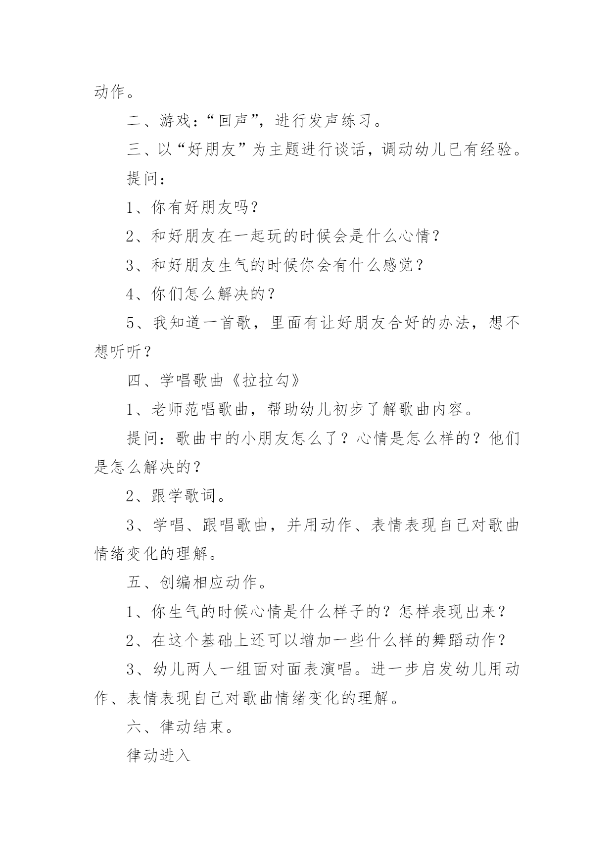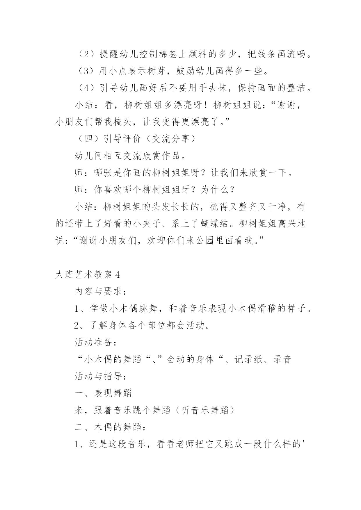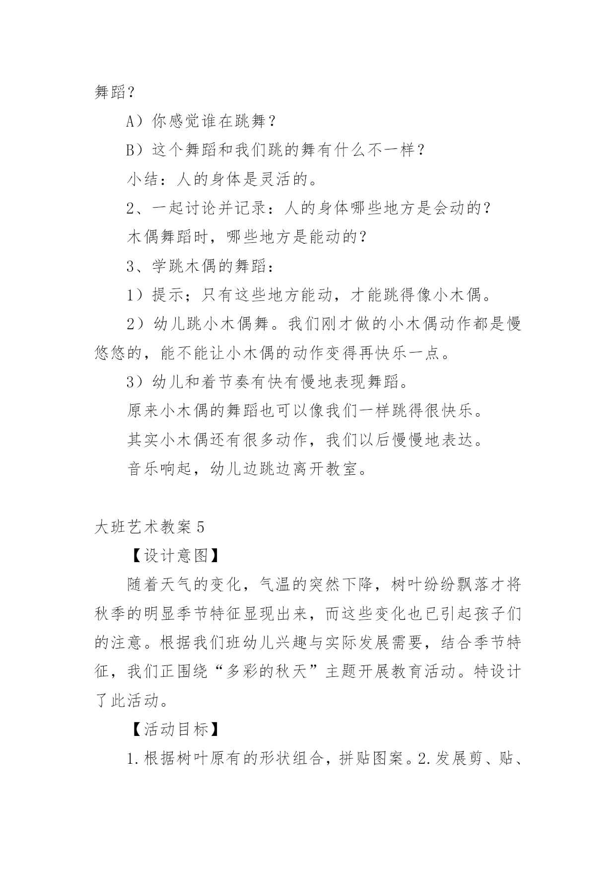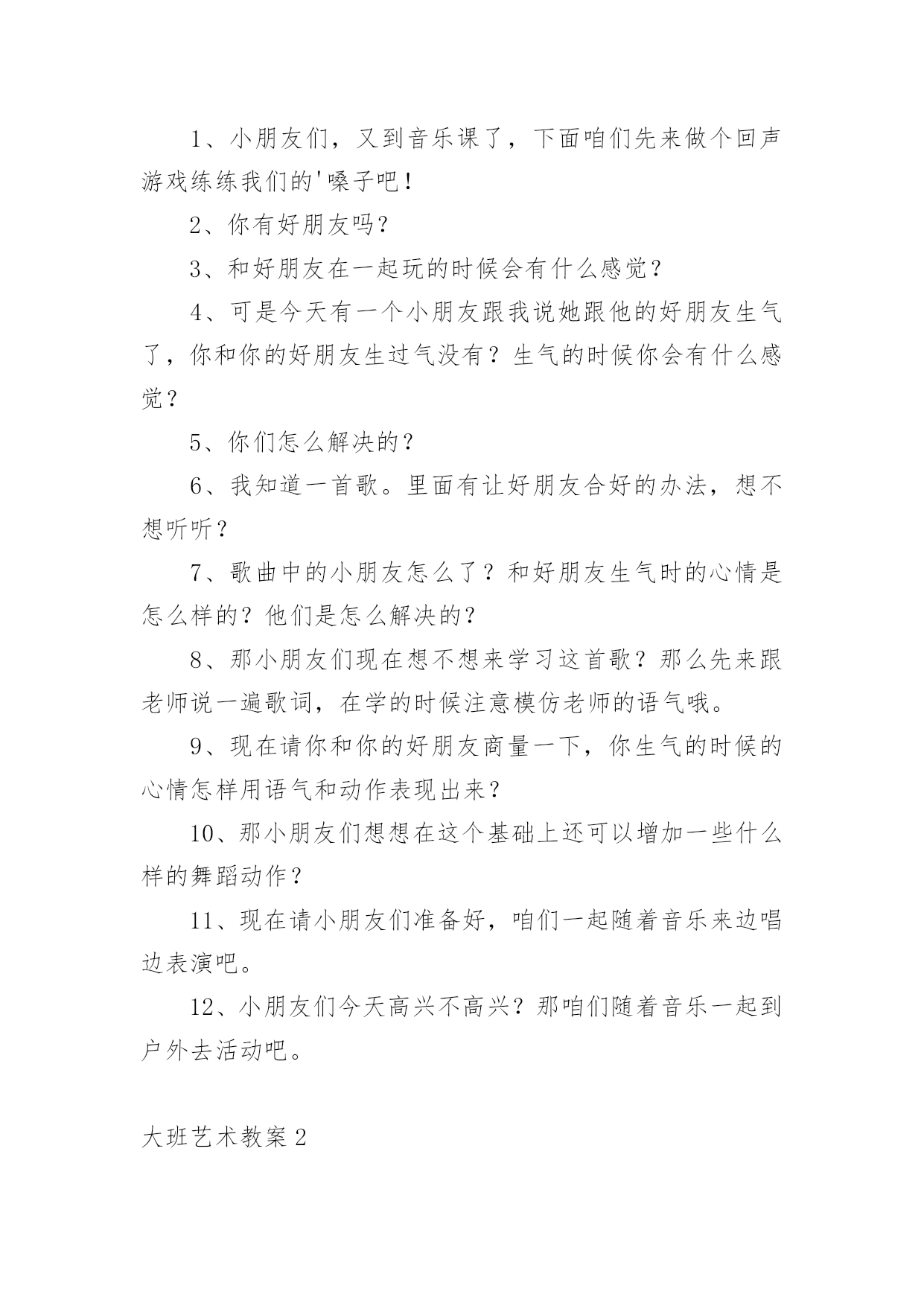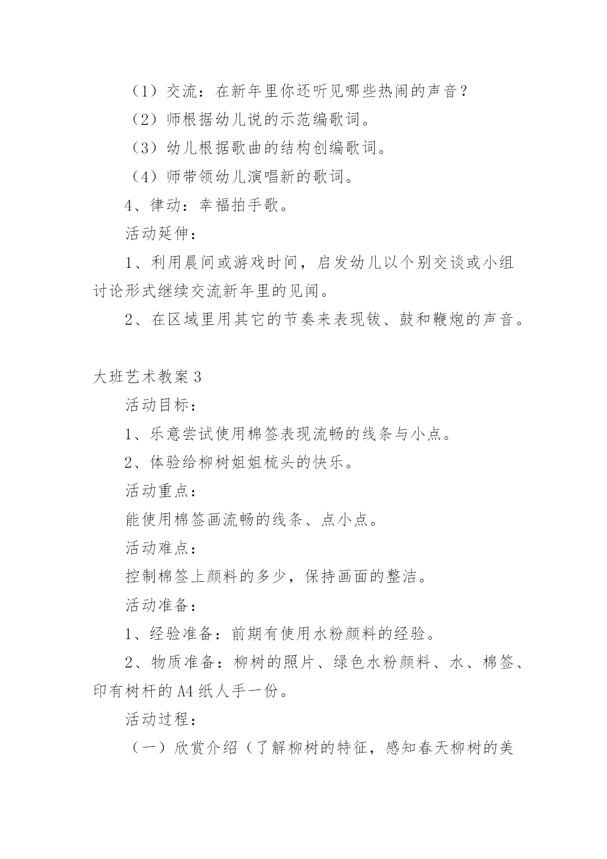 大班艺术教案大班艺术教案(15篇)作为一名教学工作者,通常需要准备好一份教案,教案有利于教学水平的提高,有助于教研活动的开展。教案应该怎么写呢?下面是小编精心整理的大班艺术教案,仅供参考,大家一起来看看吧。大班艺术教案1活动目标:1、感受歌曲前后情绪变化,学习用不同的语气表现不同情绪。2、尝试自编表演动作,表现自己对歌曲内容和情绪的理解。3、萌发与同伴互相谦让、团结友爱的情感。活动重点:感受歌曲情绪变化,能用不同的语气表现不同情绪。活动难点:尝试自编表演动作,表示对歌曲内容和情绪的理解。活动准备:录音机;音乐磁带。活动过程:一、律动:《走走跳跳》请幼儿随着老师进行走跳节奏练习,引导幼儿作出相应动作。二、游戏:“回声”,进行发声练习。三、以“好朋友”为主题进行谈话,调动幼儿已有经验。提问:1、你有好朋友吗?2、和好朋友在一起玩的时候会是什么心情?3、和好朋友生气的时候你会有什么感觉?4、你们怎么解决的?5、我知道一首歌,里面有让好朋友合好的办法,想不想听听?四、学唱歌曲《拉拉勾》1、老师范唱歌曲,帮助幼儿初步了解歌曲内容。提问:歌曲中的小朋友怎么了?心情是怎么样的?他们是怎么解决的?2、跟学歌词。3、学唱、跟唱歌曲,并用动作、表情表现自己对歌曲情绪变化的理解。五、创编相应动作。1、你生气的时候心情是什么样子的?怎样表现出来?2、在这个基础上还可以增加一些什么样的舞蹈动作?3、幼儿两人一组面对面表演唱。进一步启发幼儿用动作、表情表现自己对歌曲情绪变化的理解。六、律动结束。律动进入1、小朋友们,又到音乐课了,下面咱们先来做个回声游戏练练我们的'嗓子吧!2、你有好朋友吗?3、和好朋友在一起玩的时候会有什么感觉?4、可是今天有一个小朋友跟我说她跟他的好朋友生气了,你和你的好朋友生过气没有?生气的时候你会有什么感觉?5、你们怎么解决的?6、我知道一首歌。里面有让好朋友合好的办法,想不想听听?7、歌曲中的小朋友怎么了?和好朋友生气时的心情是怎么样的?他们是怎么解决的?8、那小朋友们现在想不想来学习这首歌?那么先来跟老师说一遍歌词,在学的时候注意模仿老师的语气哦。9、现在请你和你的好朋友商量一下,你生气的时候的心情怎样用语气和动作表现出来?10、那小朋友们想想在这个基础上还可以增加一些什么样的舞蹈动作?11、现在请小朋友们准备好,咱们一起随着音乐来边唱边表演吧。12、小朋友们今天高兴不高兴?那咱们随着音乐一起到户外去活动吧。大班艺术教案2活动目标:1、能说出春节里感兴趣的事,并根据歌曲的结构创编歌词。2、能唱准跨度较大的音,掌握好切分音。3、感受新年的热闹,体验欢快的情绪。活动准备:钹、鼓、鞭炮等。活动过程:1、谈话:小朋友们是怎样庆祝新年的?新年里,你听到了哪些声音?2、学习新歌《新年的笑声》。(1)出示钹、鼓和鞭炮,模仿它们的声音。(2)学习节奏型:XXXXXXXXX0A、用身体动作表示节奏型。B、用钹、鼓和鞭炮的`声音表示节奏型。(3)幼儿完整欣赏歌曲,理解歌词。A、教师示范演唱。B、提问:你听见歌里唱了什么?C、幼儿有节奏地念歌词:重点掌握切分音。(4)幼儿集体演唱歌曲。A、幼儿集体学唱。B、师与幼儿接唱。C、边唱边表演。3、创编歌词。(1)交流:在新年里你还听见哪些热闹的声音?(2)师根据幼儿说的示范编歌词。(3)幼儿根据歌曲的结构创编歌词。(4)师带领幼儿演唱新的歌词。4、律动:幸福拍手歌。活动延伸:1、利用晨间或游戏时间,启发幼儿以个别交谈或小组讨论形式继续交流新年里的见闻。2、在区域里用其它的节奏来表现钹、鼓和鞭炮的声音。大班艺术教案3活动目标:1、乐意尝试使用棉签表现流畅的线条与小点。2、体验给柳树姐姐梳头的快乐。活动重点:能使用棉签画流畅的线条、点小点。活动难点:控制棉签上颜料的多少,保持画面的整洁。活动准备:1、经验准备:前期有使用水粉颜料的经验。2、物质准备:柳树的照片、绿色水粉颜料、水、棉签、印有树杆的A4纸人手一份。活动过程:(一)欣赏介绍(了解柳树的特征,感知春天柳树的美丽)出示柳树的照片。关键提问:这是什么树?你在哪里见到过?小结:春天到了,柳树的枝条越来越长,枝条上长出了嫩芽。春风吹来,柳条在风中飘来飘去,多美丽呀!飘着飘着柳树姐姐的头发就吹乱了,快来帮它梳一梳头吧!(二)操作尝试(了解棉签绘画柳树的方法)1、师:今天我们请来了小棉签当木梳,替柳树姐姐梳头。2、教师与幼儿轮换尝试操作。(1)棉签走路:画流畅的线条。关键提问:怎样才能让柳树姐姐的头发长长的?小结:梳头时我们要请棉签宝宝喝喝水,站站好,鞠个躬,起步走,走到底。(2)棉签跳舞:点小点。小结:柳树姐姐的头发梳通了,树叶发芽了,高兴地在树上跳舞。(三)幼儿作画,教师指导要点(提醒幼儿注意小棉签的`用法)1、师:还有许多柳树姐姐也想请小朋友们帮她们梳