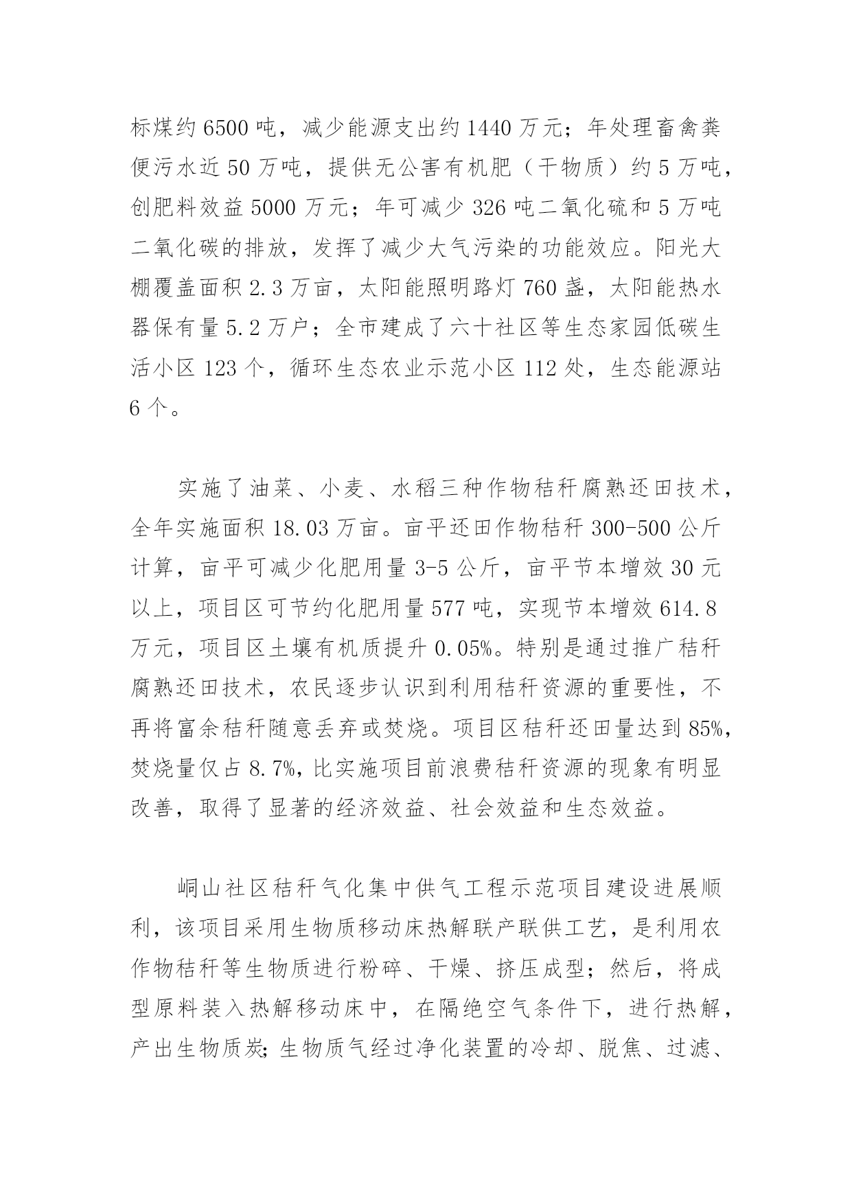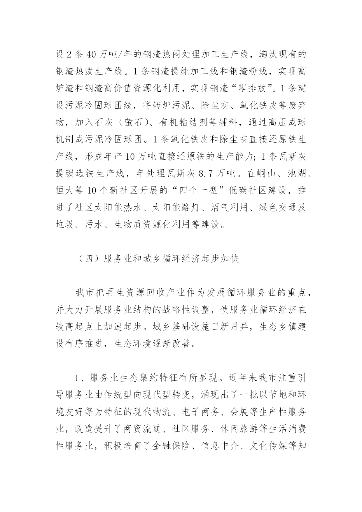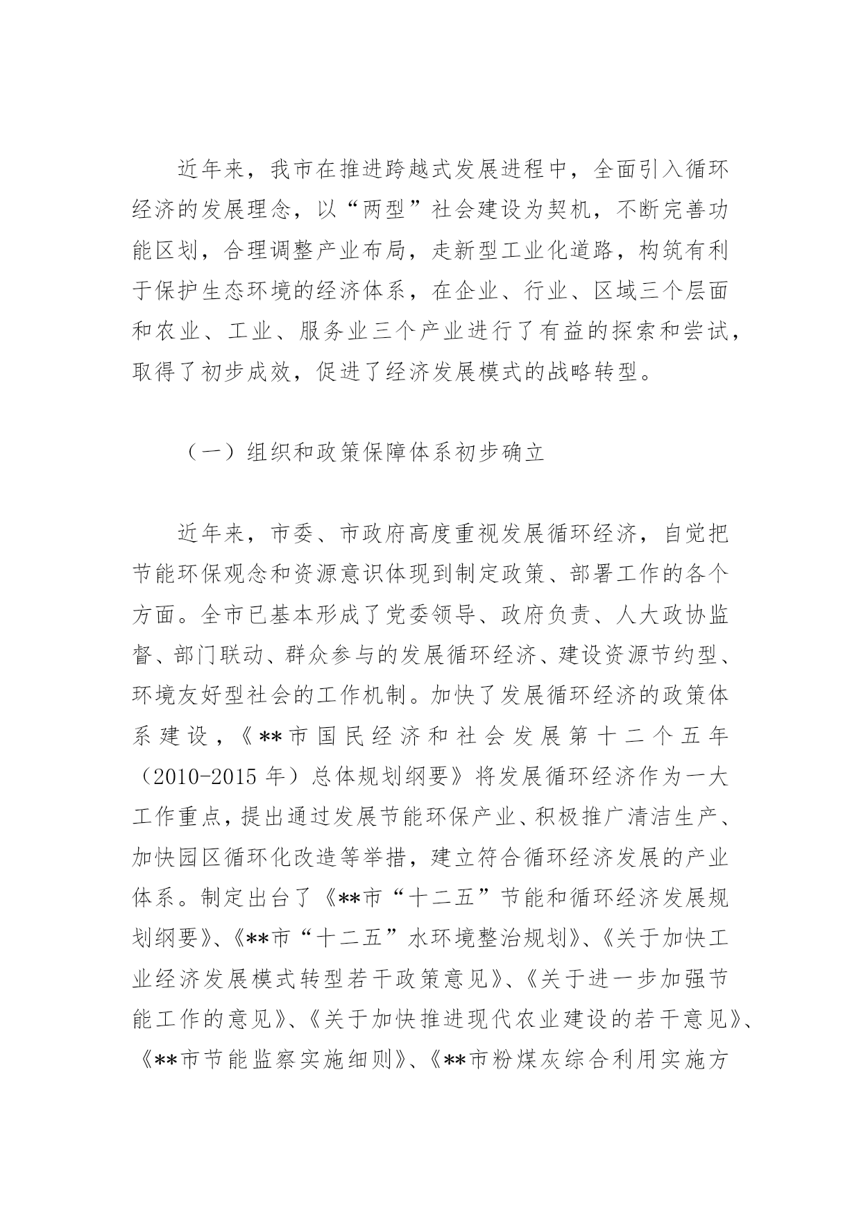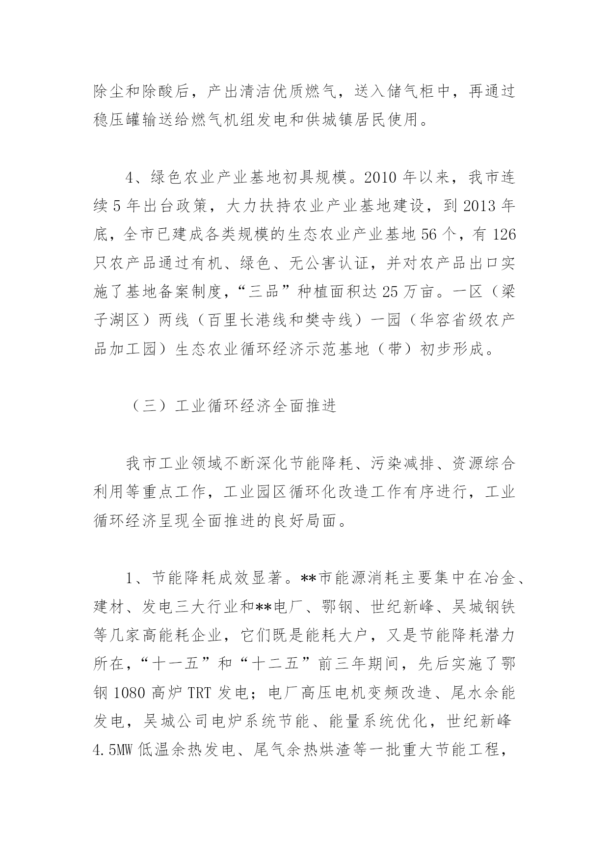 市循环经济发展模式报告市循环经济发展模式报告**市循环经济发展模式报告**市发改委课题组(2014年1月8日)循环经济是一种以资源的高效利用和循环利用为核心,以“减量化、再利用、资源化”为原则,以低消耗、低排放、高效率为基本特征,符合可持续发展理念的经济增长模式,是对“大量生产、大量消费、大量废弃”的传统增长模式的根本变革。发展循环经济是落实科学发展观,转变经济增长方式,走新型工业化道路的必然选择,是建设资源节约型和环境保护型社会,从根本上缓解经济社会发展面临的资源约束矛盾和环境压力,促进人与自然和谐发展的战略举措。我市资源相对贫乏、生态环境脆弱,资源存量和环境承载力都已经不起传统经济形式下高强度的资源消耗和环境污染。传统的重化工业发展模式已经走到了尽头,必须坚定地实施可持续发展战略,走循环经济发展道路。一、我市循环经济的发展现状和成就近年来,我市在推进跨越式发展进程中,全面引入循环经济的发展理念,以“两型”社会建设为契机,不断完善功能区划,合理调整产业布局,走新型工业化道路,构筑有利于保护生态环境的经济体系,在企业、行业、区域三个层面和农业、工业、服务业三个产业进行了有益的探索和尝试,取得了初步成效,促进了经济发展模式的战略转型。(一)组织和政策保障体系初步确立近年来,市委、市政府高度重视发展循环经济,自觉把节能环保观念和资源意识体现到制定政策、部署工作的各个方面。全市已基本形成了党委领导、政府负责、人大政协监督、部门联动、群众参与的发展循环经济、建设资源节约型、环境友好型社会的工作机制。加快了发展循环经济的政策体系建设,《**市国民经济和社会发展第十二个五年(2010-2015年)总体规划纲要》将发展循环经济作为一大工作重点,提出通过发展节能环保产业、积极推广清洁生产、加快园区循环化改造等举措,建立符合循环经济发展的产业体系。制定出台了《**市“十二五”节能和循环经济发展规划纲要》、《**市“十二五”水环境整治规划》、《关于加快工业经济发展模式转型若干政策意见》、《关于进一步加强节能工作的意见》、《关于加快推进现代农业建设的若干意见》、《**市节能监察实施细则》、《**市粉煤灰综合利用实施方案》、《**市人民政府关于加快发展节能环保产业的实施意见》、《**市“十二五”节能减排综合性工作方案》、《**市实施〔湖北省固定资产投资项目节能评估和审查实施办法〕细则》、《**市固定资产投资项目节能评估和审查工作规则》、《**市“十二五”期间节能目标责任评价考核办法》等一系列以节能环保、清洁生产、生态文明、现代服务业和战略性新型产业为发展重点的相关政策和意见。从企业、产业、社会三个层面对全市循环经济工作作出战略部署,确立了发展循环经济四大重点领域、实施40个左右循环经济重点项目、开展10项重点行动的“441”工程,把发展循环经济纳入各级政府部门的工作重点。(二)农业循环经济成效显著我市农业循环经济起步早,在病虫害无害化防治、节水灌溉、农业生态循环产业链、废弃物综合利用和绿色农业基地等方面,已有比较扎实的基础。1、生态种植技术得到推广。2012年,全市推广应用测土配方施肥技术面积175.6万亩,覆盖341个村组,涉及农户15万户。推荐主要作物施肥配方15个,配方肥施用面积达106.6万亩,配方肥施用总量达5.33万吨。通过推广测土配方施肥技术,可减少不合理施肥量(纯量)1612.6吨。在水稻上通过采取生态治理、农业防治、生物控制、物理诱杀等绿色防控措施,在确保农产品产量的同时,有效地降低了化学农药使用量,提高了农产品品质。近3年来,全市氮肥、农药的使用量分别减少了12.7%和26.1%。2、农业生态循环模式得到应用。积极推广农作物间种套作技术,充分利用空间,提高复种指数,提高土地的复合产出率;推广农牧结合生态模式,形成了猪(禽)→沼→粮、猪(禽)→沼→菜;猪(禽)→沼→果;种(植)→养(殖)→加(工)→沼(气)→肥(料);秸秆→沼气→电力;秸秆→生物质炭(木焦油)等农业循环经济产业链。推广渔业立体养殖模式,形成了水生植物与养殖鱼、虾、蟹共生的环境,有效保护和利用了水生资源,达到最佳的经济效益。3、农业废弃物一定程度综合利用。积极推广机械化秸秆还田技术,对禽畜粪便无害化处理利用。开展禽畜粪便沼气工程,全市36个规模化禽畜养殖场粪尿综合利用率已达75%以上。同时充分利用沼液作为农田绿色肥源,施用面积已达5000多亩,比一般农田减少60-80%的化肥使用量;利用畜禽粪便生产优质有机肥料,通过高温发酵等技术处理,对禽畜粪便实行资源化利用。到2013年,全市户用沼气保有量23079口、小型及联户沼气工程128处、大型沼气工程6处,沼气工程总容积197832立方米,全市年产沼气约900万立方米,解决了9万农民的全年生活用能问题,年可节约标煤约6