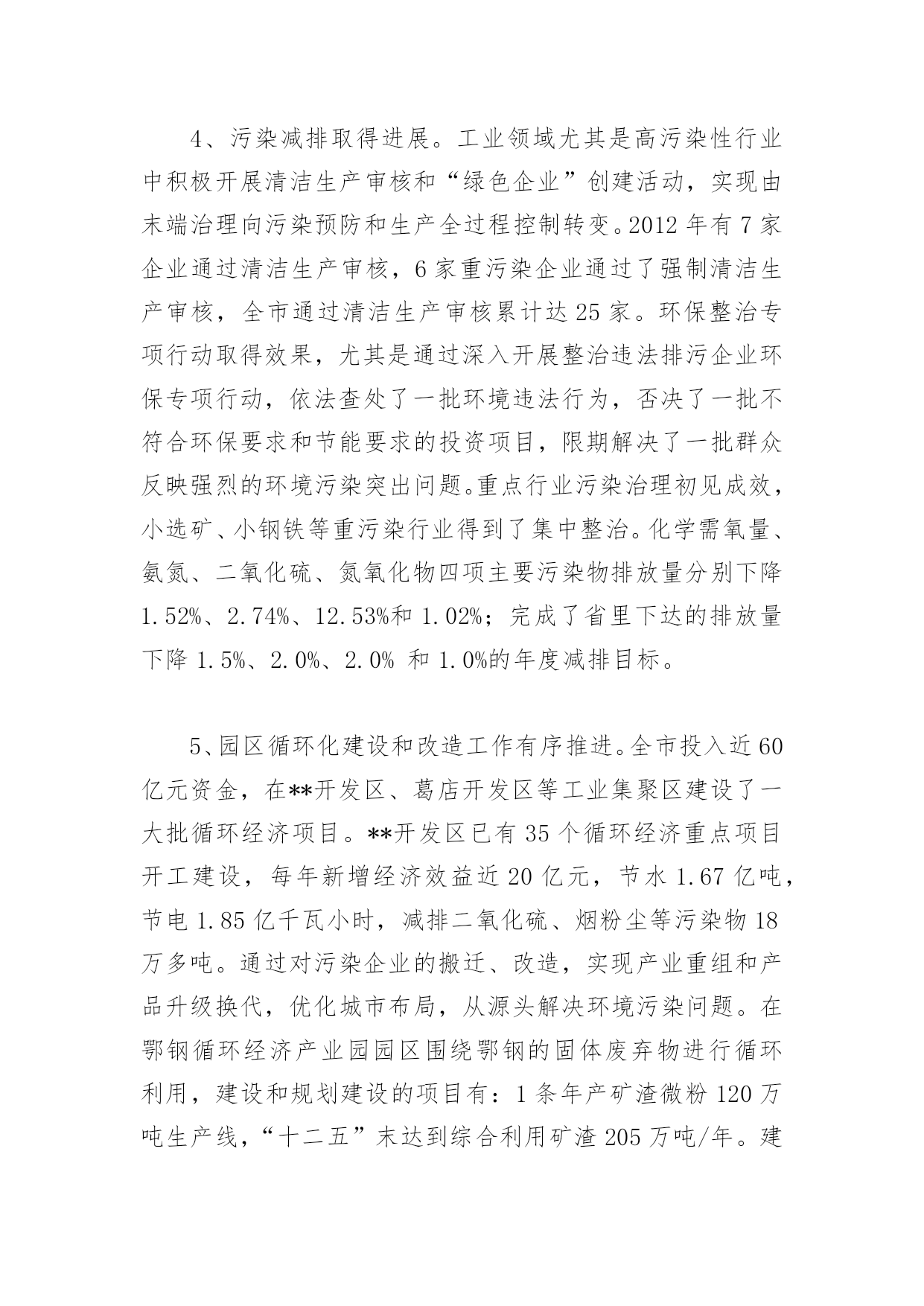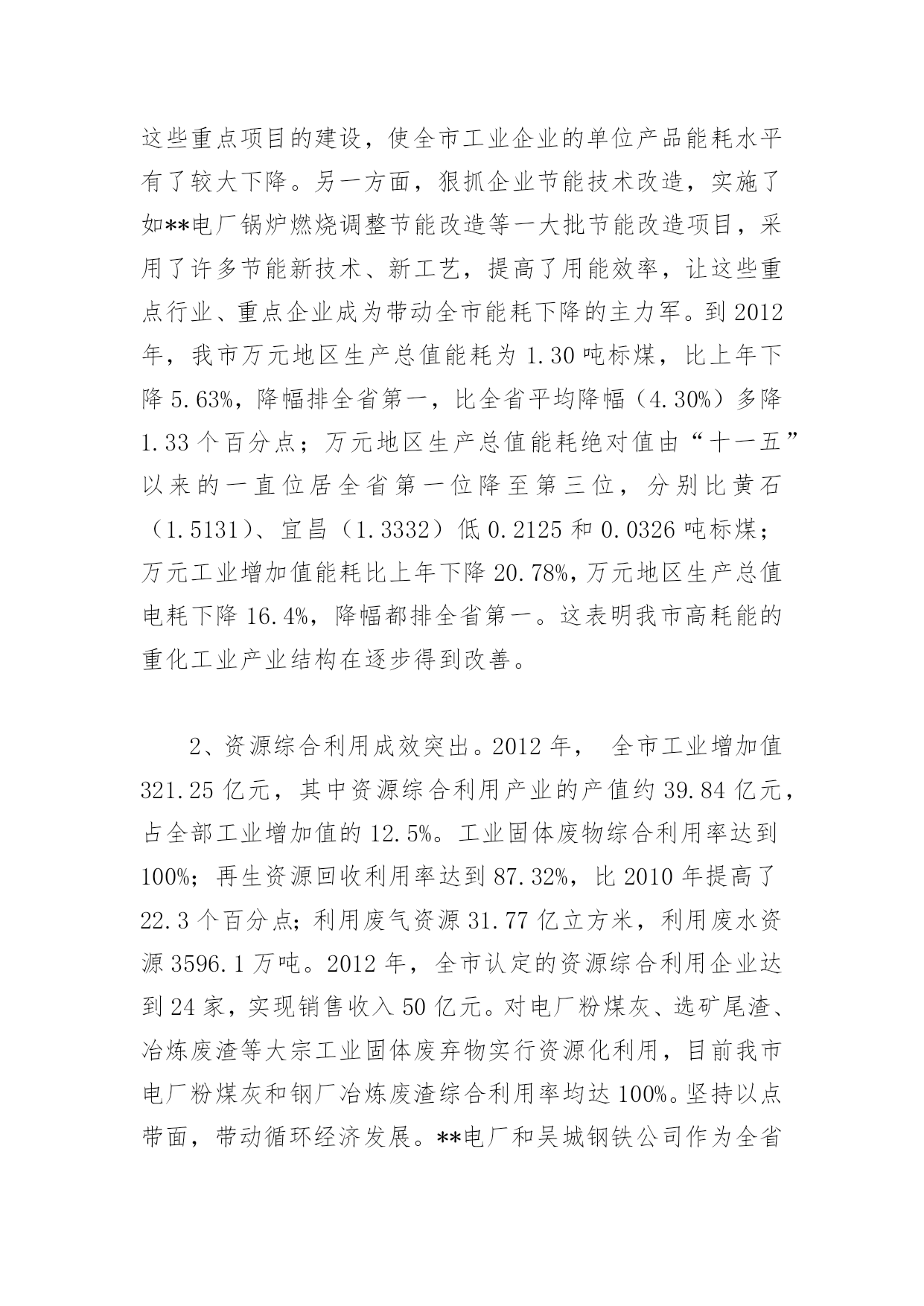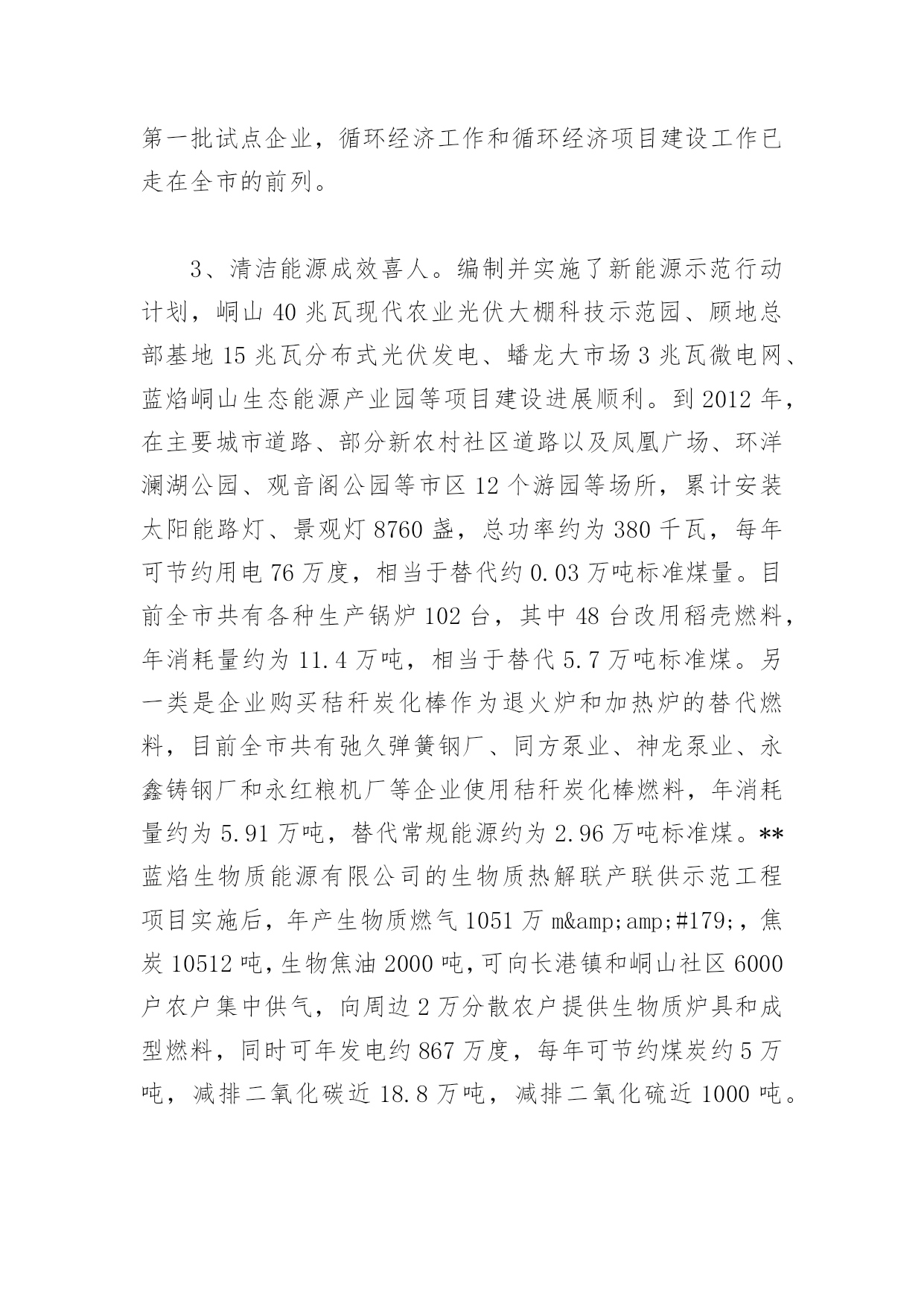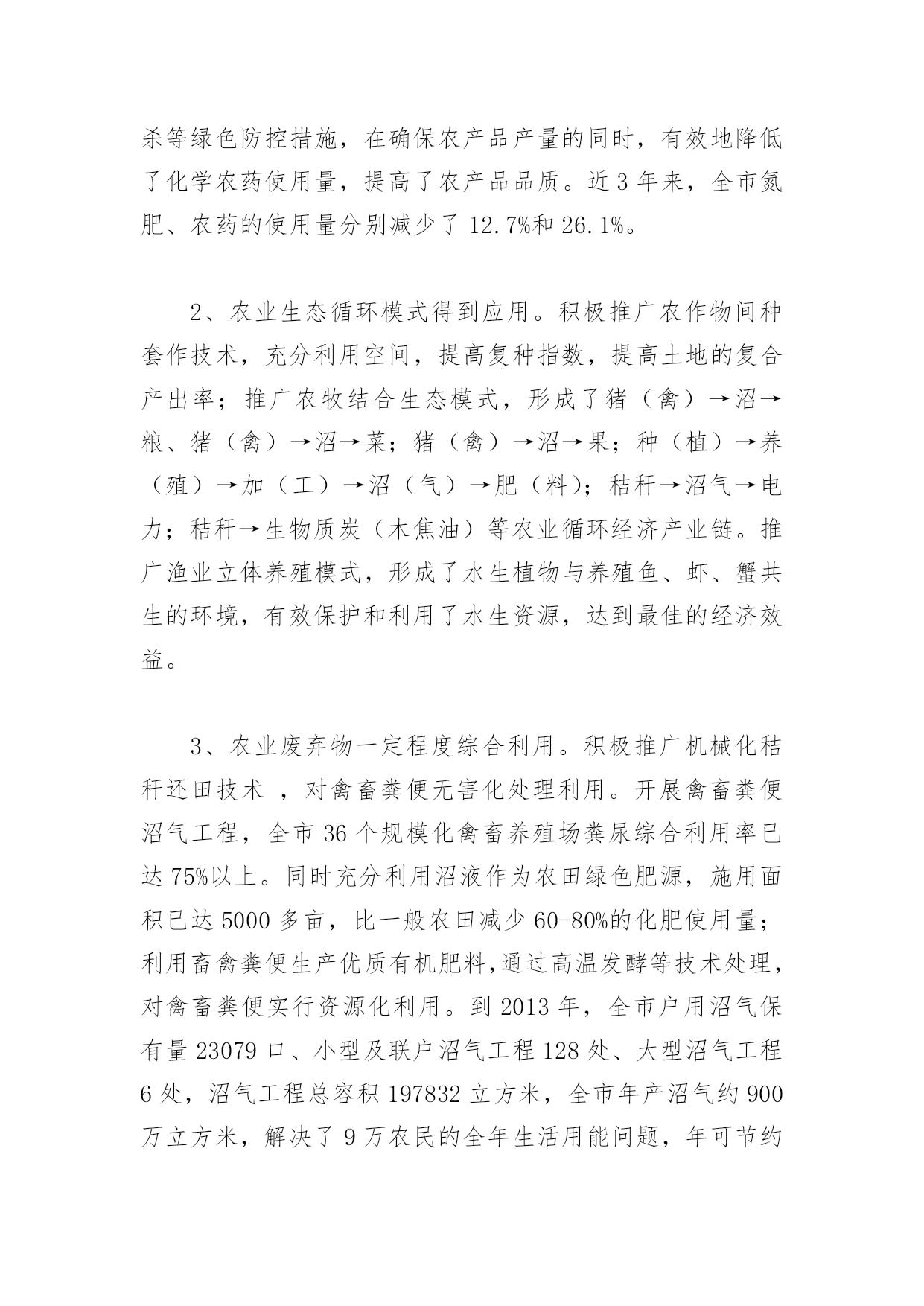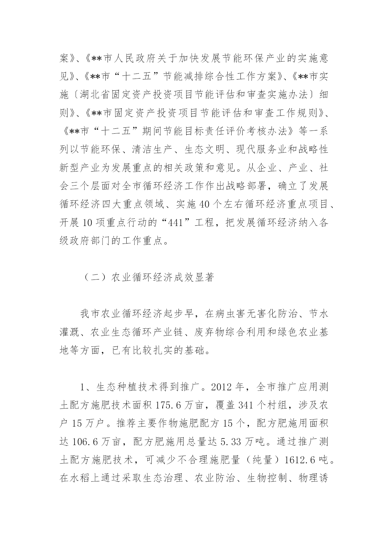 市循环经济发展模式报告市循环经济发展模式报告**市循环经济发展模式报告**市发改委课题组(2014年1月8日)循环经济是一种以资源的高效利用和循环利用为核心,以“减量化、再利用、资源化”为原则,以低消耗、低排放、高效率为基本特征,符合可持续发展理念的经济增长模式,是对“大量生产、大量消费、大量废弃”的传统增长模式的根本变革。发展循环经济是落实科学发展观,转变经济增长方式,走新型工业化道路的必然选择,是建设资源节约型和环境保护型社会,从根本上缓解经济社会发展面临的资源约束矛盾和环境压力,促进人与自然和谐发展的战略举措。我市资源相对贫乏、生态环境脆弱,资源存量和环境承载力都已经不起传统经济形式下高强度的资源消耗和环境污染。传统的重化工业发展模式已经走到了尽头,必须坚定地实施可持续发展战略,走循环经济发展道路。一、我市循环经济的发展现状和成就近年来,我市在推进跨越式发展进程中,全面引入循环经济的发展理念,以“两型”社会建设为契机,不断完善功能区划,合理调整产业布局,走新型工业化道路,构筑有利于保护生态环境的经济体系,在企业、行业、区域三个层面和农业、工业、服务业三个产业进行了有益的探索和尝试,取得了初步成效,促进了经济发展模式的战略转型。(一)组织和政策保障体系初步确立近年来,市委、市政府高度重视发展循环经济,自觉把节能环保观念和资源意识体现到制定政策、部署工作的各个方面。全市已基本形成了党委领导、政府负责、人大政协监督、部门联动、群众参与的发展循环经济、建设资源节约型、环境友好型社会的工作机制。加快了发展循环经济的政策体系建设,《**市国民经济和社会发展第十二个五年(2010-2015年)总体规划纲要》将发展循环经济作为一大工作重点,提出通过发展节能环保产业、积极推广清洁生产、加快园区循环化改造等举措,建立符合循环经济发展的产业体系。制定出台了《**市“十二五”节能和循环经济发展规划纲要》、《**市“十二五”水环境整治规划》、《关于加快工业经济发展模式转型若干政策意见》、《关于进一步加强节能工作的意见》、《关于加快推进现代农业建设的若干意见》、《**市节能监察实施细则》、《**市粉煤灰综合利用实施方案》、《**市人民政府关于加快发展节能环保产业的实施意见》、《**市“十二五”节能减排综合性工作方案》、《**市实施〔湖北省固定资产投资项目节能评估和审查实施办法〕细则》、《**市固定资产投资项目节能评估和审查工作规则》、《**市“十二五”期间节能目标责任评价考核办法》等一系列以节能环保、清洁生产、生态文明、现代服务业和战略性新型产业为发展重点的相关政策和意见。从企业、产业、社会三个层面对全市循环经济工作作出战略部署,确立了发展循环经济四大重点领域、实施40个左右循环经济重点项目、开展10项重点行动的“441”工程,把发展循环经济纳入各级政府部门的工作重点。(二)农业循环经济成效显著我市农业循环经济起步早,在病虫害无害化防治、节水灌溉、农业生态循环产业链、废弃物综合利用和绿色农业基地等方面,已有比较扎实的基础。1、生态种植技术得到推广。2012年,全市推广应用测土配方施肥技术面积175.6万亩,覆盖341个村组,涉及农户15万户。推荐主要作物施肥配方15个,配方肥施用面积达106.6万亩,配方肥施用总量达5.33万吨。通过推广测土配方施肥技术,可减少不合理施肥量(纯量)1612.6吨。在水稻上通过采取生态治理、农业防治、生物控制、物理诱杀等绿色防控措施,在确保农产品产量的同时,有效地降低了化学农药使用量,提高了农产品品质。近3年来,全市氮肥、农药的使用量分别减少了12.7%和26.1%。2、农业生态循环模式得到应用。积极推广农作物间种套作技术,充分利用空间,提高复种指数,提高土地的复合产出率;推广农牧结合生态模式,形成了猪(禽)→沼→粮、猪(禽)→沼→菜;猪(禽)→沼→果;种(植)→养(殖)→加(工)→沼(气)→肥(料);秸秆→沼气→电力;秸秆→生物质炭(木焦油)等农业循环经济产业链。推广渔业立体养殖模式,形成了水生植物与养殖鱼、虾、蟹共生的环境,有效保护和利用了水生资源,达到最佳的经济效益。3、农业废弃物一定程度综合利用。积极推广机械化秸秆还田技术,对禽畜粪便无害化处理利用。开展禽畜粪便沼气工程,全市36个规模化禽畜养殖场粪尿综合利用率已达75%以上。同时充分利用沼液作为农田绿色肥源,施用面积已达5000多亩,比一般农田减少60-80%的化肥使用量;利用畜禽粪便生产优质有机肥料,通过高温发酵等技术处理,对禽畜粪便实行资源化利用。到2013年,全市户用沼气保有量23079口、小型及联户沼气工程128处、大型沼气工程6处,沼气工程总容积197832立方米,全市年产沼气约900万立方米,解决了9万农民的全年生活用能问题,年可节约标煤约6