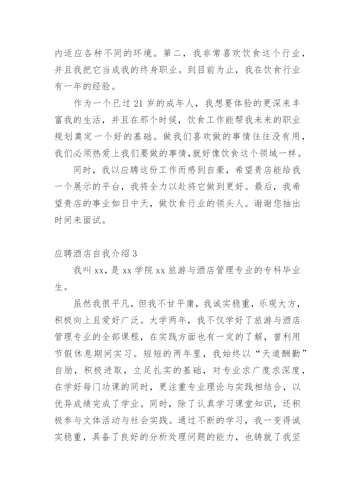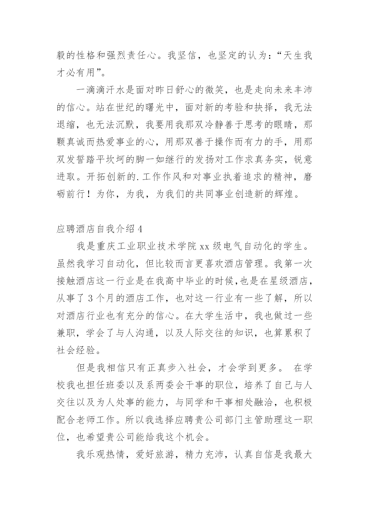 应聘酒店自我介绍应聘酒店自我介绍1我叫xxx,是在马来西亚泰莱大学读酒店管理的学生。作为一名即将步入社会大门的大学生,我的愿望是学有所长,才尽其用。您也许正在为单位挑选酒店管理者、行政管理、餐饮负责人。世有伯乐而后有千里马,我不敢自诩怀瑾握瑜博学学多才,但我拥有胆识,俗话说胆在先,识在后。我敢于向实力雄厚的酒店提出挑战。我觉得酒店本来就是一个与实际生活贴切的岗位,能让女人“出得厅堂入得厨房”,我觉得这行业适合我,我对酒店业完全可以投入热忱。我相信我有能力去为贵公司创造最大的效益,在生意上我懂得如何高调做事低调做人。因为曾经我已经在北京读过建筑专业的大专,在北京道路桥梁单位担任预算员职位一年半,宏观上每个专业上关系不大,微观上每个专业其实密切相关。举个例子做人方面相似,不同之处就在于专于某项职业。应聘酒店自我介绍2我很荣幸在这应聘这个职位,并且很感谢该酒店给我提供一个面试的机会。现在,我首先来介绍我自己:我叫……,来自湖北襄樊。我是一个诚实、富有责任感、待人热情的人。我能够在短期内适应各种不同的环境。第二,我非常喜欢饮食这个行业,并且我把它当成我的终身职业。到目前为止,我在饮食行业有一年的经验。作为一个已过21岁的成年人,我想要体验的更深来丰富我的生活,并且在那个时候,饮食工作能帮我未来的职业规划奠定一个好的基础。做我们喜欢做的事情往往没有用,我们必须热爱上我们要做的事情,就好像饮食这个领域一样。同时,我以应聘这份工作而感到自豪,希望贵店能给我一个展示的平台,我将全力以赴将它做到更好。最后,我希望贵店的事业如日中天,做饮食行业的领头人。谢谢您抽出时间来面试。应聘酒店自我介绍3我叫xx,是xx学院xx旅游与酒店管理专业的专科毕业生。虽然我很平凡,但我不甘平庸,我诚实稳重,乐观大方,积极向上且爱好广泛。大学两年,我不仅学好了旅游与酒店管理专业的全部课程,在实践方面也有一定的了解,曾利用节假休息期间实习。短短的两年里,我始终以“天道酬勤”自励,积极进取,立足扎实的基础,对专业求广度求深度,在学好每门功课的同时,更注重专业理论与实践相结合,以优异成绩完成了学业。同时,除了认真学习课堂知识,还积极参与文体活动与社会实践。通过不断的学习,我一变得诚实稳重,具备了良好的分析处理问题的能力,也铸就了我坚毅的性格和强烈责任心。我坚信,也坚定的认为:“天生我才必有用”。一滴滴汗水是面对昨日舒心的微笑,也是走向未来丰沛的信心。站在世纪的曙光中,面对新的考验和抉择,我无法退缩,也无法沉默,我要用我那双冷静善于思考的眼睛,那颗真诚而热爱事业的心,用那双善于操作而有力的手,用那双发誓踏平坎坷的脚一如继行的发扬对工作求真务实,锐意进取。开拓创新的.工作作风和对事业执着追求的精神,磨砺前行!为你,为我,为我们的共同事业创造新的辉煌。应聘酒店自我介绍4我是重庆工业职业技术学院xx级电气自动化的学生。虽然我学习自动化,但比较而言更喜欢酒店管理。我第一次接触酒店这一行业是在我高中毕业的时候,也是在星级酒店,从事了3个月的酒店工作,也对这一行业有一些了解,所以对酒店行业也有充分的信心。在大学生活中,我也做过一些兼职,学会了与人沟通,以及人际交往的知识,也算累积了社会经验。但是我相信只有正真步入社会,才会学到更多。在学校我也担任班委以及系两委会干事的职位,培养了自己与人交往以及为人处事的能力,与同学和干事相处融洽,也积极配合老师工作。所以我选择应聘贵公司部门主管助理这一职位,也希望贵公司能给我这个机会。我乐观热情,爱好旅游,精力充沛,认真自信是我最大的性格特点,我愿意从基层做起,不断积累经验,提高专业技能,成为一个真正的酒店人!