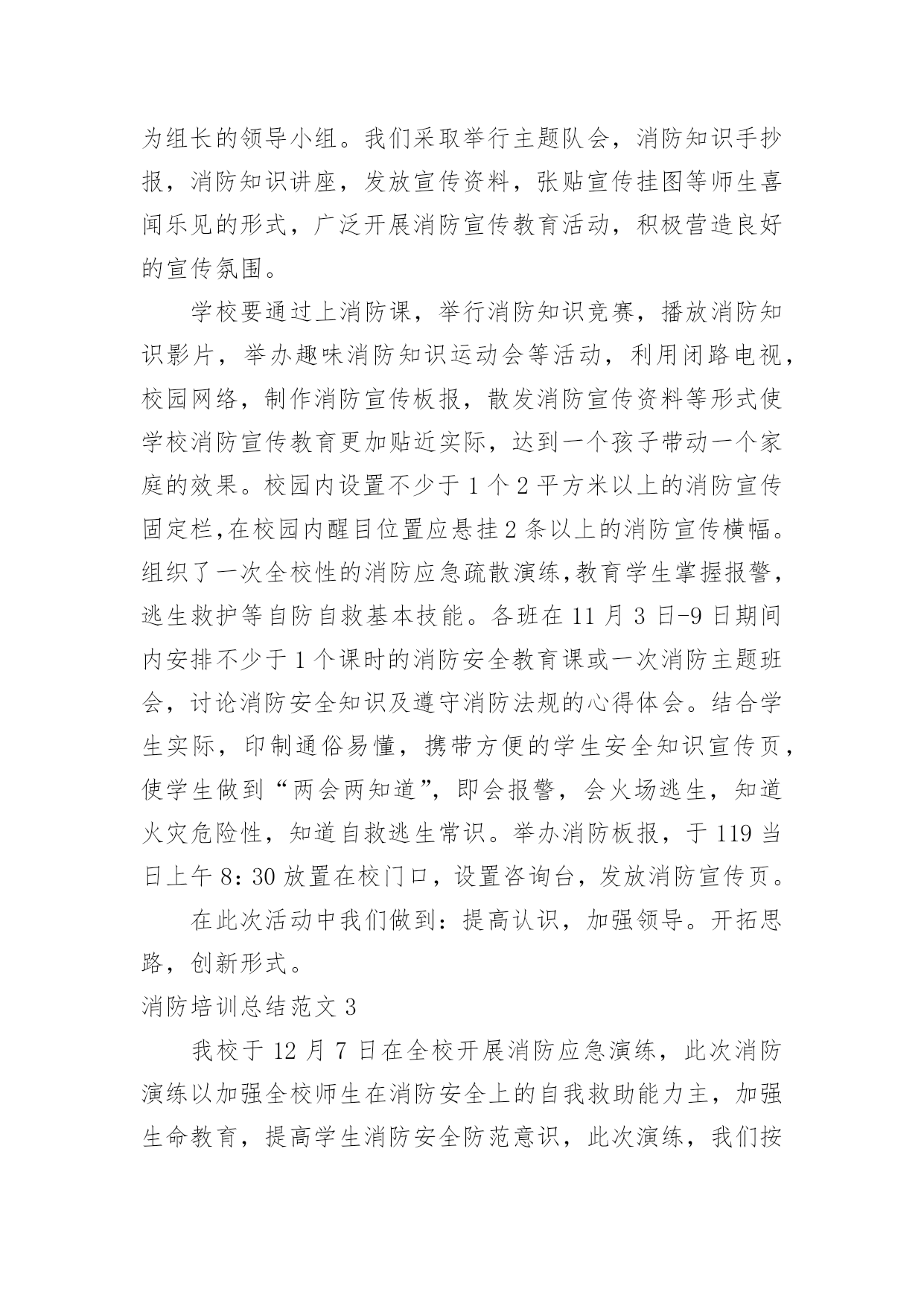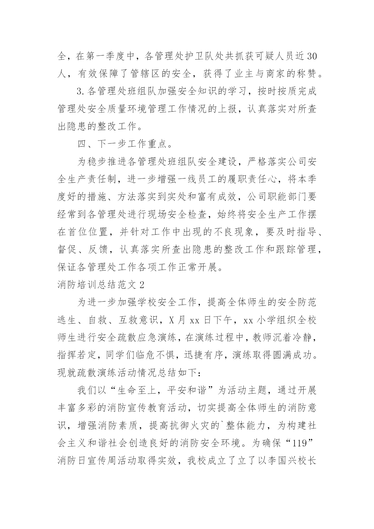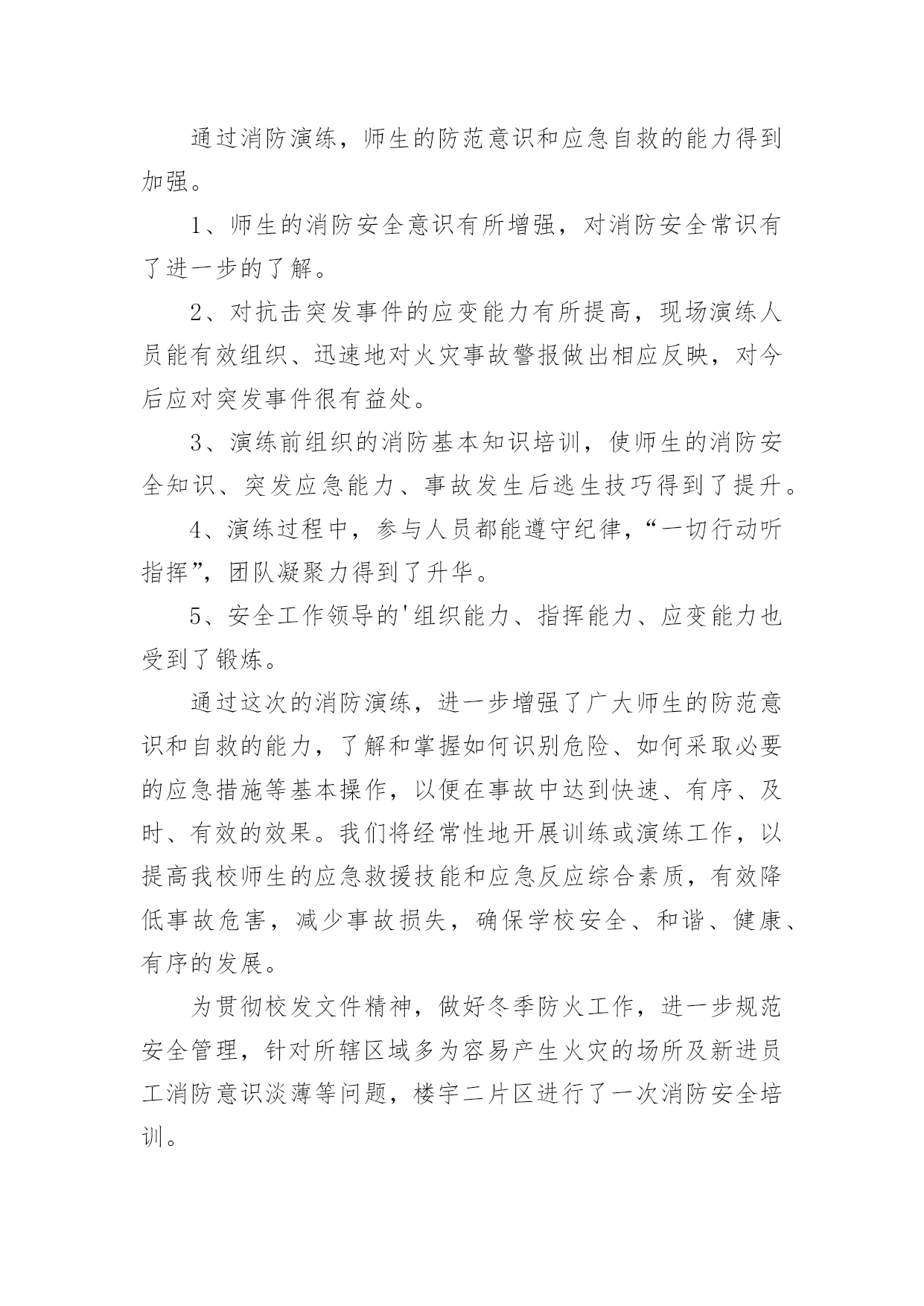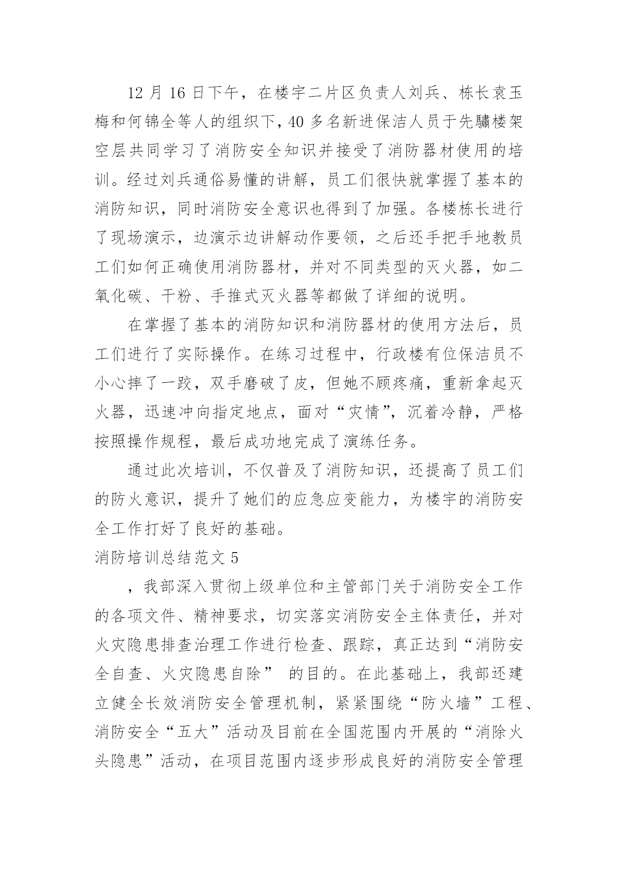 消防培训总结消防培训总结范文8篇[热门]总结是指对某一阶段的工作、学习或思想中的经验或情况加以总结和概括的书面材料,它是增长才干的一种好办法,因此我们要做好归纳,写好总结。总结你想好怎么写了吗?以下是小编整理的消防培训总结范文,欢迎阅读,希望大家能够喜欢。消防培训总结范文1为夯实安全基础,提高公司各管理处员工的消防安全意识,增强员工在火场中的应急应变能力,学会报警、扑救初期火灾以及自救逃生的知识和技能;组织和引导在场群众疏散的知识和技能。各管理处根据公司第一季度消防安全培训要求,结合日常生活中火灾事故,现场演练等形式积极组织员工培训、学习。现将工作情况汇报如下:一、各管理处主管重视,组织措施到位。为确保培训演练活动的有效落实,1月23日,公司召开了安全生产应急疏散演练会议,会上公司经理要求:各管理处主管负责各管理处培训演练活动的方案规划及组织实施,安保部积极配合。通过全体员工的.共同努力,管理处的认真组织,在本季度中培训活动开展得有计划、有布置、有检查、有落实。二、开展了形式多样的培训演练活动。1.1月25日在xxxx管理处开展了一次消防演练。内容:现场示范灭火器使用方法、现场灭火、逃生等。并利用管辖区宣传栏、张贴告示,向广大业主、商家普及安全消防常识。2.春节期间,安保部根据实际情况,在公司范围内利用横幅等宣传工具,以“安全人人抓,幸福千万家”、“为了您和家人的幸福,请您注意安全”等宣传语,大力营造了春节安全氛围,使每一名员工,每一位业主、商家都能积极投入到平安春节中来。3.在元旦、春节前夕开展了全方位的安全消防大检查,并组织了全体员工开展以“工作要安全,我该怎么办”为主题的安全教育反思大讨论活动。4.3月7日综合办组织各管理处员工观看了安全宣传片《人命关天》视频。并在总公司会议室举办了一期安全警示教育培训。进一步强化了员工的安全意识和应急反应能力。三、查找存在的问题和隐患,重在整改落实。在各管理处在全体员工的共同努力下,公司职能部门的指导下,紧紧围绕“安全基础、现场管理”这一主题,遵循“完善标准、落实责任,从严规范员工安全管理行为、工作保安行为、维修操作行为”的基本管理方法。1.加强管辖区安全检查,定期对小区电梯、供配电、供水等重要设备设施检查,如有问题及时进行整改;2.加强管辖区的治安管理,保障业主、商家人身财务安全,在第一季度中,各管理处护卫队处共抓获可疑人员近30人,有效保障了管辖区的安全,获得了业主与商家的称赞。3.各管理处班组队加强安全知识的学习,按时按质完成管理处安全质量环境管理工作情况的上报,认真落实对所查出隐患的整改工作。四、下一步工作重点。为稳步推进各管理处班组队安全建设,严格落实公司安全生产责任制,进一步增强一线员工的履职责任心,将本季度好的措施、方法落实到实处和富有成效,公司职能部门要经常到各管理处进行现场安全检查,始终将安全生产工作摆在首位位置,并针对工作中出现的不良现象,要及时指导、督促、反馈,认真落实所查出隐患的整改工作和跟踪管理,保证各管理处工作各项工作正常开展。消防培训总结范文2为进一步加强学校安全工作,提高全体师生的安全防范逃生、自救、互救意识,X月xx日下午,xx小学组织全校师生进行安全疏散应急演练,在演练过程中,教师沉着冷静,指挥若定,同学们临危不惧,迅捷有序,演练取得圆满成功。现就疏散演练活动情况总结如下:我们以“生命至上,平安和谐”为活动主题,通过开展丰富多彩的消防宣传教育活动,切实提高全体师生的消防意识,增强消防素质,提高抗御火灾的`整体能力,为构建社会主义和谐社会创造良好的消防安全环境。为确保“119”消防日宣传周活动取得实效,我校成立了立了以李国兴校长为组长的领导小组。我们采取举行主题队会,消防知识手抄报,消防知识讲座,发放宣传资料,张贴宣传挂图等师生喜闻乐见的形式,广泛开展消防宣传教育活动,积极营造良好的宣传氛围。学校要通过上消防课,举行消防知识竞赛,播放消防知识影片,举办趣味消防知识运动会等活动,利用闭路电视,校园网络,制作消防宣传板报,散发消防宣传资料等形式使学校消防宣传教育更加贴近实际,达到一个孩子带动一个家庭的效果。校园内设置不少于1个2平方米以上的消防宣传固定栏,在校园内醒目位置应悬挂2条以上的消防宣传横幅。组织了一次全校性的消防应急疏散演练,教育学生掌握报警,逃生救护等自防自救基本技能。各班在11月3日-9日期间内安排不少于1个课时的消防安全教育课或一次消防主题班会,讨论消防安全知识及遵守消防法规的心得体会。结合学生实际,印制通俗易懂,携带方便的学生安全知识宣传页,使学生做到“两会两知道”,即会报警,会火场逃生,知道火灾危险性,知道自救逃生常识。举办消防板报,于119当日上午8:30放置在校门口,设置咨询台,发放消防宣传页。在此次活动中我们做到:提高认识,加