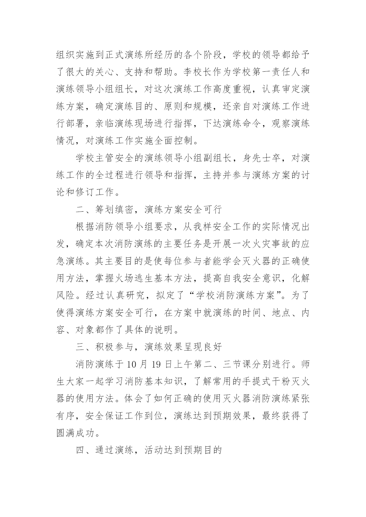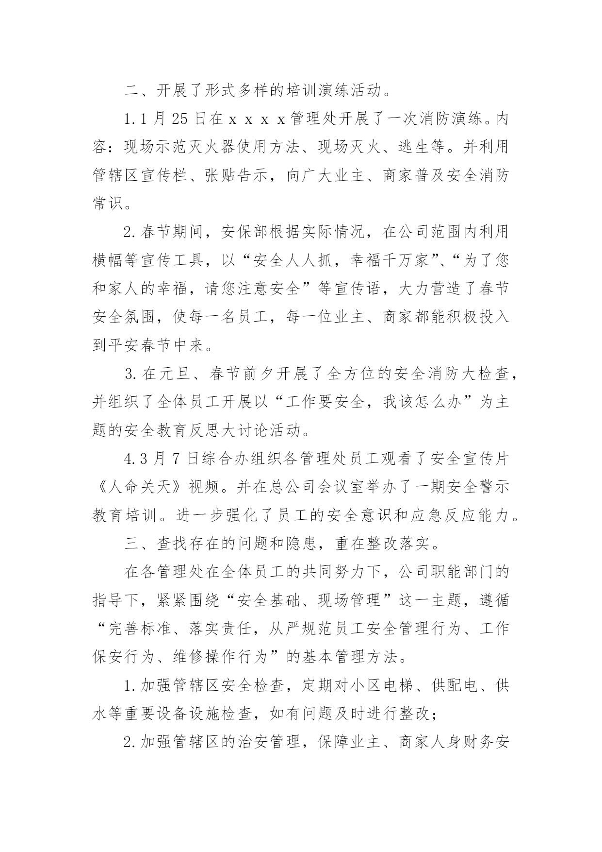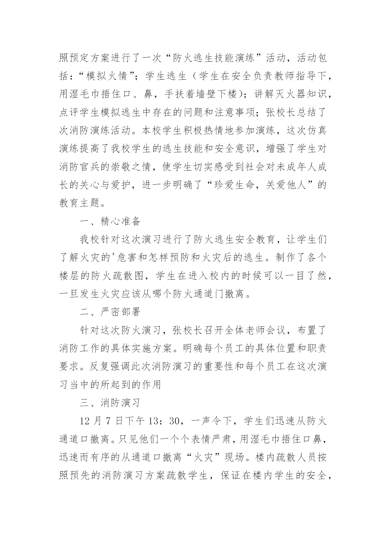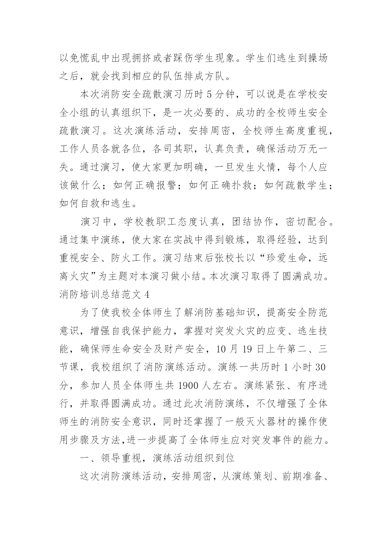 消防培训总结消防培训总结范文8篇[热门]总结是指对某一阶段的工作、学习或思想中的经验或情况加以总结和概括的书面材料,它是增长才干的一种好办法,因此我们要做好归纳,写好总结。总结你想好怎么写了吗?以下是小编整理的消防培训总结范文,欢迎阅读,希望大家能够喜欢。消防培训总结范文1为夯实安全基础,提高公司各管理处员工的消防安全意识,增强员工在火场中的应急应变能力,学会报警、扑救初期火灾以及自救逃生的知识和技能;组织和引导在场群众疏散的知识和技能。各管理处根据公司第一季度消防安全培训要求,结合日常生活中火灾事故,现场演练等形式积极组织员工培训、学习。现将工作情况汇报如下:一、各管理处主管重视,组织措施到位。为确保培训演练活动的有效落实,1月23日,公司召开了安全生产应急疏散演练会议,会上公司经理要求:各管理处主管负责各管理处培训演练活动的方案规划及组织实施,安保部积极配合。通过全体员工的.共同努力,管理处的认真组织,在本季度中培训活动开展得有计划、有布置、有检查、有落实。二、开展了形式多样的培训演练活动。1.1月25日在xxxx管理处开展了一次消防演练。内容:现场示范灭火器使用方法、现场灭火、逃生等。并利用管辖区宣传栏、张贴告示,向广大业主、商家普及安全消防常识。2.春节期间,安保部根据实际情况,在公司范围内利用横幅等宣传工具,以“安全人人抓,幸福千万家”、“为了您和家人的幸福,请您注意安全”等宣传语,大力营造了春节安全氛围,使每一名员工,每一位业主、商家都能积极投入到平安春节中来。3.在元旦、春节前夕开展了全方位的安全消防大检查,并组织了全体员工开展以“工作要安全,我该怎么办”为主题的安全教育反思大讨论活动。4.3月7日综合办组织各管理处员工观看了安全宣传片《人命关天》视频。并在总公司会议室举办了一期安全警示教育培训。进一步强化了员工的安全意识和应急反应能力。三、查找存在的问题和隐患,重在整改落实。在各管理处在全体员工的共同努力下,公司职能部门的指导下,紧紧围绕“安全基础、现场管理”这一主题,遵循“完善标准、落实责任,从严规范员工安全管理行为、工作保安行为、维修操作行为”的基本管理方法。1.加强管辖区安全检查,定期对小区电梯、供配电、供水等重要设备设施检查,如有问题及时进行整改;2.加强管辖区的治安管理,保障业主、商家人身财务安全,在第一季度中,各管理处护卫队处共抓获可疑人员近30人,有效保障了管辖区的安全,获得了业主与商家的称赞。3.各管理处班组队加强安全知识的学习,按时按质完成管理处安全质量环境管理工作情况的上报,认真落实对所查出隐患的整改工作。四、下一步工作重点。为稳步推进各管理处班组队安全建设,严格落实公司安全生产责任制,进一步增强一线员工的履职责任心,将本季度好的措施、方法落实到实处和富有成效,公司职能部门要经常到各管理处进行现场安全检查,始终将安全生产工作摆在首位位置,并针对工作中出现的不良现象,要及时指导、督促、反馈,认真落实所查出隐患的整改工作和跟踪管理,保证各管理处工作各项工作正常开展。消防培训总结范文2为进一步加强学校安全工作,提高全体师生的安全防范逃生、自救、互救意识,X月xx日下午,xx小学组织全校师生进行安全疏散应急演练,在演练过程中,教师沉着冷静,指挥若定,同学们临危不惧,迅捷有序,演练取得圆满成功。现就疏散演练活动情况总结如下:我们以“生命至上,平安和谐”为活动主题,通过开展丰富多彩的消防宣传教育活动,切实提高全体师生的消防意识,增强消防素质,提高抗御火灾的`整体能力,为构建社会主义和谐社会创造良好的消防安全环境。为确保“119”消防日宣传周活动取得实效,我校成立了立了以李国兴校长为组长的领导小组。我们采取举行主题队会,消防知识手抄报,消防知识讲座,发放宣传资料,张贴宣传挂图等师生喜闻乐见的形式,广泛开展消防宣传教育活动,积极营造良好的宣传氛围。学校要通过上消防课,举行消防知识竞赛,播放消防知识影片,举办趣味消防知识运动会等活动,利用闭路电视,校园网络,制作消防宣传板报,散发消防宣传资料等形式使学校消防宣传教育更加贴近实际,达到一个孩子带动一个家庭的效果。校园内设置不少于1个2平方米以上的消防宣传固定栏,在校园内醒目位置应悬挂2条以上的消防宣传横幅。组织了一次全校性的消防应急疏散演练,教育学生掌握报警,逃生救护等自防自救基本技能。各班在11月3日-9日期间内安排不少于1个课时的消防安全教育课或一次消防主题班会,讨论消防安全知识及遵守消防法规的心得体会。结合学生实际,印制通俗易懂,携带方便的学生安全知识宣传页,使学生做到“两会两知道”,即会报警,会火场逃生,知道火灾危险性,知道自救逃生常识。举办消防板报,于119当日上午8:30放置在校门口,设置咨询台,发放消防宣传页。在此次活动中我们做到:提高认识,加