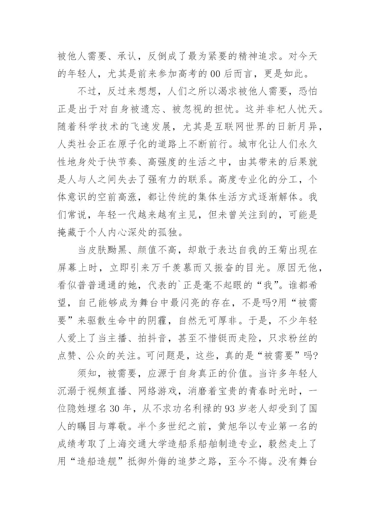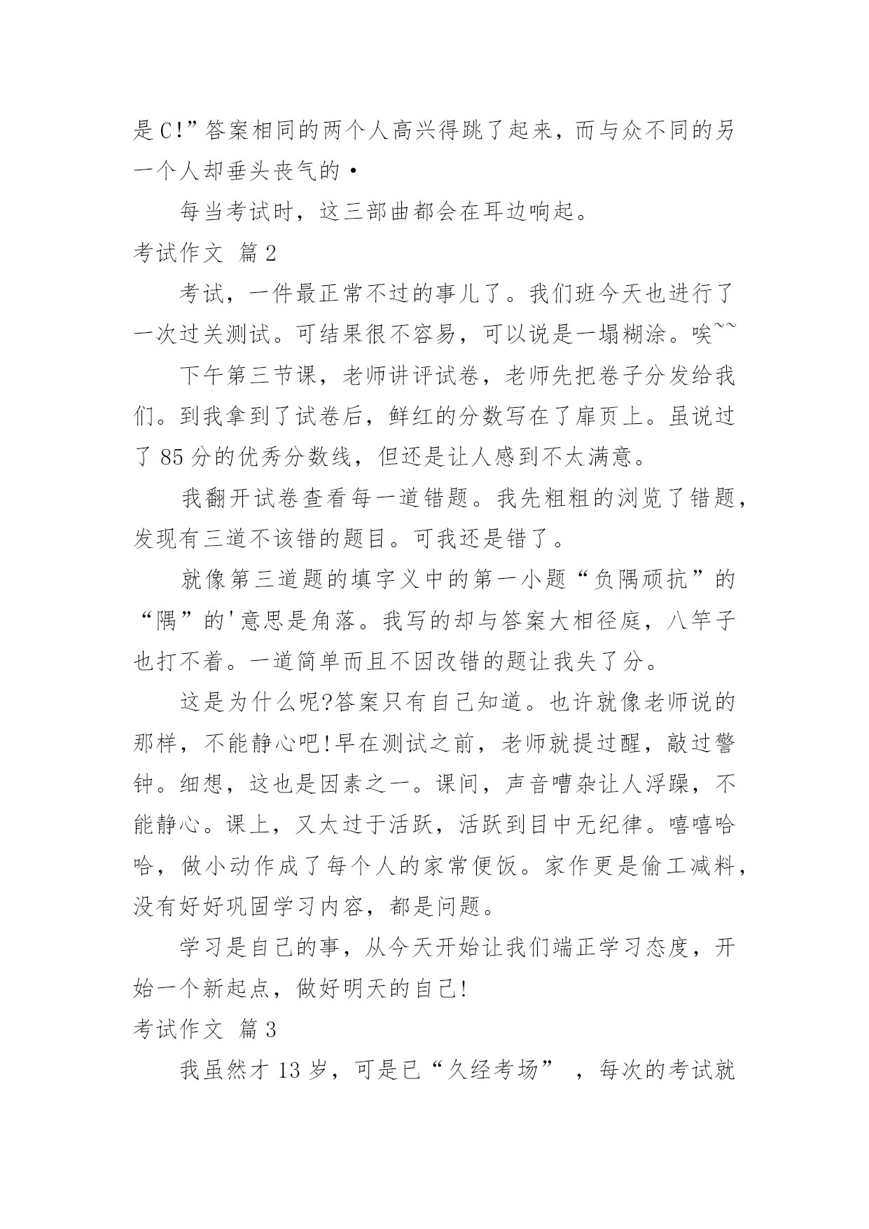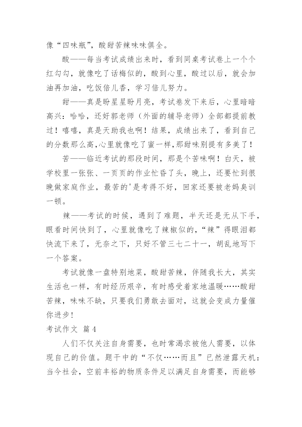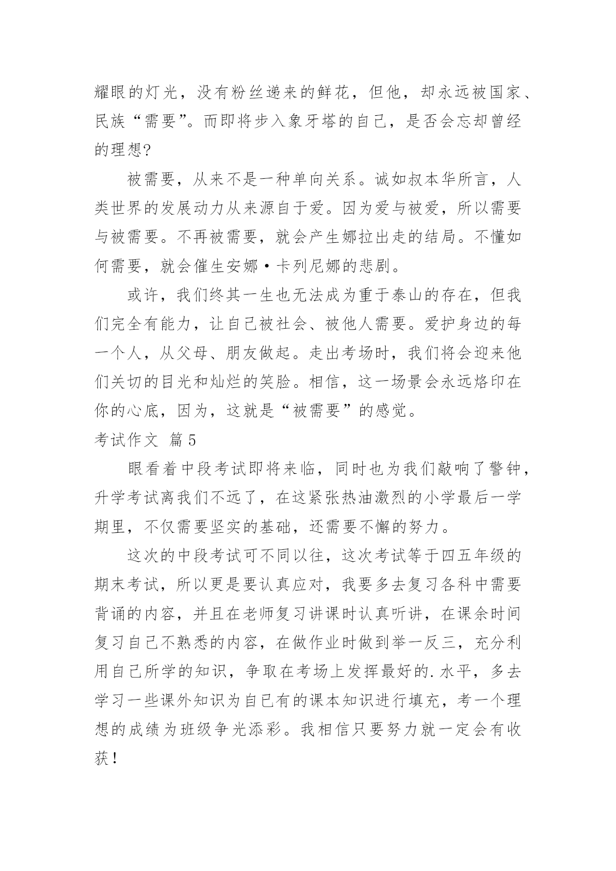 考试作文考试作文汇编(5篇)在学习、工作或生活中,大家一定都接触过作文吧,作文是由文字组成,经过人的思想考虑,通过语言组织来表达一个主题意义的文体。相信很多朋友都对写作文感到非常苦恼吧,以下是小编精心整理的考试作文5篇,欢迎阅读,希望大家能够喜欢。考试作文篇1最近,我们进行了期中考试。这次考试好比是一首交响曲,总结了同学们考前、考中、考后的情况。考前七上八下曲一听说要期中考试,同学们如同热锅上的蚂蚁,急得团团转。有的围在一起讨论着试卷里是否难;有的盘腿坐在椅子上,双手合并,掌心相对,嘴里念叨着:“老天保佑,老天保佑,保佑我能考95分以上·”考中头晕眼花曲试卷发下来以后,同学们纷纷拿起笔“沙沙”地写起来。有的抓耳挠腮,有的交头接耳。我看到一连串的数字和英文,好像在学天文似的,看得我头晕眼花。一次考试下来,可以用一词来形容,那就是“头晕眼花”。考后七嘴八舌曲考试考完后,同学们七嘴八舌地议论起来:“你那题的'答案是什么?”“B!”“我也是耶!”另一个与众不同的说“我是C!”答案相同的两个人高兴得跳了起来,而与众不同的另一个人却垂头丧气的·每当考试时,这三部曲都会在耳边响起。考试作文篇2考试,一件最正常不过的事儿了。我们班今天也进行了一次过关测试。可结果很不容易,可以说是一塌糊涂。唉~~下午第三节课,老师讲评试卷,老师先把卷子分发给我们。到我拿到了试卷后,鲜红的分数写在了扉页上。虽说过了85分的优秀分数线,但还是让人感到不太满意。我翻开试卷查看每一道错题。我先粗粗的浏览了错题,发现有三道不该错的题目。可我还是错了。就像第三道题的填字义中的第一小题“负隅顽抗”的“隅”的'意思是角落。我写的却与答案大相径庭,八竿子也打不着。一道简单而且不因改错的题让我失了分。这是为什么呢?答案只有自己知道。也许就像老师说的那样,不能静心吧!早在测试之前,老师就提过醒,敲过警钟。细想,这也是因素之一。课间,声音嘈杂让人浮躁,不能静心。课上,又太过于活跃,活跃到目中无纪律。嘻嘻哈哈,做小动作成了每个人的家常便饭。家作更是偷工减料,没有好好巩固学习内容,都是问题。学习是自己的事,从今天开始让我们端正学习态度,开始一个新起点,做好明天的自己!考试作文篇3我虽然才13岁,可是已“久经考场”,每次的考试就像“四味瓶”,酸甜苦辣味味俱全。酸——每当考试成绩出来时,看到同桌考试卷上一个个红勾勾,就像吃了话梅似的,酸到心里,酸过以后,就会加油再加油,吃饭倍儿香,学习倍儿努力。甜——真是盼星星盼月亮,考试卷发下来后,心里暗暗高兴:哈哈,还好郭老师(外面的辅导老师)全部都提前教过!嘻嘻,真是天助我也啊!结果,成绩出来了,看到自己的分数那么高,心里就像吃了蜜一样,那甜味别提有多美了!苦——临近考试的那段时间,那是个苦味啊!白天,被学校里一张张、一页页的作业忙昏了头,晚上,还要忙到很晚做家庭作业,最苦的'是考得不好,回家还要被老妈臭训一顿。辣——考试的时候,遇到了难题,半天还是无从下手,眼看时间快到了,心里就像吃了辣椒似的,“辣”得眼泪都快流下来了,无奈之下,只好不管三七二十一,胡乱地写下一个答案。考试就像一盘特别地菜,酸甜苦辣,伴随我长大,其实生活也一样,有时经历艰辛,有时感受着家地温暖……酸甜苦辣,味味不缺,只要我们勇敢去面对,这就会变成力量催你进步!考试作文篇4人们不仅关注自身需要,也时常渴求被他人需要,以体现自己的价值。题干中的“不仅……而且”已然泄露天机:当今社会,空前丰裕的物质条件足以满足自身需要,而能够被他人需要、承认,反倒成了最为紧要的精神追求。对今天的年轻人,尤其是前来参加高考的00后而言,更是如此。不过,反过来想想,人们之所以渴求被他人需要,恐怕正是出于对自身被遗忘、被忽视的担忧。这并非杞人忧天。随着科学技术的飞速发展,尤其是互联网世界的日新月异,人类社会正在原子化的道路上不断前行。城市化让人们永久性地身处于快节奏、高强度的生活之中,由其带来的后果就是人与人之间失去了强有力的联系。高度专业化的分工,个体意识的空前高涨,都让传统的集体生活方式逐渐解体。我们常说,年轻一代越来越有主见,但未曾关注到的,可能是掩藏于个人内心深处的孤独。当皮肤黝黑、颜值不高,却敢于表达自我的王菊出现在屏幕上时,立即引来万千羡慕而又振奋的目光。原因无他,看似普普通通的她,代表的`正是毫不起眼的“我”。谁都希望,自己能够成为舞台中最闪亮的存在,不是吗?用“被需要”来驱散生命中的阴霾,自然无可厚非。于是,不少年轻人爱上了当主播、拍抖音,甚至不惜铤而走险,只求粉丝的点赞、公众的关注。可问题是,这些,真的是“被需要”吗?须知,被需要,应源于自身真正的价值。当许多年轻人沉溺于视频直播、网络游戏,消磨着宝贵的青春时光时,一位隐姓埋名30年,从不求功名利禄的93岁老人却受到了国人的瞩目与尊敬。半个