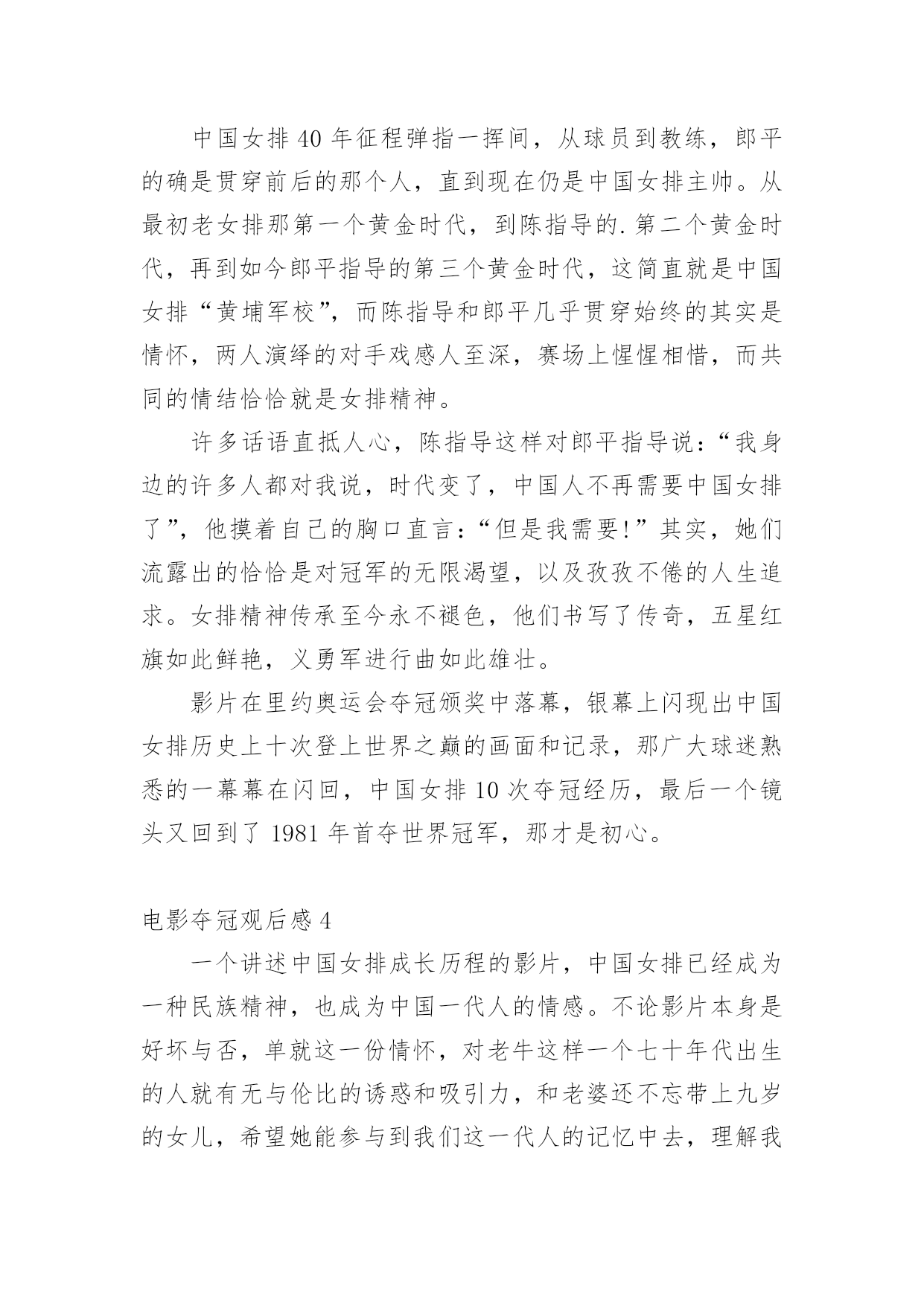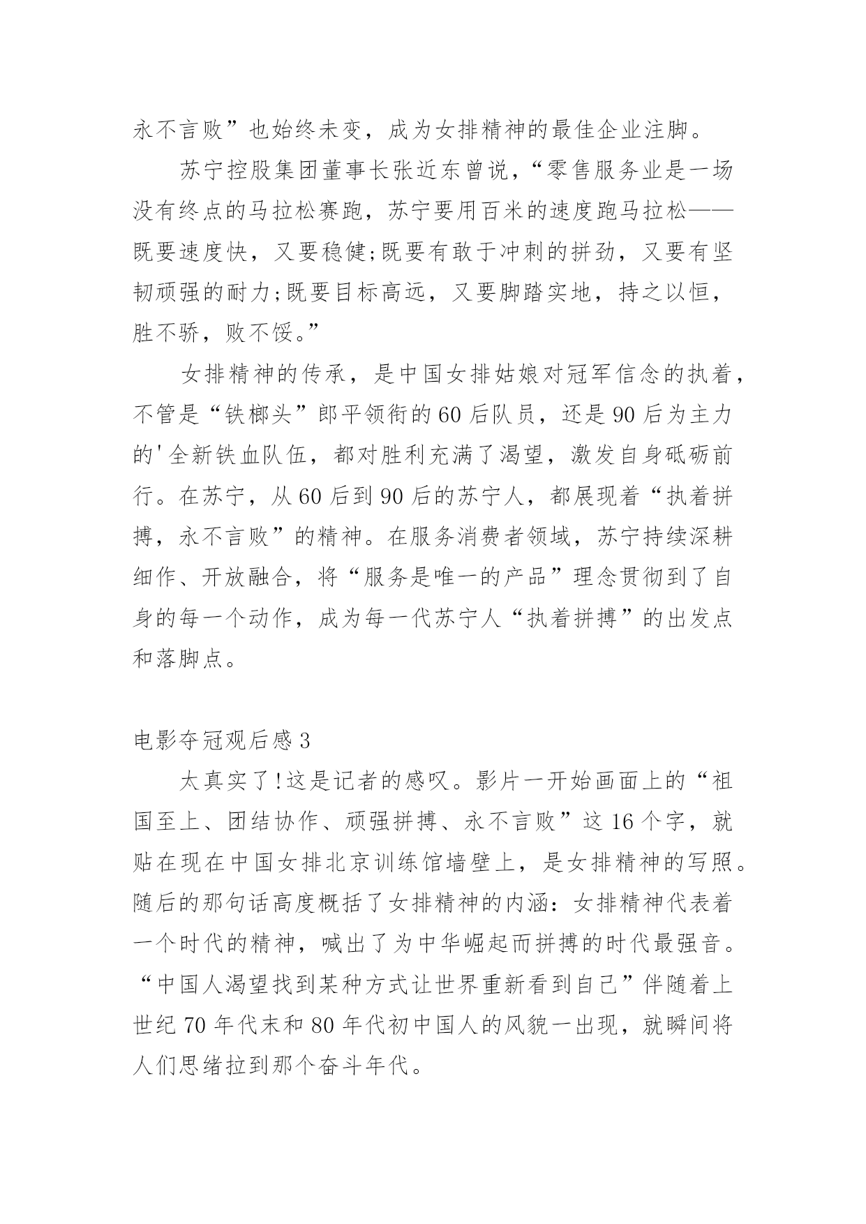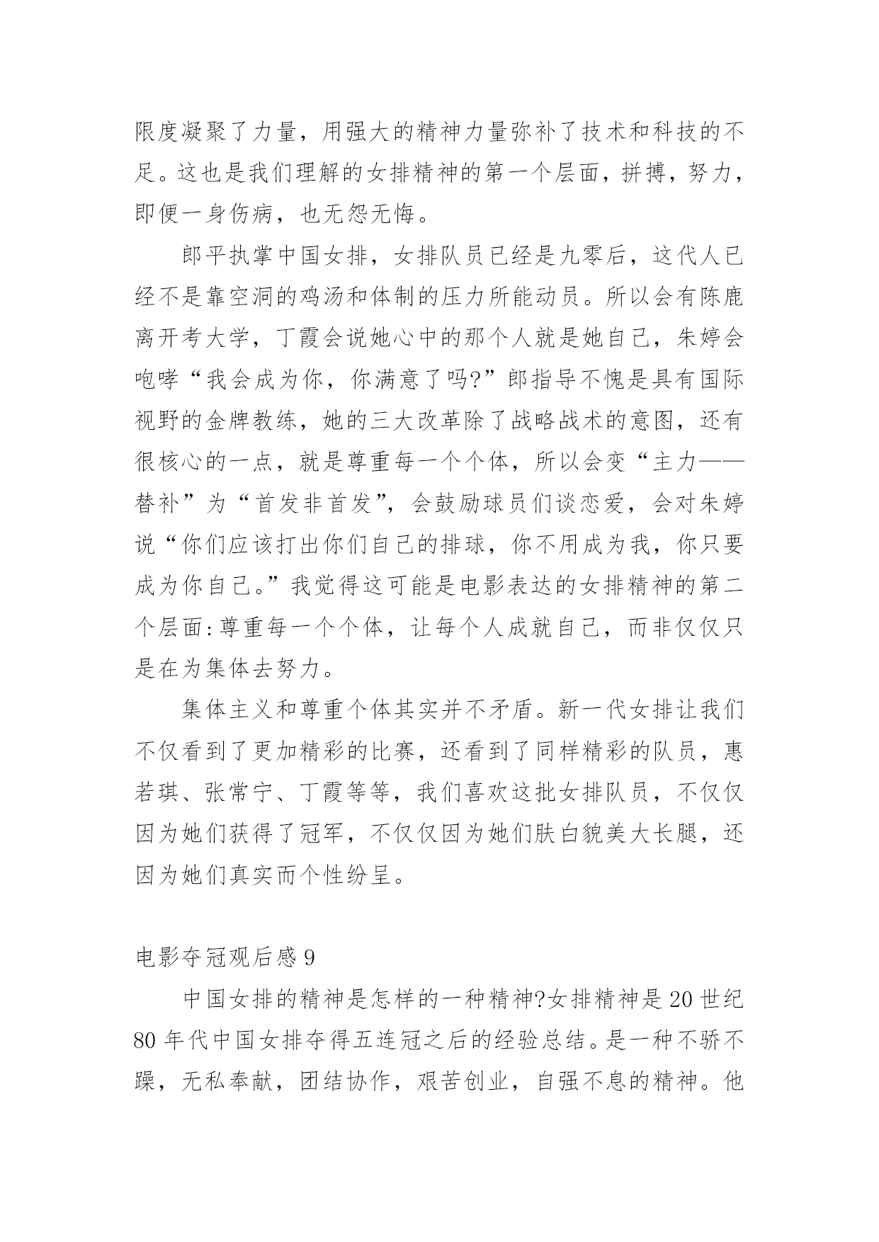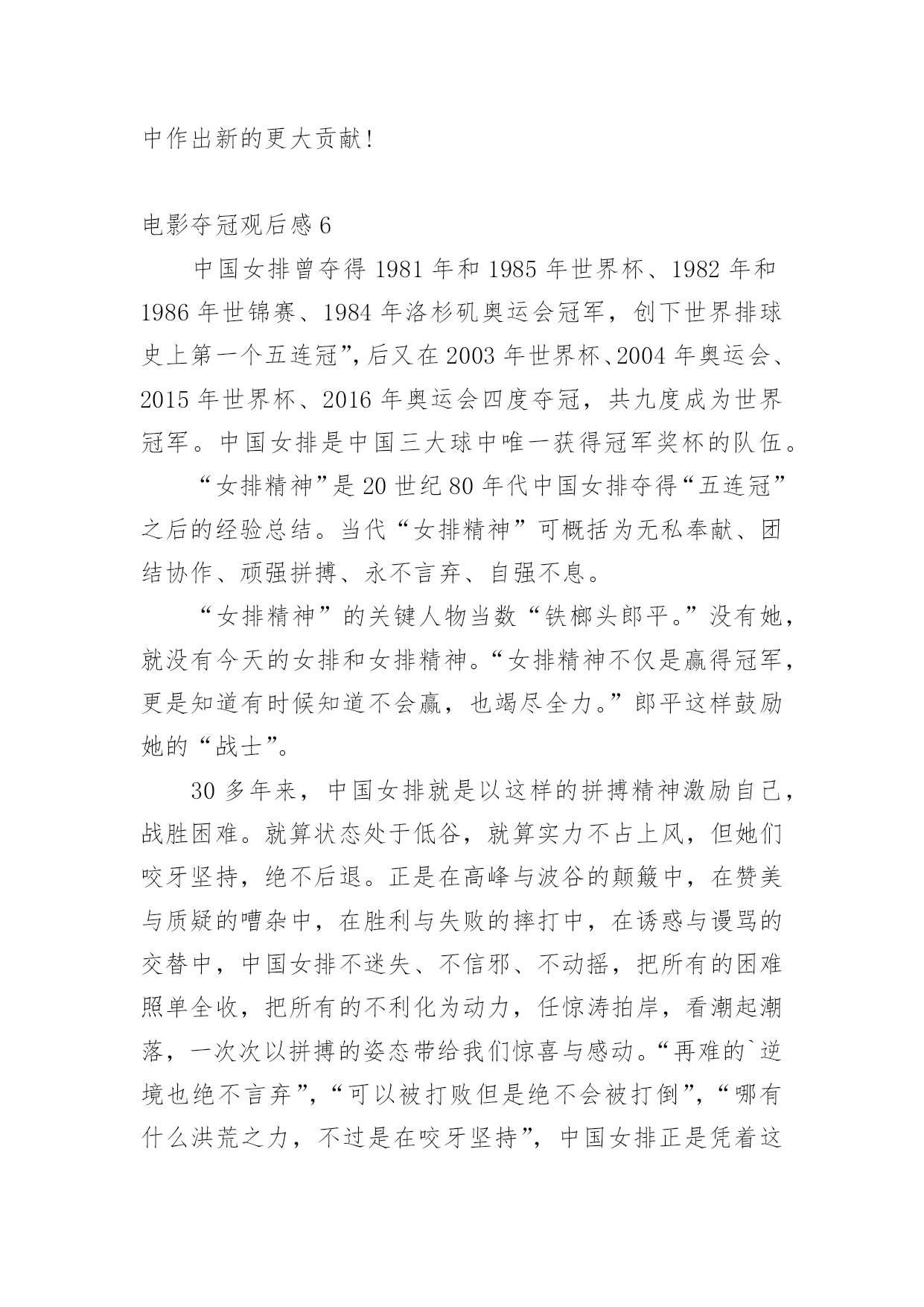 电影夺冠观后感电影夺冠观后感精选11篇当品味完一部作品后,从中我们可以吸收新的思想,为此需要好好认真地写观后感。千万不能认为观后感随便应付就可以,以下是小编为大家收集的电影夺冠观后感,希望能够帮助到大家。电影夺冠观后感1坚不可摧的力量,就是“女排精神”。女排姑娘们即便是失败了,也没有意志消沉、“团队精神”依然存在,“军心”依然牢不可摧。女排姑娘们脚踏实地、年复一年、日复一日的“地狱式”训练,她们将最美年华奉献了出来,不攀美、不浓妆艳抹,整日身处“与世隔绝”的环境,用尽全力塑造了永不言败的斗志和“女排精神”。女排精神好似一颗火种,一代代人被她感召、受她鼓舞,激发出奋进的动力,这力量源源不断、薪火相传。这种精气神,不仅体现在历届女排教练员、队员身上,也展现在每一个被她感染、热爱她、传承她的人身上。女排精神也走出国门,为世界人民认可、钦佩,成为中华民族精神的重要内涵之一。在2016年里约奥运会女排决赛现场,随着女排队长惠若琪一记利落的探头球,中国女排拿下夺冠的最后一分,英国BBC的解说员激动地说:“中国女排完美诠释了奥运精神!中国证明了,重要的`不是如何开始,而是怎样结束。中国是本届奥运的冠军!”“用微笑面对蹉跎,看我光明和磊落。仰望着,夜空最亮的星火。所以我爱过,在角落天空海阔。不害怕折磨,因为热爱才值得。风雨过后的洒脱,如出一辙的你我,穿越过,生命之河……”电影《夺冠》的片尾曲《生命之河》中,王菲、那英用温柔而坚定的声音徐徐诉说。电影夺冠观后感21月19日,电影《夺冠》(原名《中国女排》)片尾曲发布,王菲那英两位乐坛天后联袂献唱#生命之河#,美妙的歌声娓娓道出几代女排的心声,也让更多人想去影院重温振奋几代国人的女排精神。从上个世纪80年代的五连冠开始,中国女排有辉煌也有低谷,但女排姑娘们始终将不畏强敌、顽强拼搏、永不言弃的女排精神代代相传,并发扬光大。在不到40年的时间里,中国女排十夺世界冠军,为国争光,不仅极大地激发了国人的自豪、自尊和自信,更成为鼓舞以苏宁为代表的中国企业奋勇拼搏的楷模。传承不辍,坚守自己的未来1981年,中国女排第一次夺冠,中国女排精神开启传承;1990年,张近东创立苏宁,将“执着拼搏、永不言败”定为苏宁的企业精神。30多年来,中国女排无论兴与衰,女排精神从未缺席;而苏宁无论沉淀期还是跃升期,“执着拼搏、永不言败”也始终未变,成为女排精神的最佳企业注脚。苏宁控股集团董事长张近东曾说,“零售服务业是一场没有终点的马拉松赛跑,苏宁要用百米的速度跑马拉松——既要速度快,又要稳健;既要有敢于冲刺的拼劲,又要有坚韧顽强的耐力;既要目标高远,又要脚踏实地,持之以恒,胜不骄,败不馁。”女排精神的传承,是中国女排姑娘对冠军信念的执着,不管是“铁榔头”郎平领衔的60后队员,还是90后为主力的'全新铁血队伍,都对胜利充满了渴望,激发自身砥砺前行。在苏宁,从60后到90后的苏宁人,都展现着“执着拼搏,永不言败”的精神。在服务消费者领域,苏宁持续深耕细作、开放融合,将“服务是唯一的产品”理念贯彻到了自身的每一个动作,成为每一代苏宁人“执着拼搏”的出发点和落脚点。电影夺冠观后感3太真实了!这是记者的感叹。影片一开始画面上的“祖国至上、团结协作、顽强拼搏、永不言败”这16个字,就贴在现在中国女排北京训练馆墙壁上,是女排精神的写照。随后的那句话高度概括了女排精神的内涵:女排精神代表着一个时代的精神,喊出了为中华崛起而拼搏的时代最强音。“中国人渴望找到某种方式让世界重新看到自己”伴随着上世纪70年代末和80年代初中国人的风貌一出现,就瞬间将人们思绪拉到那个奋斗年代。中国女排40年征程弹指一挥间,从球员到教练,郎平的确是贯穿前后的那个人,直到现在仍是中国女排主帅。从最初老女排那第一个黄金时代,到陈指导的.第二个黄金时代,再到如今郎平指导的第三个黄金时代,这简直就是中国女排“黄埔军校”,而陈指导和郎平几乎贯穿始终的其实是情怀,两人演绎的对手戏感人至深,赛场上惺惺相惜,而共同的情结恰恰就是女排精神。许多话语直抵人心,陈指导这样对郎平指导说:“我身边的许多人都对我说,时代变了,中国人不再需要中国女排了”,他摸着自己的胸口直言:“但是我需要!”其实,她们流露出的恰恰是对冠军的无限渴望,以及孜孜不倦的人生追求。女排精神传承至今永不褪色,他们书写了传奇,五星红旗如此鲜艳,义勇军进行曲如此雄壮。影片在里约奥运会夺冠颁奖中落幕,银幕上闪现出中国女排历史上十次登上世界之巅的画面和记录,那广大球迷熟悉的一幕幕在闪回,中国女排10次夺冠经历,最后一个镜头又回到了1981年首夺世界冠军,那才是初心。电影夺冠观后感4一个讲述中国女排成长历程的影片,中国女排已经成为一种民族精神,也成为中国一代人的情感。不论影片本身是好坏与否,单就这一份情怀,对老牛这样一个七十年代