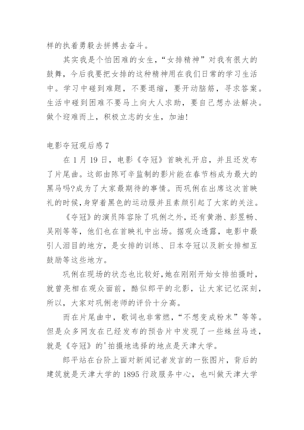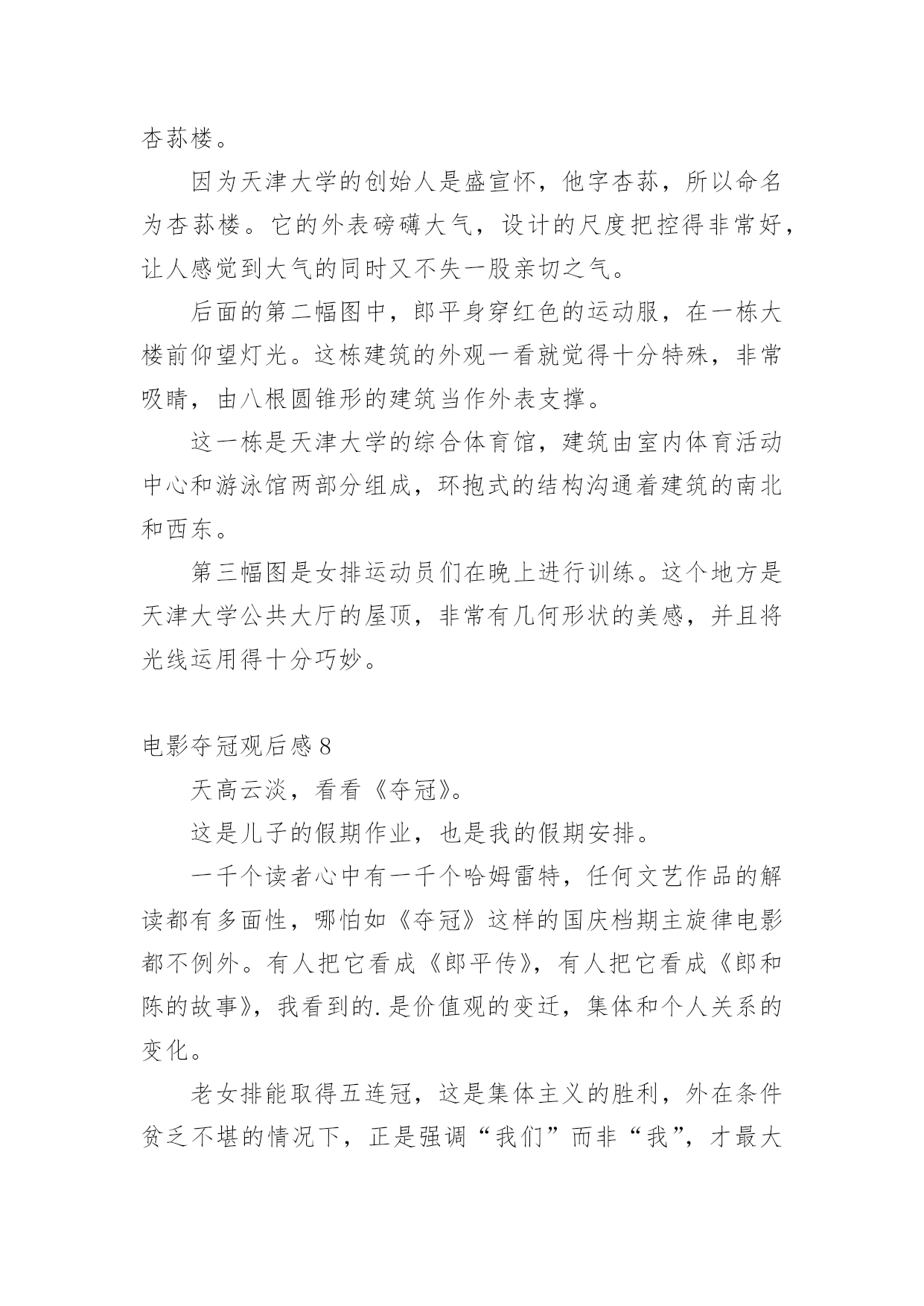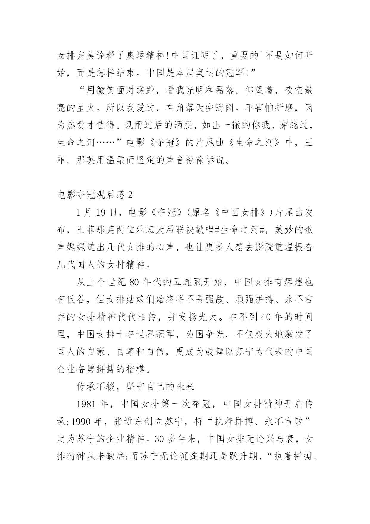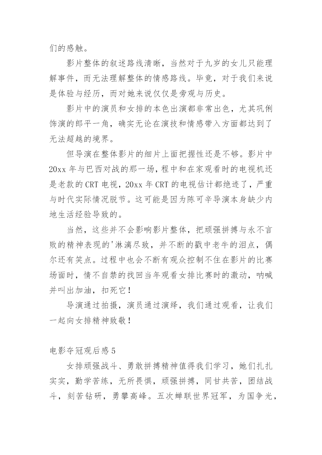 电影夺冠观后感电影夺冠观后感精选11篇当品味完一部作品后,从中我们可以吸收新的思想,为此需要好好认真地写观后感。千万不能认为观后感随便应付就可以,以下是小编为大家收集的电影夺冠观后感,希望能够帮助到大家。电影夺冠观后感1坚不可摧的力量,就是“女排精神”。女排姑娘们即便是失败了,也没有意志消沉、“团队精神”依然存在,“军心”依然牢不可摧。女排姑娘们脚踏实地、年复一年、日复一日的“地狱式”训练,她们将最美年华奉献了出来,不攀美、不浓妆艳抹,整日身处“与世隔绝”的环境,用尽全力塑造了永不言败的斗志和“女排精神”。女排精神好似一颗火种,一代代人被她感召、受她鼓舞,激发出奋进的动力,这力量源源不断、薪火相传。这种精气神,不仅体现在历届女排教练员、队员身上,也展现在每一个被她感染、热爱她、传承她的人身上。女排精神也走出国门,为世界人民认可、钦佩,成为中华民族精神的重要内涵之一。在2016年里约奥运会女排决赛现场,随着女排队长惠若琪一记利落的探头球,中国女排拿下夺冠的最后一分,英国BBC的解说员激动地说:“中国女排完美诠释了奥运精神!中国证明了,重要的`不是如何开始,而是怎样结束。中国是本届奥运的冠军!”“用微笑面对蹉跎,看我光明和磊落。仰望着,夜空最亮的星火。所以我爱过,在角落天空海阔。不害怕折磨,因为热爱才值得。风雨过后的洒脱,如出一辙的你我,穿越过,生命之河……”电影《夺冠》的片尾曲《生命之河》中,王菲、那英用温柔而坚定的声音徐徐诉说。电影夺冠观后感21月19日,电影《夺冠》(原名《中国女排》)片尾曲发布,王菲那英两位乐坛天后联袂献唱#生命之河#,美妙的歌声娓娓道出几代女排的心声,也让更多人想去影院重温振奋几代国人的女排精神。从上个世纪80年代的五连冠开始,中国女排有辉煌也有低谷,但女排姑娘们始终将不畏强敌、顽强拼搏、永不言弃的女排精神代代相传,并发扬光大。在不到40年的时间里,中国女排十夺世界冠军,为国争光,不仅极大地激发了国人的自豪、自尊和自信,更成为鼓舞以苏宁为代表的中国企业奋勇拼搏的楷模。传承不辍,坚守自己的未来1981年,中国女排第一次夺冠,中国女排精神开启传承;1990年,张近东创立苏宁,将“执着拼搏、永不言败”定为苏宁的企业精神。30多年来,中国女排无论兴与衰,女排精神从未缺席;而苏宁无论沉淀期还是跃升期,“执着拼搏、永不言败”也始终未变,成为女排精神的最佳企业注脚。苏宁控股集团董事长张近东曾说,“零售服务业是一场没有终点的马拉松赛跑,苏宁要用百米的速度跑马拉松——既要速度快,又要稳健;既要有敢于冲刺的拼劲,又要有坚韧顽强的耐力;既要目标高远,又要脚踏实地,持之以恒,胜不骄,败不馁。”女排精神的传承,是中国女排姑娘对冠军信念的执着,不管是“铁榔头”郎平领衔的60后队员,还是90后为主力的'全新铁血队伍,都对胜利充满了渴望,激发自身砥砺前行。在苏宁,从60后到90后的苏宁人,都展现着“执着拼搏,永不言败”的精神。在服务消费者领域,苏宁持续深耕细作、开放融合,将“服务是唯一的产品”理念贯彻到了自身的每一个动作,成为每一代苏宁人“执着拼搏”的出发点和落脚点。电影夺冠观后感3太真实了!这是记者的感叹。影片一开始画面上的“祖国至上、团结协作、顽强拼搏、永不言败”这16个字,就贴在现在中国女排北京训练馆墙壁上,是女排精神的写照。随后的那句话高度概括了女排精神的内涵:女排精神代表着一个时代的精神,喊出了为中华崛起而拼搏的时代最强音。“中国人渴望找到某种方式让世界重新看到自己”伴随着上世纪70年代末和80年代初中国人的风貌一出现,就瞬间将人们思绪拉到那个奋斗年代。中国女排40年征程弹指一挥间,从球员到教练,郎平的确是贯穿前后的那个人,直到现在仍是中国女排主帅。从最初老女排那第一个黄金时代,到陈指导的.第二个黄金时代,再到如今郎平指导的第三个黄金时代,这简直就是中国女排“黄埔军校”,而陈指导和郎平几乎贯穿始终的其实是情怀,两人演绎的对手戏感人至深,赛场上惺惺相惜,而共同的情结恰恰就是女排精神。许多话语直抵人心,陈指导这样对郎平指导说:“我身边的许多人都对我说,时代变了,中国人不再需要中国女排了”,他摸着自己的胸口直言:“但是我需要!”其实,她们流露出的恰恰是对冠军的无限渴望,以及孜孜不倦的人生追求。女排精神传承至今永不褪色,他们书写了传奇,五星红旗如此鲜艳,义勇军进行曲如此雄壮。影片在里约奥运会夺冠颁奖中落幕,银幕上闪现出中国女排历史上十次登上世界之巅的画面和记录,那广大球迷熟悉的一幕幕在闪回,中国女排10次夺冠经历,最后一个镜头又回到了1981年首夺世界冠军,那才是初心。电影夺冠观后感4一个讲述中国女排成长历程的影片,中国女排已经成为一种民族精神,也成为中国一代人的情感。不论影片本身是好坏与否,单就这一份情怀,对老牛这样一个七十年代