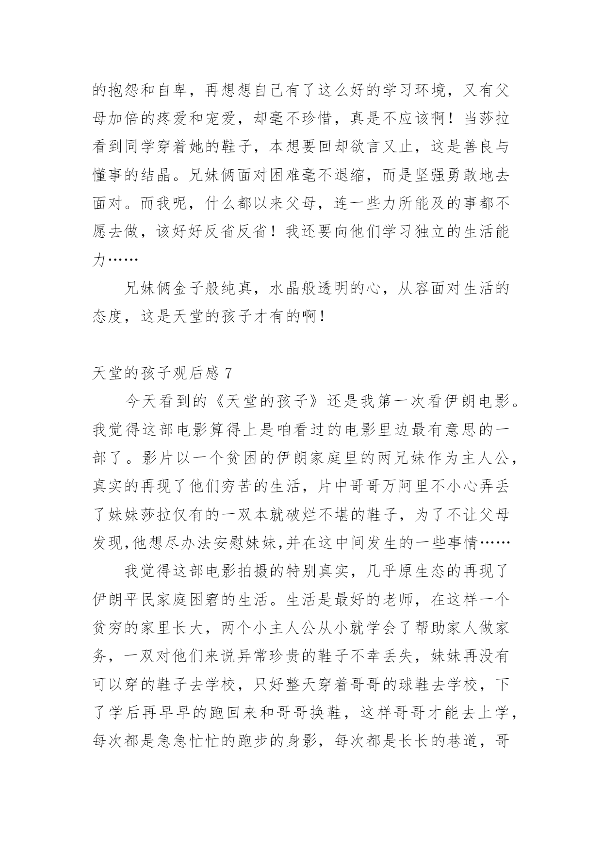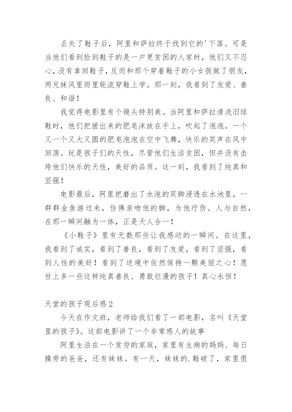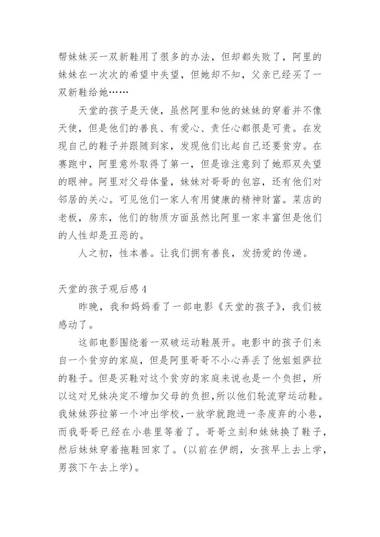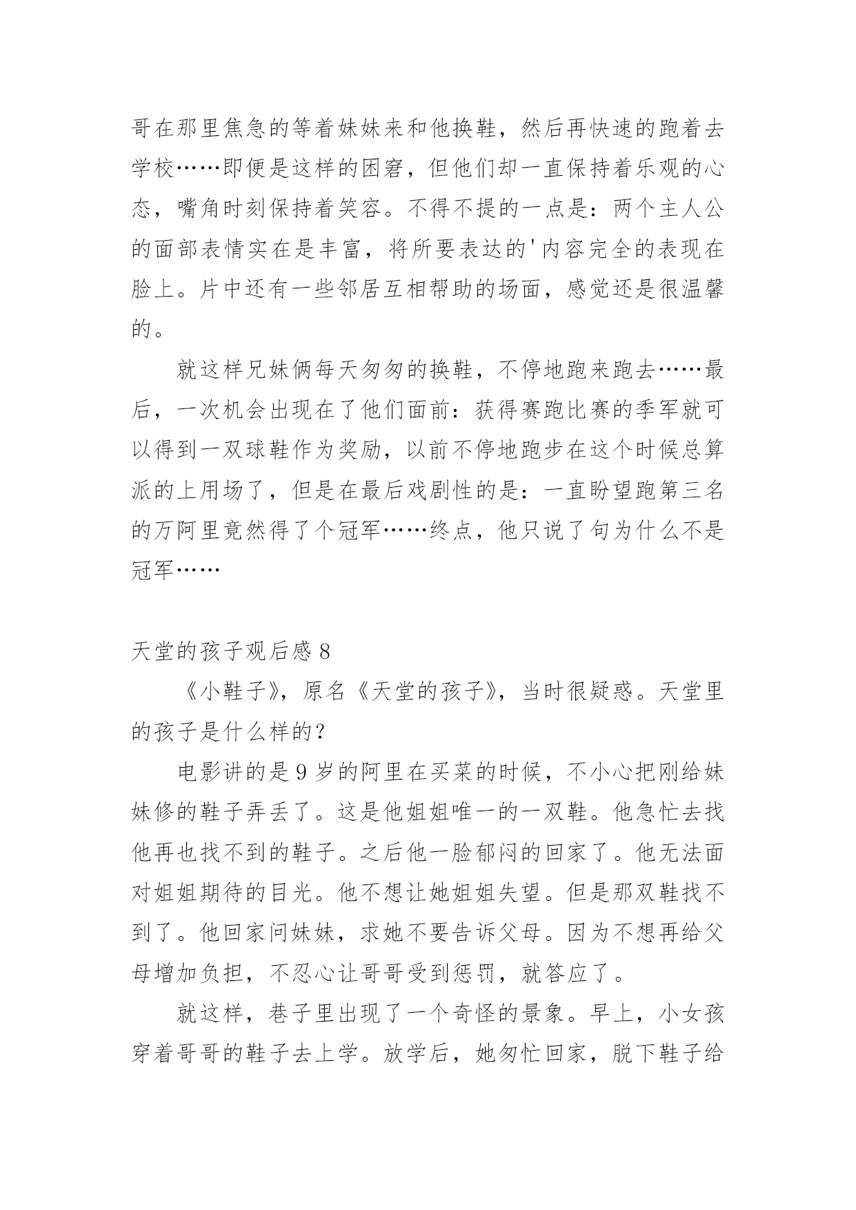 天堂的孩子观后感天堂的孩子观后感(15篇)当认真看完一部作品后,从中我们可以吸收新的思想,此时需要认真地做好记录,写写观后感了。那么你真的懂得怎么写观后感吗?以下是小编精心整理的天堂的孩子观后感,欢迎阅读与收藏。天堂的孩子观后感1阳光热辣辣的,湛蓝色的湖边,一个小男孩正为了他的承诺,拼命地跑着,跑着,跑着,他的简陋又整洁的衣衫,迎风飘动……这个小男孩就是阿里。“嗖嗖嗖”铁针在一双粉红色的女鞋上来回穿梭。“30比索。”阿里拿起这双修好的鞋,却在蔬菜店里意外弄丢了。而这是他妹妹萨拉唯一的一双鞋!阿里和妹妹只好瞒着爸爸,每天轮流穿一双旧球鞋。为了能兑现给妹妹一双新鞋,阿里参加市里比赛想要得到季军,只因为季军的奖品是球鞋。结果他得了冠军,觉得失落愧疚,泪流满面!而此刻他的爸爸正在回家路上,板车里放着两双新鞋,一双白色,一双红色……阿里家很穷。有一天妹妹萨拉给爸爸泡水需要糖,而当时阿里的爸爸正在把一大包糖块敲成小块,但他也没碰一下那些别人交给他保管的糖。在这小小的瞬间,我看到了诚实!丢失了鞋子后,阿里和萨拉终于找到它的'下落。可是当他们看到捡到鞋子的是一户更贫困的人家时,他们又不忍心,没有拿回鞋子,反而和那个穿着鞋子的小女孩做了朋友,两兄妹风里雨里轮流穿鞋上学。那一刻,我看到了友爱、善良、和谐!我觉得电影里有个镜头特别美。当阿里和萨拉清洗旧球鞋时,他们把搓出来的肥皂沫放在手上,吹起了泡泡。一个又一个又大又圆的肥皂泡泡在空中飞舞,快乐的笑声在风中回荡。玩是孩子们的天性,尽管他们生活贪困,但并没有击垮他们快乐的天性,美好的品质。这一刻,我看到了纯真和坚强!电影最后,阿里把磨出了水泡的双脚浸透在水池里,一群群金鱼游过来,仿佛亲吻他的脚,为他疗伤。人与自然,在那一瞬间融为一体,正是天人合一!《小鞋子》里有无数那些让我感动的一瞬间。在这里,我看到了诚实,看到了善良,看到了友爱,看到了坚强,看到人性的美好!看到了逆境中依然保持一颗美丽之心!愿世上多一些这样纯真善良、勇敢烂漫的孩子!真心永恒!天堂的孩子观后感2今天在作文班,老师给我们看了一部电影,名叫《天堂里的孩子》。这部电影讲了一个非常感人的故事阿里生活在一个贫穷的家庭,家里有生病的妈妈、每日操劳的爸爸,还有妹妹。有一天,妹妹的.鞋破了,家里很穷,所以没法给莎丽买一双新鞋子。阿里把妹妹的鞋子拿去补好后,拎着鞋子去买土豆,没想到鞋子被捡东西的人拿走了,怎么找都找不到。阿里怕被爸爸打,就瞒着父母,让妹妹和自己换着穿同一双鞋。阿里想:爸爸发了工资才有钱,如果现在告诉爸爸,爸爸一定会向别人借钱的。每天阿里都要等妹妹放学回来才能去上学,有一次迟到了,被学校的主任看到,严厉地批评了他。学校所在的地区要举行运动会,跑到第二名就可以获得一双新球鞋。阿里央求体育老师让他参加马拉松比赛,可是老师告诉他报名时间已经结束,现在已经不能参加马拉松比赛了,阿里听了不禁流下了泪水。阿里的泪水打动了老师,老师让阿里围着操场跑三圈,阿里跑的时候老师的脸上露出了灿烂的笑容,他终于如愿以偿地参加了比赛。比赛那天,阿里拼了命地向前跑,可是他想到只有第二名才能得到一双球鞋,所以速度渐渐慢了下来。等他跑到第二名的时候有一个同学故意绊了阿里一脚,阿里摔倒了。看到这,周围的人们都在底下喊:阿里快站起来,站起来啊!这时阿里终于站起来了,而这时他已经落后别人很长一段路程了。他不顾一切地往前跑,没想到昏头昏脑地居然冲到了第一名,他不能得到球鞋了。领奖的时候,阿里低着头哭了,泪水从他的脸上流下来。看到这里,教室里可真安静了,有些同学忍不住跟着流下了眼泪。我想:阿里是多么懂事啊,贫穷的生活并没有让阿里变得懦弱,反而使他懂得担当。真是好样的!这部电影的最后一个镜头是:阿里的爸爸从城里回来,带回了两双新鞋。天堂的孩子观后感3《小鞋子》,原名《天堂的孩子》,当时很疑惑。天堂里的孩子是什么样的?电影讲的是9岁的阿里在买菜的时候,不小心把刚给妹妹修的鞋子弄丢了。这是他姐姐唯一的一双鞋。他急忙去找他再也找不到的鞋子。之后他一脸郁闷的回家了。他无法面对姐姐期待的目光。他不想让她姐姐失望。但是那双鞋找不到了。他回家问妹妹,求她不要告诉父母。因为不想再给父母增加负担,不忍心让哥哥受到惩罚,就答应了。就这样,巷子里出现了一个奇怪的景象。早上,小女孩穿着哥哥的鞋子去上学。放学后,她匆忙回家,脱下鞋子给哥哥穿,穿上后,她匆忙去了他的学校。它们就像继电器,每天不停地运转。然而,在此期间,有许多困难。阿里迟到了三次,差点被炒鱿鱼。哥哥的球鞋在姐姐的脚上特别别扭。在别人鞋子的背景下,他的'鞋子明显穿破是因为为鞋子大在跑回家的途中鞋子掉到下水道里。但她相信哥哥会再给她一双鞋。哥哥为了给她一双鞋,和爸爸去了繁华的都市。在如宫殿的房子面前,父亲紧张的说不出话。最后他们终于找到了一户人家