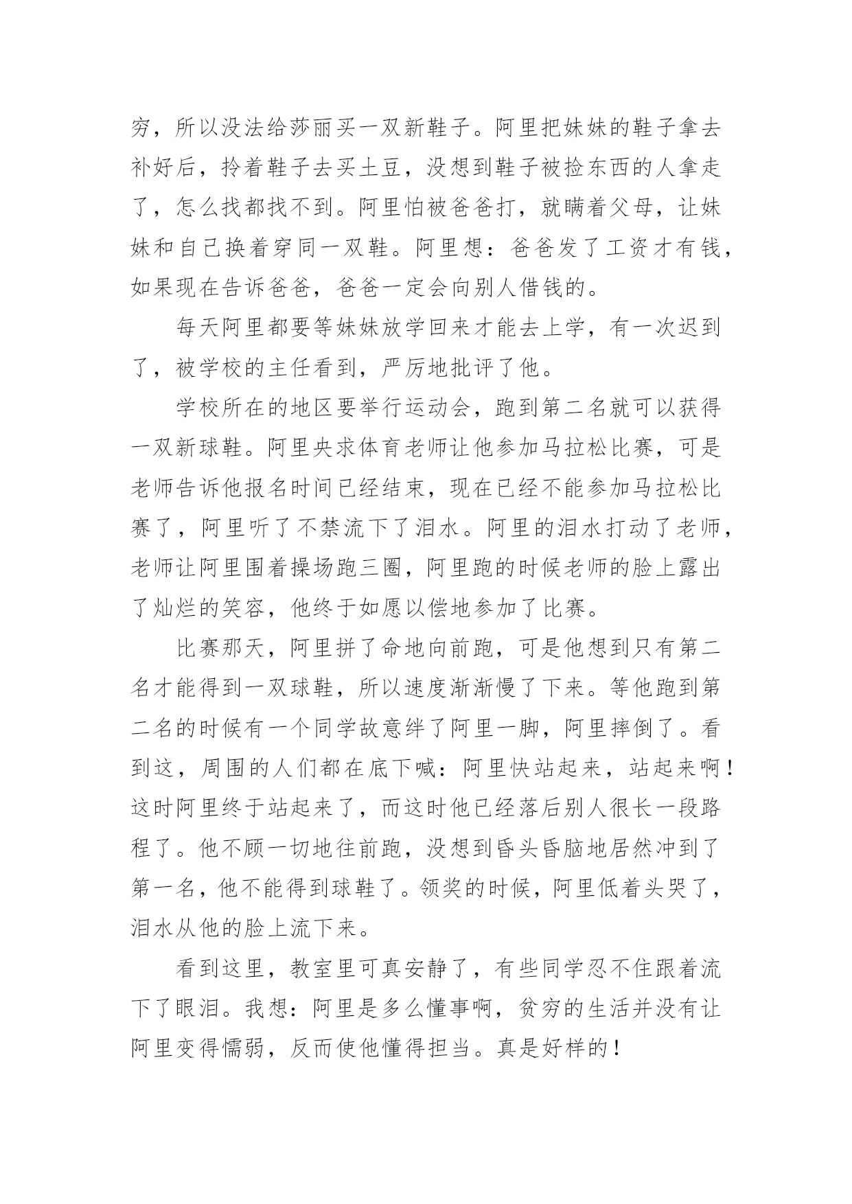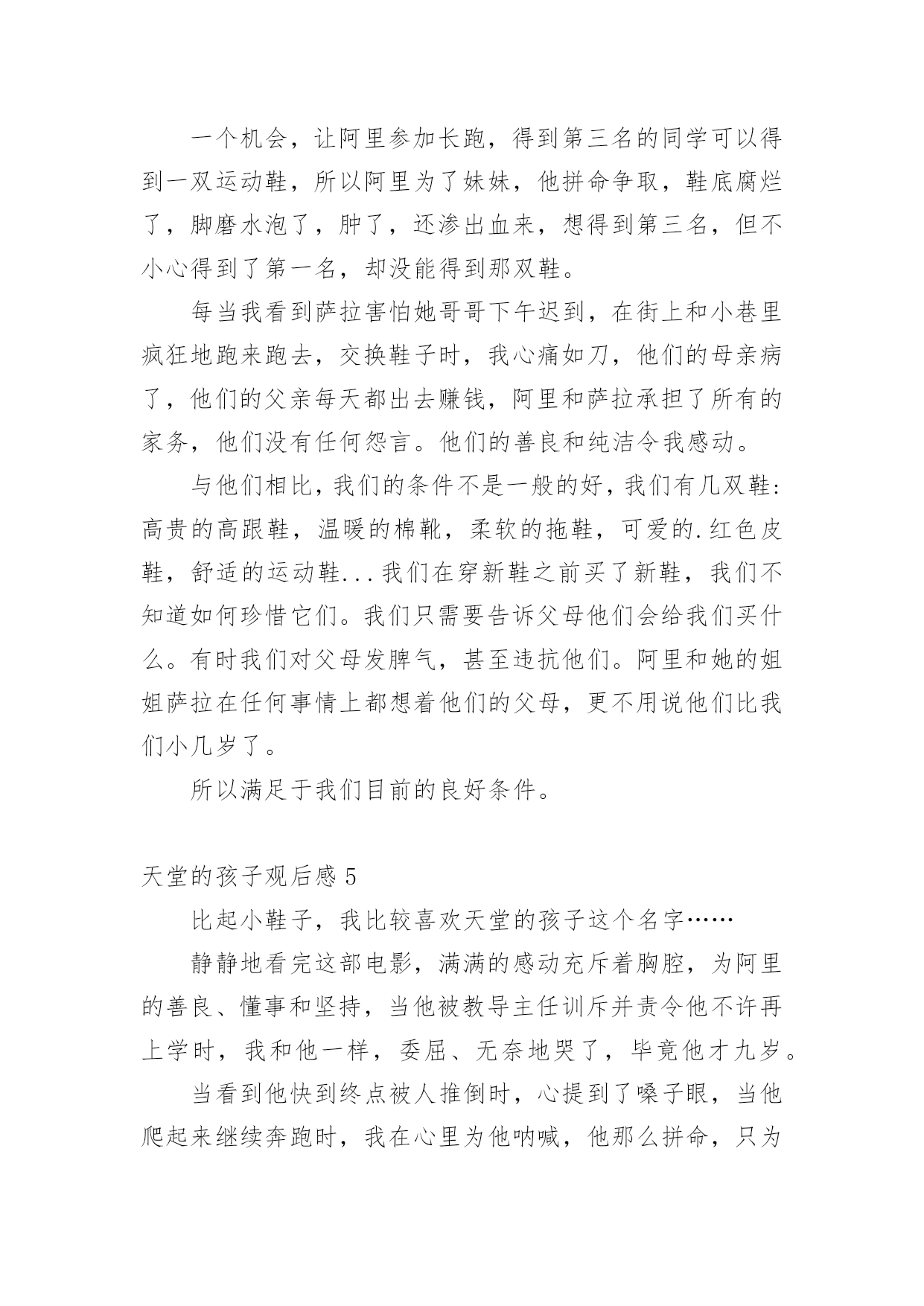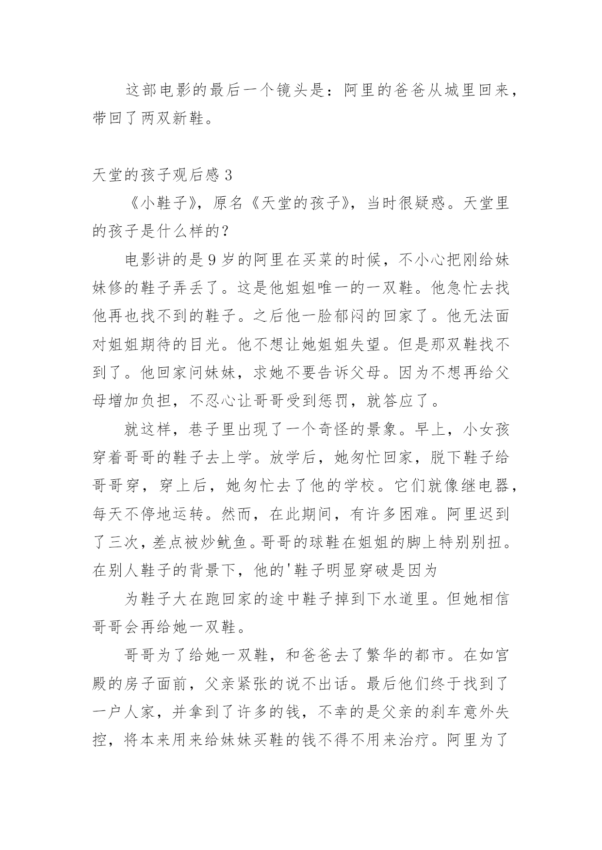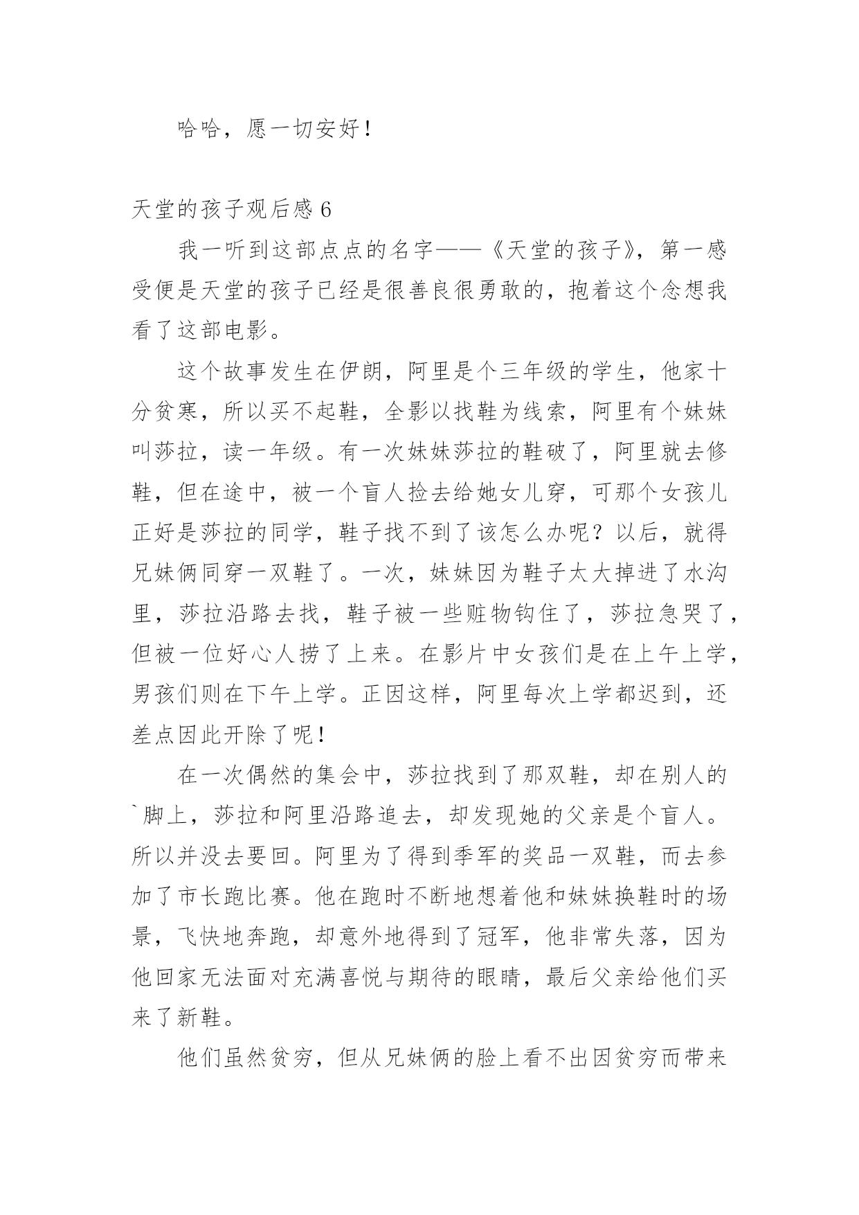 天堂的孩子观后感天堂的孩子观后感(15篇)当认真看完一部作品后,从中我们可以吸收新的思想,此时需要认真地做好记录,写写观后感了。那么你真的懂得怎么写观后感吗?以下是小编精心整理的天堂的孩子观后感,欢迎阅读与收藏。天堂的孩子观后感1阳光热辣辣的,湛蓝色的湖边,一个小男孩正为了他的承诺,拼命地跑着,跑着,跑着,他的简陋又整洁的衣衫,迎风飘动……这个小男孩就是阿里。“嗖嗖嗖”铁针在一双粉红色的女鞋上来回穿梭。“30比索。”阿里拿起这双修好的鞋,却在蔬菜店里意外弄丢了。而这是他妹妹萨拉唯一的一双鞋!阿里和妹妹只好瞒着爸爸,每天轮流穿一双旧球鞋。为了能兑现给妹妹一双新鞋,阿里参加市里比赛想要得到季军,只因为季军的奖品是球鞋。结果他得了冠军,觉得失落愧疚,泪流满面!而此刻他的爸爸正在回家路上,板车里放着两双新鞋,一双白色,一双红色……阿里家很穷。有一天妹妹萨拉给爸爸泡水需要糖,而当时阿里的爸爸正在把一大包糖块敲成小块,但他也没碰一下那些别人交给他保管的糖。在这小小的瞬间,我看到了诚实!丢失了鞋子后,阿里和萨拉终于找到它的'下落。可是当他们看到捡到鞋子的是一户更贫困的人家时,他们又不忍心,没有拿回鞋子,反而和那个穿着鞋子的小女孩做了朋友,两兄妹风里雨里轮流穿鞋上学。那一刻,我看到了友爱、善良、和谐!我觉得电影里有个镜头特别美。当阿里和萨拉清洗旧球鞋时,他们把搓出来的肥皂沫放在手上,吹起了泡泡。一个又一个又大又圆的肥皂泡泡在空中飞舞,快乐的笑声在风中回荡。玩是孩子们的天性,尽管他们生活贪困,但并没有击垮他们快乐的天性,美好的品质。这一刻,我看到了纯真和坚强!电影最后,阿里把磨出了水泡的双脚浸透在水池里,一群群金鱼游过来,仿佛亲吻他的脚,为他疗伤。人与自然,在那一瞬间融为一体,正是天人合一!《小鞋子》里有无数那些让我感动的一瞬间。在这里,我看到了诚实,看到了善良,看到了友爱,看到了坚强,看到人性的美好!看到了逆境中依然保持一颗美丽之心!愿世上多一些这样纯真善良、勇敢烂漫的孩子!真心永恒!天堂的孩子观后感2今天在作文班,老师给我们看了一部电影,名叫《天堂里的孩子》。这部电影讲了一个非常感人的故事阿里生活在一个贫穷的家庭,家里有生病的妈妈、每日操劳的爸爸,还有妹妹。有一天,妹妹的.鞋破了,家里很穷,所以没法给莎丽买一双新鞋子。阿里把妹妹的鞋子拿去补好后,拎着鞋子去买土豆,没想到鞋子被捡东西的人拿走了,怎么找都找不到。阿里怕被爸爸打,就瞒着父母,让妹妹和自己换着穿同一双鞋。阿里想:爸爸发了工资才有钱,如果现在告诉爸爸,爸爸一定会向别人借钱的。每天阿里都要等妹妹放学回来才能去上学,有一次迟到了,被学校的主任看到,严厉地批评了他。学校所在的地区要举行运动会,跑到第二名就可以获得一双新球鞋。阿里央求体育老师让他参加马拉松比赛,可是老师告诉他报名时间已经结束,现在已经不能参加马拉松比赛了,阿里听了不禁流下了泪水。阿里的泪水打动了老师,老师让阿里围着操场跑三圈,阿里跑的时候老师的脸上露出了灿烂的笑容,他终于如愿以偿地参加了比赛。比赛那天,阿里拼了命地向前跑,可是他想到只有第二名才能得到一双球鞋,所以速度渐渐慢了下来。等他跑到第二名的时候有一个同学故意绊了阿里一脚,阿里摔倒了。看到这,周围的人们都在底下喊:阿里快站起来,站起来啊!这时阿里终于站起来了,而这时他已经落后别人很长一段路程了。他不顾一切地往前跑,没想到昏头昏脑地居然冲到了第一名,他不能得到球鞋了。领奖的时候,阿里低着头哭了,泪水从他的脸上流下来。看到这里,教室里可真安静了,有些同学忍不住跟着流下了眼泪。我想:阿里是多么懂事啊,贫穷的生活并没有让阿里变得懦弱,反而使他懂得担当。真是好样的!这部电影的最后一个镜头是:阿里的爸爸从城里回来,带回了两双新鞋。天堂的孩子观后感3《小鞋子》,原名《天堂的孩子》,当时很疑惑。天堂里的孩子是什么样的?电影讲的是9岁的阿里在买菜的时候,不小心把刚给妹妹修的鞋子弄丢了。这是他姐姐唯一的一双鞋。他急忙去找他再也找不到的鞋子。之后他一脸郁闷的回家了。他无法面对姐姐期待的目光。他不想让她姐姐失望。但是那双鞋找不到了。他回家问妹妹,求她不要告诉父母。因为不想再给父母增加负担,不忍心让哥哥受到惩罚,就答应了。就这样,巷子里出现了一个奇怪的景象。早上,小女孩穿着哥哥的鞋子去上学。放学后,她匆忙回家,脱下鞋子给哥哥穿,穿上后,她匆忙去了他的学校。它们就像继电器,每天不停地运转。然而,在此期间,有许多困难。阿里迟到了三次,差点被炒鱿鱼。哥哥的球鞋在姐姐的脚上特别别扭。在别人鞋子的背景下,他的'鞋子明显穿破是因为为鞋子大在跑回家的途中鞋子掉到下水道里。但她相信哥哥会再给她一双鞋。哥哥为了给她一双鞋,和爸爸去了繁华的都市。在如宫殿的房子面前,父亲紧张的说不出话。最后他们终于找到了一户人家