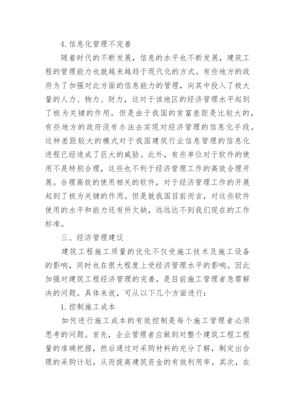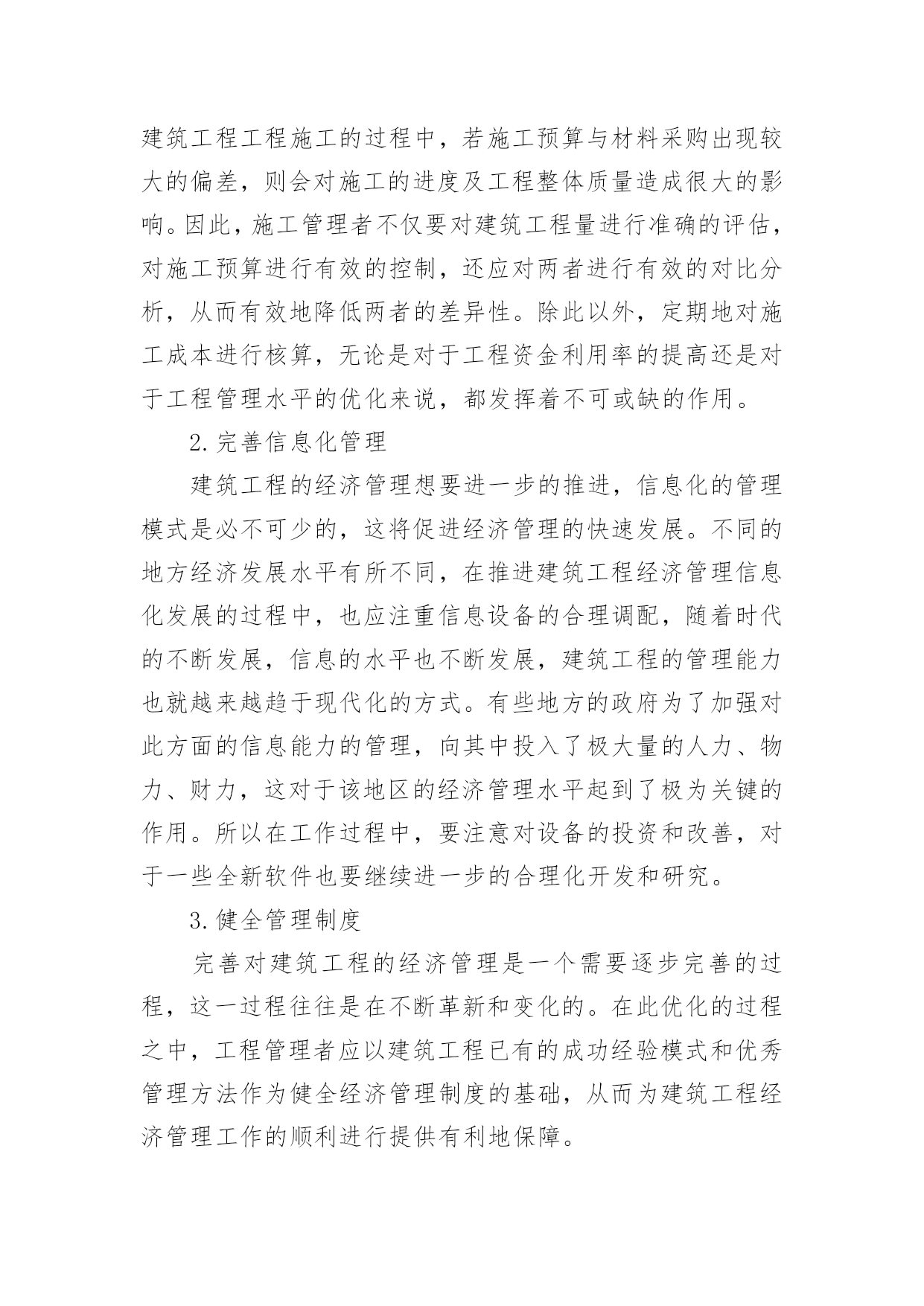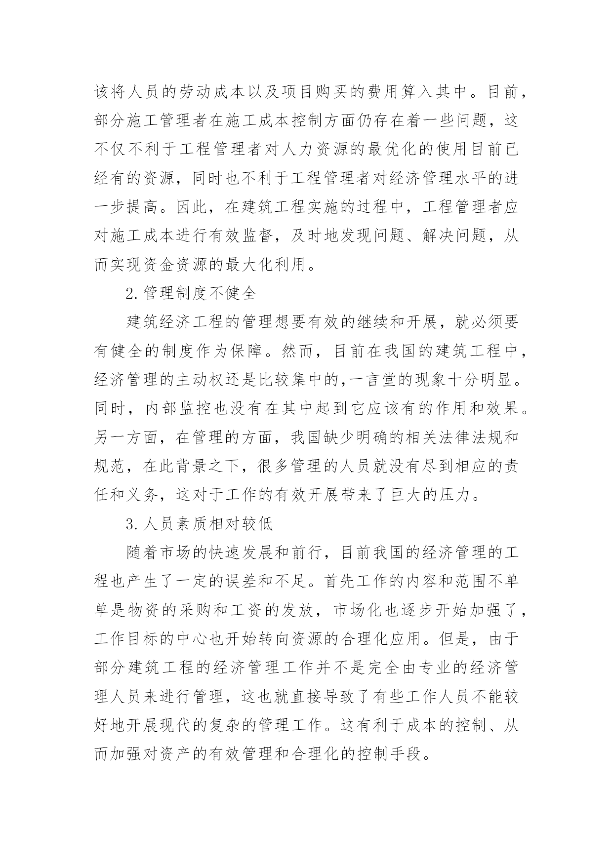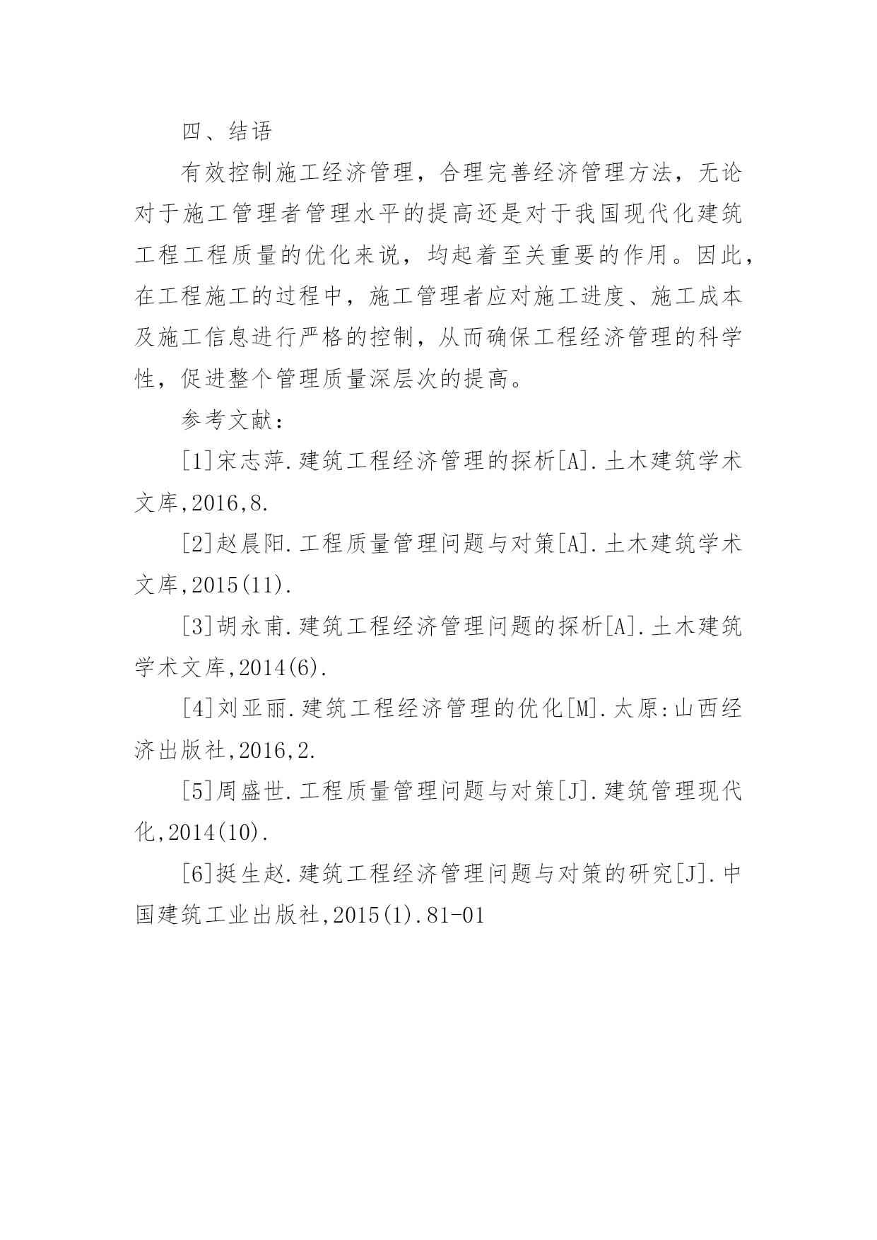 建筑工程经济管理探析论文建筑工程经济管理探析论文摘要:经济管理,不仅影响着人们的施工质量及管理水平,同时在很大程度上推进了我国现代化建筑行业的转型升级。近些年来,建筑工程在设计理论及施工手段方面均取得了显著的成绩,但在经济管理方法中仍存在着一些问题。本文首先就我国建筑工程经济管理的现状作了一一的阐述,然后就经济管理现有问题及相应的解决措施,展开了详细的论述。关键词:建筑工程;经济管理;管理现状;问题及对策一、前言目前,在我国经济水平快速发展的同时,关于建筑工程经济管理问题也日益突显。为了进一步促进工程施工的顺利进行,企业管理者不仅应该准确把握施工进度,严格确保施工安全,而且应该合理控制施工成本,有效管理施工信息。同时,科学有效的经济管理方法是我国现代化建筑工程可持续发展的重要保障。二、经济管理问题1.施工成本控制不合理施工成本的控制水平在一定程度上体现了建筑工程的经济管理水平。建筑工程中的施工费用的影响因素往往是多元化的,材料和设备的成本投入只是其中的一小部分,还应该将人员的劳动成本以及项目购买的费用算入其中。目前,部分施工管理者在施工成本控制方面仍存在着一些问题,这不仅不利于工程管理者对人力资源的最优化的使用目前已经有的资源,同时也不利于工程管理者对经济管理水平的进一步提高。因此,在建筑工程实施的过程中,工程管理者应对施工成本进行有效监督,及时地发现问题、解决问题,从而实现资金资源的最大化利用。2.管理制度不健全建筑经济工程的管理想要有效的继续和开展,就必须要有健全的制度作为保障。然而,目前在我国的建筑工程中,经济管理的主动权还是比较集中的,一言堂的现象十分明显。同时,内部监控也没有在其中起到它应该有的作用和效果。另一方面,在管理的方面,我国缺少明确的相关法律法规和规范,在此背景之下,很多管理的人员就没有尽到相应的责任和义务,这对于工作的有效开展带来了巨大的压力。3.人员素质相对较低随着市场的快速发展和前行,目前我国的经济管理的工程也产生了一定的误差和不足。首先工作的内容和范围不单单是物资的采购和工资的发放,市场化也逐步开始加强了,工作目标的中心也开始转向资源的合理化应用。但是,由于部分建筑工程的经济管理工作并不是完全由专业的经济管理人员来进行管理,这也就直接导致了有些工作人员不能较好地开展现代的复杂的管理工作。这有利于成本的控制、从而加强对资产的有效管理和合理化的控制手段。4.信息化管理不完善随着时代的不断发展,信息的水平也不断发展,建筑工程的管理能力也就越来越趋于现代化的方式。有些地方的政府为了加强对此方面的信息能力的管理,向其中投入了极大量的人力、物力、财力,这对于该地区的经济管理水平起到了极为关键的作用。但是由于我国的贫富差距是比较大的,有些地方的政府没有办法去实现对经济管理的信息化手段。这种差距较大的模式对于我国建筑行业信息管理的信息化进程已经造成了巨大的威胁。此外,有些单位对于软件的使用不是特别合理,这些也不利于经济管理工作的高效合理开展。合理高效的使用相关的软件,对于经济管理工作的开展起到了极为关键的作用。但是就我国目前而言,对这些软件使用的水平和能力还有所欠缺,远远达不到我们现在的工作标准。三、经济管理建议建筑工程施工质量的优化不仅受施工技术及施工设备的影响,同时也在很大程度上受经济管理水平的影响。因此加强对建筑工程经济管理的完善,是目前施工管理者急需解决的问题。具体来说,可从以下几个方面进行:1.控制施工成本如何进行施工成本的有效控制是每个施工管理者必须思考的问题。首先,企业管理者应做到对整个建筑工程工程量的准确把握,然后通过对采购材料的充分了解,制定出合理的采购计划,从而提高建筑资金的有效利用率。其次,在建筑工程工程施工的过程中,若施工预算与材料采购出现较大的偏差,则会对施工的进度及工程整体质量造成很大的影响。因此,施工管理者不仅要对建筑工程量进行准确的评估,对施工预算进行有效的控制,还应对两者进行有效的对比分析,从而有效地降低两者的差异性。除此以外,定期地对施工成本进行核算,无论是对于工程资金利用率的提高还是对于工程管理水平的优化来说,都发挥着不可或缺的作用。2.完善信息化管理建筑工程的经济管理想要进一步的推进,信息化的管理模式是必不可少的,这将促进经济管理的快速发展。不同的地方经济发展水平有所不同,在推进建筑工程经济管理信息化发展的过程中,也应注重信息设备的合理调配,随着时代的不断发展,信息的水平也不断发展,建筑工程的管理能力也就越来越趋于现代化的方式。有些地方的政府为了加强对此方面的信息能力的管理,向其中投入了极大量的人力、物力、财力,这对于该地区的经济管理水平起到了极为关键的作用。所以在工作过程中,要注意对设备的投资和改善,对于一些全新软件也要继续进一步的合理化开发和研究。3.健全管理制度完善