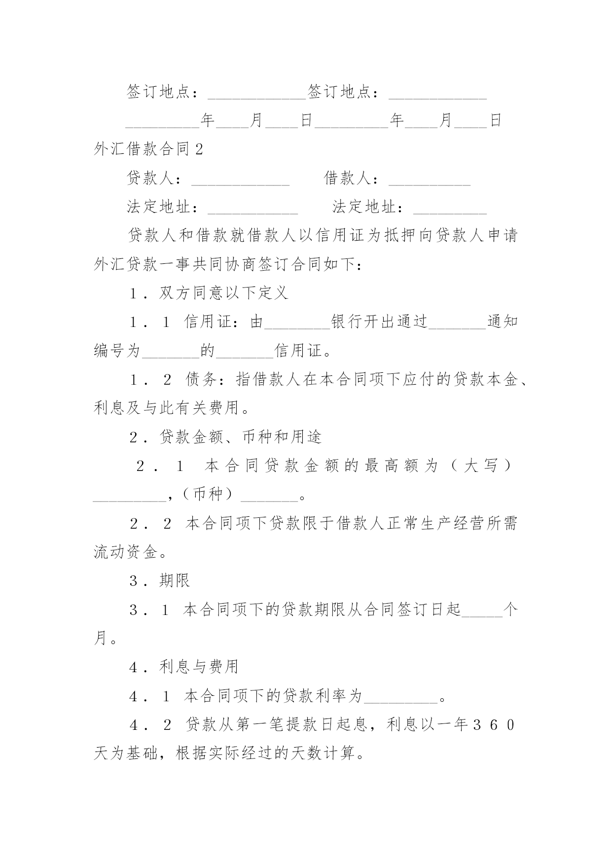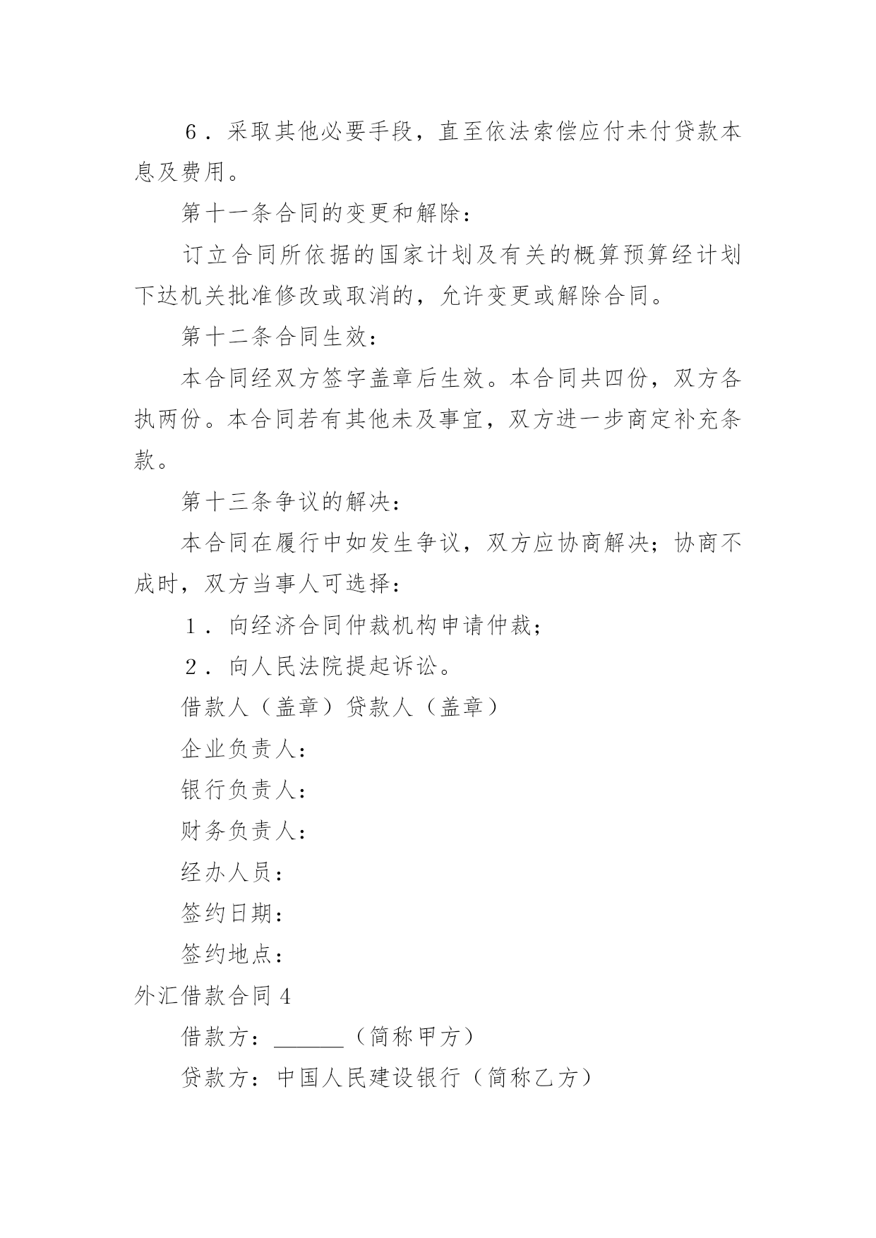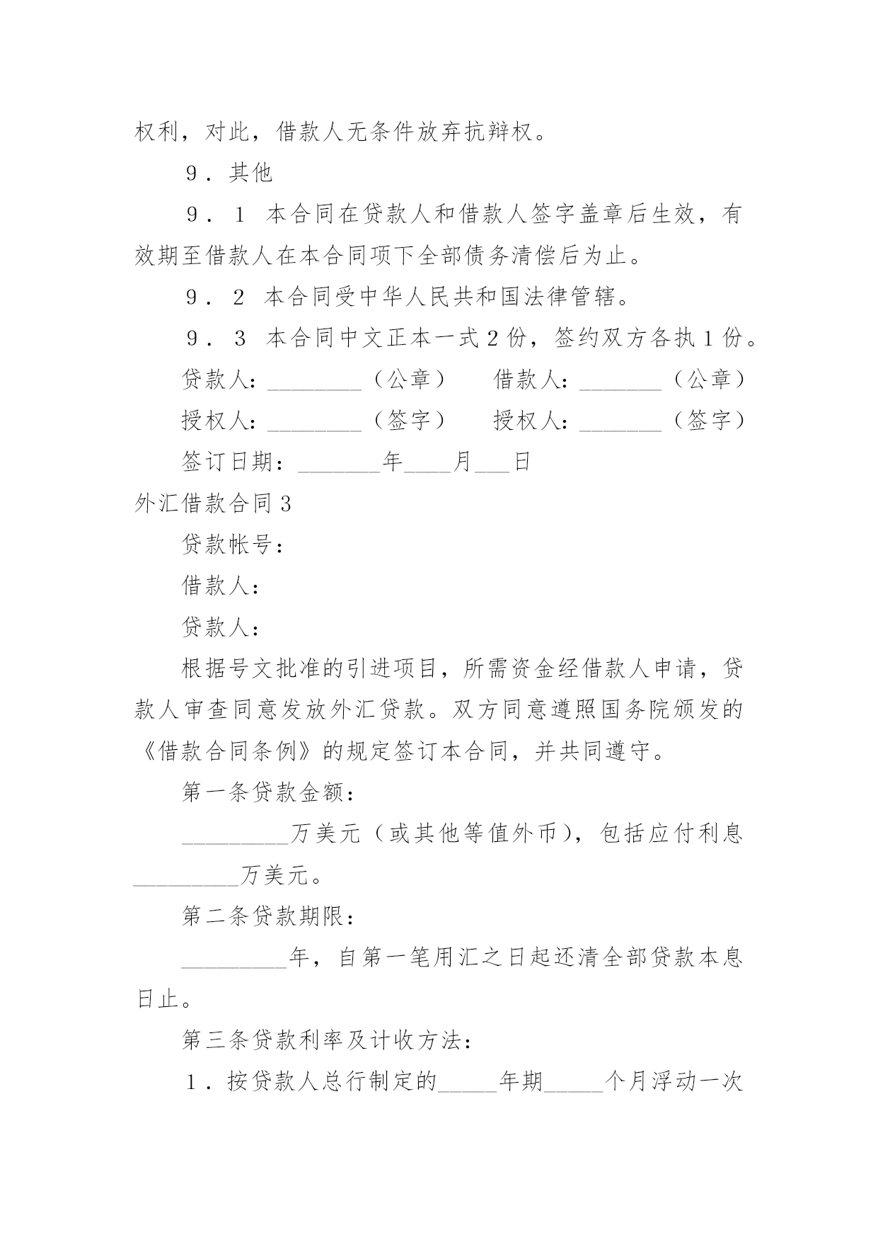 外汇借款合同外汇借款合同精选15篇现今很多公民的维权意识在不断增强,随时随地,各种场景都有可能使用到合同,正常情况下,签订合同必须经过规定的方式。那么我们拟定合同的时候需要注意什么问题呢?以下是小编精心整理的外汇借款合同,希望能够帮助到大家。外汇借款合同1一、借贷双方1.借款方:___________________工商执照:____________________企业性质:______________地址:________________________电话:__________________外汇开户银行:________________账户:__________________外汇:____________________2.贷款方:____________________________外汇账号:_____________________________二、借款金额(按当天牌价买入价计算)_____________人民币(大写)___________________三、借款用途___________________________________________四、借款期限:自____________________起至____________________止五、的外汇:币别:_____________金额(大写):____________________六、质押外汇的来源:___________________________________七、借款偿还:在本的'同时,质押外汇的使用权归贷款方所有。借款方不能提前赎回外汇。质押期满,借款方应全额归还借入的人民币,赎回原数额质押的外汇,不受汇率变动的影响。如借款方到期无力赎回,贷款方有权以任何方式处置质押的外汇,以抵偿借方所欠的贷款,借款方不得有任何异议。八、凡以境外借入外汇作质押的,仍由借款方对原债务关系的人履行偿还外汇本息的义务。九、质押人民币贷款与用作质押的外汇,相互不计利息。十、贷款监督:贷款方有权了解、监督、检查借款方的贷款使用情况,借款方应积极配合,给予方便,如借款方违反合同规定,贷款方有权提前收回贷款或予以处理。十一、本期:自合同签字之日起至全部清偿贷款之日止。以上条款经双方盖章签字以后,借贷双方应共同遵守合同规定。贷款方(签章):_________借款方(签章):_________签订地点:____________签订地点:_____________________年____月____日_________年____月____日外汇借款合同2贷款人:____________借款人:__________法定地址:___________法定地址:_________贷款人和借款就借款人以信用证为抵押向贷款人申请外汇贷款一事共同协商签订合同如下:1.双方同意以下定义1.1信用证:由________银行开出通过_______通知编号为_______的_______信用证。1.2债务:指借款人在本合同项下应付的贷款本金、利息及与此有关费用。2.贷款金额、币种和用途2.1本合同贷款金额的最高额为(大写)_________,(币种)_______。2.2本合同项下贷款限于借款人正常生产经营所需流动资金。3.期限3.1本合同项下的贷款期限从合同签订日起_____个月。4.利息与费用4.1本合同项下的贷款利率为_________。4.2贷款从第一笔提款日起息,利息以一年360天为基础,根据实际经过的天数计算。4.3贷款的结息日为每季第三个月的20日和贷款到期日。4.4借款人到期应付利息由贷款人主动从借款人开立在贷款人处的存款账户内扣收。5.信用证的抵押和还款5.1本合同签订之日起,借款人将1.1条款下的信用证正本抵押给贷款人并由贷款人保管,作为贷款的还款保证。5.2在提交单据后,借款人保证叙做出口押汇并授权贷款人将押汇收入直接用于归还贷款。6.陈述与保证借款人在此作如下陈述与保证。6.1借款人是从事商务经营和有民事行为能力的经济法人,按中华人民共和国法律登记、注册,具有执行、履行所有民事行为的能力。6.2本合同的制定、签署、执行符合借款人所在地的法律、法规、条令、制度。借款人已办妥所有签署本合同的合法有效的手续。6.3保证根据出口信用证条款的要求按时发运货物,履行信用证规定的各项义务。6.4保证及时将抵押信用证规定的出口单据向贷款人提交议付。6.5按时支付利息和归还贷款。6.6保证按本合同2.2条款规定的用途使用贷款。7.违约下列事件属于违约7.1借款人未按信用证规定的.日期内运出商品。7.2借款人在本合同第6条中所做的陈述与保证不真实或不履行。7.3借款人将抵押信用证项下的单据向别的金融机构议付。7.4借款人擅自改变贷款用途,挪用贷款。7.5借款人发生或将要发生解体、