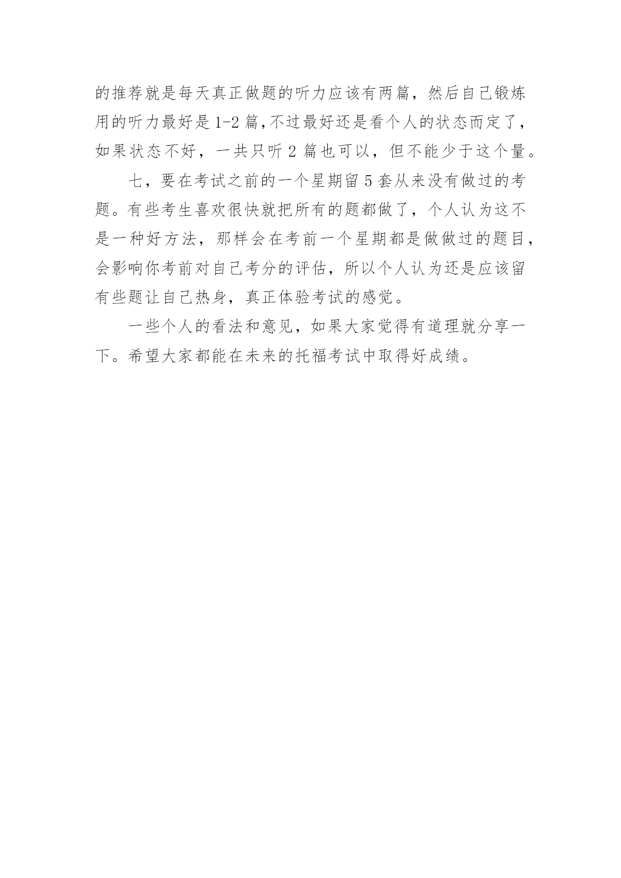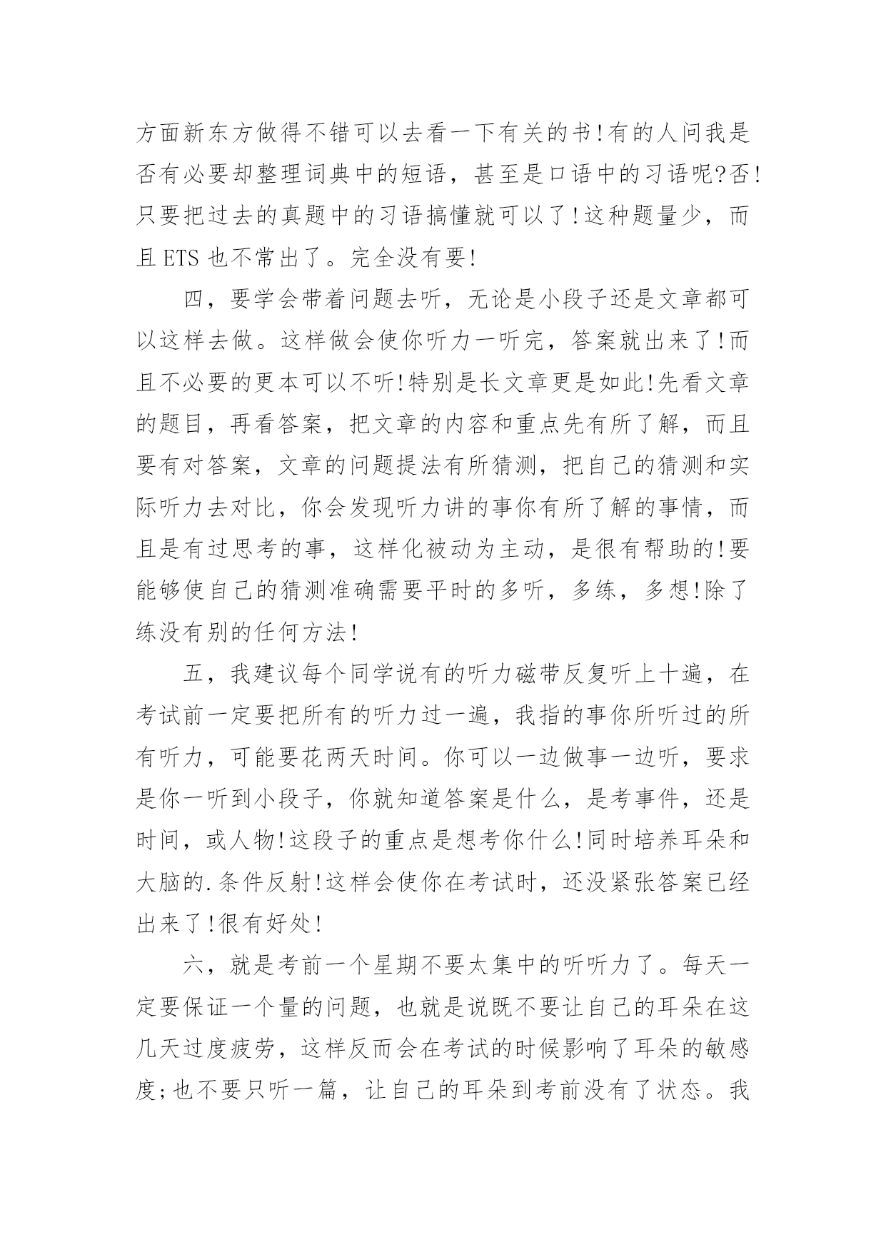 托福听力考试经验分享托福听力考试经验分享怎么应对托福听力考试关于解答托福听力考试小建议,小编在文章中进行了简要说明。攻克托福听力的一些窍门:ETS明年准备出台的新托福也在一定的程度上加强了对考生的听力和口语的测试,而这两种测试难度的加强对中国学生来说无疑是当头一棒。所以,在这里我将我自己对托福听力的一些需要注意的问题罗列如下,与大家分享一下:一,千万记住听力没有窍门,即使有所谓的窍门也不过就是实战的经验!比如新东方的弦外之音,最近有很多朋友反映,对于98年之后的托福听力考试更本没有用!的确如此!唯一有用的只有对于美国教育制度和文章的背景知识的了解的那一小部分了!所以要考好托福听力首先要下定决心硬听!切记,从第一天复习托福就开始听力训练。二,练习过程中对于文章或段子听不懂是否应该硬听,至到听懂为止呢?否,千万不要这做,听3到5遍之后,若发现听不懂应马上看原文才是!但看过原文之后应反复听,直到听到关键词都能够大脑条件反射,既不用想也知道!记住!对于听力而言,反复听已听懂的要比听听不懂的重要的多!同时效果也好很多!因为当你听不懂而去翻原文时很少是应为单词不认识耳听不懂,大多是熟词但出现场合改变而已!三,对于托福小段子题中的短语,你一定要熟记,在这方面新东方做得不错可以去看一下有关的书!有的人问我是否有必要却整理词典中的短语,甚至是口语中的习语呢?否!只要把过去的真题中的习语搞懂就可以了!这种题量少,而且ETS也不常出了。完全没有要!四,要学会带着问题去听,无论是小段子还是文章都可以这样去做。这样做会使你听力一听完,答案就出来了!而且不必要的更本可以不听!特别是长文章更是如此!先看文章的题目,再看答案,把文章的内容和重点先有所了解,而且要有对答案,文章的问题提法有所猜测,把自己的猜测和实际听力去对比,你会发现听力讲的事你有所了解的事情,而且是有过思考的事,这样化被动为主动,是很有帮助的!要能够使自己的猜测准确需要平时的多听,多练,多想!除了练没有别的任何方法!五,我建议每个同学说有的听力磁带反复听上十遍,在考试前一定要把所有的听力过一遍,我指的事你所听过的所有听力,可能要花两天时间。你可以一边做事一边听,要求是你一听到小段子,你就知道答案是什么,是考事件,还是时间,或人物!这段子的重点是想考你什么!同时培养耳朵和大脑的.条件反射!这样会使你在考试时,还没紧张答案已经出来了!很有好处!六,就是考前一个星期不要太集中的听听力了。每天一定要保证一个量的问题,也就是说既不要让自己的耳朵在这几天过度疲劳,这样反而会在考试的时候影响了耳朵的敏感度;也不要只听一篇,让自己的耳朵到考前没有了状态。我的推荐就是每天真正做题的听力应该有两篇,然后自己锻炼用的听力最好是1-2篇,不过最好还是看个人的状态而定了,如果状态不好,一共只听2篇也可以,但不能少于这个量。七,要在考试之前的一个星期留5套从来没有做过的考题。有些考生喜欢很快就把所有的题都做了,个人认为这不是一种好方法,那样会在考前一个星期都是做做过的题目,会影响你考前对自己考分的评估,所以个人认为还是应该留有些题让自己热身,真正体验考试的感觉。一些个人的看法和意见,如果大家觉得有道理就分享一下。希望大家都能在未来的托福考试中取得好成绩。