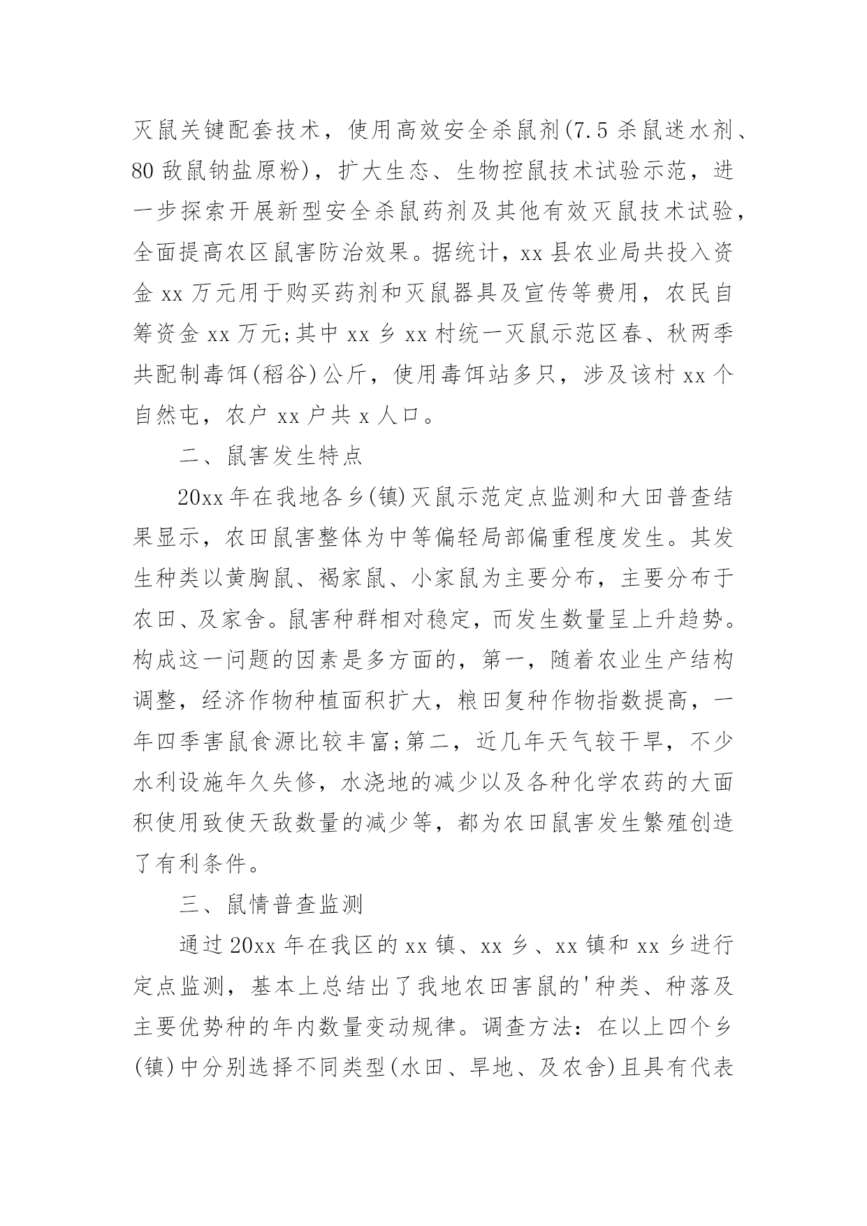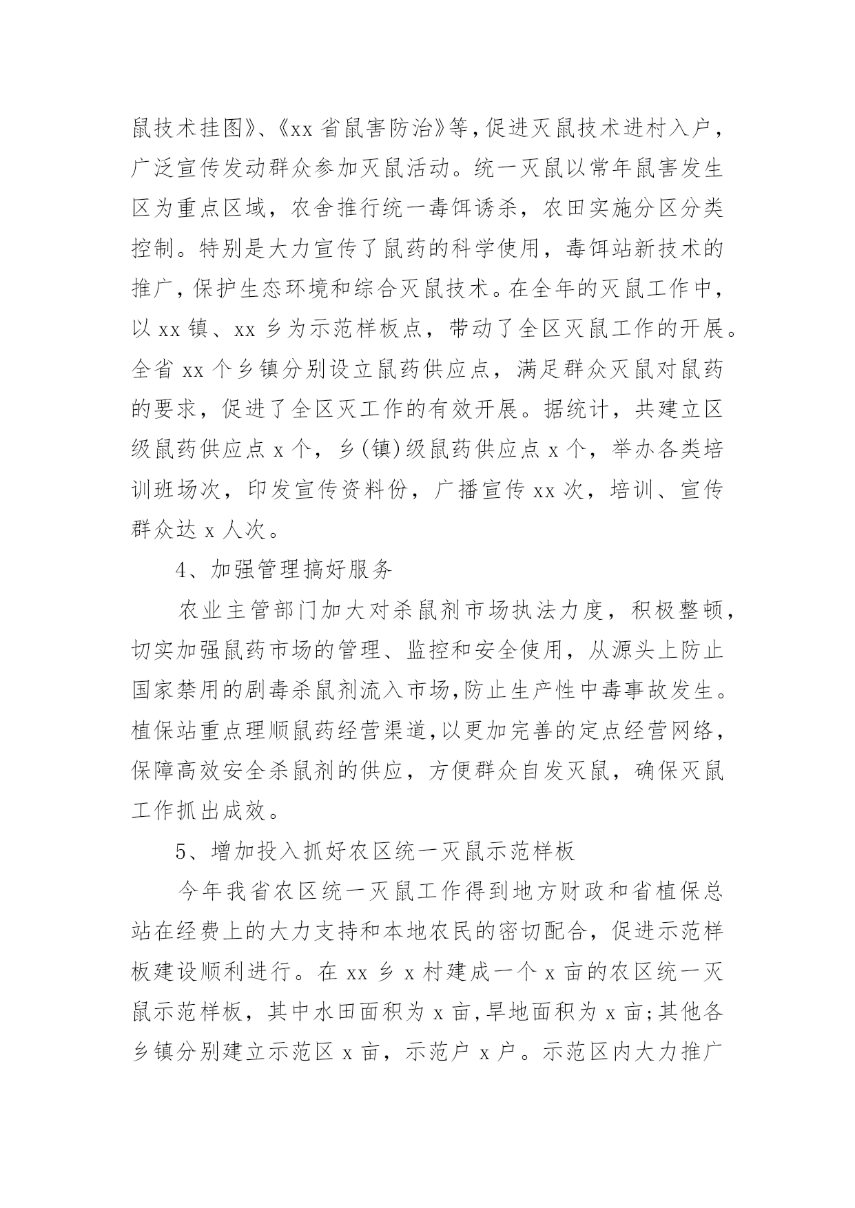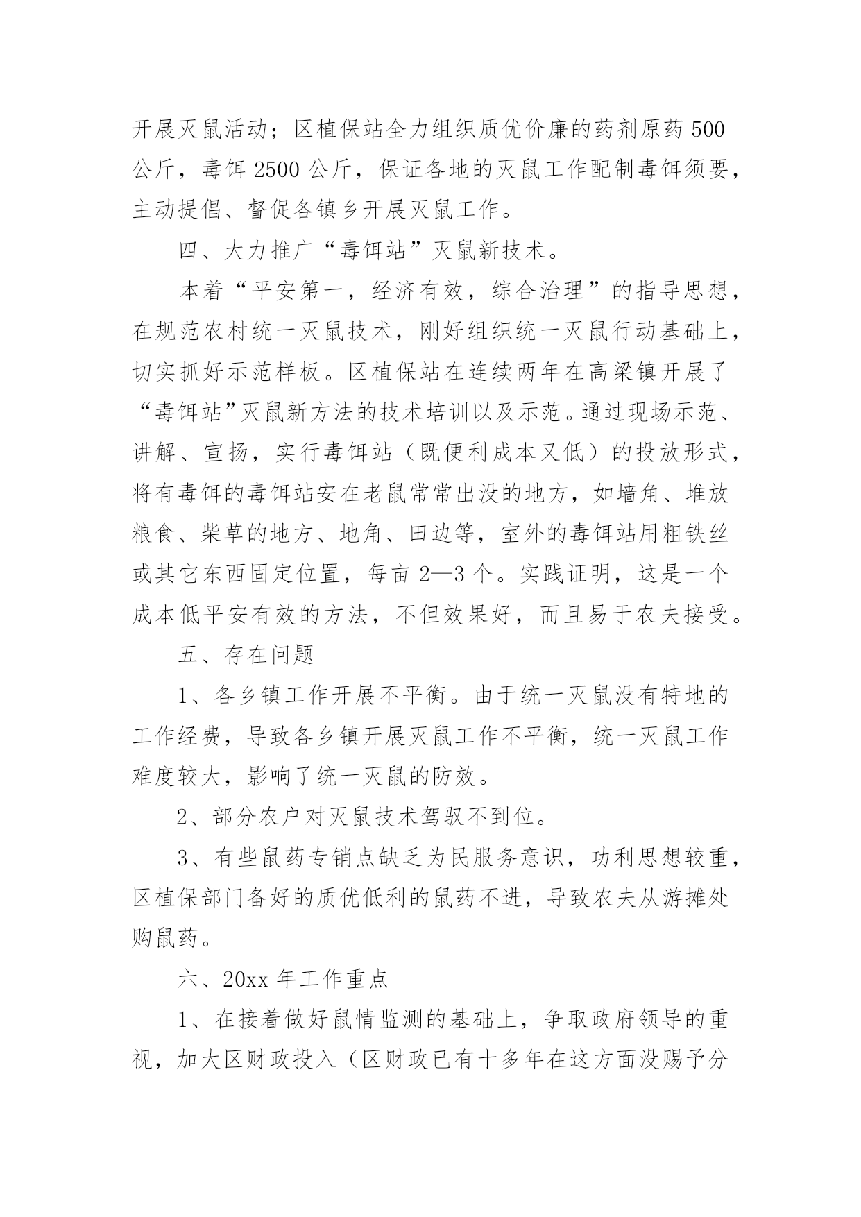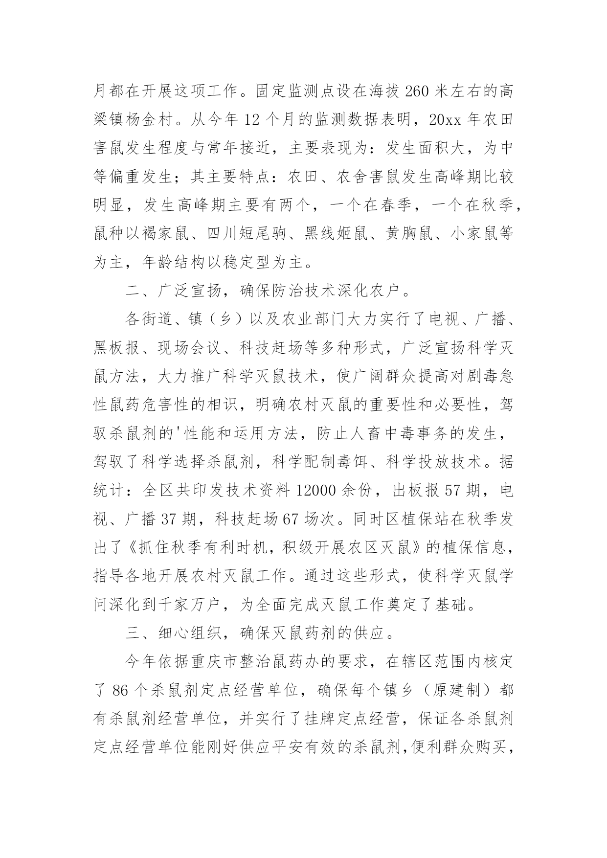 灭鼠工作总结灭鼠工作总结总结是事后对某一阶段的学习或工作情况作加以回顾检查并分析评价的书面材料,他能够提升我们的书面表达能力,让我们一起认真地写一份总结吧。你所见过的总结应该是什么样的?以下是小编为大家整理的灭鼠工作总结,欢迎阅读,希望大家能够喜欢。灭鼠工作总结1为了进一步巩固社区爱国卫生工作,让虫害远离市民生活,预防鼠害及鼠类传播疾病,保障人民群众的身体健康,促进建设健康社区工作深化持续的开展,居委会召开会议广泛动员居民、楼组长、物业公司主动参加环境卫生整治工作并且进行了详细工作布置:1、居委干部分头深化小区检查和参与整治环境卫生工作,共出动人员225人次,并且宣扬社区卫生文明和宣扬遵守“七不”规范,还劝阻居民乱晾晒1起,清除卫生死角7处,整理车棚6处,清理居民楼道堆放杂物7处,清除垃圾25.5吨。2、为了保障人民群众的身体健康,为居民营造健康的生活环境,降低鼠密度,预防鼠类传播疾病,巩固灭鼠成果。在街道爱卫办的统一布置下,在居委辖区范围内开展了统一的灭鼠行动。在开展灭鼠行动中我们实行了以下几项措施:3、进行了广泛的宣扬,还出了“秋季灭鼠学问”专题黑板报一期,普及灭鼠学问,向居民们宣扬灭鼠的方法和要求,向居民群众宣扬老鼠的危害以及做到家中无鼠的基本条件,告知居民们对于家中有了老鼠怎么办和老鼠吃了鼠药后未见死鼠怎么办等灭鼠常识。通过宣扬让居民群众提高了相识,树立起歼灭老鼠,人人有责的观念。利用多种形式开展主题宣扬活动,提倡居民树立健康意识、卫生文明意识和养成健康行为,提高建设健康城区的社会效益和公众参加程度。4、由专职灭害员做好“威腾腊块”和“嗅鼠灵”药物的投放工作,共投放药物28斤确保投放区域的到位、合理、药物量能的.足够,对社区范围内的垃圾房周边、下水道、阴沟洞等场所都进行了药物的投放,对社区的绿化地带的鼠洞都投放了药物,对投放区域做到量少、堆多,复盖面广。灭鼠工作总结2近几年,农村鼠害发生较重,严峻影响我区农业生产、人民生活、人体健康。依据重庆市农业局《关于加强我市农田灭鼠和平安用药工作的通知》和市农技总站《农区鼠害防治预案》精神和要求,我站仔细开展了灭鼠工作,现将20xx年的灭鼠工作汇报如下:一、加强监测,精确驾驭鼠类发生动态农田害鼠鼠情监测是常年性的植保工作之一,是进行鼠害防治的重要基础和依据。今年区植保站固定4名专业技术人员,根据监测要求每月都在开展这项工作。固定监测点设在海拔260米左右的高梁镇杨金村。从今年12个月的监测数据表明,20xx年农田害鼠发生程度与常年接近,主要表现为:发生面积大,为中等偏重发生;其主要特点:农田、农舍害鼠发生高峰期比较明显,发生高峰期主要有两个,一个在春季,一个在秋季,鼠种以褐家鼠、四川短尾驹、黑线姬鼠、黄胸鼠、小家鼠等为主,年龄结构以稳定型为主。二、广泛宣扬,确保防治技术深化农户。各街道、镇(乡)以及农业部门大力实行了电视、广播、黑板报、现场会议、科技赶场等多种形式,广泛宣扬科学灭鼠方法,大力推广科学灭鼠技术,使广阔群众提高对剧毒急性鼠药危害性的相识,明确农村灭鼠的重要性和必要性,驾驭杀鼠剂的'性能和运用方法,防止人畜中毒事务的发生,驾驭了科学选择杀鼠剂,科学配制毒饵、科学投放技术。据统计:全区共印发技术资料12000余份,出板报57期,电视、广播37期,科技赶场67场次。同时区植保站在秋季发出了《抓住秋季有利时机,积级开展农区灭鼠》的植保信息,指导各地开展农村灭鼠工作。通过这些形式,使科学灭鼠学问深化到千家万户,为全面完成灭鼠工作奠定了基础。三、细心组织,确保灭鼠药剂的供应。今年依据重庆市整治鼠药办的要求,在辖区范围内核定了86个杀鼠剂定点经营单位,确保每个镇乡(原建制)都有杀鼠剂经营单位,并实行了挂牌定点经营,保证各杀鼠剂定点经营单位能刚好供应平安有效的杀鼠剂,便利群众购买,开展灭鼠活动;区植保站全力组织质优价廉的药剂原药500公斤,毒饵2500公斤,保证各地的灭鼠工作配制毒饵须要,主动提倡、督促各镇乡开展灭鼠工作。四、大力推广“毒饵站”灭鼠新技术。本着“平安第一,经济有效,综合治理”的指导思想,在规范农村统一灭鼠技术,刚好组织统一灭鼠行动基础上,切实抓好示范样板。区植保站在连续两年在高梁镇开展了“毒饵站”灭鼠新方法的技术培训以及示范。通过现场示范、讲解、宣扬,实行毒饵站(既便利成本又低)的投放形式,将有毒饵的毒饵站安在老鼠常常出没的地方,如墙角、堆放粮食、柴草的地方、地角、田边等,室外的毒饵站用粗铁丝或其它东西固定位置,每亩2—3个。实践证明,这是一个成本低平安有效的方法,不但效果好,而且易于农夫接受。五、存在问题1、各乡镇工作开展不平衡。由于统一灭鼠没有特地的工作经费,导致各乡镇开展灭鼠工作不平衡,统一灭鼠工作难度较大,影响了统一灭鼠的防效。2、部分农户对灭鼠技术驾驭不
