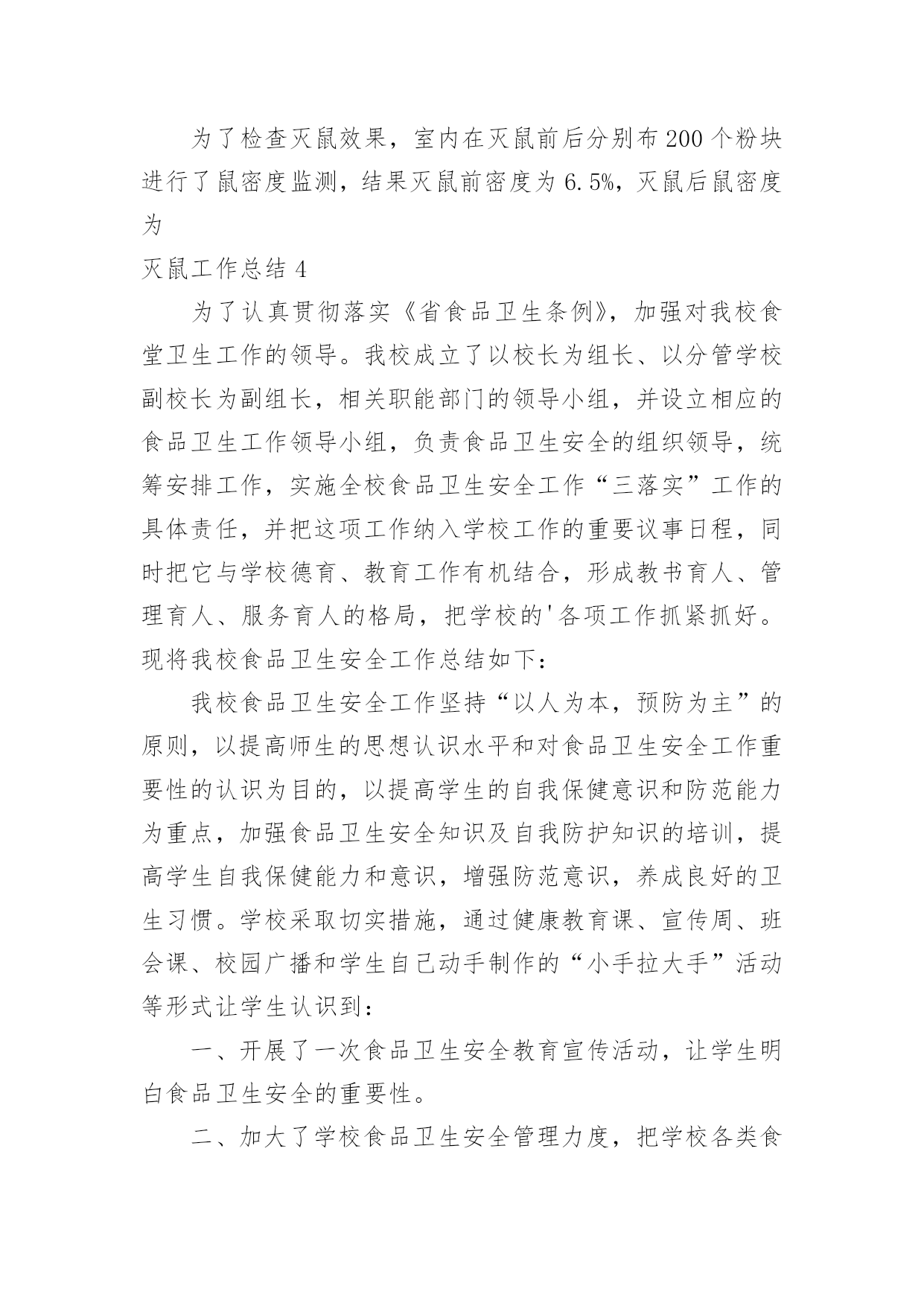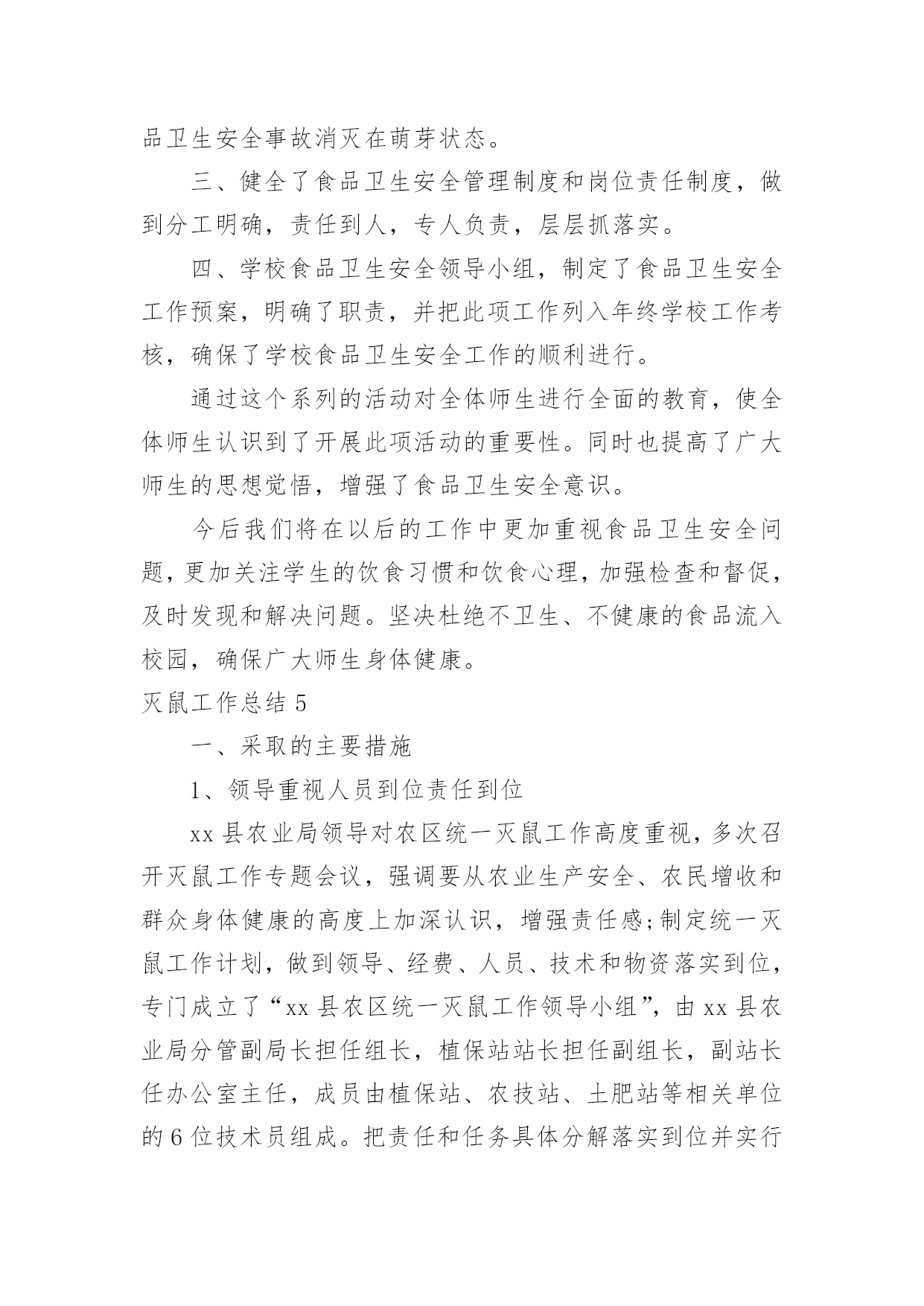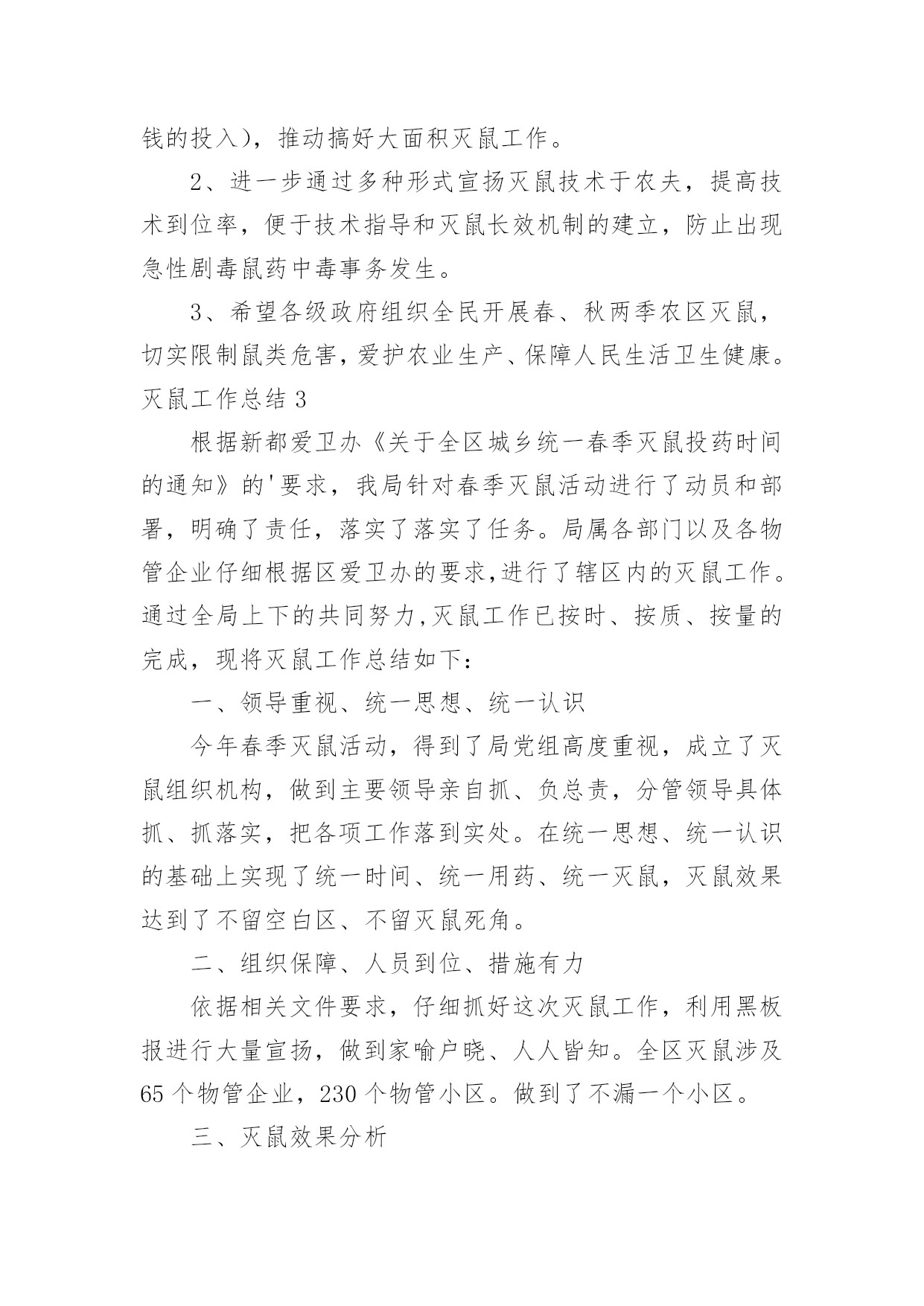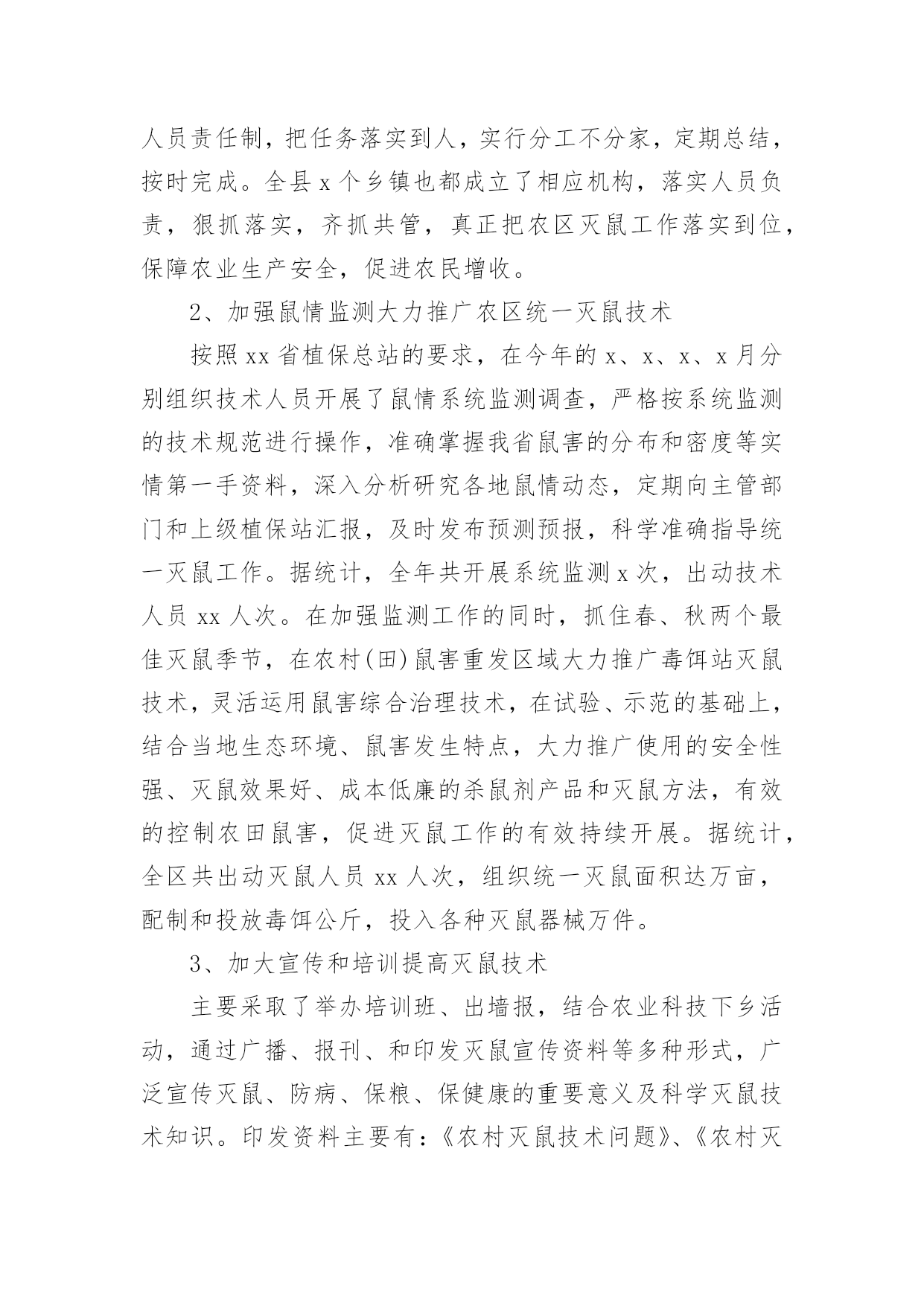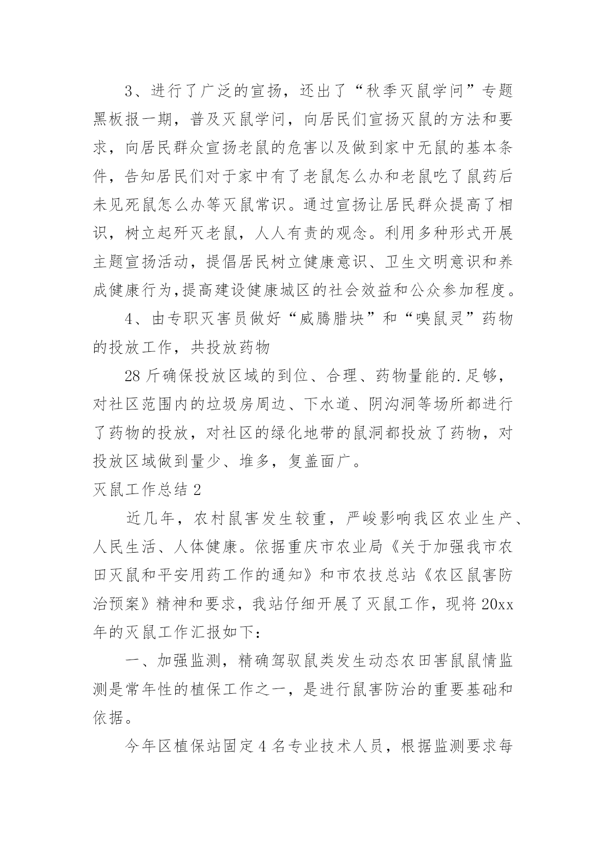 灭鼠工作总结灭鼠工作总结总结是事后对某一阶段的学习或工作情况作加以回顾检查并分析评价的书面材料,他能够提升我们的书面表达能力,让我们一起认真地写一份总结吧。你所见过的总结应该是什么样的?以下是小编为大家整理的灭鼠工作总结,欢迎阅读,希望大家能够喜欢。灭鼠工作总结1为了进一步巩固社区爱国卫生工作,让虫害远离市民生活,预防鼠害及鼠类传播疾病,保障人民群众的身体健康,促进建设健康社区工作深化持续的开展,居委会召开会议广泛动员居民、楼组长、物业公司主动参加环境卫生整治工作并且进行了详细工作布置:1、居委干部分头深化小区检查和参与整治环境卫生工作,共出动人员225人次,并且宣扬社区卫生文明和宣扬遵守“七不”规范,还劝阻居民乱晾晒1起,清除卫生死角7处,整理车棚6处,清理居民楼道堆放杂物7处,清除垃圾25.5吨。2、为了保障人民群众的身体健康,为居民营造健康的生活环境,降低鼠密度,预防鼠类传播疾病,巩固灭鼠成果。在街道爱卫办的统一布置下,在居委辖区范围内开展了统一的灭鼠行动。在开展灭鼠行动中我们实行了以下几项措施:3、进行了广泛的宣扬,还出了“秋季灭鼠学问”专题黑板报一期,普及灭鼠学问,向居民们宣扬灭鼠的方法和要求,向居民群众宣扬老鼠的危害以及做到家中无鼠的基本条件,告知居民们对于家中有了老鼠怎么办和老鼠吃了鼠药后未见死鼠怎么办等灭鼠常识。通过宣扬让居民群众提高了相识,树立起歼灭老鼠,人人有责的观念。利用多种形式开展主题宣扬活动,提倡居民树立健康意识、卫生文明意识和养成健康行为,提高建设健康城区的社会效益和公众参加程度。4、由专职灭害员做好“威腾腊块”和“嗅鼠灵”药物的投放工作,共投放药物28斤确保投放区域的到位、合理、药物量能的.足够,对社区范围内的垃圾房周边、下水道、阴沟洞等场所都进行了药物的投放,对社区的绿化地带的鼠洞都投放了药物,对投放区域做到量少、堆多,复盖面广。灭鼠工作总结2近几年,农村鼠害发生较重,严峻影响我区农业生产、人民生活、人体健康。依据重庆市农业局《关于加强我市农田灭鼠和平安用药工作的通知》和市农技总站《农区鼠害防治预案》精神和要求,我站仔细开展了灭鼠工作,现将20xx年的灭鼠工作汇报如下:一、加强监测,精确驾驭鼠类发生动态农田害鼠鼠情监测是常年性的植保工作之一,是进行鼠害防治的重要基础和依据。今年区植保站固定4名专业技术人员,根据监测要求每月都在开展这项工作。固定监测点设在海拔260米左右的高梁镇杨金村。从今年12个月的监测数据表明,20xx年农田害鼠发生程度与常年接近,主要表现为:发生面积大,为中等偏重发生;其主要特点:农田、农舍害鼠发生高峰期比较明显,发生高峰期主要有两个,一个在春季,一个在秋季,鼠种以褐家鼠、四川短尾驹、黑线姬鼠、黄胸鼠、小家鼠等为主,年龄结构以稳定型为主。二、广泛宣扬,确保防治技术深化农户。各街道、镇(乡)以及农业部门大力实行了电视、广播、黑板报、现场会议、科技赶场等多种形式,广泛宣扬科学灭鼠方法,大力推广科学灭鼠技术,使广阔群众提高对剧毒急性鼠药危害性的相识,明确农村灭鼠的重要性和必要性,驾驭杀鼠剂的'性能和运用方法,防止人畜中毒事务的发生,驾驭了科学选择杀鼠剂,科学配制毒饵、科学投放技术。据统计:全区共印发技术资料12000余份,出板报57期,电视、广播37期,科技赶场67场次。同时区植保站在秋季发出了《抓住秋季有利时机,积级开展农区灭鼠》的植保信息,指导各地开展农村灭鼠工作。通过这些形式,使科学灭鼠学问深化到千家万户,为全面完成灭鼠工作奠定了基础。三、细心组织,确保灭鼠药剂的供应。今年依据重庆市整治鼠药办的要求,在辖区范围内核定了86个杀鼠剂定点经营单位,确保每个镇乡(原建制)都有杀鼠剂经营单位,并实行了挂牌定点经营,保证各杀鼠剂定点经营单位能刚好供应平安有效的杀鼠剂,便利群众购买,开展灭鼠活动;区植保站全力组织质优价廉的药剂原药500公斤,毒饵2500公斤,保证各地的灭鼠工作配制毒饵须要,主动提倡、督促各镇乡开展灭鼠工作。四、大力推广“毒饵站”灭鼠新技术。本着“平安第一,经济有效,综合治理”的指导思想,在规范农村统一灭鼠技术,刚好组织统一灭鼠行动基础上,切实抓好示范样板。区植保站在连续两年在高梁镇开展了“毒饵站”灭鼠新方法的技术培训以及示范。通过现场示范、讲解、宣扬,实行毒饵站(既便利成本又低)的投放形式,将有毒饵的毒饵站安在老鼠常常出没的地方,如墙角、堆放粮食、柴草的地方、地角、田边等,室外的毒饵站用粗铁丝或其它东西固定位置,每亩2—3个。实践证明,这是一个成本低平安有效的方法,不但效果好,而且易于农夫接受。五、存在问题1、各乡镇工作开展不平衡。由于统一灭鼠没有特地的工作经费,导致各乡镇开展灭鼠工作不平衡,统一灭鼠工作难度较大,影响了统一灭鼠的防效。2、部分农户对灭鼠技术驾驭不