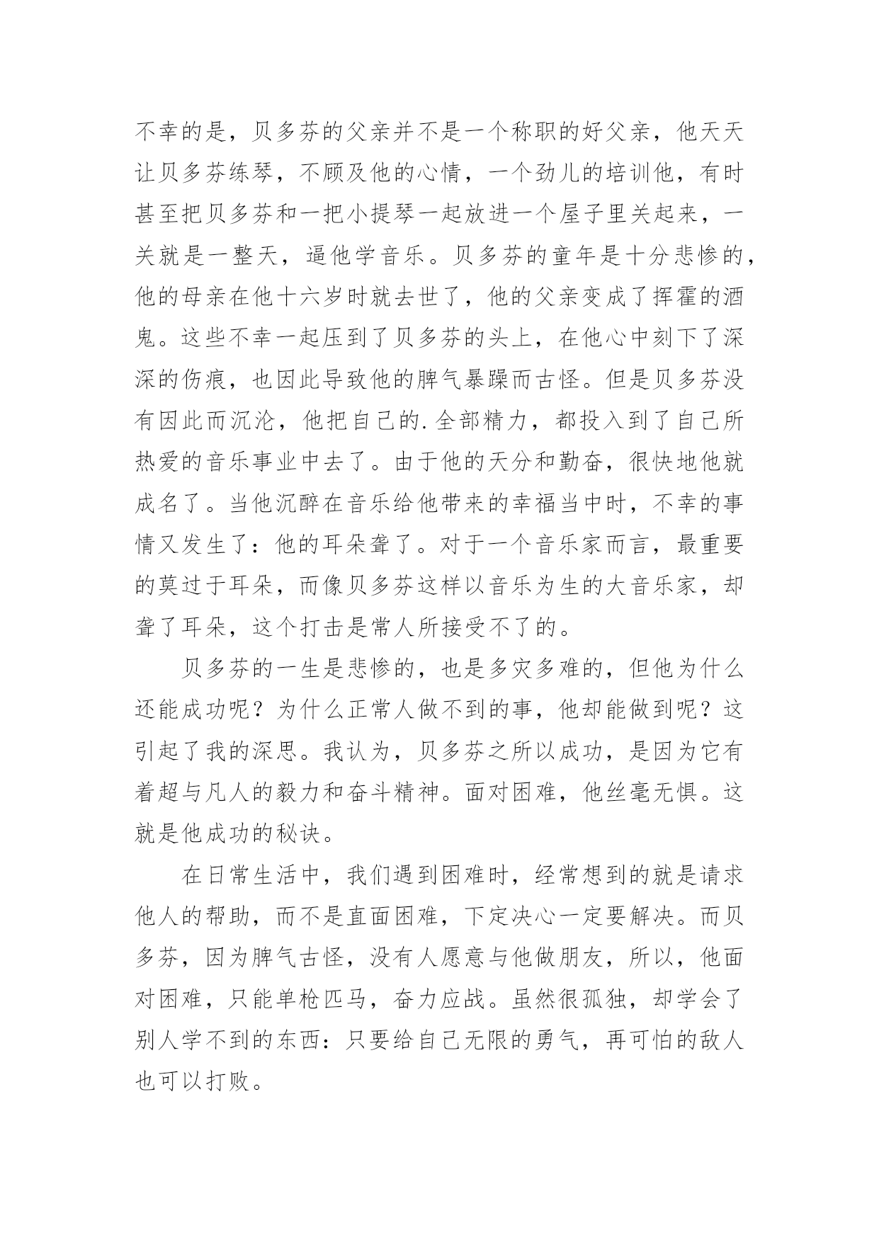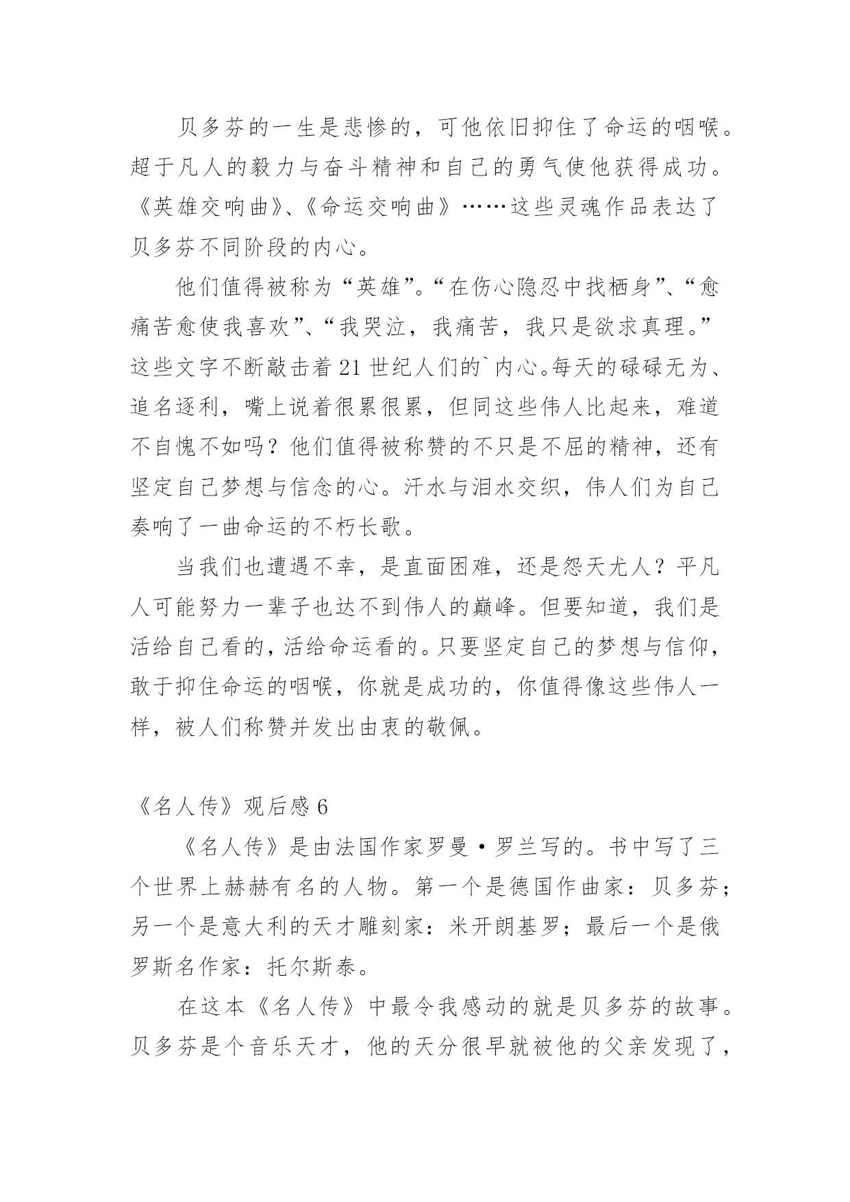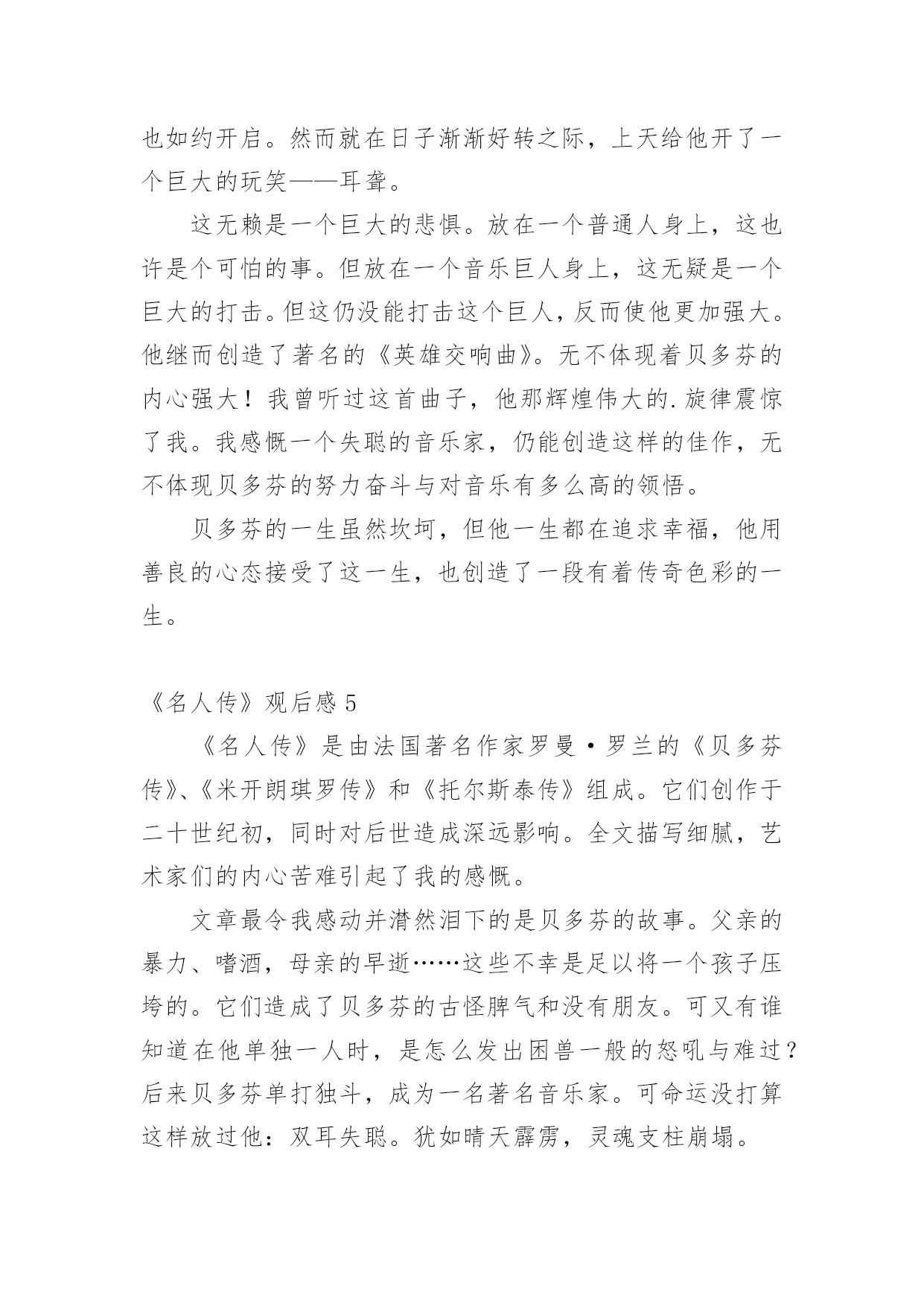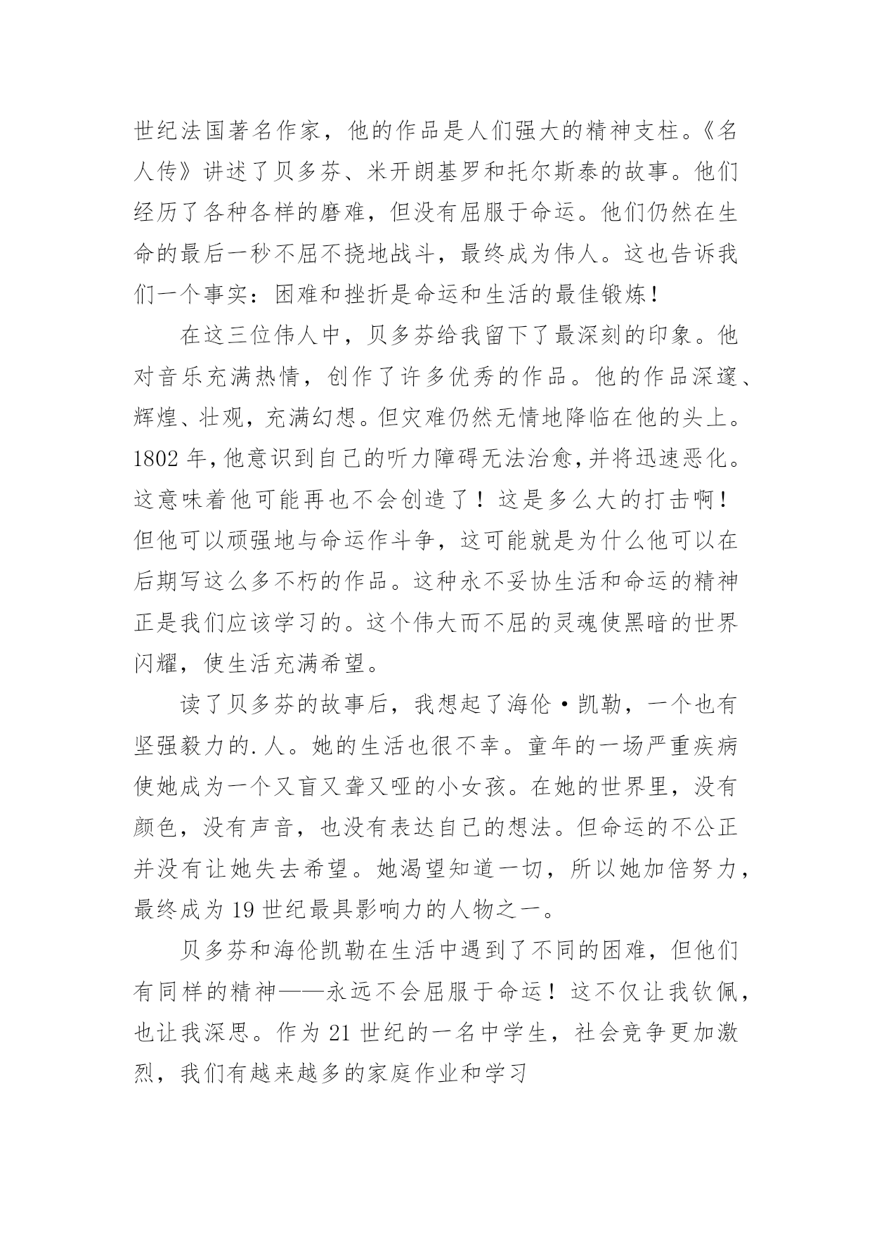 《名人传》观后感细细品味一部作品以后,能够给我们不少启示,撰写观后感可以帮助我们提升自己。为了让您不再为写观后感头疼,下面是小编为大家整理的《名人传》观后感,仅供参考,大家一起来看看吧。《名人传》观后感1在《名人传》中,让我印象最深的是贝多芬。在我看来贝多芬是最伟大的人。身为一位耳聋的音乐家却创造了许多不朽的音乐,而且在书中可看出,贝多芬因耳聋不但影响了工作,而且还使他从此过着孤独凄凉的生活。但他的音乐却为苦难的人而写的,他隐忍自我的痛苦,却用他以痛苦换来的欢乐来安慰人们,给人们勇气和力量,他的精神使我震惊。在当时可怜而自私的世界里,贝多芬把音乐当成一种寄托。在我看书的过程中,看到了最气愤的事:贝多芬在去世前有十分严重的病,他每一天都受到病魔的'折磨,他最后投降了。他让他的侄儿去找医生,可这个麻木不仁的侄儿两天后才去找医生,医生到了,贝多芬却治不了了,可悲的是贝多芬去世时他的侄儿不在他身边而是一个陌生人为他合上了眼。贝多芬明明付出那么多的爱,却没有回报。他还那么伟大,这比他所受到一切痛苦还让人心酸。这可怜的人啊!在孤独和痛苦中死亡,死亡前还要做不屈不挠的斗争。或许死亡对于贝多芬来说是一种解脱。面对这三位名人的生活经历,想想自我的生活,我们真幸福啊!我们虽不是名人,但是名人其实与常人一样,他们与我们一样痛苦,挣扎和矛盾。然而他们以自我伟大的意志打败困苦,而我们却心生抱怨。表面我们说是打败敌人的人是英雄,事实上呢不是,《名人传》作者罗曼·罗兰认为英雄的伟大不在于他的体魄,而在于他的心灵和品格,唯有真实的苦难,才能使人不抱幻想,直面人生;唯有与苦难的搏斗,才能使人经受残酷的命运。是啊,人生不可能一帆风顺,终要走上这条崎岖的道路,对于我们来说应对人生大道上的种。种困难应勇往直前,当然硬拼是不行的,所以让我们坚强起来面对此刻的生活。《名人传》观后感2在热情似火的七月,我们失去了往日所拥有的活力。但思想所洪流,确如一辆高速行驶客车,永不止息。而《名人传》这部书,就是泉水的源头,它教会了我很多,也让我树立了新的世界观。此传记里的三人,一个是德国的音乐家贝多芬,一个是意大利的雕塑家、画家、诗人米开朗琪罗,另一个是俄国作家、思想家、文学家托尔斯泰,虽然各自的事业不同,贡献不同,所处时代和国家也不同,但他们都是伟大的天才,都是各自领域里的伟人。他们在肉体和精神上经历了人生的种。种磨难,却为创造不朽的杰作贡献了毕生的精力。从贝多芬传中,我了解到了贝多芬的音乐天赋及伟大成就。但在那些成功的背后,贝多芬却忍受了太多的苦难。在事业的高峰期,听力逐渐下降,处于一种极端孤独的状态;对未来充满了悲剧……但他仍然从幻面中清醒过来,执著追求音乐的`顶峰,热爱自然,乐观善良。罗兰这样赞道:他给人们的告诫是”人要自强不息。“米开朗基罗传则讲述了他生平的事迹,字里行间洋溢着些许敬佩。米开朗基罗是一个在雕塑界极负盛名的人,可是他的世界却是痛苦的,他没有渴望过成功,甚至鄙视这种胜利,但是他没有办法去改变。他被命运的枷锁束缚着。可正因如此,他却成为一个精神上的巨人:关心世界原来面貌,并且热爱它。托尔斯泰传表现了托尔斯泰的巨大影响力,以及这巨大影响力从何而来。罗兰认为他是完美并且无法被替代的,原因有很多:他有着强烈的自尊心和完美的主义意识;他率真喜欢农民;对自己的要求是极高的,他的思想领引着全亚洲人民,不断向前。他始终坚持真理为上。我现在走的只不过是一条风平浪顺的道路,当遇到荆棘布满道路时,总会选着逃避;当读过《名人传》后,我们应该从新选择一下道路,即使前方困难重重,我们应该更加努力去拼搏,而并不是退缩。在逆境中,坚持自己的理想,保持内心的积极。《名人传》观后感3阅读了罗曼·罗兰的《名人传》深受感动。·罗兰是20世纪法国著名作家,他的作品是人们强大的精神支柱。《名人传》讲述了贝多芬、米开朗基罗和托尔斯泰的故事。他们经历了各种各样的磨难,但没有屈服于命运。他们仍然在生命的最后一秒不屈不挠地战斗,最终成为伟人。这也告诉我们一个事实:困难和挫折是命运和生活的最佳锻炼!在这三位伟人中,贝多芬给我留下了最深刻的印象。他对音乐充满热情,创作了许多优秀的作品。他的作品深邃、辉煌、壮观,充满幻想。但灾难仍然无情地降临在他的头上。1802年,他意识到自己的听力障碍无法治愈,并将迅速恶化。这意味着他可能再也不会创造了!这是多么大的打击啊!但他可以顽强地与命运作斗争,这可能就是为什么他可以在后期写这么多不朽的作品。这种永不妥协生活和命运的精神正是我们应该学习的。这个伟大而不屈的灵魂使黑暗的世界闪耀,使生活充满希望。读了贝多芬的故事后,我想起了海伦·凯勒,一个也有坚强毅力的.人。她的生活也很不幸。童年的一场严重疾病使她成为一个又盲又聋又哑的小女孩。在她的世界里,没有颜色,没有声音,也没有表达自己的