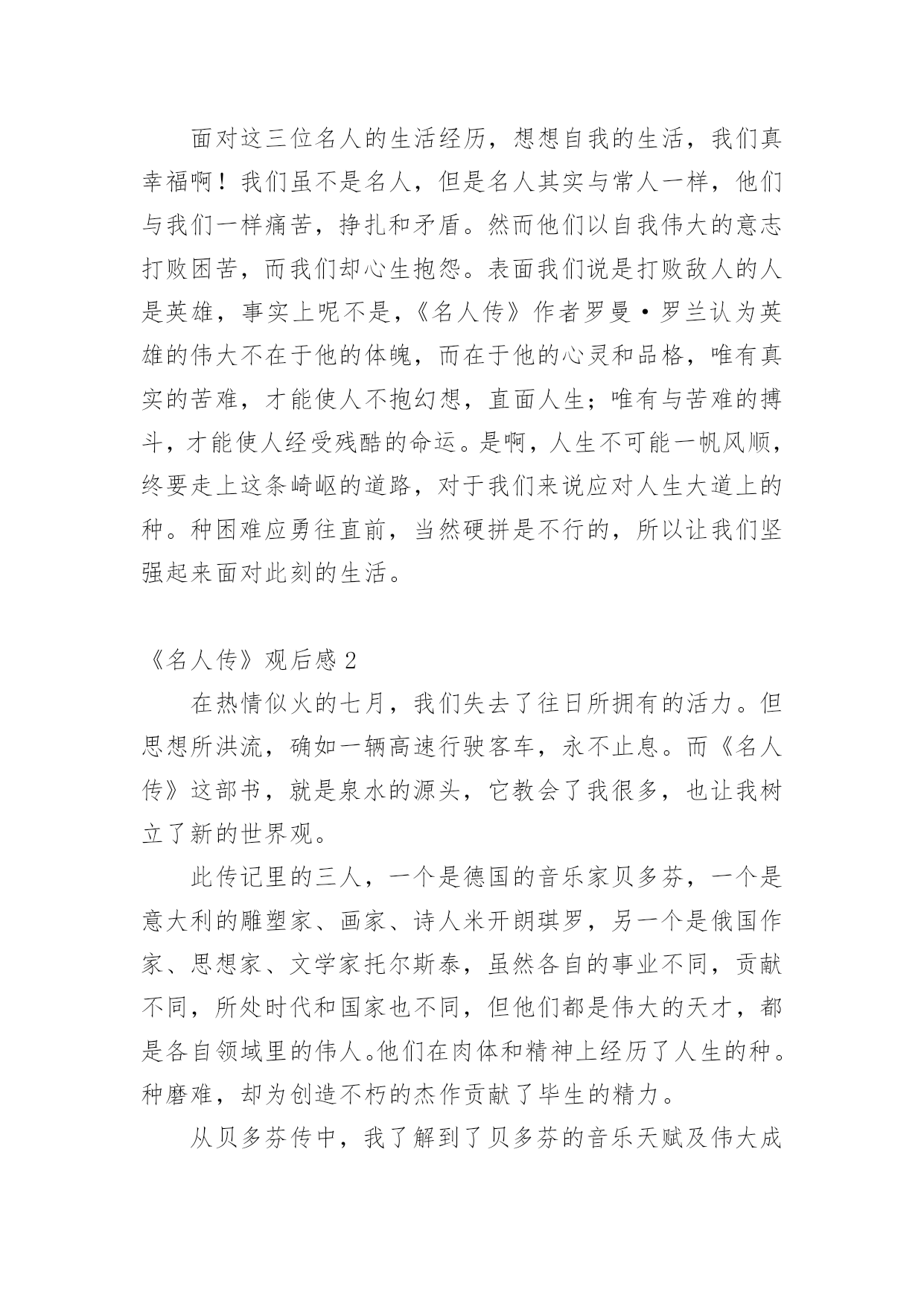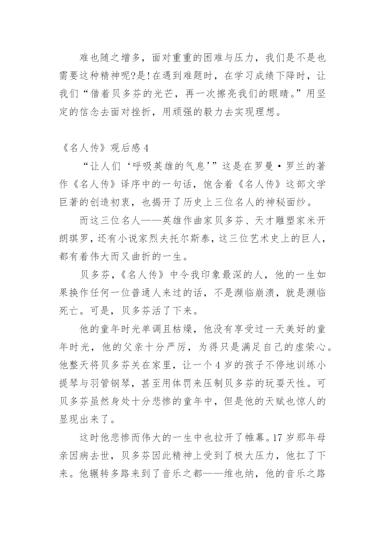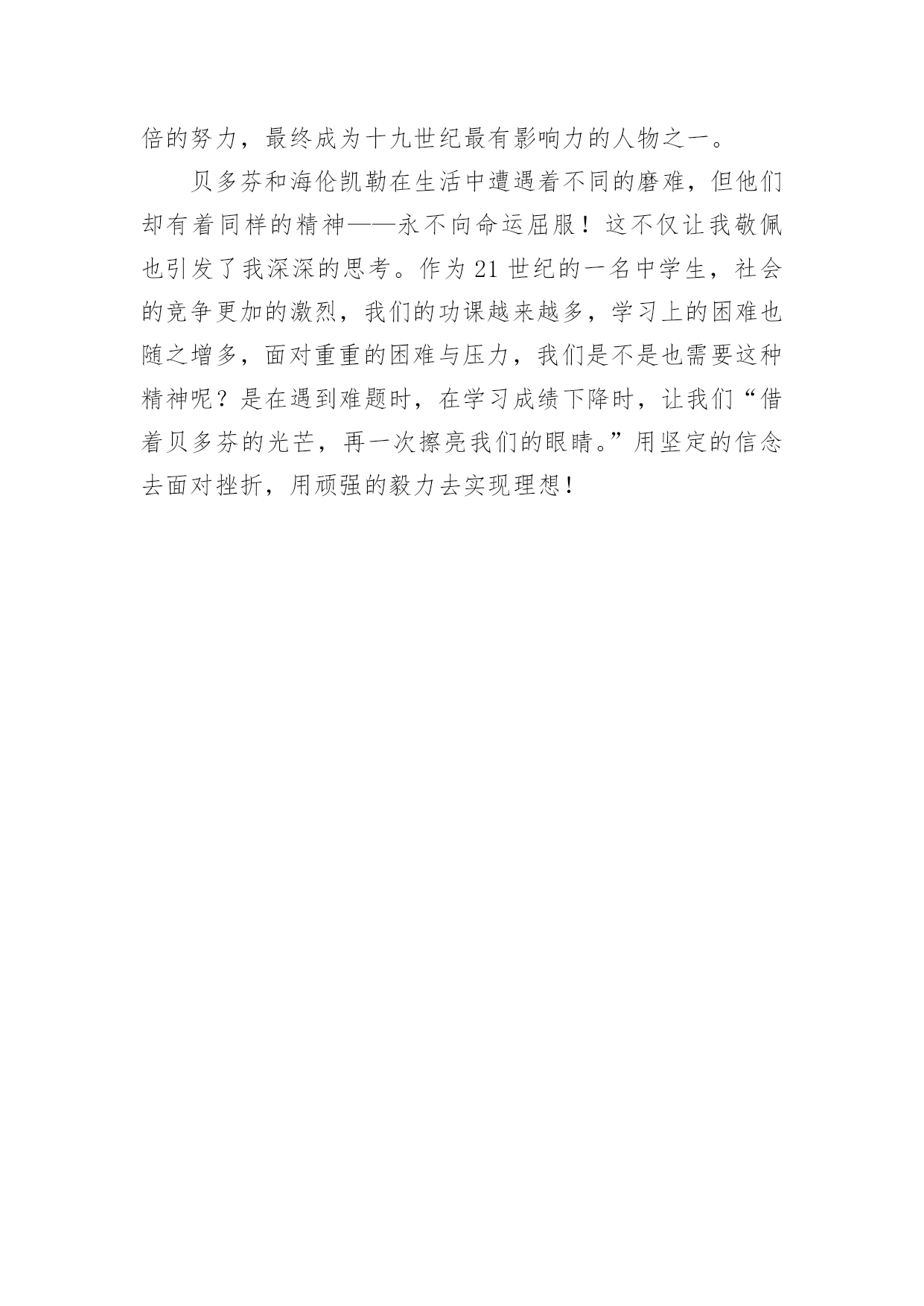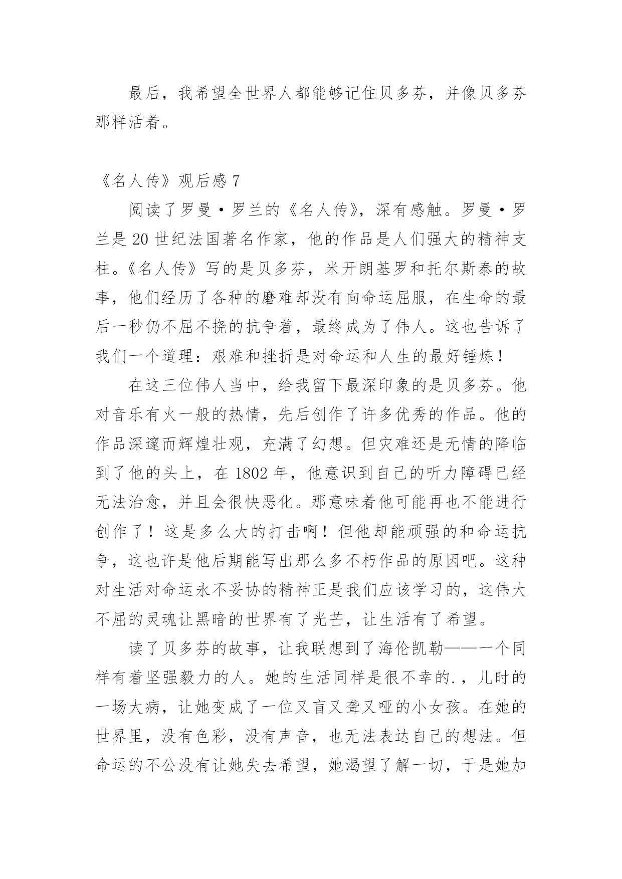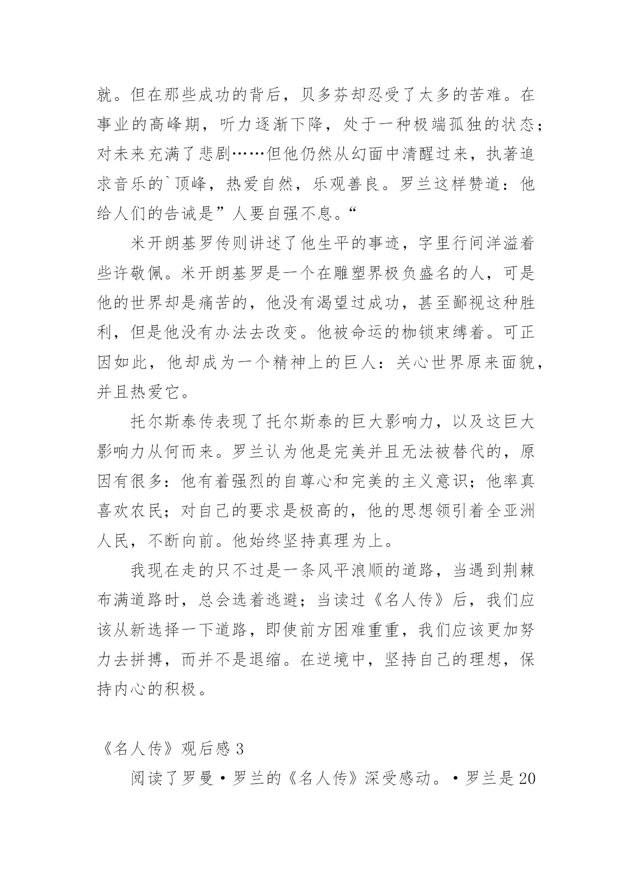 《名人传》观后感细细品味一部作品以后,能够给我们不少启示,撰写观后感可以帮助我们提升自己。为了让您不再为写观后感头疼,下面是小编为大家整理的《名人传》观后感,仅供参考,大家一起来看看吧。《名人传》观后感1在《名人传》中,让我印象最深的是贝多芬。在我看来贝多芬是最伟大的人。身为一位耳聋的音乐家却创造了许多不朽的音乐,而且在书中可看出,贝多芬因耳聋不但影响了工作,而且还使他从此过着孤独凄凉的生活。但他的音乐却为苦难的人而写的,他隐忍自我的痛苦,却用他以痛苦换来的欢乐来安慰人们,给人们勇气和力量,他的精神使我震惊。在当时可怜而自私的世界里,贝多芬把音乐当成一种寄托。在我看书的过程中,看到了最气愤的事:贝多芬在去世前有十分严重的病,他每一天都受到病魔的'折磨,他最后投降了。他让他的侄儿去找医生,可这个麻木不仁的侄儿两天后才去找医生,医生到了,贝多芬却治不了了,可悲的是贝多芬去世时他的侄儿不在他身边而是一个陌生人为他合上了眼。贝多芬明明付出那么多的爱,却没有回报。他还那么伟大,这比他所受到一切痛苦还让人心酸。这可怜的人啊!在孤独和痛苦中死亡,死亡前还要做不屈不挠的斗争。或许死亡对于贝多芬来说是一种解脱。面对这三位名人的生活经历,想想自我的生活,我们真幸福啊!我们虽不是名人,但是名人其实与常人一样,他们与我们一样痛苦,挣扎和矛盾。然而他们以自我伟大的意志打败困苦,而我们却心生抱怨。表面我们说是打败敌人的人是英雄,事实上呢不是,《名人传》作者罗曼·罗兰认为英雄的伟大不在于他的体魄,而在于他的心灵和品格,唯有真实的苦难,才能使人不抱幻想,直面人生;唯有与苦难的搏斗,才能使人经受残酷的命运。是啊,人生不可能一帆风顺,终要走上这条崎岖的道路,对于我们来说应对人生大道上的种。种困难应勇往直前,当然硬拼是不行的,所以让我们坚强起来面对此刻的生活。《名人传》观后感2在热情似火的七月,我们失去了往日所拥有的活力。但思想所洪流,确如一辆高速行驶客车,永不止息。而《名人传》这部书,就是泉水的源头,它教会了我很多,也让我树立了新的世界观。此传记里的三人,一个是德国的音乐家贝多芬,一个是意大利的雕塑家、画家、诗人米开朗琪罗,另一个是俄国作家、思想家、文学家托尔斯泰,虽然各自的事业不同,贡献不同,所处时代和国家也不同,但他们都是伟大的天才,都是各自领域里的伟人。他们在肉体和精神上经历了人生的种。种磨难,却为创造不朽的杰作贡献了毕生的精力。从贝多芬传中,我了解到了贝多芬的音乐天赋及伟大成就。但在那些成功的背后,贝多芬却忍受了太多的苦难。在事业的高峰期,听力逐渐下降,处于一种极端孤独的状态;对未来充满了悲剧……但他仍然从幻面中清醒过来,执著追求音乐的`顶峰,热爱自然,乐观善良。罗兰这样赞道:他给人们的告诫是”人要自强不息。“米开朗基罗传则讲述了他生平的事迹,字里行间洋溢着些许敬佩。米开朗基罗是一个在雕塑界极负盛名的人,可是他的世界却是痛苦的,他没有渴望过成功,甚至鄙视这种胜利,但是他没有办法去改变。他被命运的枷锁束缚着。可正因如此,他却成为一个精神上的巨人:关心世界原来面貌,并且热爱它。托尔斯泰传表现了托尔斯泰的巨大影响力,以及这巨大影响力从何而来。罗兰认为他是完美并且无法被替代的,原因有很多:他有着强烈的自尊心和完美的主义意识;他率真喜欢农民;对自己的要求是极高的,他的思想领引着全亚洲人民,不断向前。他始终坚持真理为上。我现在走的只不过是一条风平浪顺的道路,当遇到荆棘布满道路时,总会选着逃避;当读过《名人传》后,我们应该从新选择一下道路,即使前方困难重重,我们应该更加努力去拼搏,而并不是退缩。在逆境中,坚持自己的理想,保持内心的积极。《名人传》观后感3阅读了罗曼·罗兰的《名人传》深受感动。·罗兰是20世纪法国著名作家,他的作品是人们强大的精神支柱。《名人传》讲述了贝多芬、米开朗基罗和托尔斯泰的故事。他们经历了各种各样的磨难,但没有屈服于命运。他们仍然在生命的最后一秒不屈不挠地战斗,最终成为伟人。这也告诉我们一个事实:困难和挫折是命运和生活的最佳锻炼!在这三位伟人中,贝多芬给我留下了最深刻的印象。他对音乐充满热情,创作了许多优秀的作品。他的作品深邃、辉煌、壮观,充满幻想。但灾难仍然无情地降临在他的头上。1802年,他意识到自己的听力障碍无法治愈,并将迅速恶化。这意味着他可能再也不会创造了!这是多么大的打击啊!但他可以顽强地与命运作斗争,这可能就是为什么他可以在后期写这么多不朽的作品。这种永不妥协生活和命运的精神正是我们应该学习的。这个伟大而不屈的灵魂使黑暗的世界闪耀,使生活充满希望。读了贝多芬的故事后,我想起了海伦·凯勒,一个也有坚强毅力的.人。她的生活也很不幸。童年的一场严重疾病使她成为一个又盲又聋又哑的小女孩。在她的世界里,没有颜色,没有声音,也没有表达自己的