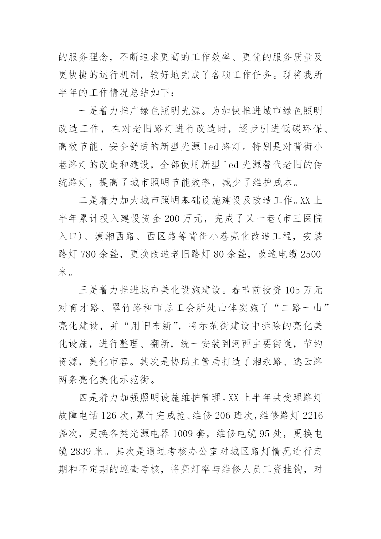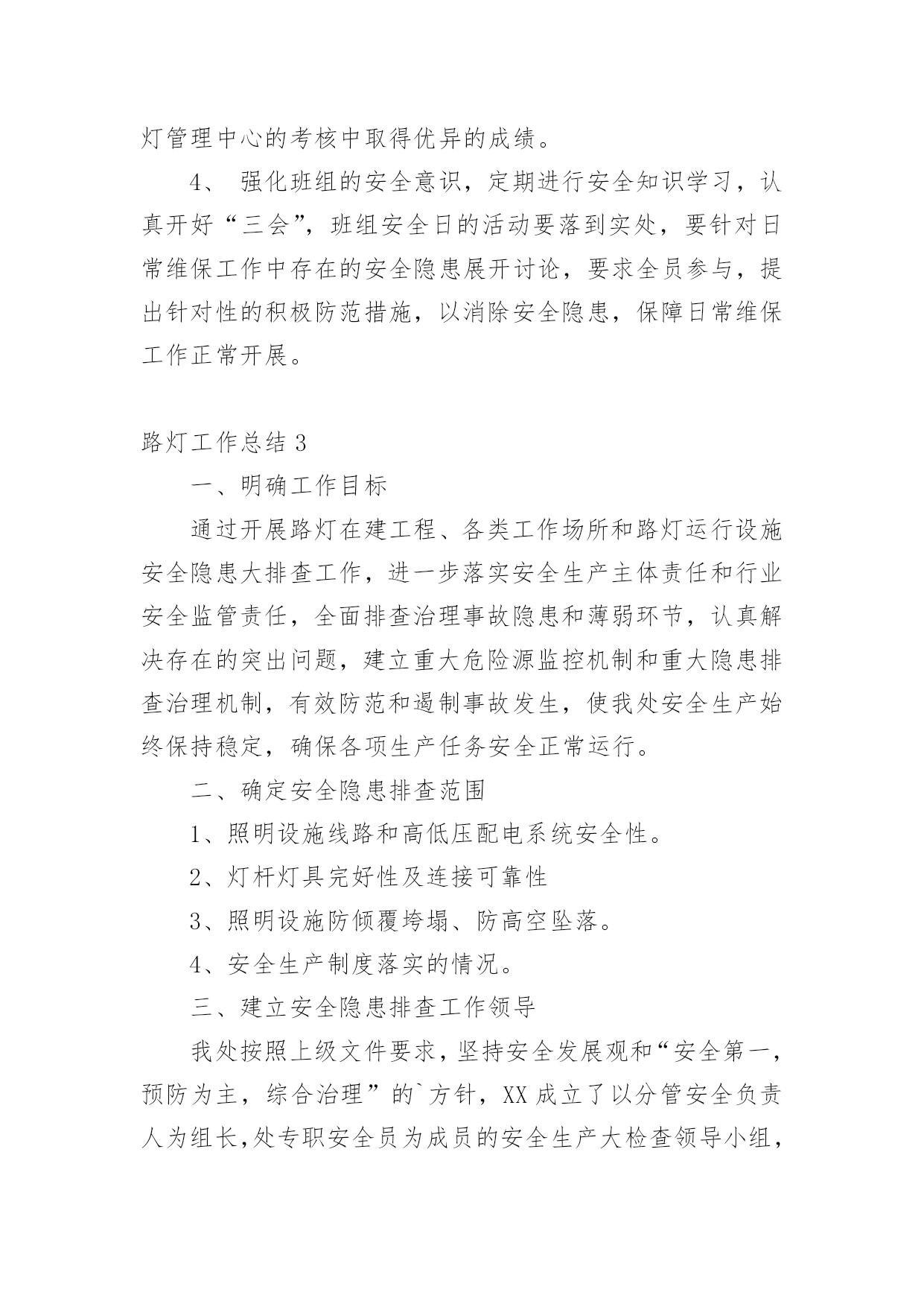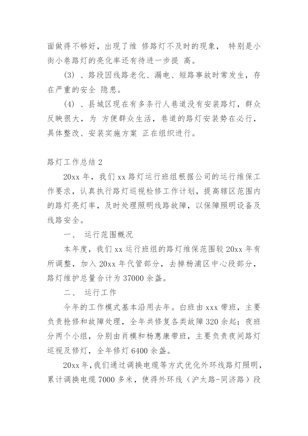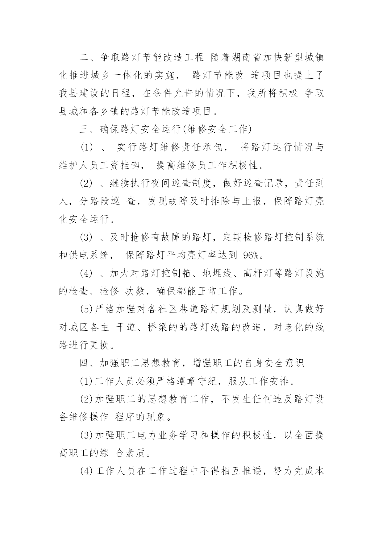 路灯工作总结总结就是把一个时间段取得的成绩、存在的问题及得到的经验和教训进行一次全面系统的总结的书面材料,它可以有效锻炼我们的语言组织能力,为此要我们写一份总结。那么总结应该包括什么内容呢?以下是小编为大家收集的路灯工作总结,仅供参考,欢迎大家阅读。路灯工作总结1在县城市管理局的正确领导下,20xx年我所紧紧围绕路灯管理中心工作,积极开展道路照明建设,全面加强城市路灯设施管理维护,不断提高路灯管理水平,顺利开展了县城亮化美化的工作,较好地完成了各项工作任务。20xx年为确保路灯所可持续发展,路灯工作管理更加规范,我所将围绕以下几点开展工作一、积极拓展业务,为路灯所谋出路由于路灯管理所是自收自支性质的事业单位,以前靠工程养活单位,而路灯工程建的硬指标日渐缩水,路灯维护费用却随工程量水涨船高,路灯维修费用经常靠等、要、舍的方式筹集,路灯的正常运行已经难以维持,路灯所不得不另谋出路。20xx年,路灯所计划成立经营性仓库,联系品牌灯具厂商供货,将富余人员安排到仓库跑业务,依托路灯所专业技术开拓灯具、电线、相关配套设施的商业市场,靠仓库经营牟利带动路灯所发展,走仓库企业化经营道路。二、争取路灯节能改造工程随着湖南省加快新型城镇化推进城乡一体化的实施,路灯节能改造项目也提上了我县建设的日程,在条件允许的情况下,我所将积极争取县城和各乡镇的路灯节能改造项目。三、确保路灯安全运行(维修安全工作)(1)、实行路灯维修责任承包,将路灯运行情况与维护人员工资挂钩,提高维修员工作积极性。(2)、继续执行夜间巡查制度,做好巡查记录,责任到人,分路段巡查,发现故障及时排除与上报,保障路灯亮化安全运行。(3)、及时抢修有故障的路灯,定期检修路灯控制系统和供电系统,保障路灯平均亮灯率达到96%。(4)、加大对路灯控制箱、地埋线、高杆灯等路灯设施的检查、检修次数,确保都能正常工作。(5)严格加强对各社区巷道路灯规划及测量,认真做好对城区各主干道、桥梁的的路灯线路的改造,对老化的线路进行更换。四、加强职工思想教育,增强职工的自身安全意识(1)工作人员必须严格遵章守纪,服从工作安排。(2)加强职工的思想教育工作,不发生任何违反路灯设备维修操作程序的现象。(3)加强职工电力业务学习和操作的积极性,以全面提高职工的综合素质。(4)工作人员在工作过程中不得相互推诿,努力完成本职工作,一切以集体的利益为重。(5)严格执行车辆管理制度,定期进行高空作业车的维护和检修工作,保障车辆的良好性能,防止因车辆故障造成的事故发生。(6)完善仓库保管制度,保管措施,实行一月一清查,一季一盘库。五、认真抓好安全生产工作,确保全年无事故重视生产安全,时刻绷紧安全生产这跟弦。认真落实各项安全生产文件精神,紧紧抓住安全生产第一不放松,严密部署各项安全生产工作要点,建立各项安全生产规章制度,时刻要求全体员工牢固树立安全防范意识,根据不同季节的天气情况,及时做好预警预报工作,提醒有关人员,防范多类可能发生的事故,如雨季涨水,电缆短路,电气设备漏电等情况,确保路灯设施正常和人身安全。加强检修人员的安全学习,严格按照行业标准安全操作。加强驾驶员“交通安全”教育,遵章守法意识,严格按驾驶规程谨慎操作高空作业车,确保了安全生产的顺利进行。六、扎实抓好社会治安综合治理工作为进一步贯彻落实社会治安综合治理责任制,坚持执行“打防结合、预防为主”方针,不断加强我所社会治安综合工作,扎实做好安全防范工作。同时对仓库进行整改,根据单位实际情况,我所将对存放路灯材料的仓库进行整改,将小仓库的材料搬到大仓库中,进行集中存放,便于管理;此外,对单位大院内的路灯材料进行整理归类存放,确保路灯材料的安全。七、后勤及其它工作1、财务管理严格按照财务制度进行财务工作,每月按时向城市管理办公室报财务表。2、办公室管理(1)、坚持上班签到,办公室专人值班,对每天的`工作情况记录在册。(2)、每周定期召开全所会议,总结回顾上周工作,安排本周工作。(3)、正确填写各项台帐、登记表和电话记录。(4)、及时做到上传下达工作,准确无误。(5)、搞好办公室的内务工作及卫生清扫。3、工会工作积极响应工会城市管理办公室工会召开的号召,并参与有关扶贫募捐活动。4、计划生育工作认真落实计划生育各项政策,并通过县计生委的各种检查。5、考评工作秉承“公平、公正、公开”的原则,做好全体工作人员的绩效考核打分工作,并将考评结果反馈给被考评人员。八、存在的问题我们虽然取得了一定的成绩,但与县委县政府政府和局领导的要求,与群众的期望相比,还有一定的差距。存在的问题主要表现在(1)、由于忙于日常工作,学习不够深入,主动性不强。(2)、路灯管理有不到位的地方,我们在路灯管理工作中,虽然主干道的亮灯率保持较好,但在落实维修制度方面做得不够好,出现了维修路灯不及时的现象
