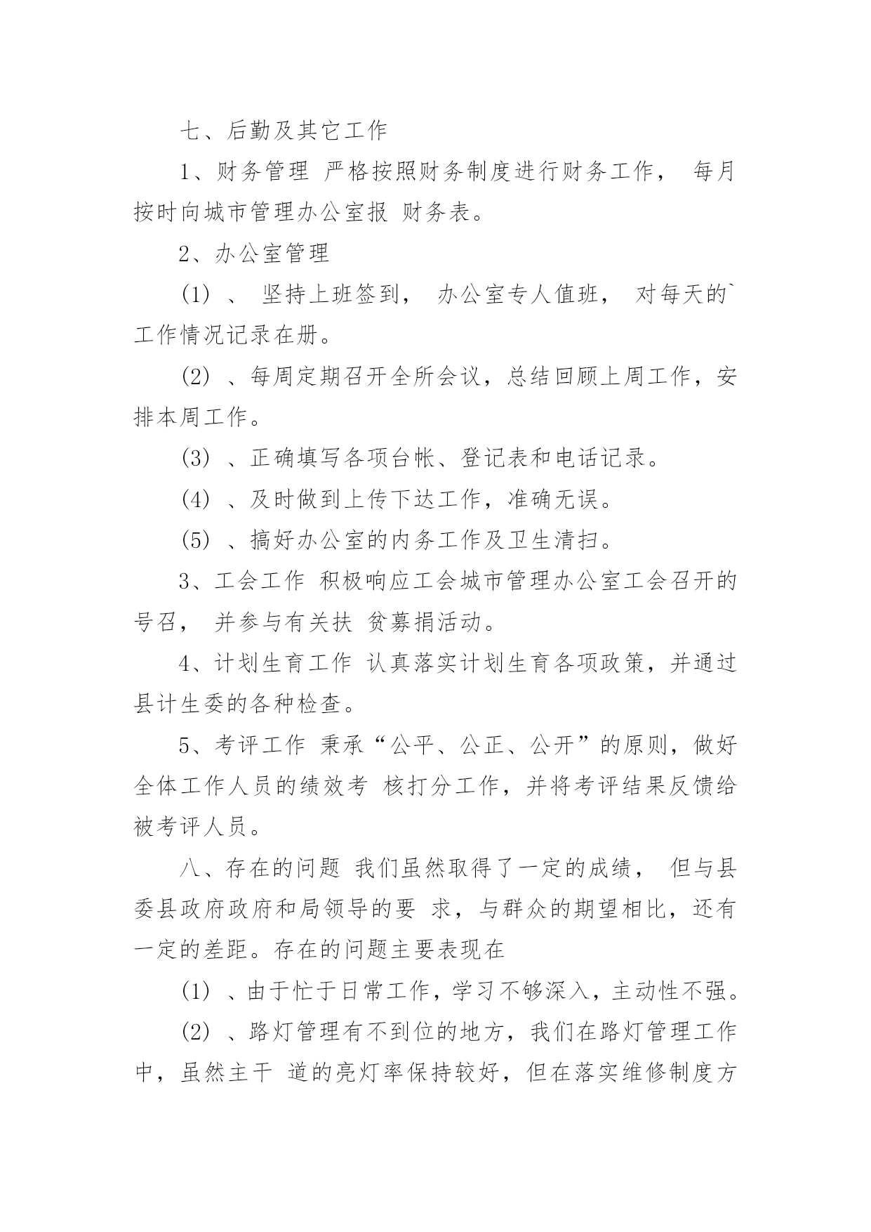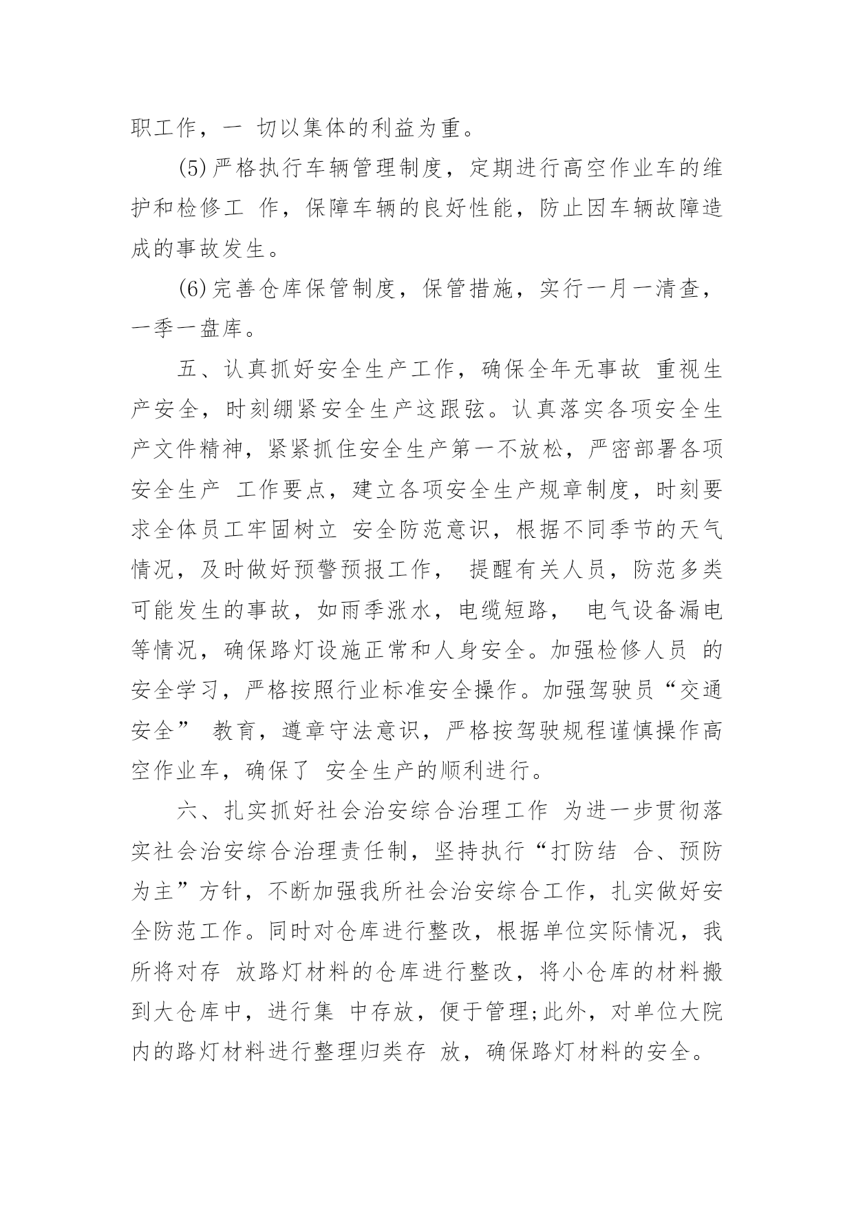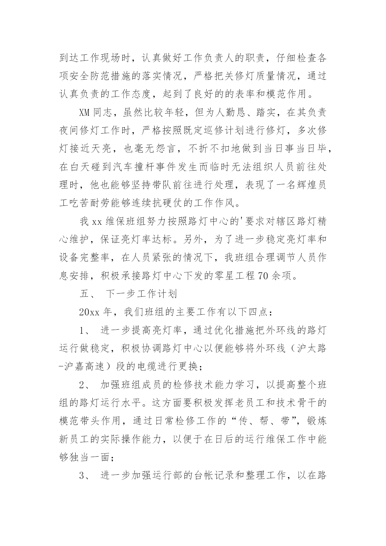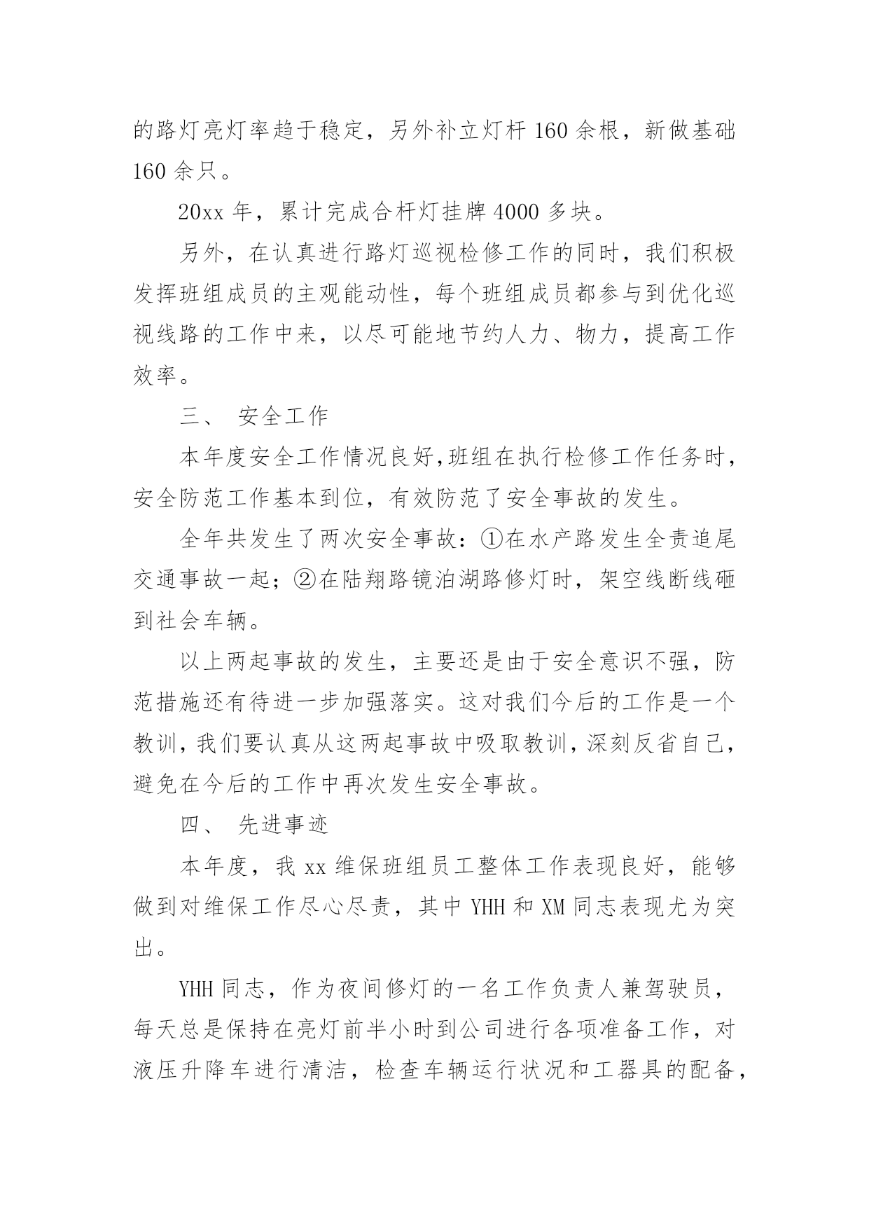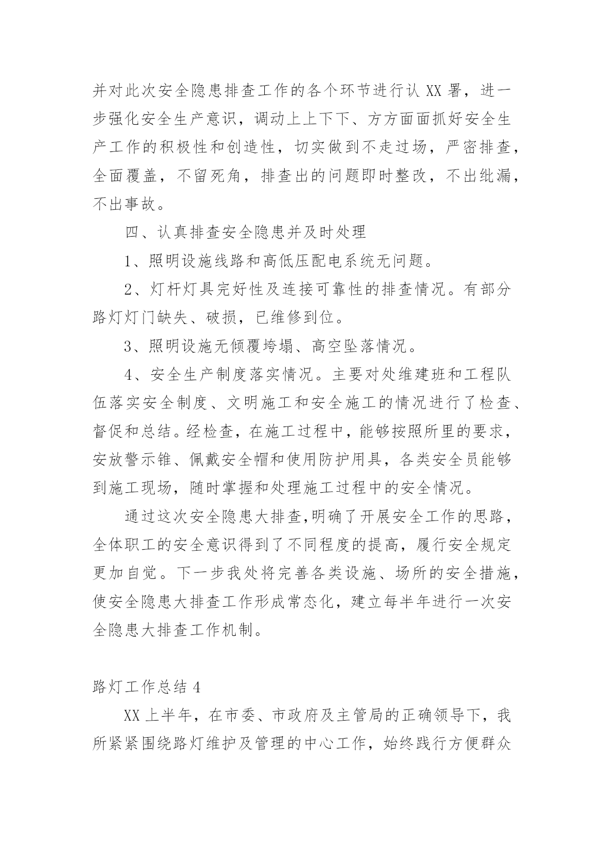 路灯工作总结总结就是把一个时间段取得的成绩、存在的问题及得到的经验和教训进行一次全面系统的总结的书面材料,它可以有效锻炼我们的语言组织能力,为此要我们写一份总结。那么总结应该包括什么内容呢?以下是小编为大家收集的路灯工作总结,仅供参考,欢迎大家阅读。路灯工作总结1在县城市管理局的正确领导下,20xx年我所紧紧围绕路灯管理中心工作,积极开展道路照明建设,全面加强城市路灯设施管理维护,不断提高路灯管理水平,顺利开展了县城亮化美化的工作,较好地完成了各项工作任务。20xx年为确保路灯所可持续发展,路灯工作管理更加规范,我所将围绕以下几点开展工作一、积极拓展业务,为路灯所谋出路由于路灯管理所是自收自支性质的事业单位,以前靠工程养活单位,而路灯工程建的硬指标日渐缩水,路灯维护费用却随工程量水涨船高,路灯维修费用经常靠等、要、舍的方式筹集,路灯的正常运行已经难以维持,路灯所不得不另谋出路。20xx年,路灯所计划成立经营性仓库,联系品牌灯具厂商供货,将富余人员安排到仓库跑业务,依托路灯所专业技术开拓灯具、电线、相关配套设施的商业市场,靠仓库经营牟利带动路灯所发展,走仓库企业化经营道路。二、争取路灯节能改造工程随着湖南省加快新型城镇化推进城乡一体化的实施,路灯节能改造项目也提上了我县建设的日程,在条件允许的情况下,我所将积极争取县城和各乡镇的路灯节能改造项目。三、确保路灯安全运行(维修安全工作)(1)、实行路灯维修责任承包,将路灯运行情况与维护人员工资挂钩,提高维修员工作积极性。(2)、继续执行夜间巡查制度,做好巡查记录,责任到人,分路段巡查,发现故障及时排除与上报,保障路灯亮化安全运行。(3)、及时抢修有故障的路灯,定期检修路灯控制系统和供电系统,保障路灯平均亮灯率达到96%。(4)、加大对路灯控制箱、地埋线、高杆灯等路灯设施的检查、检修次数,确保都能正常工作。(5)严格加强对各社区巷道路灯规划及测量,认真做好对城区各主干道、桥梁的的路灯线路的改造,对老化的线路进行更换。四、加强职工思想教育,增强职工的自身安全意识(1)工作人员必须严格遵章守纪,服从工作安排。(2)加强职工的思想教育工作,不发生任何违反路灯设备维修操作程序的现象。(3)加强职工电力业务学习和操作的积极性,以全面提高职工的综合素质。(4)工作人员在工作过程中不得相互推诿,努力完成本职工作,一切以集体的利益为重。(5)严格执行车辆管理制度,定期进行高空作业车的维护和检修工作,保障车辆的良好性能,防止因车辆故障造成的事故发生。(6)完善仓库保管制度,保管措施,实行一月一清查,一季一盘库。五、认真抓好安全生产工作,确保全年无事故重视生产安全,时刻绷紧安全生产这跟弦。认真落实各项安全生产文件精神,紧紧抓住安全生产第一不放松,严密部署各项安全生产工作要点,建立各项安全生产规章制度,时刻要求全体员工牢固树立安全防范意识,根据不同季节的天气情况,及时做好预警预报工作,提醒有关人员,防范多类可能发生的事故,如雨季涨水,电缆短路,电气设备漏电等情况,确保路灯设施正常和人身安全。加强检修人员的安全学习,严格按照行业标准安全操作。加强驾驶员“交通安全”教育,遵章守法意识,严格按驾驶规程谨慎操作高空作业车,确保了安全生产的顺利进行。六、扎实抓好社会治安综合治理工作为进一步贯彻落实社会治安综合治理责任制,坚持执行“打防结合、预防为主”方针,不断加强我所社会治安综合工作,扎实做好安全防范工作。同时对仓库进行整改,根据单位实际情况,我所将对存放路灯材料的仓库进行整改,将小仓库的材料搬到大仓库中,进行集中存放,便于管理;此外,对单位大院内的路灯材料进行整理归类存放,确保路灯材料的安全。七、后勤及其它工作1、财务管理严格按照财务制度进行财务工作,每月按时向城市管理办公室报财务表。2、办公室管理(1)、坚持上班签到,办公室专人值班,对每天的`工作情况记录在册。(2)、每周定期召开全所会议,总结回顾上周工作,安排本周工作。(3)、正确填写各项台帐、登记表和电话记录。(4)、及时做到上传下达工作,准确无误。(5)、搞好办公室的内务工作及卫生清扫。3、工会工作积极响应工会城市管理办公室工会召开的号召,并参与有关扶贫募捐活动。4、计划生育工作认真落实计划生育各项政策,并通过县计生委的各种检查。5、考评工作秉承“公平、公正、公开”的原则,做好全体工作人员的绩效考核打分工作,并将考评结果反馈给被考评人员。八、存在的问题我们虽然取得了一定的成绩,但与县委县政府政府和局领导的要求,与群众的期望相比,还有一定的差距。存在的问题主要表现在(1)、由于忙于日常工作,学习不够深入,主动性不强。(2)、路灯管理有不到位的地方,我们在路灯管理工作中,虽然主干道的亮灯率保持较好,但在落实维修制度方面做得不够好,出现了维修路灯不及时的现象