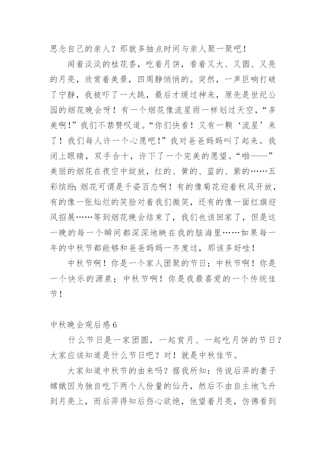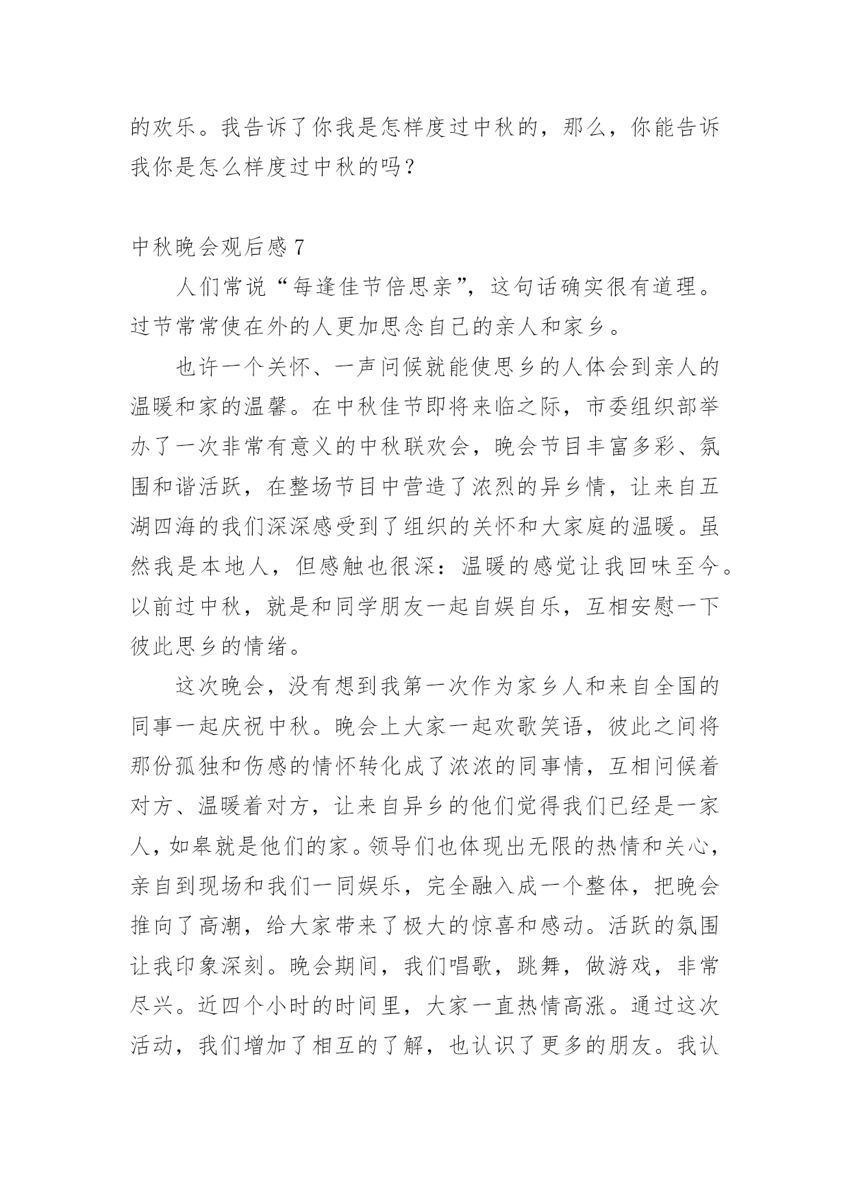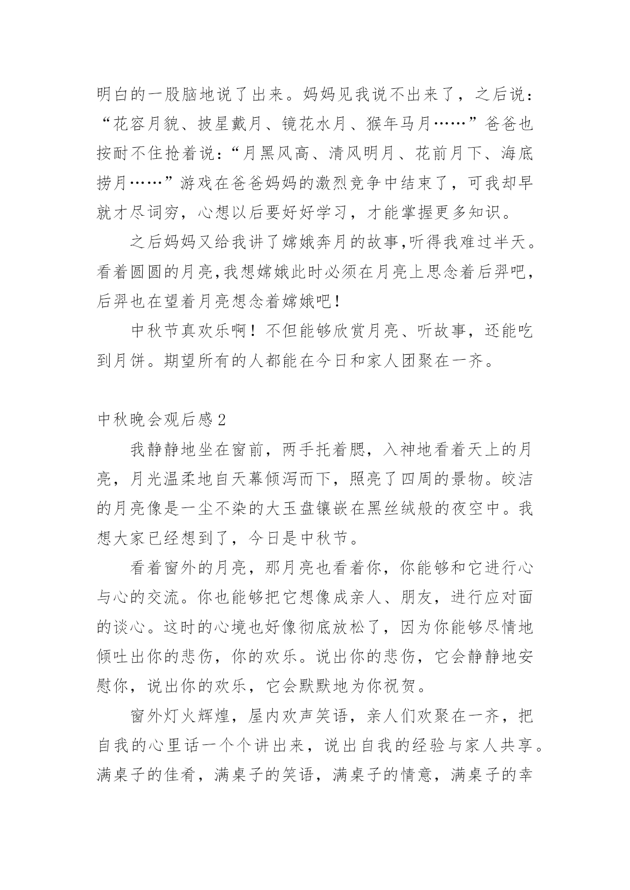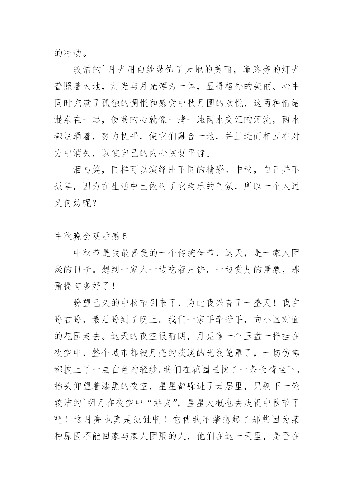 中秋晚会观后感认真品味一部作品后,这次观看让你有什么领悟呢?为此就要认真思考观后感如何写了。快来参考观后感是怎么写的吧,下面是小编整理的中秋晚会观后感,仅供参考,希望能够帮助到大家。中秋晚会观后感1中秋节的晚上,我和爸爸妈妈高高兴兴地坐在阳台上,一边吃月饼一边赏月。天渐渐地黑了,一轮金黄的圆月缓缓地升到空中,它毫不吝啬地把皎洁的月光洒向大地,大地就像穿上了一件柔美的轻纱更加妩媚。月亮时而钻进云层,时而偷偷地露出半边脸,好像一个调皮的孩子在和我们玩捉迷藏。路边的一排香樟树在月光下显得更加威武,树下的韭兰花丛更是迷人,绿色的草丛中点缀着星星点点的小白花,草丛中的蟋蟀拉起了小提琴,蝈蝈也不甘示弱地大声唱起来,歌声此起彼伏,好美妙的一场音乐会啊!我们全家人围坐在阳台上,一边吃着美味的'月饼,一边欣赏着明月,爸爸说月饼象征着团圆和对亲人的思念,所以中秋要吃月饼。突然爸爸说:“今日月亮这么好,我们来一齐做个游戏吧!我们比赛说成语,成语里面必须有个月字,看谁说的最多。”我和妈妈一呼即应,我抢着先说:“嫦娥奔月、花好月圆、日新月异、日积月累、风花雪月。”把我能明白的一股脑地说了出来。妈妈见我说不出来了,之后说:“花容月貌、披星戴月、镜花水月、猴年马月……”爸爸也按耐不住抢着说:“月黑风高、清风明月、花前月下、海底捞月……”游戏在爸爸妈妈的激烈竞争中结束了,可我却早就才尽词穷,心想以后要好好学习,才能掌握更多知识。之后妈妈又给我讲了嫦娥奔月的故事,听得我难过半天。看着圆圆的月亮,我想嫦娥此时必须在月亮上思念着后羿吧,后羿也在望着月亮想念着嫦娥吧!中秋节真欢乐啊!不但能够欣赏月亮、听故事,还能吃到月饼。期望所有的人都能在今日和家人团聚在一齐。中秋晚会观后感2我静静地坐在窗前,两手托着腮,入神地看着天上的月亮,月光温柔地自天幕倾泻而下,照亮了四周的景物。皎洁的月亮像是一尘不染的大玉盘镶嵌在黑丝绒般的夜空中。我想大家已经想到了,今日是中秋节。看着窗外的月亮,那月亮也看着你,你能够和它进行心与心的交流。你也能够把它想像成亲人、朋友,进行应对面的谈心。这时的心境也好像彻底放松了,因为你能够尽情地倾吐出你的悲伤,你的欢乐。说出你的悲伤,它会静静地安慰你,说出你的欢乐,它会默默地为你祝贺。窗外灯火辉煌,屋内欢声笑语,亲人们欢聚在一齐,把自我的心里话一个个讲出来,说出自我的经验与家人共享。满桌子的佳肴,满桌子的笑语,满桌子的情意,满桌子的幸福……中秋节是一个好日子,是与亲人们欢聚一堂、团圆的日子。“每逢佳节倍思亲”,不管你在哪里,不管你在干什麽,如果回不了家,只要你有心,就会往家里打个电话报个平安,哪怕是一句也好,只要让亲人们明白你过的好,你过的幸福平安就行。家人心里牵挂的也正是你的.平安、幸福。我的思绪突然被一阵阵的烟花爆竹声打断,那烟花是那麽美丽,是那麽耀眼,我想到了远方的亲人们,你们应当也会看到美丽的烟花吧。如果你们在外未曾回家,那麽请你们立刻拿起电话给家人打个电话,报声平安吧!中秋节真是个好节日啊!月亮又圆又大,在黑色的夜幕中它显得那麽的璀璨、那麽的美丽,它那温柔的月光让人感到那麽的温暖、那麽的亲切。月亮是美丽的,人是有心的,每一个有心人都会留意观察美丽的月亮。远方的游子,你们此时是不是也在遥望着这深邃的夜空?是不是也感受到了月亮的亲切与温柔?是不是也有种回家的感觉呢?中秋晚会观后感3皓月凌空的美景历来为人们所传颂,尤其是中秋的月,夜空中的星光在中秋月的耀眼下都一一敛去了光芒,但间或的几颗小星星许是也想窥一窥这中秋月的美景,冒着小脑袋闪闪的偷望着不远处的明月。中秋节赏月是流传已久的习俗,在这一个特殊的日子里,大多的人都满带着思恋仰望着悬挂于头顶的那轮圆月。“平分秋色一轮满,长伴云衢千里明。”中秋的月圆满,中秋的月辉不仅仅照亮了这个夜,同样也照亮了我们一颗颗仰望着月的归心。不关地点,无关时间,中秋的那一轮明月,透彻了历史,在历史长河中,每一位仰望着月的人,都理解了月辉的洗礼,月的光辉能缓解在外游子的乡思。在中秋的这个夜晚,天空中的月是主角。夜晚的天空上还飘着几朵被风吹动的云,云在月光下染上了颜色,那一种由亮至暗的渐变,给了这个单调的夜幕带上了一番繁复,被月照亮的云在风的鼓舞下莽足了劲要去抚摸心中的神,近了,近了,云最终触上了月亮,它缓慢地从月上飘过,有兴奋,有痴迷,可最终不管它有多么的留念,那股将它带近月的风,又将它吹飘,在风的力量下,云终是离月越来越远,云身上的光辉也渐渐的消失,到最终,云离得月远了,月的光辉也驱不散来自黑夜的侵袭,渐渐地云隐入了远处漆黑的夜幕。当云的`最终一角也消失不见的时候,我们收回了视线,心里带着落寞,为那朵消失了的云感慨,但也在羡慕为那朵触摸到了月的云,因为我们站在地面上仰望着天空的月,始终遥不可及。虽然我们也明白那云与月触
