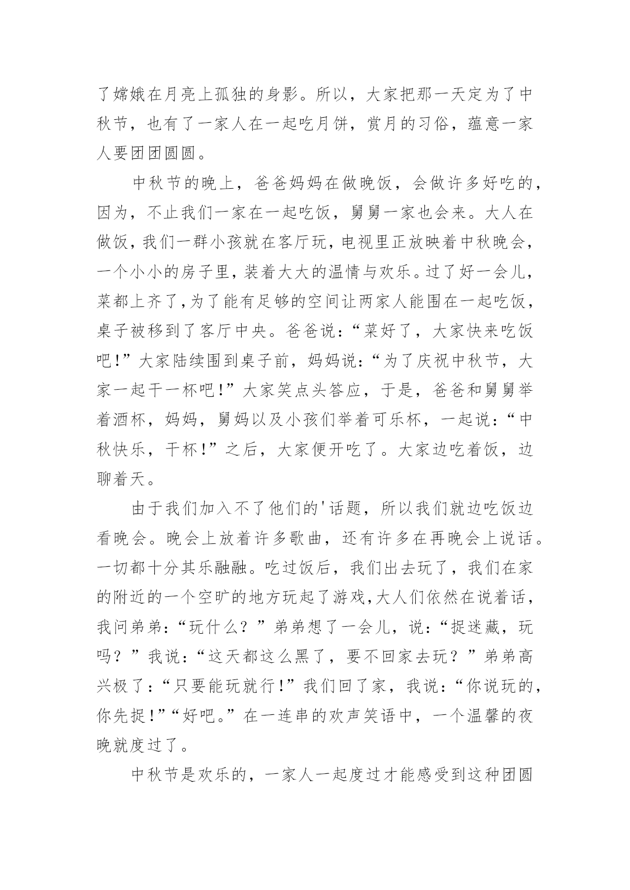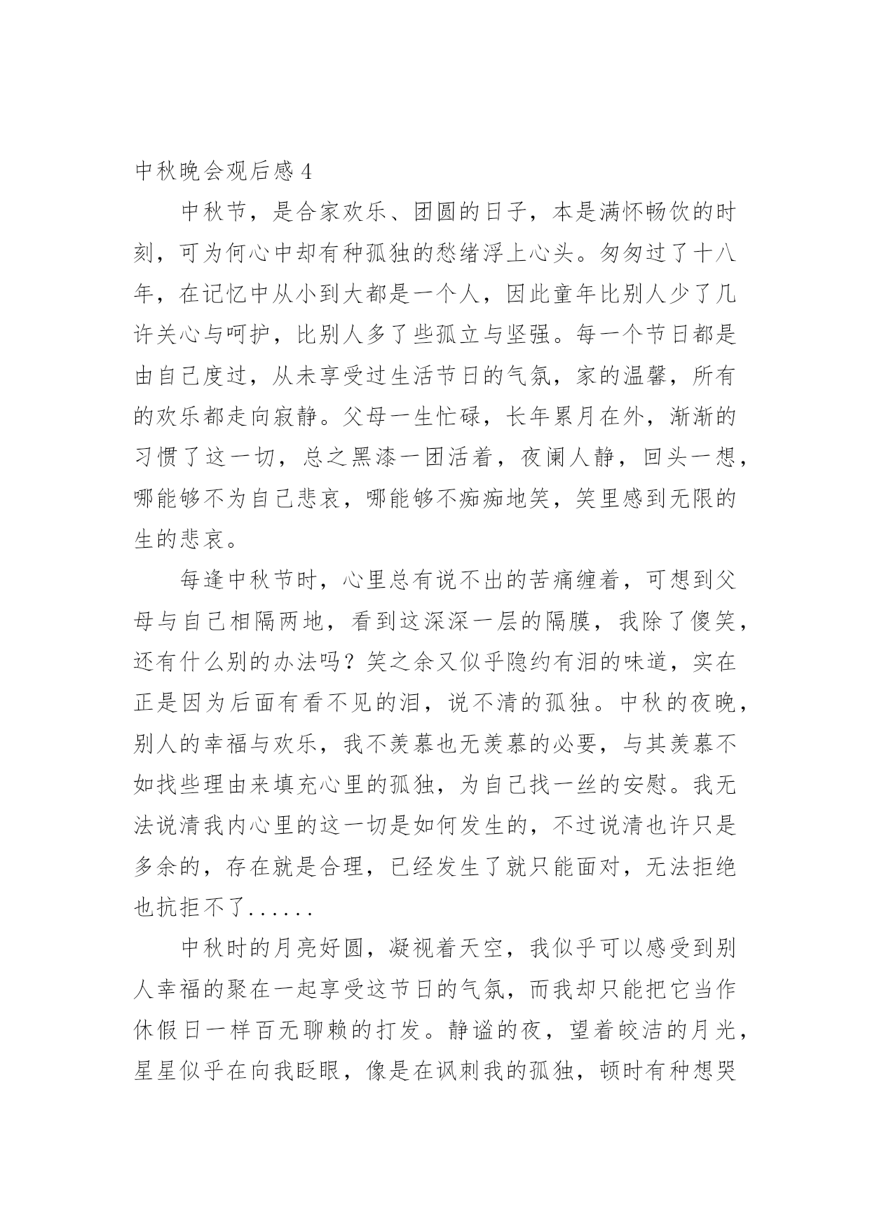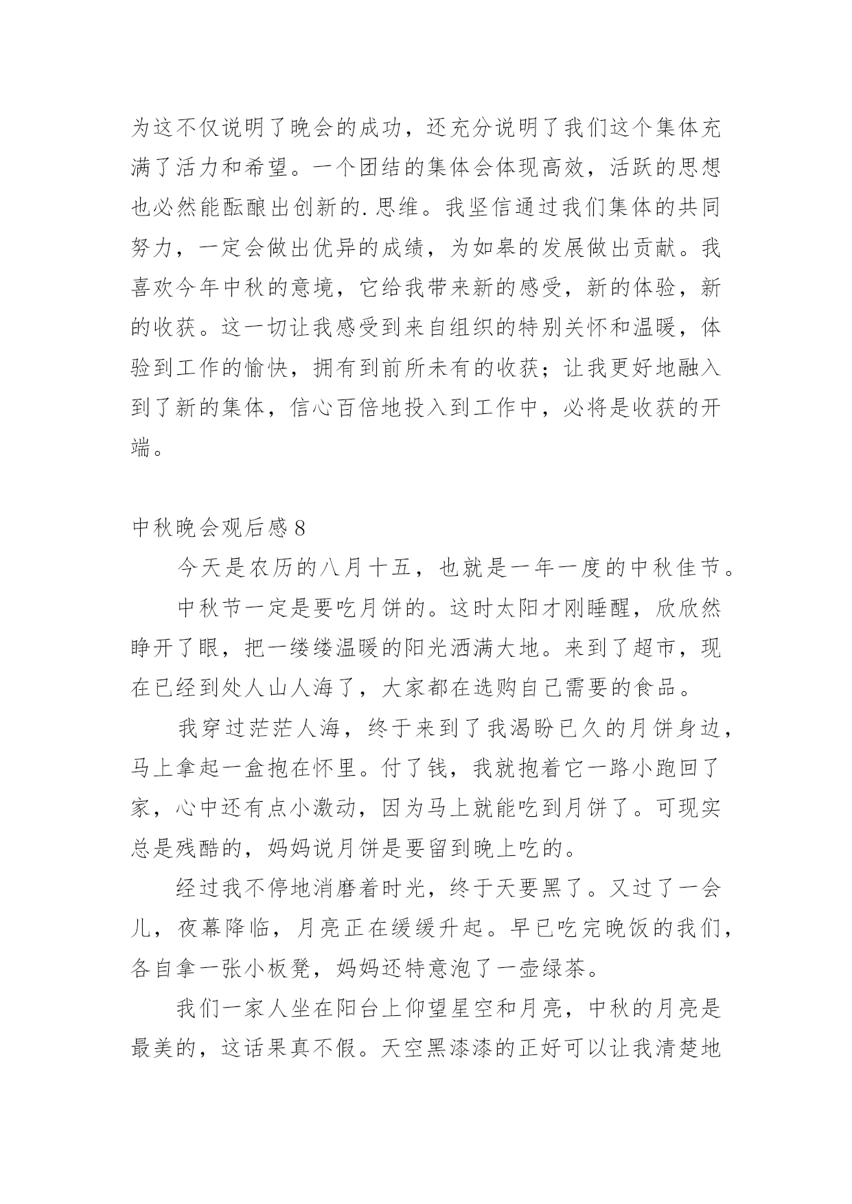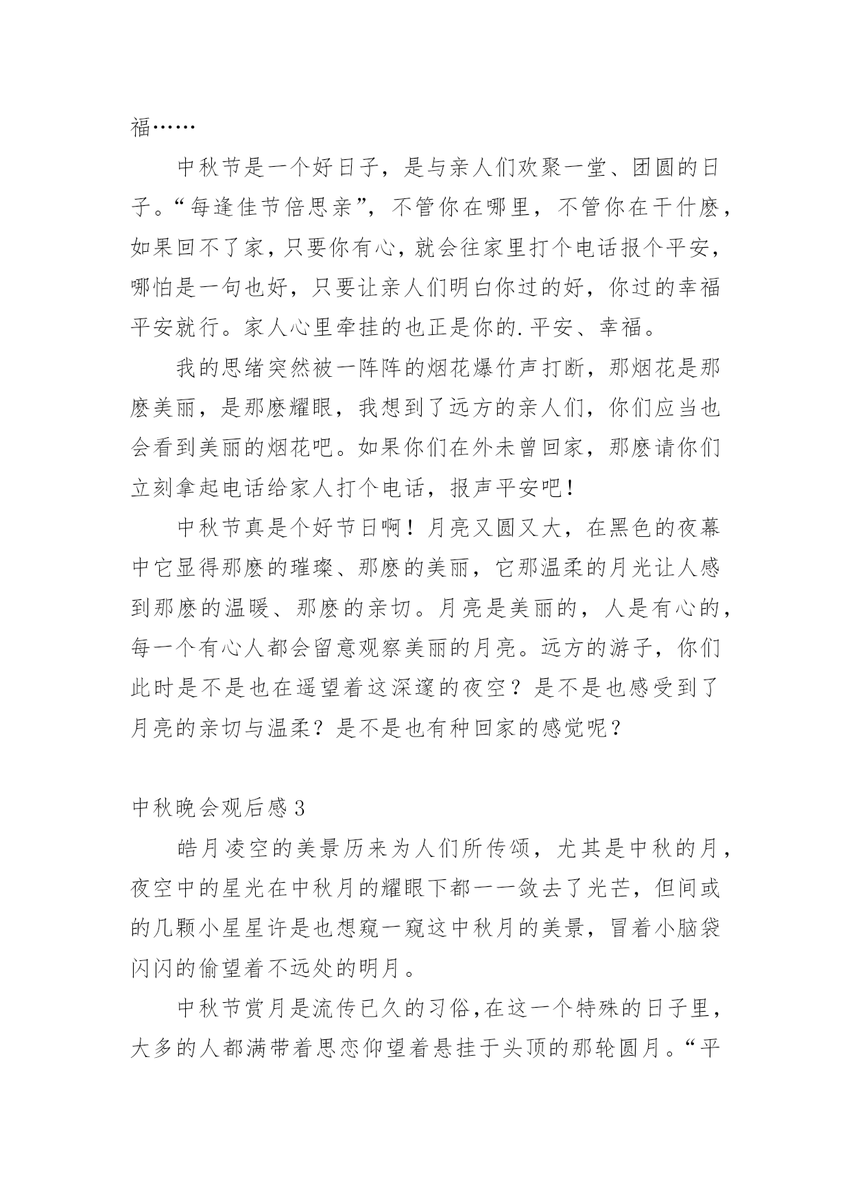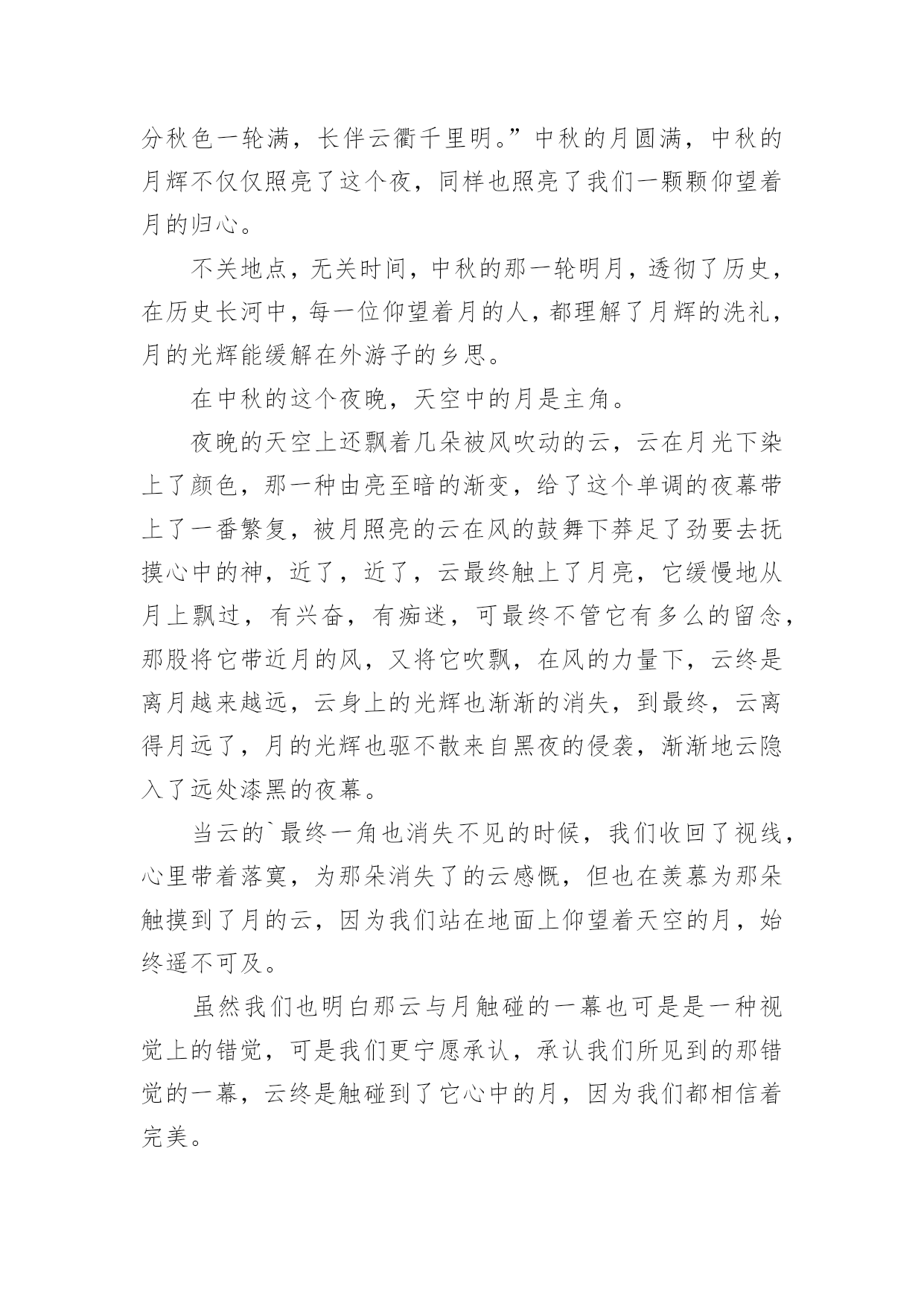 中秋晚会观后感认真品味一部作品后,这次观看让你有什么领悟呢?为此就要认真思考观后感如何写了。快来参考观后感是怎么写的吧,下面是小编整理的中秋晚会观后感,仅供参考,希望能够帮助到大家。中秋晚会观后感1中秋节的晚上,我和爸爸妈妈高高兴兴地坐在阳台上,一边吃月饼一边赏月。天渐渐地黑了,一轮金黄的圆月缓缓地升到空中,它毫不吝啬地把皎洁的月光洒向大地,大地就像穿上了一件柔美的轻纱更加妩媚。月亮时而钻进云层,时而偷偷地露出半边脸,好像一个调皮的孩子在和我们玩捉迷藏。路边的一排香樟树在月光下显得更加威武,树下的韭兰花丛更是迷人,绿色的草丛中点缀着星星点点的小白花,草丛中的蟋蟀拉起了小提琴,蝈蝈也不甘示弱地大声唱起来,歌声此起彼伏,好美妙的一场音乐会啊!我们全家人围坐在阳台上,一边吃着美味的'月饼,一边欣赏着明月,爸爸说月饼象征着团圆和对亲人的思念,所以中秋要吃月饼。突然爸爸说:“今日月亮这么好,我们来一齐做个游戏吧!我们比赛说成语,成语里面必须有个月字,看谁说的最多。”我和妈妈一呼即应,我抢着先说:“嫦娥奔月、花好月圆、日新月异、日积月累、风花雪月。”把我能明白的一股脑地说了出来。妈妈见我说不出来了,之后说:“花容月貌、披星戴月、镜花水月、猴年马月……”爸爸也按耐不住抢着说:“月黑风高、清风明月、花前月下、海底捞月……”游戏在爸爸妈妈的激烈竞争中结束了,可我却早就才尽词穷,心想以后要好好学习,才能掌握更多知识。之后妈妈又给我讲了嫦娥奔月的故事,听得我难过半天。看着圆圆的月亮,我想嫦娥此时必须在月亮上思念着后羿吧,后羿也在望着月亮想念着嫦娥吧!中秋节真欢乐啊!不但能够欣赏月亮、听故事,还能吃到月饼。期望所有的人都能在今日和家人团聚在一齐。中秋晚会观后感2我静静地坐在窗前,两手托着腮,入神地看着天上的月亮,月光温柔地自天幕倾泻而下,照亮了四周的景物。皎洁的月亮像是一尘不染的大玉盘镶嵌在黑丝绒般的夜空中。我想大家已经想到了,今日是中秋节。看着窗外的月亮,那月亮也看着你,你能够和它进行心与心的交流。你也能够把它想像成亲人、朋友,进行应对面的谈心。这时的心境也好像彻底放松了,因为你能够尽情地倾吐出你的悲伤,你的欢乐。说出你的悲伤,它会静静地安慰你,说出你的欢乐,它会默默地为你祝贺。窗外灯火辉煌,屋内欢声笑语,亲人们欢聚在一齐,把自我的心里话一个个讲出来,说出自我的经验与家人共享。满桌子的佳肴,满桌子的笑语,满桌子的情意,满桌子的幸福……中秋节是一个好日子,是与亲人们欢聚一堂、团圆的日子。“每逢佳节倍思亲”,不管你在哪里,不管你在干什麽,如果回不了家,只要你有心,就会往家里打个电话报个平安,哪怕是一句也好,只要让亲人们明白你过的好,你过的幸福平安就行。家人心里牵挂的也正是你的.平安、幸福。我的思绪突然被一阵阵的烟花爆竹声打断,那烟花是那麽美丽,是那麽耀眼,我想到了远方的亲人们,你们应当也会看到美丽的烟花吧。如果你们在外未曾回家,那麽请你们立刻拿起电话给家人打个电话,报声平安吧!中秋节真是个好节日啊!月亮又圆又大,在黑色的夜幕中它显得那麽的璀璨、那麽的美丽,它那温柔的月光让人感到那麽的温暖、那麽的亲切。月亮是美丽的,人是有心的,每一个有心人都会留意观察美丽的月亮。远方的游子,你们此时是不是也在遥望着这深邃的夜空?是不是也感受到了月亮的亲切与温柔?是不是也有种回家的感觉呢?中秋晚会观后感3皓月凌空的美景历来为人们所传颂,尤其是中秋的月,夜空中的星光在中秋月的耀眼下都一一敛去了光芒,但间或的几颗小星星许是也想窥一窥这中秋月的美景,冒着小脑袋闪闪的偷望着不远处的明月。中秋节赏月是流传已久的习俗,在这一个特殊的日子里,大多的人都满带着思恋仰望着悬挂于头顶的那轮圆月。“平分秋色一轮满,长伴云衢千里明。”中秋的月圆满,中秋的月辉不仅仅照亮了这个夜,同样也照亮了我们一颗颗仰望着月的归心。不关地点,无关时间,中秋的那一轮明月,透彻了历史,在历史长河中,每一位仰望着月的人,都理解了月辉的洗礼,月的光辉能缓解在外游子的乡思。在中秋的这个夜晚,天空中的月是主角。夜晚的天空上还飘着几朵被风吹动的云,云在月光下染上了颜色,那一种由亮至暗的渐变,给了这个单调的夜幕带上了一番繁复,被月照亮的云在风的鼓舞下莽足了劲要去抚摸心中的神,近了,近了,云最终触上了月亮,它缓慢地从月上飘过,有兴奋,有痴迷,可最终不管它有多么的留念,那股将它带近月的风,又将它吹飘,在风的力量下,云终是离月越来越远,云身上的光辉也渐渐的消失,到最终,云离得月远了,月的光辉也驱不散来自黑夜的侵袭,渐渐地云隐入了远处漆黑的夜幕。当云的`最终一角也消失不见的时候,我们收回了视线,心里带着落寞,为那朵消失了的云感慨,但也在羡慕为那朵触摸到了月的云,因为我们站在地面上仰望着天空的月,始终遥不可及。虽然我们也明白那云与月触