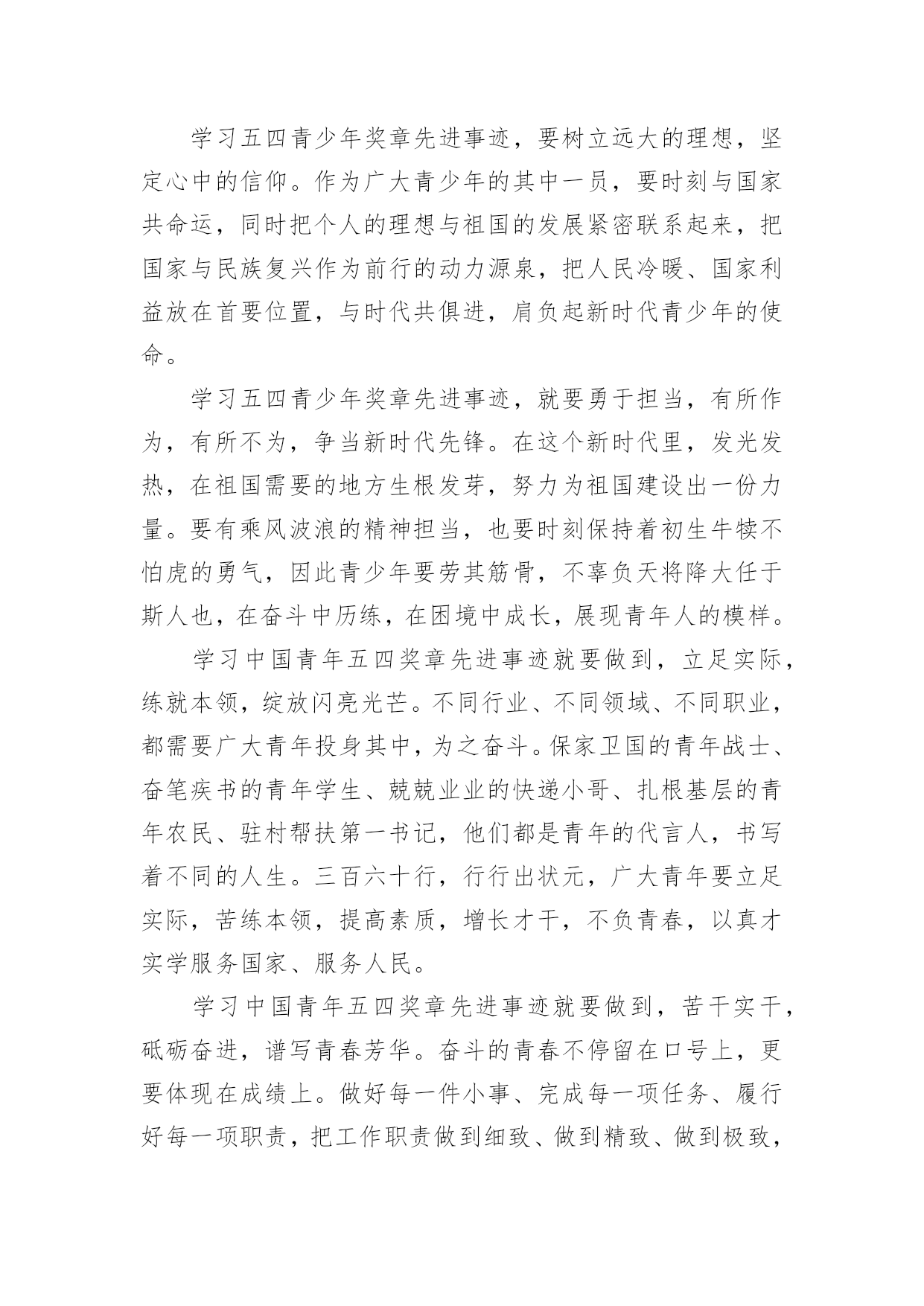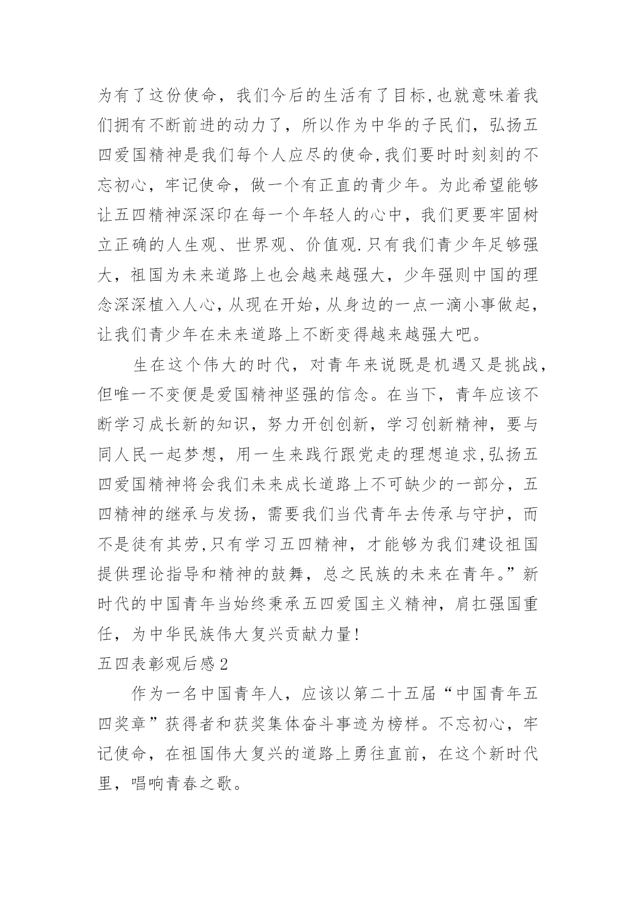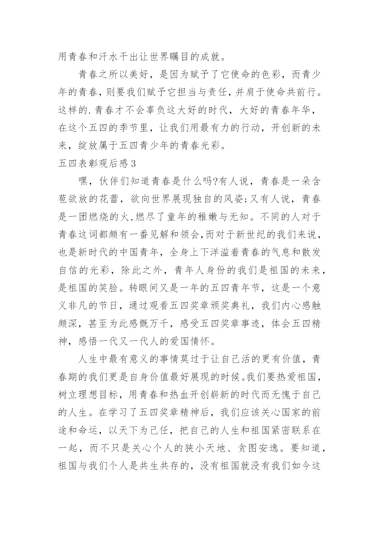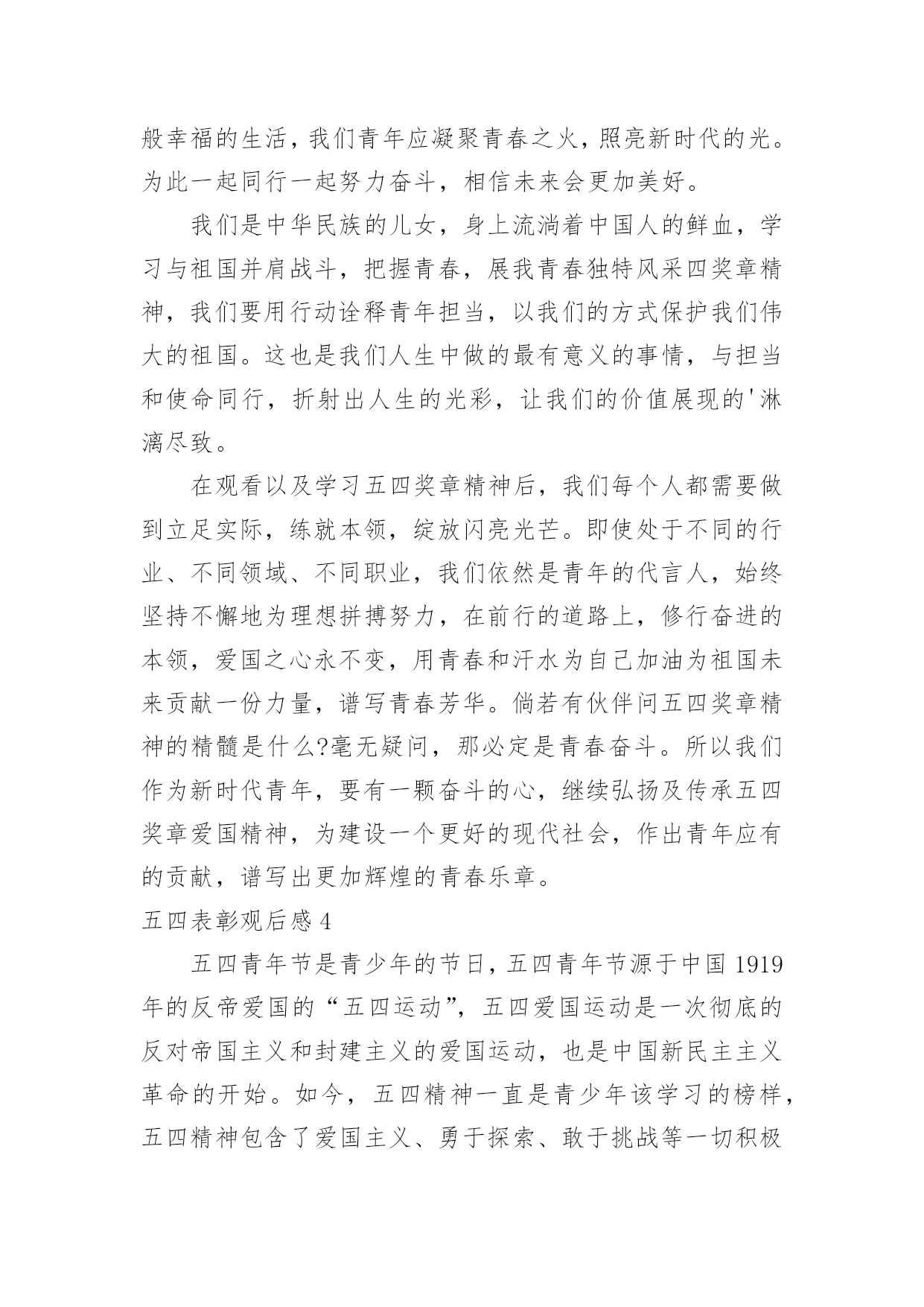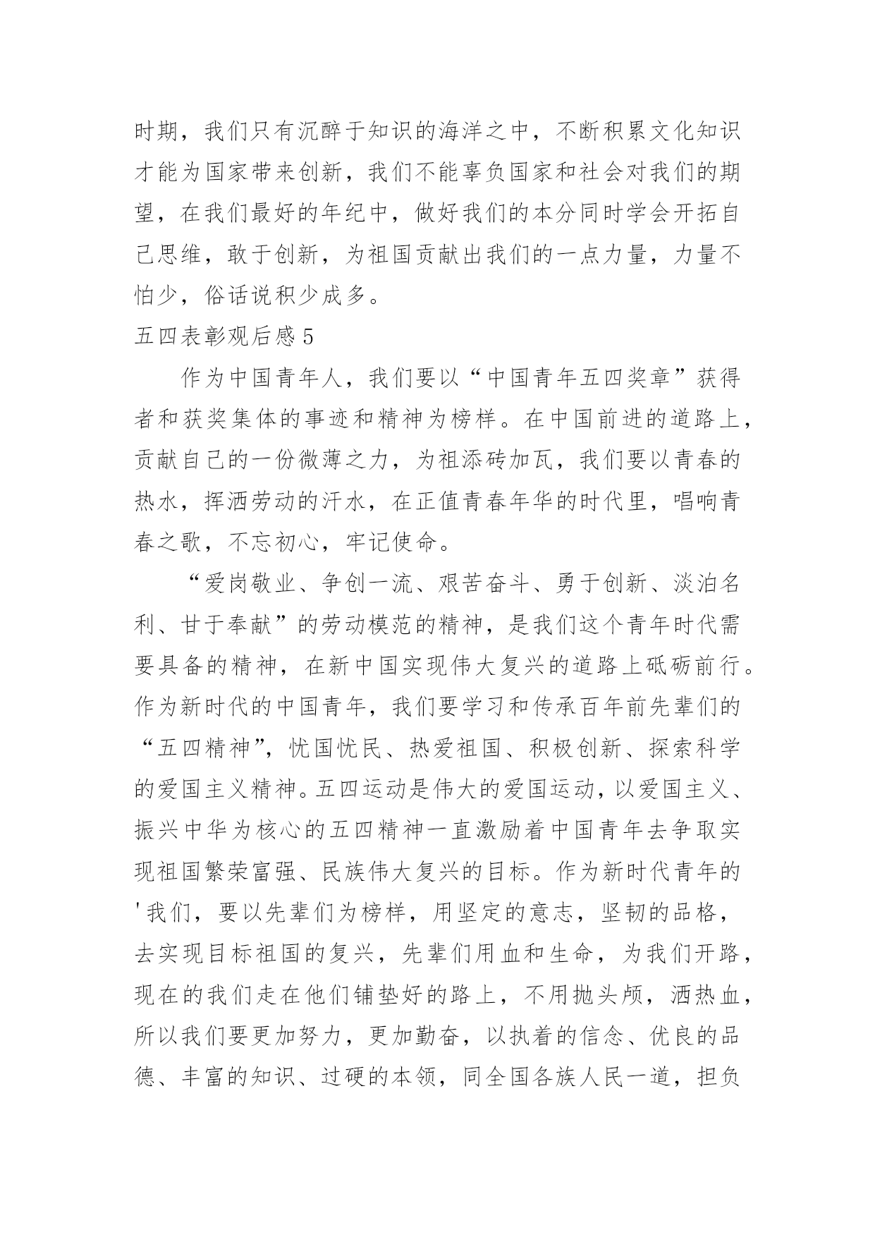 五四表彰观后感五四表彰观后感看完一部作品以后,相信大家增长不少见闻吧,透过观影,我们可以发现一些深刻的感悟。那么我们如何去写观后感呢?以下是小编为大家收集的五四表彰观后感,欢迎阅读与收藏。五四表彰观后感1五月明媚的阳光以及大自然的真纯美好,而在这伟大的五月里我们迎来了一年一度的五四青年节.距今为止五四运动已经发生了很多年了,或许有许多人都认为i五四精神只是一个时代的精神,然而这不仅仅是一种时代上的精神,这是一场这场由青年学生所组织起的爱国精神运动,使得历史发生了很大的变化,同时也开启了一个伟大的新历史远程门,也向世界展现了中国青年的力量.作为新一代的青少年,我们应该弘扬、继承五四精神,因为这是我们每一个人应有的使命,所谓的五四爱国运动是指在历史上有这么一群青少年为了保家卫国,捍卫祖国的尊严,五四运动更多的`是承载了我国历史上多年伟大的青少年爱国精神,而在这种精神里包含了太多青年人关注国家使命国家命运的责任和使命。20xx年时期我国已经走在高速发展的路线,而祖国的发展离不开新一代的青年,正如请少年是祖国未来的花朵,因为有了这份使命,我们今后的生活有了目标,也就意味着我们拥有不断前进的动力了,所以作为中华的子民们,弘扬五四爱国精神是我们每个人应尽的使命,我们要时时刻刻的不忘初心,牢记使命,做一个有正直的青少年。为此希望能够让五四精神深深印在每一个年轻人的心中,我们更要牢固树立正确的人生观、世界观、价值观.只有我们青少年足够强大,祖国为未来道路上也会越来越强大,少年强则中国的理念深深植入人心,从现在开始,从身边的一点一滴小事做起,让我们青少年在未来道路上不断变得越来越强大吧。生在这个伟大的时代,对青年来说既是机遇又是挑战,但唯一不变便是爱国精神坚强的信念。在当下,青年应该不断学习成长新的知识,努力开创创新,学习创新精神,要与同人民一起梦想,用一生来践行跟党走的理想追求,弘扬五四爱国精神将会我们未来成长道路上不可缺少的一部分,五四精神的继承与发扬,需要我们当代青年去传承与守护,而不是徒有其劳,只有学习五四精神,才能够为我们建设祖国提供理论指导和精神的鼓舞,总之民族的未来在青年。”新时代的中国青年当始终秉承五四爱国主义精神,肩扛强国重任,为中华民族伟大复兴贡献力量!五四表彰观后感2作为一名中国青年人,应该以第二十五届“中国青年五四奖章”获得者和获奖集体奋斗事迹为榜样。不忘初心,牢记使命,在祖国伟大复兴的道路上勇往直前,在这个新时代里,唱响青春之歌。学习五四青少年奖章先进事迹,要树立远大的理想,坚定心中的信仰。作为广大青少年的其中一员,要时刻与国家共命运,同时把个人的理想与祖国的发展紧密联系起来,把国家与民族复兴作为前行的动力源泉,把人民冷暖、国家利益放在首要位置,与时代共俱进,肩负起新时代青少年的使命。学习五四青少年奖章先进事迹,就要勇于担当,有所作为,有所不为,争当新时代先锋。在这个新时代里,发光发热,在祖国需要的地方生根发芽,努力为祖国建设出一份力量。要有乘风波浪的精神担当,也要时刻保持着初生牛犊不怕虎的勇气,因此青少年要劳其筋骨,不辜负天将降大任于斯人也,在奋斗中历练,在困境中成长,展现青年人的模样。学习中国青年五四奖章先进事迹就要做到,立足实际,练就本领,绽放闪亮光芒。不同行业、不同领域、不同职业,都需要广大青年投身其中,为之奋斗。保家卫国的青年战士、奋笔疾书的青年学生、兢兢业业的快递小哥、扎根基层的青年农民、驻村帮扶第一书记,他们都是青年的代言人,书写着不同的人生。三百六十行,行行出状元,广大青年要立足实际,苦练本领,提高素质,增长才干,不负青春,以真才实学服务国家、服务人民。学习中国青年五四奖章先进事迹就要做到,苦干实干,砥砺奋进,谱写青春芳华。奋斗的青春不停留在口号上,更要体现在成绩上。做好每一件小事、完成每一项任务、履行好每一项职责,把工作职责做到细致、做到精致、做到极致,用青春和汗水干出让世界瞩目的成就。青春之所以美好,是因为赋予了它使命的色彩,而青少年的青春,则要我们赋予它担当与责任,并肩于使命共前行。这样的.青春才不会辜负这大好的时代,大好的青春年华,在这个五四的季节里,让我们用最有力的行动,开创新的未来,绽放属于五四青少年的青春光彩。五四表彰观后感3嘿,伙伴们知道青春是什么吗?有人说,青春是一朵含苞欲放的花蕾,欲向世界展现独自的风姿;又有人说,青春是一团燃烧的火,燃尽了童年的稚嫩与无知。不同的人对于青春这词都颇有一番见解和领会,而对于新世纪的我们来说,也是新时代的中国青年,全身上下洋溢着青春的气息和散发自信的光彩,除此之外,青年人身份的我们是祖国的未来,是祖国的笑脸。转眼间又是一年的五四青年节,这是一个意义非凡的节日,通过观看五四奖章颁奖典礼,我们内心感触颇深,甚至为此感慨万千,感受五四奖章事迹,体会五四精神