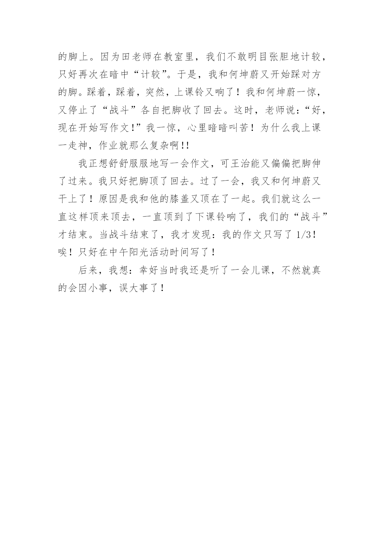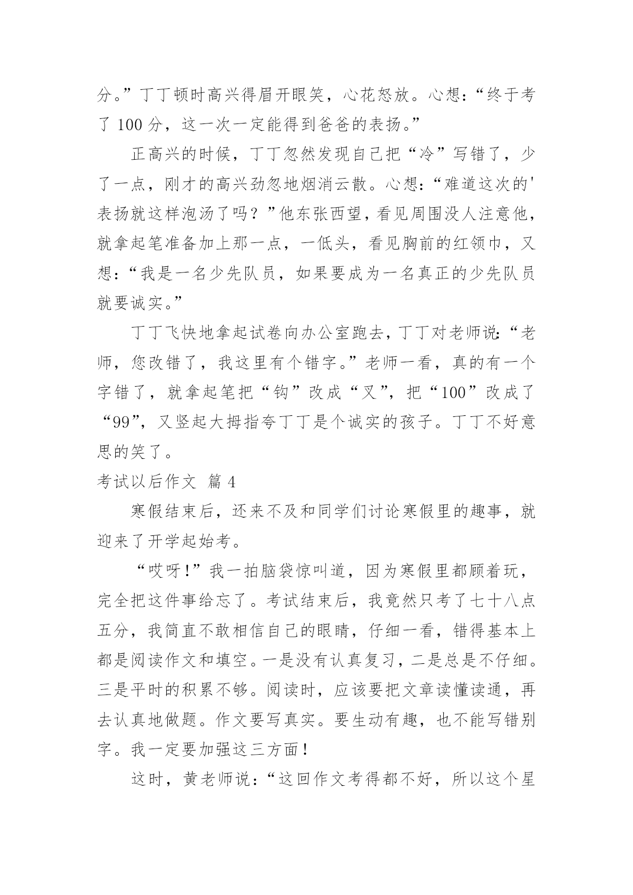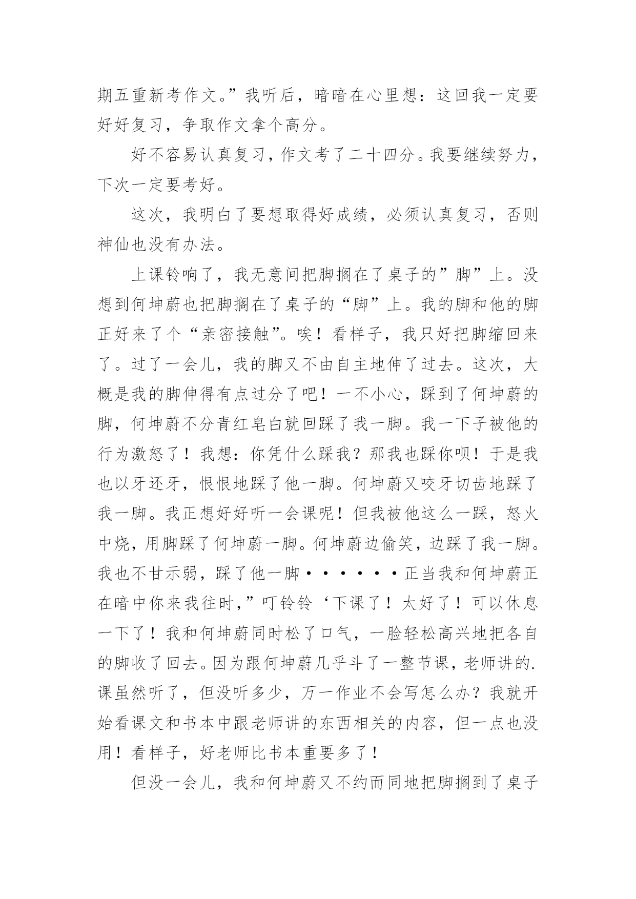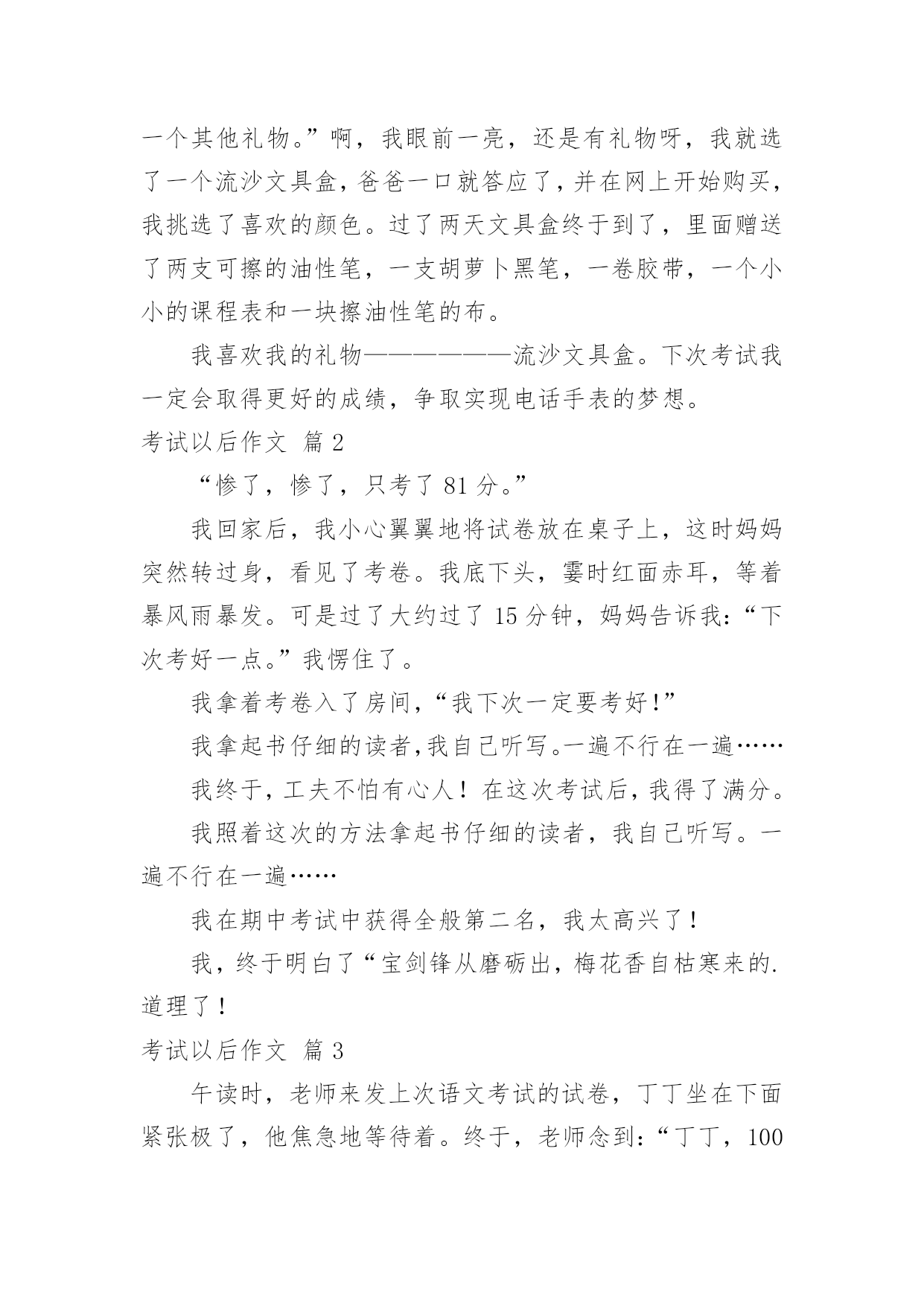 考试以后作文考试以后作文四篇在日常学习、工作或生活中,大家都不可避免地要接触到作文吧,借助作文人们可以反映客观事物、表达思想感情、传递知识信息。还是对作文一筹莫展吗?以下是小编整理的考试以后作文4篇,供大家参考借鉴,希望可以帮助到有需要的朋友。考试以后作文篇1期末考试结束了,但我的心依然不能平静,老师告诉我们成绩会发到班级群,我想万一我考的不好,爸爸就不会给我买电话手表了。时间一天天过去了,英语和数学成绩都出来了,英语97分,数学96分,实际上英语还行,数学就很差了。我问妈妈:“为什么语文成绩还没出来?”妈妈摇摇头说:“不知道。”爸爸说:“老师发消息了,语文成绩被教研室抽走了,过几天就出来了。”我的心七上八下,语文成绩决定我能不能买电话手表,如果语文成绩不好,我的'电话手表就泡汤了。终于,语文成绩也出来了,语文考了103分,爸爸说:“语文还是不错的,要继续努力哟,但是这次电话手表不能买了,因为我们考试前制订的目标没有达成。”我瞬间很沮丧,我的礼物又得不到了。就在这时,妈妈说:“虽然这次数学没有考好,但是比期中考试还是有很大进步的,可以换一个其他礼物。”啊,我眼前一亮,还是有礼物呀,我就选了一个流沙文具盒,爸爸一口就答应了,并在网上开始购买,我挑选了喜欢的颜色。过了两天文具盒终于到了,里面赠送了两支可擦的油性笔,一支胡萝卜黑笔,一卷胶带,一个小小的课程表和一块擦油性笔的布。我喜欢我的礼物——————流沙文具盒。下次考试我一定会取得更好的成绩,争取实现电话手表的梦想。考试以后作文篇2“惨了,惨了,只考了81分。”我回家后,我小心翼翼地将试卷放在桌子上,这时妈妈突然转过身,看见了考卷。我底下头,霎时红面赤耳,等着暴风雨暴发。可是过了大约过了15分钟,妈妈告诉我:“下次考好一点。”我愣住了。我拿着考卷入了房间,“我下次一定要考好!”我拿起书仔细的读者,我自己听写。一遍不行在一遍……我终于,工夫不怕有心人!在这次考试后,我得了满分。我照着这次的方法拿起书仔细的读者,我自己听写。一遍不行在一遍……我在期中考试中获得全般第二名,我太高兴了!我,终于明白了“宝剑锋从磨砺出,梅花香自枯寒来的.道理了!考试以后作文篇3午读时,老师来发上次语文考试的试卷,丁丁坐在下面紧张极了,他焦急地等待着。终于,老师念到:“丁丁,100分。”丁丁顿时高兴得眉开眼笑,心花怒放。心想:“终于考了100分,这一次一定能得到爸爸的表扬。”正高兴的时候,丁丁忽然发现自己把“冷”写错了,少了一点,刚才的高兴劲忽地烟消云散。心想:“难道这次的'表扬就这样泡汤了吗?”他东张西望,看见周围没人注意他,就拿起笔准备加上那一点,一低头,看见胸前的红领巾,又想:“我是一名少先队员,如果要成为一名真正的少先队员就要诚实。”丁丁飞快地拿起试卷向办公室跑去,丁丁对老师说:“老师,您改错了,我这里有个错字。”老师一看,真的有一个字错了,就拿起笔把“钩”改成“叉”,把“100”改成了“99”,又竖起大拇指夸丁丁是个诚实的孩子。丁丁不好意思的笑了。考试以后作文篇4寒假结束后,还来不及和同学们讨论寒假里的趣事,就迎来了开学起始考。“哎呀!”我一拍脑袋惊叫道,因为寒假里都顾着玩,完全把这件事给忘了。考试结束后,我竟然只考了七十八点五分,我简直不敢相信自己的眼睛,仔细一看,错得基本上都是阅读作文和填空。一是没有认真复习,二是总是不仔细。三是平时的积累不够。阅读时,应该要把文章读懂读通,再去认真地做题。作文要写真实。要生动有趣,也不能写错别字。我一定要加强这三方面!这时,黄老师说:“这回作文考得都不好,所以这个星期五重新考作文。”我听后,暗暗在心里想:这回我一定要好好复习,争取作文拿个高分。好不容易认真复习,作文考了二十四分。我要继续努力,下次一定要考好。这次,我明白了要想取得好成绩,必须认真复习,否则神仙也没有办法。上课铃响了,我无意间把脚搁在了桌子的”脚”上。没想到何坤蔚也把脚搁在了桌子的“脚”上。我的脚和他的脚正好来了个“亲密接触”。唉!看样子,我只好把脚缩回来了。过了一会儿,我的脚又不由自主地伸了过去。这次,大概是我的脚伸得有点过分了吧!一不小心,踩到了何坤蔚的脚,何坤蔚不分青红皂白就回踩了我一脚。我一下子被他的行为激怒了!我想:你凭什么踩我?那我也踩你呗!于是我也以牙还牙,恨恨地踩了他一脚。何坤蔚又咬牙切齿地踩了我一脚。我正想好好听一会课呢!但我被他这么一踩,怒火中烧,用脚踩了何坤蔚一脚。何坤蔚边偷笑,边踩了我一脚。我也不甘示弱,踩了他一脚······正当我和何坤蔚正在暗中你来我往时,”叮铃铃‘下课了!太好了!可以休息一下了!我和何坤蔚同时松了口气,一脸轻松高兴地把各自的脚收了回去。因为跟何坤蔚几乎斗了一整节课,老师讲的.课虽然听了,但没听多少,万一作业不会写怎么办?我就开始看课文和书本中跟