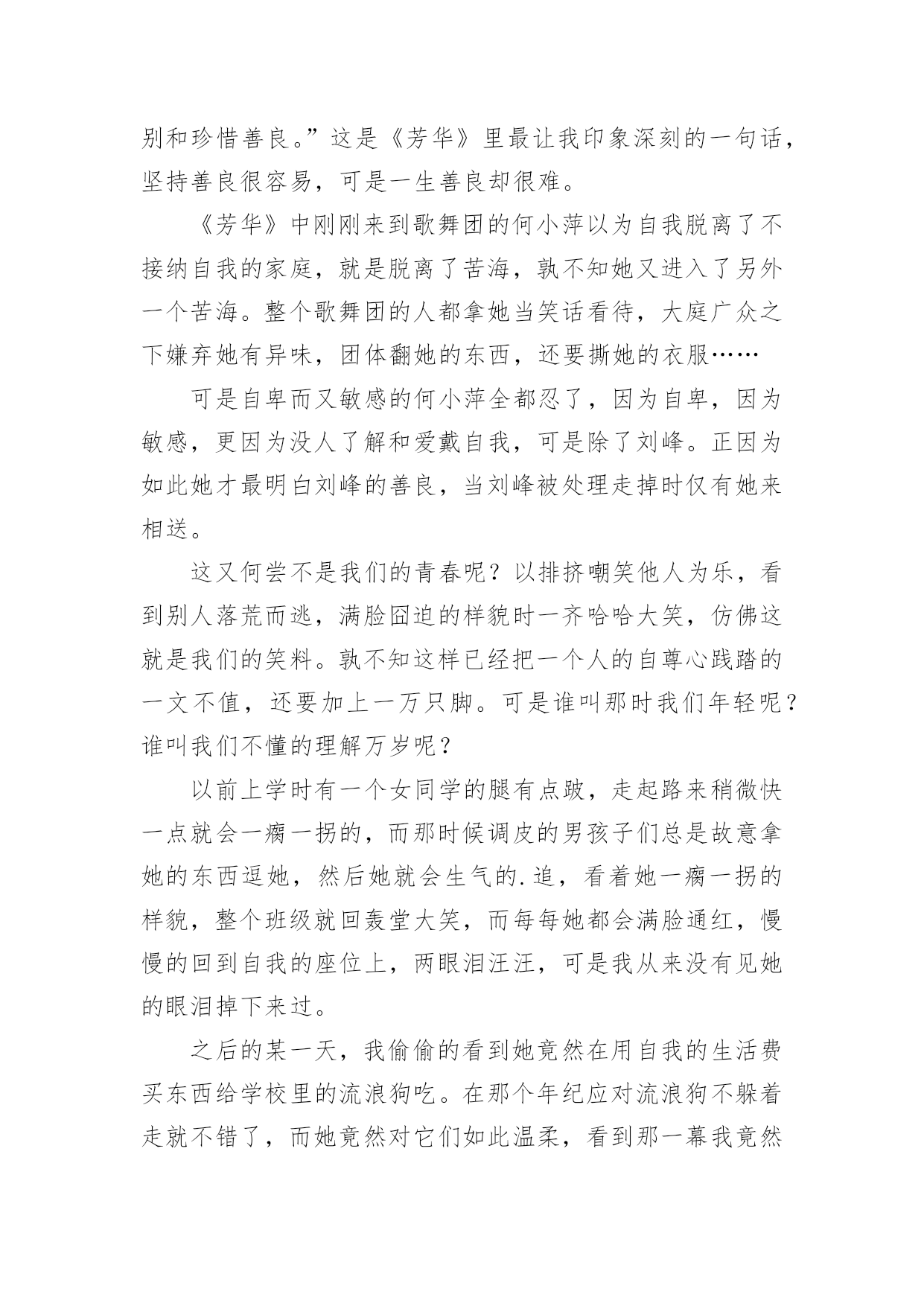 芳华400字观后感当观看完一部影视作品后,想必你有不少可以分享的东西,这时候最关键的观后感不能忘了。那么你会写观后感吗?下面是小编为大家收集的芳华400字观后感,供大家参考借鉴,希望可以帮助到有需要的朋友。芳华400字观后感1早就听说,今年有部大片讲述的是发生在我身边的故事,我带着无比自豪的心境和一位来自远方的朋友一齐观看了这部影片。出乎意料,我们没想到它真的如此精彩,如此感人,每个环节都扣人心弦,让我们泪流不止,就在影片结束的一霎那,我突然明白了:我们的学校为何如此芬芳?!舟曲是个美丽的地方,它就在咱甘肃,去年夏天我和爸爸妈妈还去过那里。清晨,沉浸在薄雾里的山村就像童话世界里的仙境一般迷人,但没想到这么美丽的地方曾遭受过泥石流。灾难吞没了一千多人的性命,也吞没了孩子们欢乐的家园,留下了遍地的创伤,但幸运的是,我们的国家又为他们重建了一个家园,那就是博飞中学,也就是我们兰州新区的舟曲中学,在那里他们遇到了可爱的江教师和周教师。影片主要讲述了四个被灾难笼罩着心灵,痛苦抑郁的大哥哥、大姐姐,如何在教师的拯救下重新开始生活、学习的故事。他们是:想要去见死去妹妹的多吉,认为害死了自我妈妈的井晓晓,不能正视没有爷爷这一现实的苗郎和不敢站立、一向坐在轮椅上的云草。灾难无情,人间有爱,在陌生的环境下,如果没人关注他们的心理疾病,没人在意他们的忧伤,可能故事就要重新被改写,但正是在周教师和江教师的全力营救下,才驱散了他们的心魔,他们的`心才慢慢向我们敞开,重新应对生活,并找到了生活的信心和学习的意义,经过努力学习和顽强拼搏,都成了拯救他人于灾难的战士。看完这部影片我才明白教师是多么辛苦的一份职业,他们就像周教师和江教师一样绞劲脑汁,全力以赴拯救每个孩子的灵魂,深怕一不留神就可能被魔鬼夺走生命,但我们还不如遭受过灾难的孤儿,并没有理解教师的良苦用心,贪玩、淘气,不听话。从今往后我要树立健康向上的学习信心,珍惜时间,努力学习,像祖国的花朵一样茁壮成长,让辛勤的园丁打理出一片片芬芳的土地来装扮我们的美丽的国家。芳华400字观后感2让枯萎的花朵,重新绽放;让破碎的心灵,得到温暖。为何芬芳?因何芬芳?鲜明的“芬芳”二字,将我带入这凄惨的故事之中。影片的开始,洪流侵蚀了整个舟曲县,吞噬了那一个个无辜的生命,也撕碎了不知多少少年对未来完美的憧憬。他们内心已被雾霾所笼盖,只是充斥着无尽的忧伤,因为他们失去了最至亲至爱的人。校车上,他们目光呆滞,他们回忆着以往。他们有些茫然,不知驶向何方。新的学校,新的家园,内心的空无,让他们更难以融入这个环境,更不愿理解现实。虽然伤痛会随着时间而愈合,可他们经历了的太多,似乎时间不是粘合剂,更是一种折磨,使他们更想了结这一切。一味的劝阻无济于事,只能用实际践行来抚慰他们创伤的心灵。低着头,只会看见自我的脚,而抬起头,却能看到整个世界。这些经历过灾难的'孩子,却一向觉得“自我很小,世界曾很大”。走不出阴影,就只会低头看脚下,解不开心魔,只是一只枯萎的花朵,永远无法绽放。教师为此,操碎了心。一次次的抚慰,一次次的交流,一次次的实践,一次次的鼓励,都有爱的影子。孩子们从阴影里走出来,从绝望里站起来,又开始变得开朗起来,活泼起来。对未来不是绝望,而是期望,并幻想着未来完美的蓝图。多年后,不曾想到,他们也参与到救灾的工作中,而初心,依旧未变。花朵,终究绽放,变得芬芳,美丽。自此,全剧终。影片虽不华丽,但却有着真情实感。默默无闻的教师,含苞待放的花朵,平凡而不平庸。我想说,教师不仅仅是人类灵魂的工程师,辛勤的园丁,更是人生歧途上的引路人,指引我们走向正轨,升华我们的心灵,让我们绽放出美丽,芬芳的花朵!人生总有坎坷,勇敢去应对,让枯萎的花朵,重新绽放!芳华400字观后感3“善良的人不必须都被善待,可是不被善待的人最能识别和珍惜善良。”这是《芳华》里最让我印象深刻的一句话,坚持善良很容易,可是一生善良却很难。《芳华》中刚刚来到歌舞团的何小萍以为自我脱离了不接纳自我的家庭,就是脱离了苦海,孰不知她又进入了另外一个苦海。整个歌舞团的人都拿她当笑话看待,大庭广众之下嫌弃她有异味,团体翻她的东西,还要撕她的衣服……可是自卑而又敏感的何小萍全都忍了,因为自卑,因为敏感,更因为没人了解和爱戴自我,可是除了刘峰。正因为如此她才最明白刘峰的善良,当刘峰被处理走掉时仅有她来相送。这又何尝不是我们的青春呢?以排挤嘲笑他人为乐,看到别人落荒而逃,满脸囧迫的样貌时一齐哈哈大笑,仿佛这就是我们的笑料。孰不知这样已经把一个人的自尊心践踏的一文不值,还要加上一万只脚。可是谁叫那时我们年轻呢?谁叫我们不懂的理解万岁呢?以前上学时有一个女同学的腿有点跛,走起路来稍微快一点就会一瘸一拐的,而那时候调皮的男孩子们总是故意拿她的东西逗她,然后她就会生气的.追,看着她一瘸一拐的