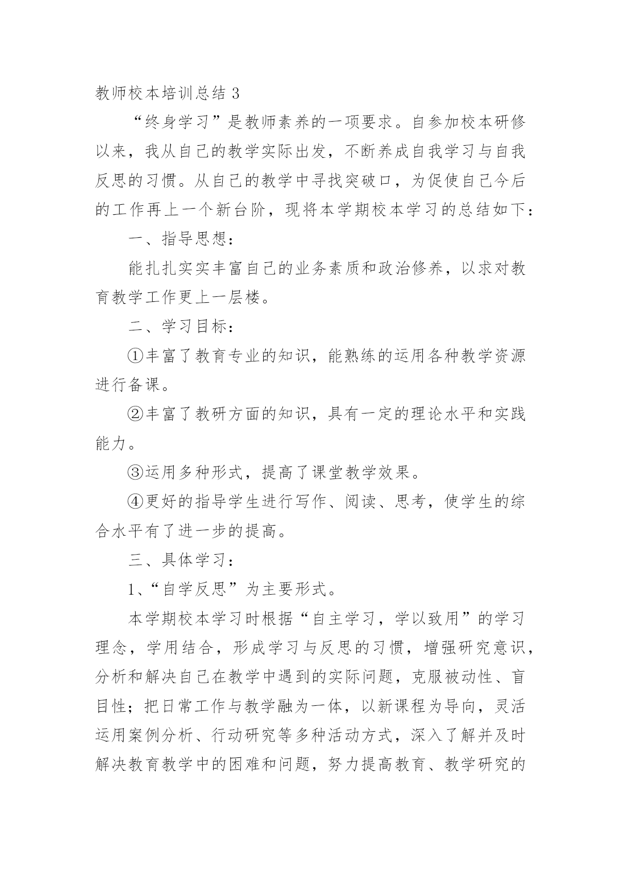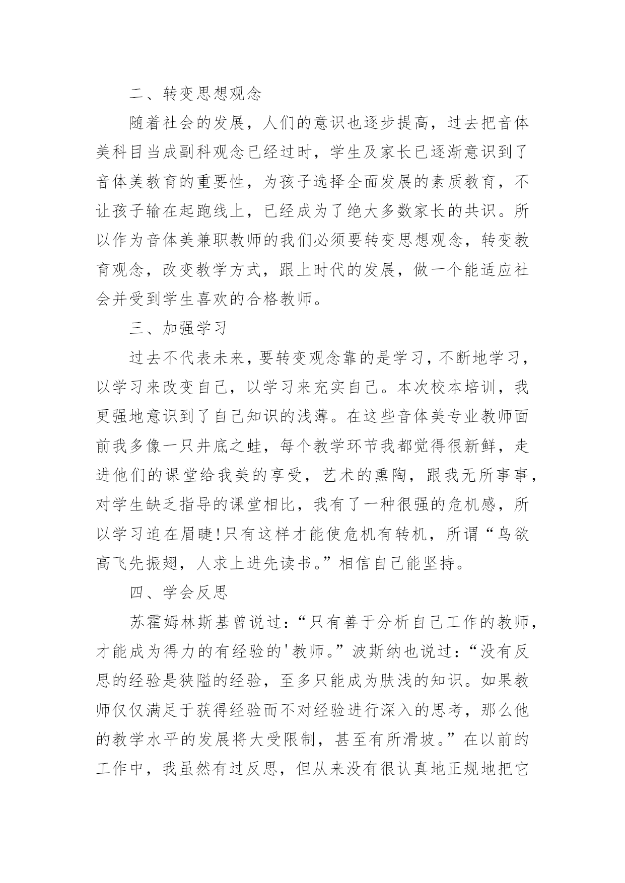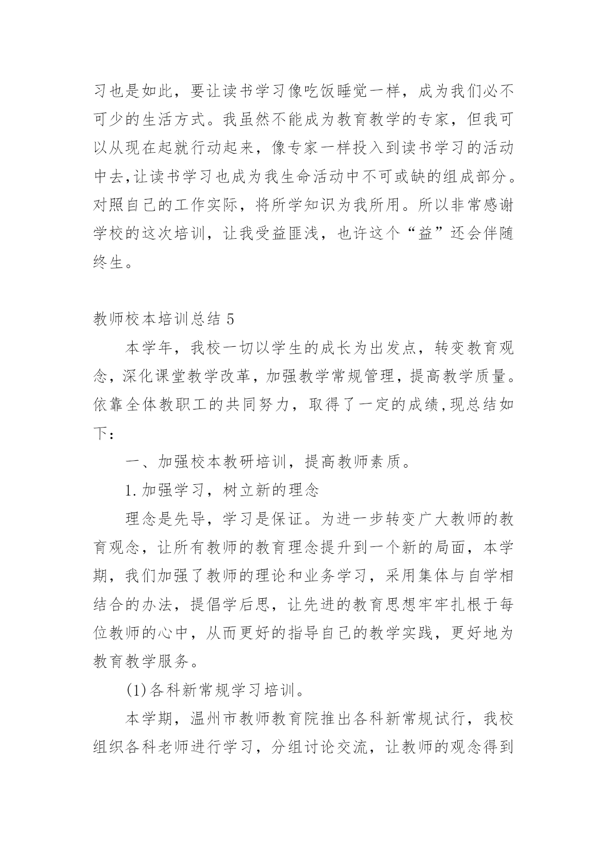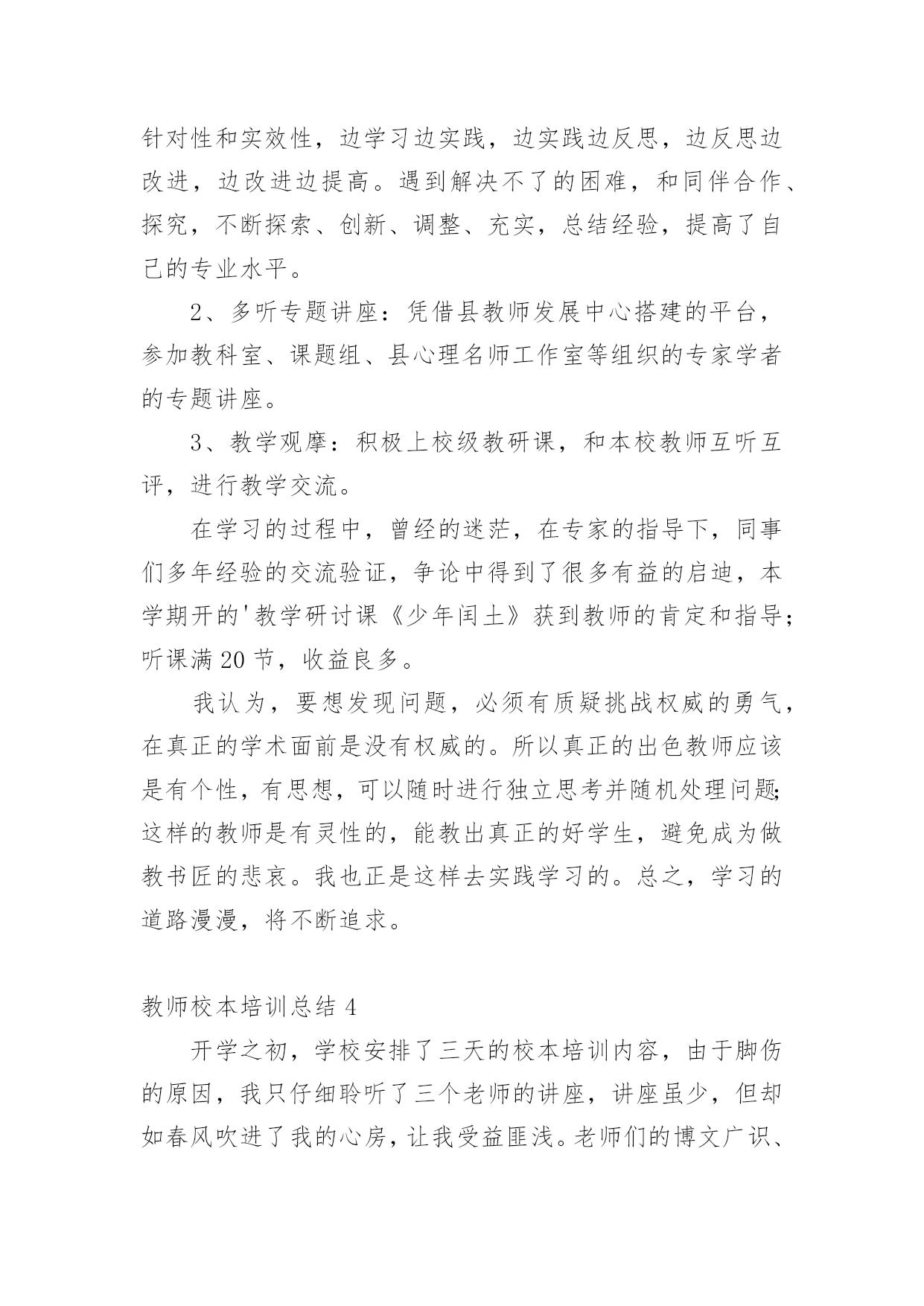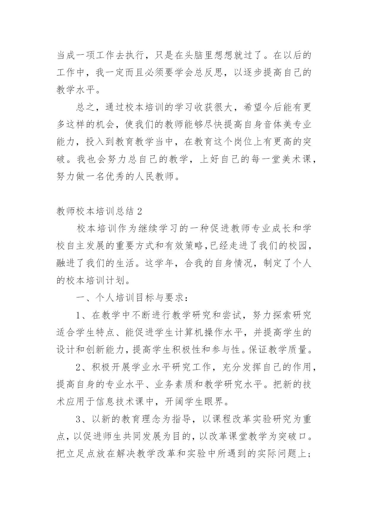 教师校本培训总结总结是指对某一阶段的工作、学习或思想中的经验或情况进行分析研究,做出带有规律性结论的书面材料,通过它可以全面地、系统地了解以往的学习和工作情况,不如立即行动起来写一份总结吧。你想知道总结怎么写吗?下面是小编帮大家整理的教师校本培训总结,欢迎大家分享。教师校本培训总结1回首刚刚走过的几天时间,是忙碌的、也是辛苦的,但与此同时我们也收获着、成长着、快乐着。本次音体美教师的校本培训了,我由衷觉得时间没白花,而且我感受到本次校本培训听课研讨活动是我急需要的最充实、最合理的一次,我受益匪浅。在此次听课研讨活动中每一节课都很精彩,在佩服音体美专业教师的专业水平同时,我更关注其授课方法。对我这名美术兼职教师来说,研讨示范课中值得我学习的东西很多很多,总起来有以下四点:一、在音体美专业教师的课堂中,我领悟到:不断的进步是以不断的学习为前提的。我个人很喜欢小学美术教学,当教学遇到困难的时候,需要有较高专业水平的教师给我指导,助我突破瓶颈。专业教师的示范课满足了我的需求。两天的听课研讨培训了,但我的学习并未,相反,以此为契机,它才刚刚开始。二、转变思想观念随着社会的发展,人们的意识也逐步提高,过去把音体美科目当成副科观念已经过时,学生及家长已逐渐意识到了音体美教育的重要性,为孩子选择全面发展的素质教育,不让孩子输在起跑线上,已经成为了绝大多数家长的共识。所以作为音体美兼职教师的我们必须要转变思想观念,转变教育观念,改变教学方式,跟上时代的发展,做一个能适应社会并受到学生喜欢的合格教师。三、加强学习过去不代表未来,要转变观念靠的是学习,不断地学习,以学习来改变自己,以学习来充实自己。本次校本培训,我更强地意识到了自己知识的浅薄。在这些音体美专业教师面前我多像一只井底之蛙,每个教学环节我都觉得很新鲜,走进他们的课堂给我美的享受,艺术的熏陶,跟我无所事事,对学生缺乏指导的课堂相比,我有了一种很强的危机感,所以学习迫在眉睫!只有这样才能使危机有转机,所谓“鸟欲高飞先振翅,人求上进先读书。”相信自己能坚持。四、学会反思苏霍姆林斯基曾说过:“只有善于分析自己工作的教师,才能成为得力的有经验的'教师。”波斯纳也说过:“没有反思的经验是狭隘的经验,至多只能成为肤浅的知识。如果教师仅仅满足于获得经验而不对经验进行深入的思考,那么他的教学水平的发展将大受限制,甚至有所滑坡。”在以前的工作中,我虽然有过反思,但从来没有很认真地正规地把它当成一项工作去执行,只是在头脑里想想就过了。在以后的工作中,我一定而且必须要学会总反思,以逐步提高自己的教学水平。总之,通过校本培训的学习收获很大,希望今后能有更多这样的机会,使我们的教师能够尽快提高自身音体美专业能力,投入到教育教学当中,在教育这个岗位上有更高的突破。我也会努力总自己的教学,上好自己的每一堂美术课,努力做一名优秀的人民教师。教师校本培训总结2校本培训作为继续学习的一种促进教师专业成长和学校自主发展的重要方式和有效策略,已经走进了我们的校园,融进了我们的生活。这学年,合我的自身情况,制定了个人的校本培训计划。一、个人培训目标与要求:1、在教学中不断进行教学研究和尝试,努力探索研究适合学生特点、能促进学生计算机操作水平,并提高学生的设计和创新能力,提高学生积极性和参与性。保证教学质量。2、积极开展学业水平研究工作,充分发挥自己的作用,提高自身的专业水平、业务素质和教学研究水平。把新的技术应用于信息技术课中,开阔学生眼界。3、以新的教育理念为指导,以课程改革实验研究为重点,以促进师生共同发展为目的,以改革课堂教学为突破口。把立足点放在解决教学改革和实验中所遇到的实际问题上;着眼点放在理论与实践的合上;切入点放在教师教学方式和学生学习方式的转变上。二、个人培训的具体措施:1、注重日常教学常规的`扎实与提升。认真完成教学任务,做好每一次听课后记录。学会思考教育问题,积极把先进的教育理念转化为自身教学的行为,从反思中提升教学研究水平。每节公开课后,把自己在教学实践中发现的问题和有价值的东西赶快记下来,享受成功,弥补不足。在总经验中完善自我。找到不同阶段学生的优点和兴趣点,挖掘更多的学生作为带头人。2、坚持写好教育教学随笔。平时多阅读优秀的教育名著,学习先进的教育理念,以他们的例子来激励自己,多观察、多总,从学生实际来总提高,积极撰写教育论文,努力让自己成为一名知识型教师。3、树立现代学生观,学会以发展的眼光看待每一个学生。相信学生的巨大潜能,并努力去探索发掘;在教育教学活动中发扬学生的主体精神,促进学生的主体发展,努力做到因材施教。4、利用信息技术手段辅助教学,充分利用网络优势,积极参与在线研讨。总之,我会不断学习,不断更新,丰富自己的文化积淀,充盈自己的底气,增强自己的理论底蕴,提高教育教学能力,合教学实际,