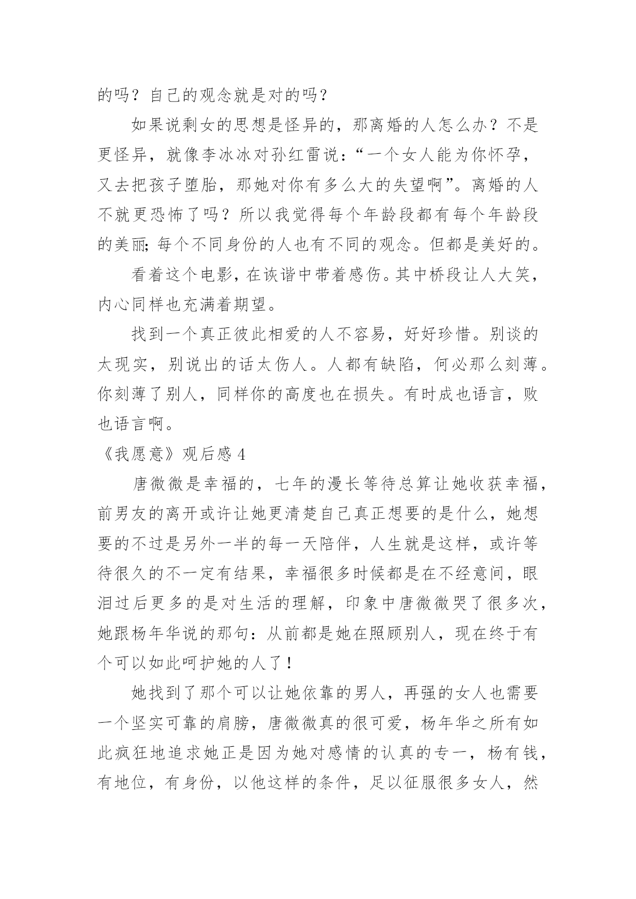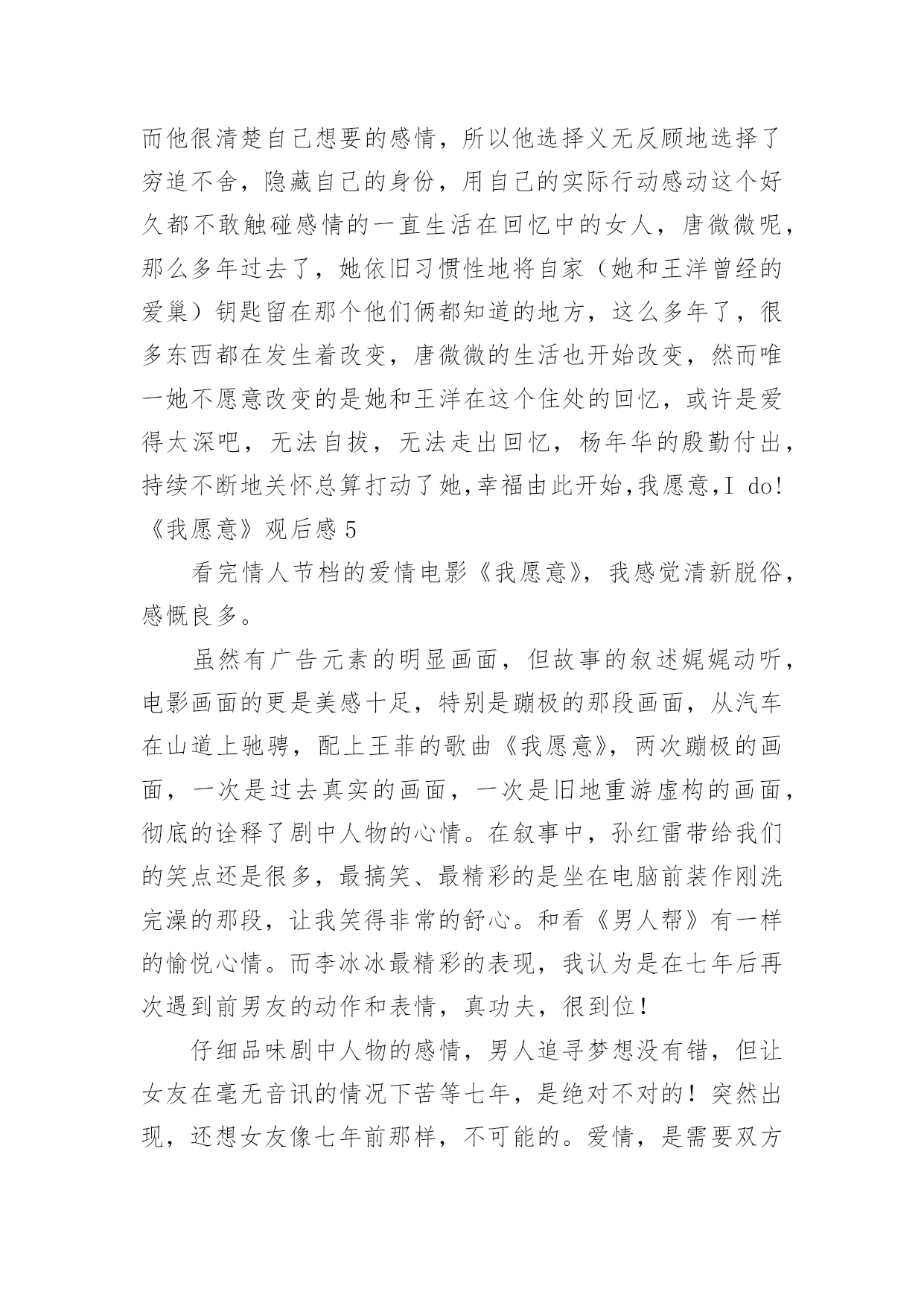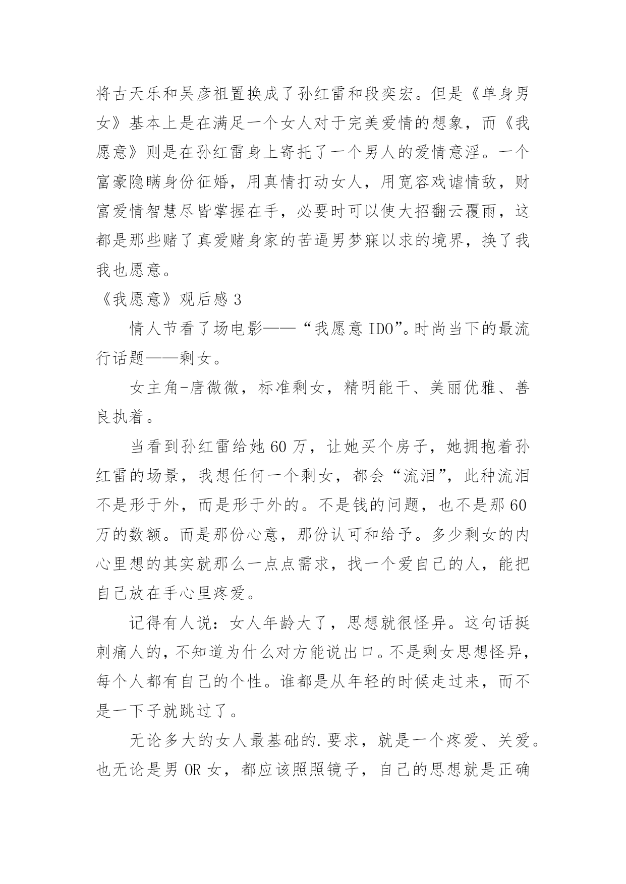 《我愿意》观后感《我愿意》观后感看完一部作品以后,相信你一定有很多值得分享的收获,这时候,最关键的观后感怎么能落下!可是观后感怎么写才合适呢?以下是小编为大家收集的《我愿意》观后感,希望对大家有所帮助。《我愿意》观后感1看完微电影《我愿意》后我觉得这其中有一点是可以学习的,但是也有一点是不值得学习的。可以学习的就是:趁年轻去做想做的事情吧!不该学习的就是:不能打着还年轻的招牌肆无忌惮的玩。这部电影的主要目的是告诉年轻人:趁自己年轻去做自己想做的事情吧!这部电影说的是一对也可以说是一群即将面临毕业的大学生情侣们所面临的问题。其实这也是现实中在这个即将毕业的五月的我们所面临的一个问题。那就是你是会选择两个人在一起紧衣缩食的生活还是选择面对残酷的现实选择分手。这部电影中的主人公是两个即将面临毕业的大学情侣,男主人公叫大宇,女主人公叫小糖。在即将面临毕业的时候,他们的感情也在发生着微妙的变化,男主人公想的最多的就是怎样能尽快找到一份工作赚钱养活自己的女朋友,怎么实现自己制定的五年计划,也就是能娶到自己的女朋友并给与她想要的生活。女主人公可能没有像男主人公那样有远大的志向,她想的更多的是他们能不能继续在一起。看到学校里一对对的情侣们都分手了,他们在各自的忧虑着,他们会不会分手?毕业了即将走出校门,男主人公开始为他们将来的生活忧虑了。但是作为女主人公的小糖就觉得自己的男朋友只顾着去面试找工作而忽视了她,她觉得他不在乎她了。这可能就是导致毕业分手的重要原因吧。《我愿意》观后感2今天周末,看了场电影。这部《我愿意IDo》,细细品味之后,真的让我感慨很多。唐微微像一块和氏璧,包在石头最里面。整个电影有搞笑的情节,但是结局过于仓促了点吧!很不错的追爱宝典影视,但是植入的广告多了些,似乎有些为过,在情人节档看这个电影确实还不错,有哭也有乐,有真也有骗。总之结局还是皆大欢喜的。《我愿意IDo》爱你没有原因、没有条件、没有期限、没有距离,只需要有你一颗永远不变的心!谁都渴望爱情里有这样一个人,在他心里,知道我。逞强和脆弱,给我需要的呵护和安慰,清楚我所有的缺点,然后用温暖细腻的爱来包容。表演有戏,情绪到位,精彩有趣,李冰冰,孙红雷发挥出彩。《我愿意》上映之前一直延续的是“剩女”问题,但这个剩女并不是意义上的剩女,而是被一段不靠谱的感情给耽误了。其实在我看来这是一个内地版的《单身男女》,只是将古天乐和吴彦祖置换成了孙红雷和段奕宏。但是《单身男女》基本上是在满足一个女人对于完美爱情的想象,而《我愿意》则是在孙红雷身上寄托了一个男人的爱情意淫。一个富豪隐瞒身份征婚,用真情打动女人,用宽容戏谑情敌,财富爱情智慧尽皆掌握在手,必要时可以使大招翻云覆雨,这都是那些赌了真爱赌身家的苦逼男梦寐以求的境界,换了我我也愿意。《我愿意》观后感3情人节看了场电影——“我愿意IDO”。时尚当下的最流行话题——剩女。女主角-唐微微,标准剩女,精明能干、美丽优雅、善良执着。当看到孙红雷给她60万,让她买个房子,她拥抱着孙红雷的场景,我想任何一个剩女,都会“流泪”,此种流泪不是形于外,而是形于外的。不是钱的问题,也不是那60万的数额。而是那份心意,那份认可和给予。多少剩女的内心里想的其实就那么一点点需求,找一个爱自己的人,能把自己放在手心里疼爱。记得有人说:女人年龄大了,思想就很怪异。这句话挺刺痛人的,不知道为什么对方能说出口。不是剩女思想怪异,每个人都有自己的个性。谁都是从年轻的时候走过来,而不是一下子就跳过了。无论多大的女人最基础的.要求,就是一个疼爱、关爱。也无论是男OR女,都应该照照镜子,自己的思想就是正确的吗?自己的观念就是对的吗?如果说剩女的思想是怪异的,那离婚的人怎么办?不是更怪异,就像李冰冰对孙红雷说:“一个女人能为你怀孕,又去把孩子堕胎,那她对你有多么大的失望啊”。离婚的人不就更恐怖了吗?所以我觉得每个年龄段都有每个年龄段的美丽;每个不同身份的人也有不同的观念。但都是美好的。看着这个电影,在诙谐中带着感伤。其中桥段让人大笑,内心同样也充满着期望。找到一个真正彼此相爱的人不容易,好好珍惜。别谈的太现实,别说出的话太伤人。人都有缺陷,何必那么刻薄。你刻薄了别人,同样你的高度也在损失。有时成也语言,败也语言啊。《我愿意》观后感4唐微微是幸福的,七年的漫长等待总算让她收获幸福,前男友的离开或许让她更清楚自己真正想要的是什么,她想要的不过是另外一半的每一天陪伴,人生就是这样,或许等待很久的不一定有结果,幸福很多时候都是在不经意间,眼泪过后更多的是对生活的理解,印象中唐微微哭了很多次,她跟杨年华说的那句:从前都是她在照顾别人,现在终于有个可以如此呵护她的人了!她找到了那个可以让她依靠的男人,再强的女人也需要一个坚实可靠的肩膀,唐微微真的很可爱,杨年华之所有如此疯狂地追求她正
