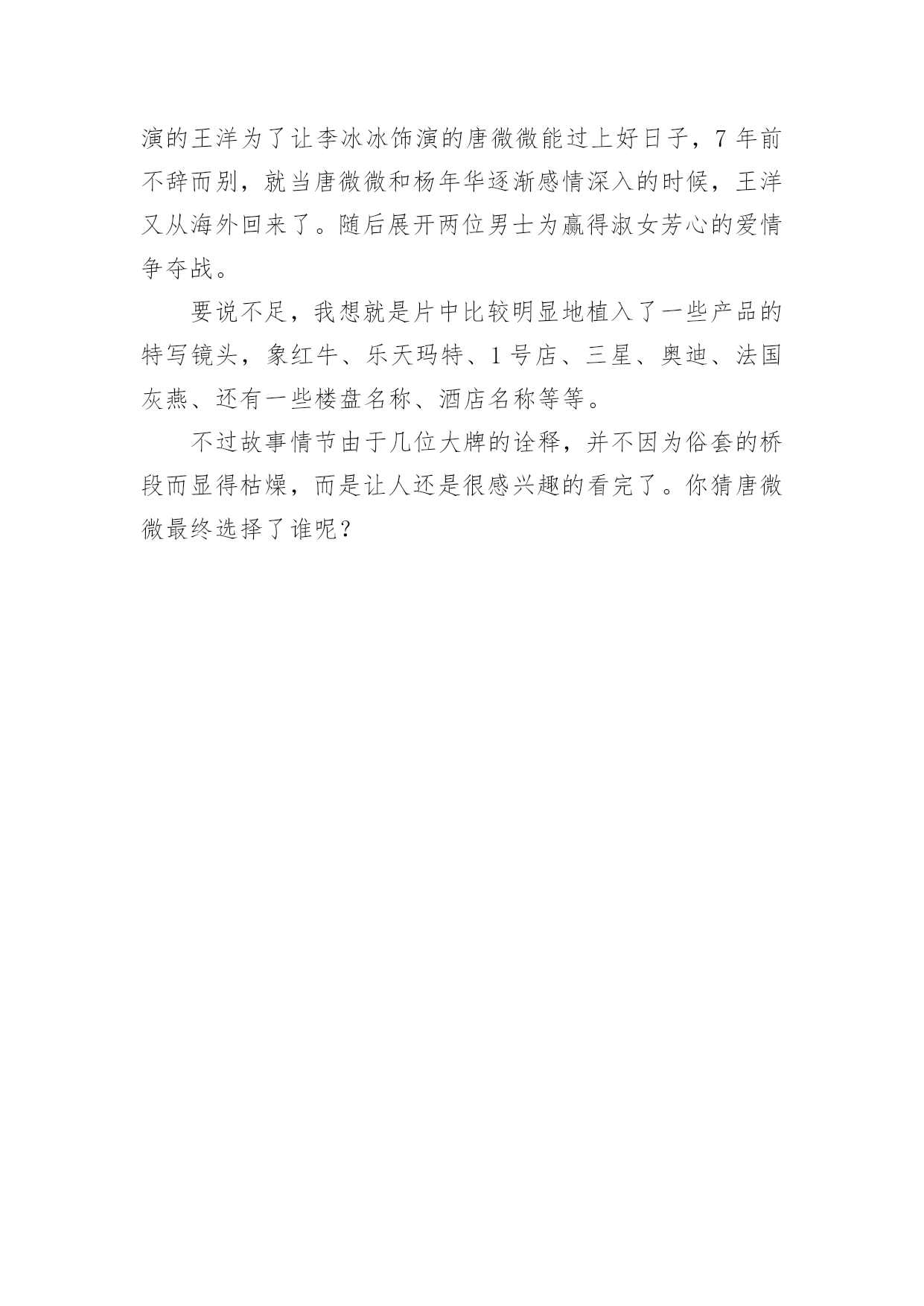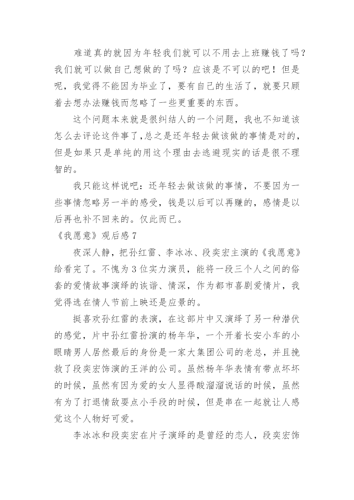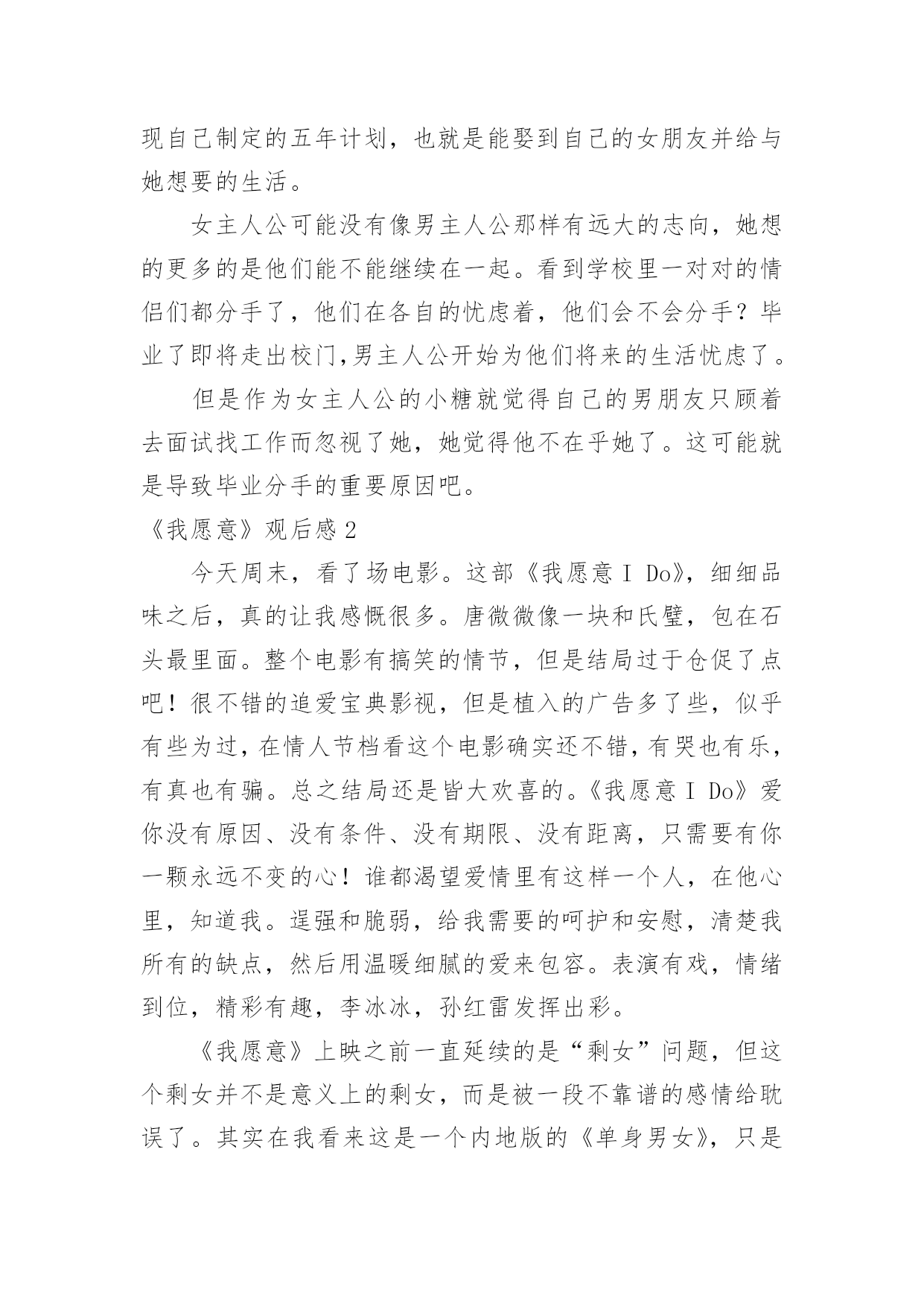 《我愿意》观后感《我愿意》观后感看完一部作品以后,相信你一定有很多值得分享的收获,这时候,最关键的观后感怎么能落下!可是观后感怎么写才合适呢?以下是小编为大家收集的《我愿意》观后感,希望对大家有所帮助。《我愿意》观后感1看完微电影《我愿意》后我觉得这其中有一点是可以学习的,但是也有一点是不值得学习的。可以学习的就是:趁年轻去做想做的事情吧!不该学习的就是:不能打着还年轻的招牌肆无忌惮的玩。这部电影的主要目的是告诉年轻人:趁自己年轻去做自己想做的事情吧!这部电影说的是一对也可以说是一群即将面临毕业的大学生情侣们所面临的问题。其实这也是现实中在这个即将毕业的五月的我们所面临的一个问题。那就是你是会选择两个人在一起紧衣缩食的生活还是选择面对残酷的现实选择分手。这部电影中的主人公是两个即将面临毕业的大学情侣,男主人公叫大宇,女主人公叫小糖。在即将面临毕业的时候,他们的感情也在发生着微妙的变化,男主人公想的最多的就是怎样能尽快找到一份工作赚钱养活自己的女朋友,怎么实现自己制定的五年计划,也就是能娶到自己的女朋友并给与她想要的生活。女主人公可能没有像男主人公那样有远大的志向,她想的更多的是他们能不能继续在一起。看到学校里一对对的情侣们都分手了,他们在各自的忧虑着,他们会不会分手?毕业了即将走出校门,男主人公开始为他们将来的生活忧虑了。但是作为女主人公的小糖就觉得自己的男朋友只顾着去面试找工作而忽视了她,她觉得他不在乎她了。这可能就是导致毕业分手的重要原因吧。《我愿意》观后感2今天周末,看了场电影。这部《我愿意IDo》,细细品味之后,真的让我感慨很多。唐微微像一块和氏璧,包在石头最里面。整个电影有搞笑的情节,但是结局过于仓促了点吧!很不错的追爱宝典影视,但是植入的广告多了些,似乎有些为过,在情人节档看这个电影确实还不错,有哭也有乐,有真也有骗。总之结局还是皆大欢喜的。《我愿意IDo》爱你没有原因、没有条件、没有期限、没有距离,只需要有你一颗永远不变的心!谁都渴望爱情里有这样一个人,在他心里,知道我。逞强和脆弱,给我需要的呵护和安慰,清楚我所有的缺点,然后用温暖细腻的爱来包容。表演有戏,情绪到位,精彩有趣,李冰冰,孙红雷发挥出彩。《我愿意》上映之前一直延续的是“剩女”问题,但这个剩女并不是意义上的剩女,而是被一段不靠谱的感情给耽误了。其实在我看来这是一个内地版的《单身男女》,只是将古天乐和吴彦祖置换成了孙红雷和段奕宏。但是《单身男女》基本上是在满足一个女人对于完美爱情的想象,而《我愿意》则是在孙红雷身上寄托了一个男人的爱情意淫。一个富豪隐瞒身份征婚,用真情打动女人,用宽容戏谑情敌,财富爱情智慧尽皆掌握在手,必要时可以使大招翻云覆雨,这都是那些赌了真爱赌身家的苦逼男梦寐以求的境界,换了我我也愿意。《我愿意》观后感3情人节看了场电影——“我愿意IDO”。时尚当下的最流行话题——剩女。女主角-唐微微,标准剩女,精明能干、美丽优雅、善良执着。当看到孙红雷给她60万,让她买个房子,她拥抱着孙红雷的场景,我想任何一个剩女,都会“流泪”,此种流泪不是形于外,而是形于外的。不是钱的问题,也不是那60万的数额。而是那份心意,那份认可和给予。多少剩女的内心里想的其实就那么一点点需求,找一个爱自己的人,能把自己放在手心里疼爱。记得有人说:女人年龄大了,思想就很怪异。这句话挺刺痛人的,不知道为什么对方能说出口。不是剩女思想怪异,每个人都有自己的个性。谁都是从年轻的时候走过来,而不是一下子就跳过了。无论多大的女人最基础的.要求,就是一个疼爱、关爱。也无论是男OR女,都应该照照镜子,自己的思想就是正确的吗?自己的观念就是对的吗?如果说剩女的思想是怪异的,那离婚的人怎么办?不是更怪异,就像李冰冰对孙红雷说:“一个女人能为你怀孕,又去把孩子堕胎,那她对你有多么大的失望啊”。离婚的人不就更恐怖了吗?所以我觉得每个年龄段都有每个年龄段的美丽;每个不同身份的人也有不同的观念。但都是美好的。看着这个电影,在诙谐中带着感伤。其中桥段让人大笑,内心同样也充满着期望。找到一个真正彼此相爱的人不容易,好好珍惜。别谈的太现实,别说出的话太伤人。人都有缺陷,何必那么刻薄。你刻薄了别人,同样你的高度也在损失。有时成也语言,败也语言啊。《我愿意》观后感4唐微微是幸福的,七年的漫长等待总算让她收获幸福,前男友的离开或许让她更清楚自己真正想要的是什么,她想要的不过是另外一半的每一天陪伴,人生就是这样,或许等待很久的不一定有结果,幸福很多时候都是在不经意间,眼泪过后更多的是对生活的理解,印象中唐微微哭了很多次,她跟杨年华说的那句:从前都是她在照顾别人,现在终于有个可以如此呵护她的人了!她找到了那个可以让她依靠的男人,再强的女人也需要一个坚实可靠的肩膀,唐微微真的很可爱,杨年华之所有如此疯狂地追求她正