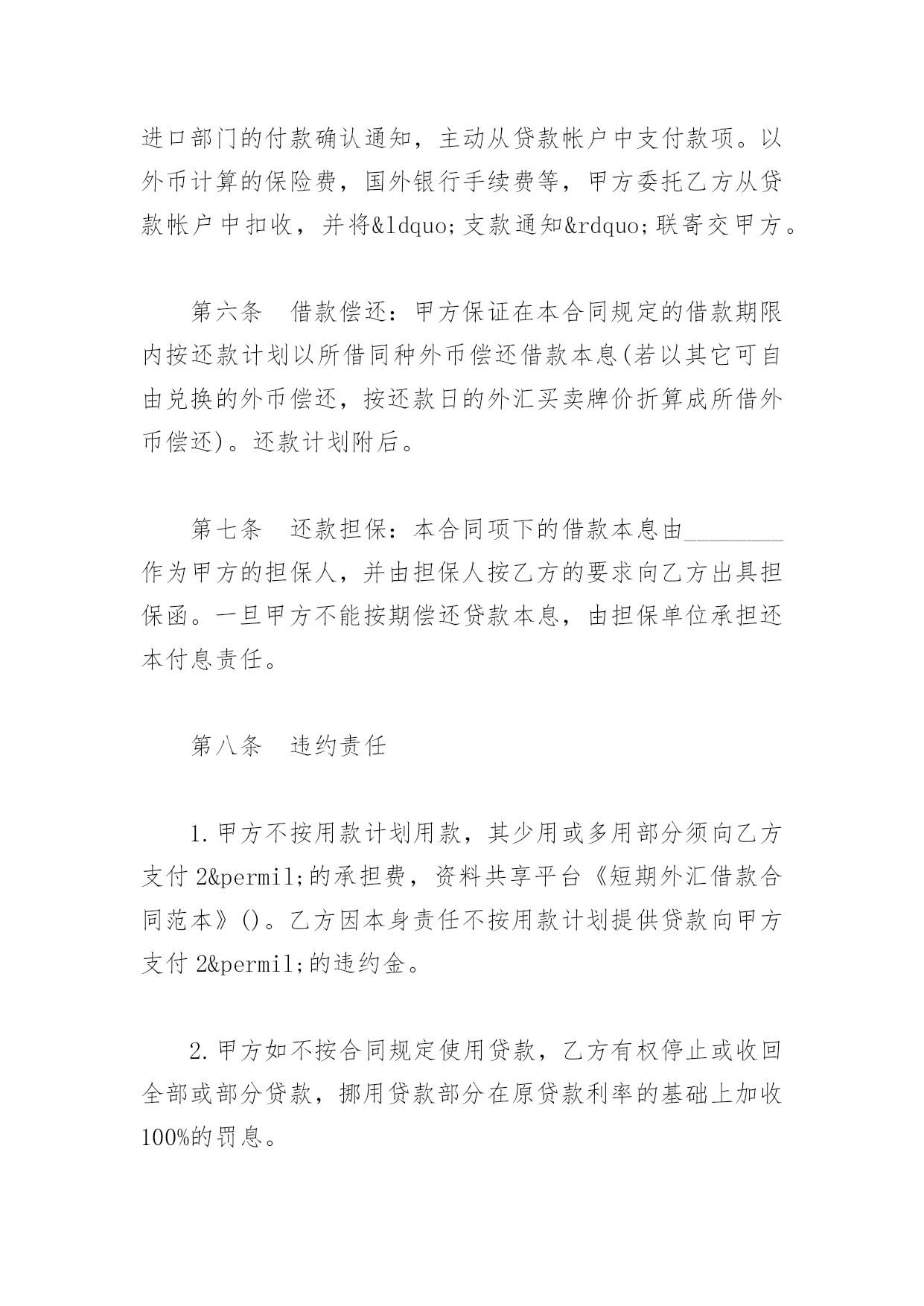 短期外汇借款合同短期外汇借款合同范本本站合同范本频道介绍下借款合同 第一条借款金额:外汇贷款(大写)________________美元,短期外汇借款合同范本。第二条借款用途:外汇贷款用于________________________________________第三条借款期限:本期贷款从_______年______月______日起至_______年______月______日甲方还清乙方全部贷款本息止。第四条借款利率:本期贷款年利率为________%,乙方按季计收利息,如甲方不能按期付息,则转入贷款本金计收复息。在合同履行期间,如遇国家调整利率或变更计息办法,按国家规定执行。第五条借款使用:本合同签订后,甲方须向乙方提供订货卡片对外采购合同作为付款依据。甲方授权乙方凭有关进口部门的付款确认通知,主动从贷款帐户中支付款项。以外币计算的保险费,国外银行手续费等,甲方委托乙方从贷款帐户中扣收,并将“支款通知”联寄交甲方。第六条借款偿还:甲方保证在本合同规定的借款期限内按还款计划以所借同种外币偿还借款本息(若以其它可自由兑换的外币偿还,按还款日的外汇买卖牌价折算成所借外币偿还)。还款计划附后。第七条还款担保:本合同项下的借款本息由________作为甲方的担保人,并由担保人按乙方的要求向乙方出具担保函。一旦甲方不能按期偿还贷款本息,由担保单位承担还本付息责任。第八条违约责任1.甲方不按用款计划用款,其少用或多用部分须向乙方支付2‰的承担费,资料共享平台《短期外汇借款合同范本》()。乙方因本身责任不按用款计划提供贷款向甲方支付2‰的违约金。2.甲方如不按合同规定使用贷款,乙方有权停止或收回全部或部分贷款,挪用贷款部分在原贷款利率的基础上加收100%的罚息。3.如因不可抗力的原因,甲方不能在贷款期限终止日全部还清本息,应在到期日十天前向乙方提出展期申请。经乙方同意,双方共同修改合同的原借款期限,并重新确定相应的贷款利率。甲方未经乙方同意不按期归还的贷款,乙方有权从甲方在任何银行开立的帐户内扣收,并从过期之日起,对逾期贷款部分按借款利率加收30%的利息。第九条其它规定1.发生下列情况之一时,乙方有权停止发放贷款并立即或限期收回已经发放的贷款。(1)甲方向乙方提供的情况、报表和各项资料不真实;(2)甲方与第三者发生诉讼,经法院判决败诉,偿付赔偿金后,无力向乙方偿付贷款本息;(3)甲方的资产总额不足抵偿其负债总额;(4)甲方的保证人违反或失去保证书中规定的条件。2.乙方有权检查、监督贷款的使用情况,甲方应向乙方提供有关报表和资料。3.甲方或乙方任何一方要求变更合同或本合同中的某一项条款,须在事前以书面形式通知对方,在双方达成协议前,本合同中的各项条款仍然有效。4.甲方提供的借款申请书、工贸合同(或协议)、用款和还款计划及与合同有关的其它书面材料,均作为本合同的组成部分,与本合同具有同等法律效力。5.本合同一式________份,经借贷双方和法定代表或法定代表授权的签字人共同盖章后生效。贷款方:______________________________借款方:________________