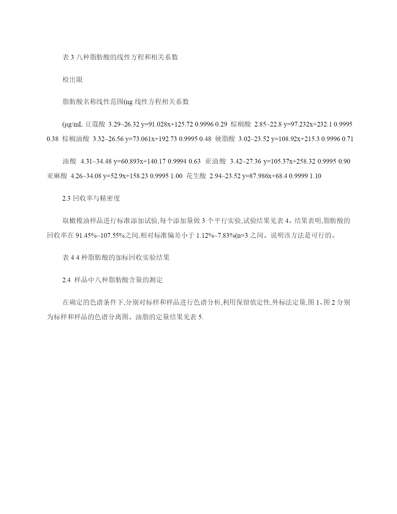 油脂市场维持区间振荡格局(完整版)实用资料(可以直接使用,可编辑完整版实用资料,欢迎下载)油脂市场维持区间振荡格局(4月12日—4月16日)一.市场综述:1.CBOT美豆油指数连续:受国际原油小幅调整,本周美豆油基本跟随原油冲高小幅回落振荡,周收盘以小阴线报收,总体来看油脂市场短线将继续跟随周边市场原油市场而动,但总体基本面偏空仍对期价上行构成压力,中线将维持区间振荡的格局。2.连豆油指数连续:本周高开低走,本周收盘以小阴线报收,对目前国内通货膨胀的预期增加,限制豆油下行空间,料中线仍将维持区间振荡行情。二,行情:(4月12日—4月16日)CBOT美豆油连续:开盘最高最低收盘涨/跌持仓持仓增减美豆油指数40.5740.8639.8840.37-0.14289400-11341(单位:美分/磅,持仓:手)美盘豆油本周振荡稳和调整,短期内季度和月度报告利空基本被市场消化,但原油市场本周高位回落对期价形成压制,总体基本面偏空仍对期价上行构成压力,因此中线期价将维持区间振荡的格局。2,国内油脂市场:库存情况:库存情况:本周豆油库存本周增加414手,目前为932手。菜籽油库存也维持不变,目前为191手,但有效预报仍为4244手。国内油脂类行情:(4月12日—4月16日)品种开盘最高最低收盘涨跌持仓持仓增减连豆油指数7804780976927768+2632744-11578连棕榈油指7017704369236977-9280734+6166菜籽油指数8266827481958223+2124174+4766(注:单位:元/吨持仓:手)连豆油本周基本跟随美豆油小幅减仓调整,前期连豆油和其他油脂产品比价有所反弹。现货本周各地涨幅都保持在前周水平,总体来看中期国内油脂产品维持区间振荡的格局。国内其他油脂产品本周也波澜不惊,总体呈增仓微涨态势,料后市国内油脂短期将维持区间振荡格局。平均基差505点平均基差1115点平均基差1620点从上面3个油脂基差图可以看到,目前强弱次序是豆油>菜油>棕榈油;由于近现货市场也较为平稳,同时缺少资金参与,因此行情较为被动,盘面表现抗涨抗跌,总体菜油价格较稳定;而近期连棕榈油则受到马棕榈油横盘振荡影响,成为弱势品种,中短期内连棕榈油将维持弱势地位,而连豆油则受到前期和其他油脂产品比价偏低以及油厂力挺油价的销售策略影响,走势偏强。操作建议:豆油:维持振荡,前期与其他油脂产品比价偏低,近期有所恢复,建议低位多单逢高减持。棕榈油:受马盘弱势振荡影响,与豆油比价基本恢复,本周小幅增仓振荡,总体维持弱势振荡格局,建议买豆油抛棕榈油套利单可适量减持。菜籽油:短期受现货稳定和缺少资金参与影响,盘面表现较为抗跌,建议:短线日内交易。目前A股以及外汇亚洲盘变化对商品市场日内盘面人气影响较大,提请投资者关注。中航期货021*54101618研发部俞奕军油脂中八种脂肪酸的分析测定黄龙娣1,郑建明2,姚维武3,张丹青4(江苏天瑞仪器股份,江苏昆山215300摘要:油脂经氢氧化钾-甲醇溶液甲酯化后,生成的脂肪酸甲酯用DB-WAX毛细管柱进行分离,GC-FID进行检测。该方法的回收率在91.45%~112.53%,相对标准偏差小于8%,八种脂肪酸的检出限在0.29μg/mL~1.10μg/mL之间。本方法准确度高,检出限低,能满足实际检测工作的需要。关键词:脂肪酸;气相色谱法;油脂Determinationof8kindsoffattyacidsinoilsHUANGLong-di1,ZHENGJian-ming2,YAOWei-wu3,ZHANGDan-qing4(JiangsuSkyrayInstrumentCo.,Ltd.,JiangsuKunshan,215300Abstract:Amethodforthedeterminationof8kindsoffattyacidsinoilsbyGC-FIDwasdeveloped.Fattyacidsweremethylatedtofattyacidmethylethers(FAMEsbyKOHinmethanol.FAMEswerequantitivelymeasuredbyDB-WAXcapillarygaschromatography.Therecoveriesoffattyacidsrangedfrom91.45%~112.53%withrelativestandarddeviationslessthan8%,andthedetectionlimitswereintherangeof0.29μg/mL~1.10μg/mL.Withthehighaccurateandlow