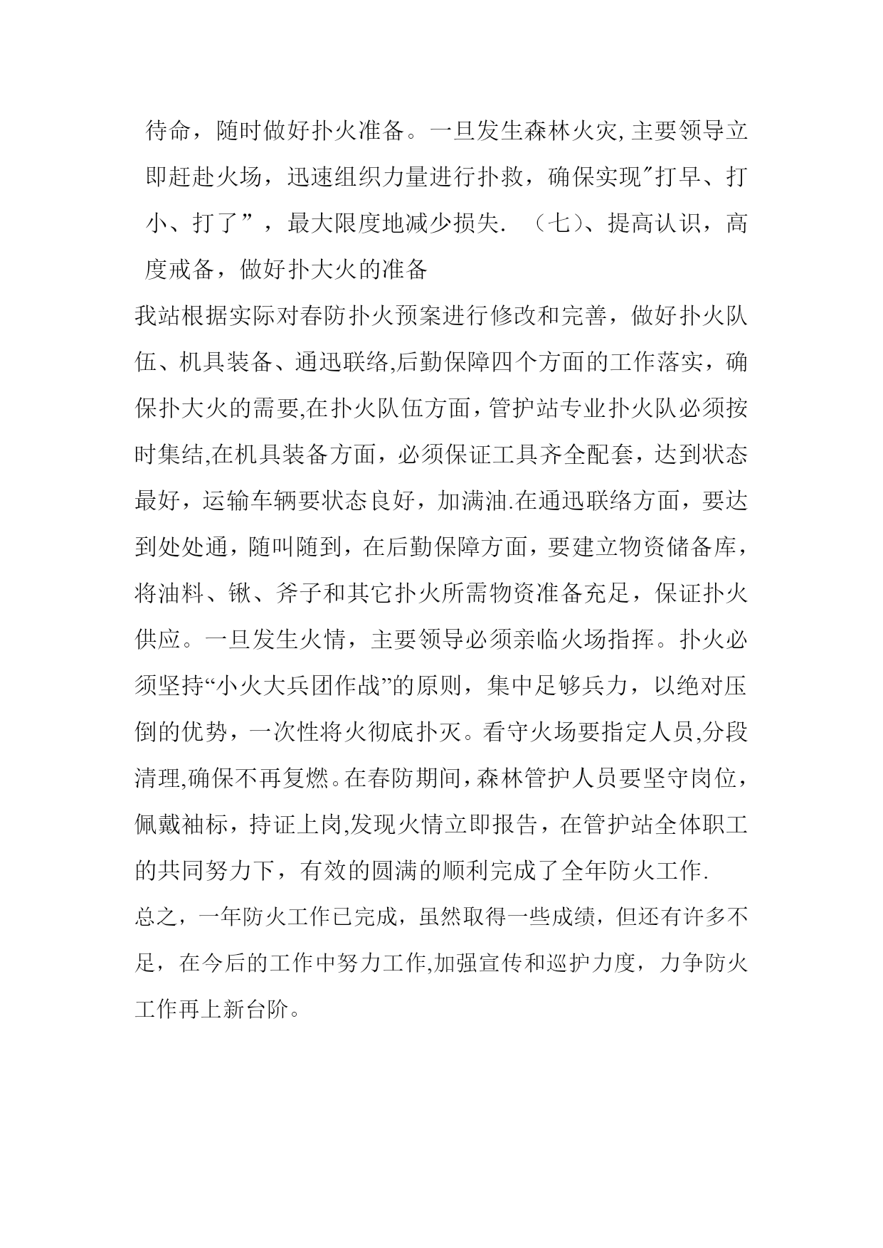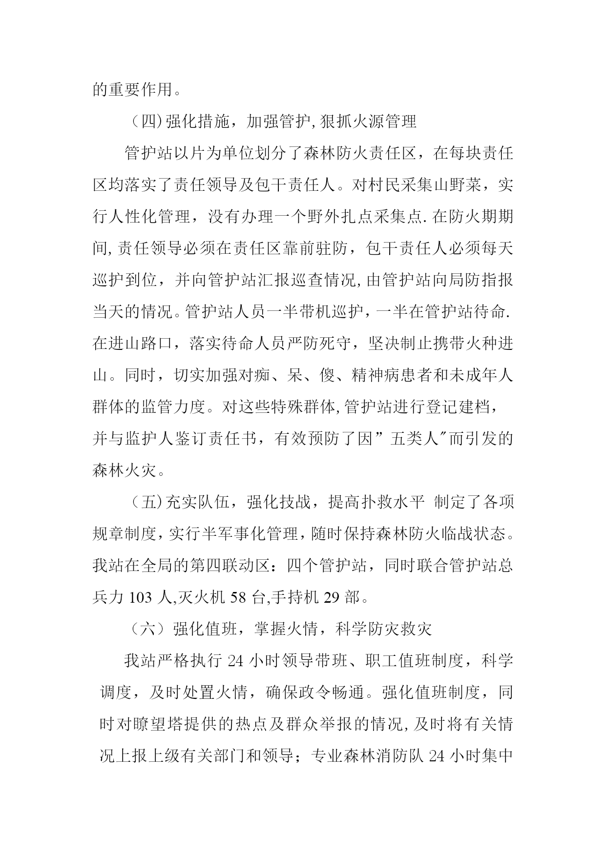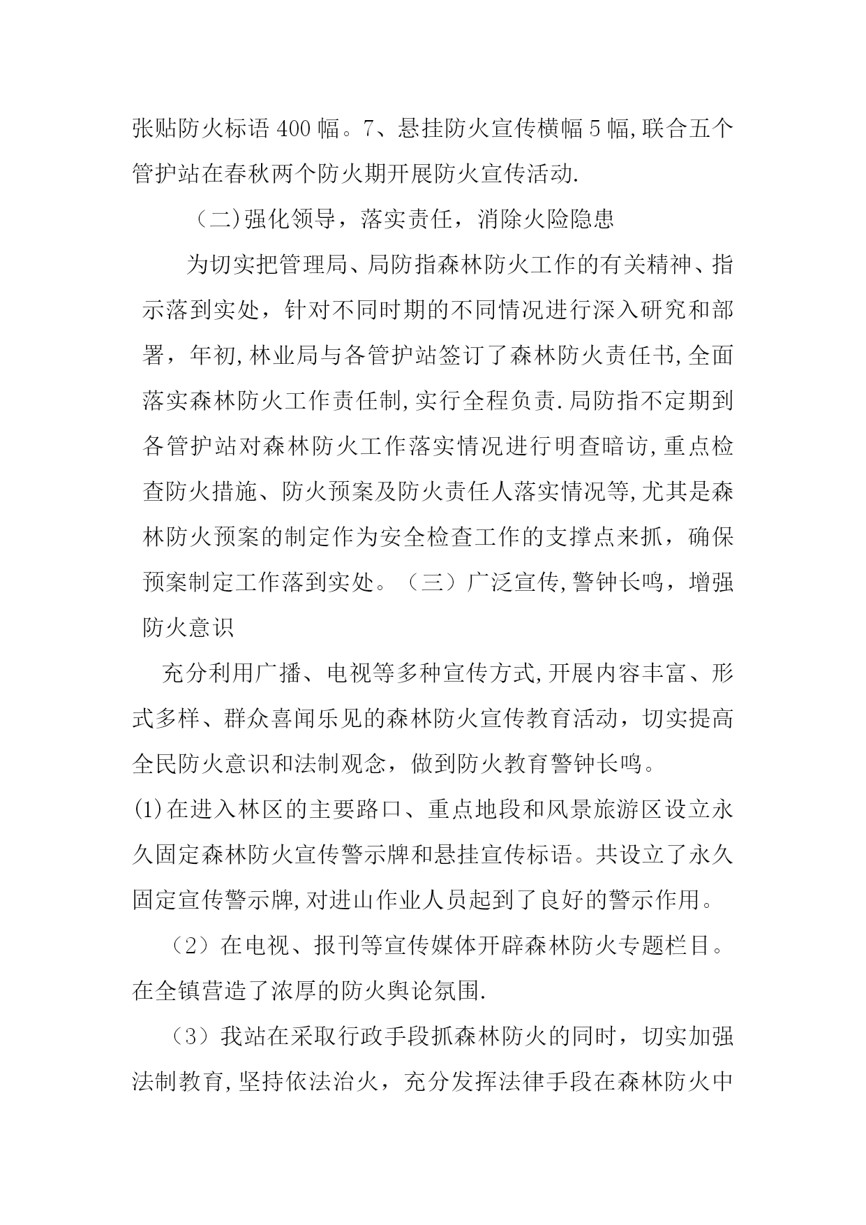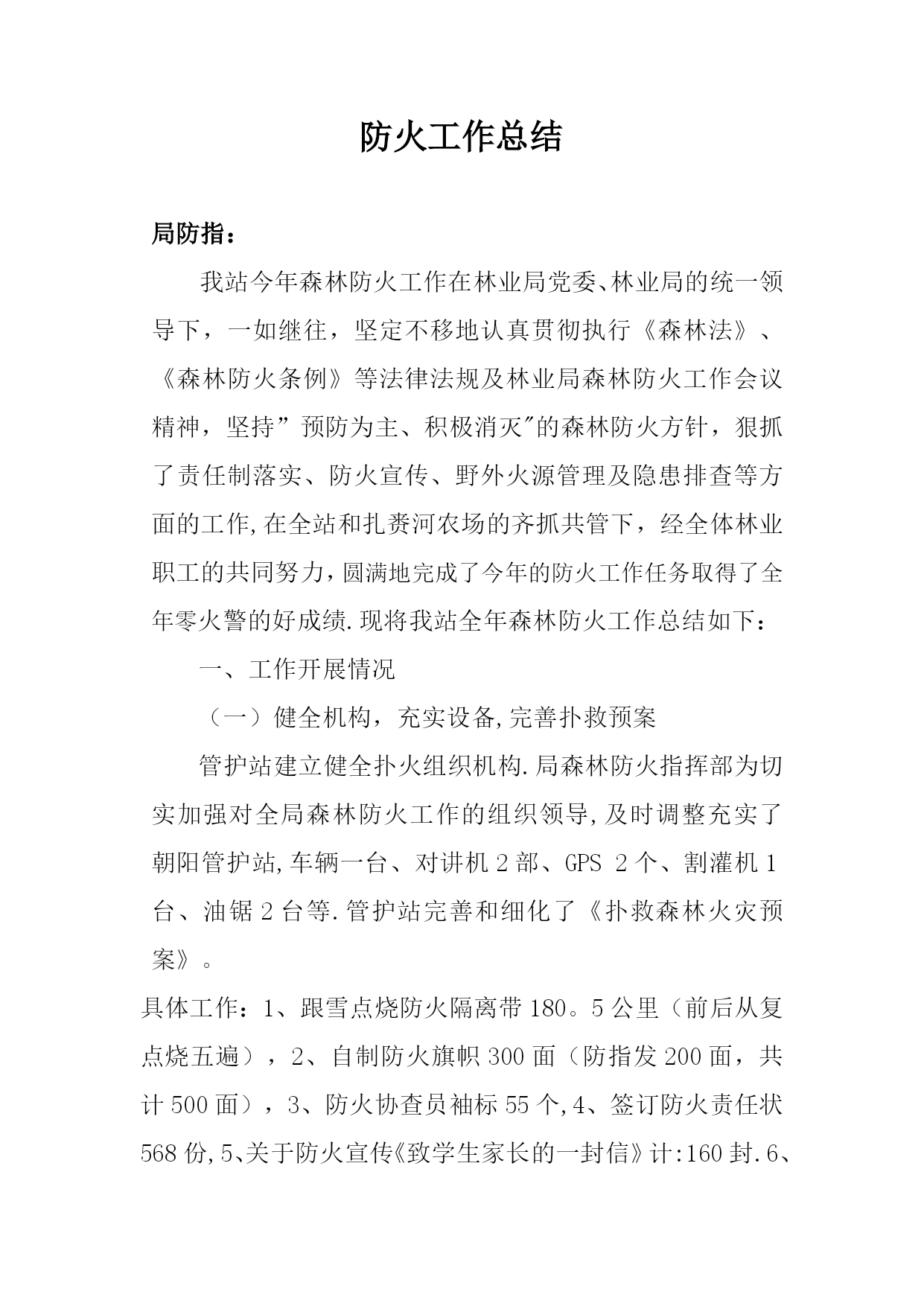 防火工作总结实用文档(实用文档,可以直接使用,可编辑优秀版资料,欢迎下载)防火工作总结局防指:我站今年森林防火工作在林业局党委、林业局的统一领导下,一如继往,坚定不移地认真贯彻执行《森林法》、《森林防火条例》等法律法规及林业局森林防火工作会议精神,坚持”预防为主、积极消灭"的森林防火方针,狠抓了责任制落实、防火宣传、野外火源管理及隐患排查等方面的工作,在全站和扎赉河农场的齐抓共管下,经全体林业职工的共同努力,圆满地完成了今年的防火工作任务取得了全年零火警的好成绩.现将我站全年森林防火工作总结如下:一、工作开展情况(一)健全机构,充实设备,完善扑救预案管护站建立健全扑火组织机构.局森林防火指挥部为切实加强对全局森林防火工作的组织领导,及时调整充实了朝阳管护站,车辆一台、对讲机2部、GPS2个、割灌机1台、油锯2台等.管护站完善和细化了《扑救森林火灾预案》。具体工作:1、跟雪点烧防火隔离带180。5公里(前后从复点烧五遍),2、自制防火旗帜300面(防指发200面,共计500面),3、防火协查员袖标55个,4、签订防火责任状568份,5、关于防火宣传《致学生家长的一封信》计:160封.6、张贴防火标语400幅。7、悬挂防火宣传横幅5幅,联合五个管护站在春秋两个防火期开展防火宣传活动.(二)强化领导,落实责任,消除火险隐患为切实把管理局、局防指森林防火工作的有关精神、指示落到实处,针对不同时期的不同情况进行深入研究和部署,年初,林业局与各管护站签订了森林防火责任书,全面落实森林防火工作责任制,实行全程负责.局防指不定期到各管护站对森林防火工作落实情况进行明查暗访,重点检查防火措施、防火预案及防火责任人落实情况等,尤其是森林防火预案的制定作为安全检查工作的支撑点来抓,确保预案制定工作落到实处。(三)广泛宣传,警钟长鸣,增强防火意识充分利用广播、电视等多种宣传方式,开展内容丰富、形式多样、群众喜闻乐见的森林防火宣传教育活动,切实提高全民防火意识和法制观念,做到防火教育警钟长鸣。(1)在进入林区的主要路口、重点地段和风景旅游区设立永久固定森林防火宣传警示牌和悬挂宣传标语。共设立了永久固定宣传警示牌,对进山作业人员起到了良好的警示作用。(2)在电视、报刊等宣传媒体开辟森林防火专题栏目。在全镇营造了浓厚的防火舆论氛围.(3)我站在采取行政手段抓森林防火的同时,切实加强法制教育,坚持依法治火,充分发挥法律手段在森林防火中的重要作用。(四)强化措施,加强管护,狠抓火源管理管护站以片为单位划分了森林防火责任区,在每块责任区均落实了责任领导及包干责任人。对村民采集山野菜,实行人性化管理,没有办理一个野外扎点采集点.在防火期期间,责任领导必须在责任区靠前驻防,包干责任人必须每天巡护到位,并向管护站汇报巡查情况,由管护站向局防指报当天的情况。管护站人员一半带机巡护,一半在管护站待命.在进山路口,落实待命人员严防死守,坚决制止携带火种进山。同时,切实加强对痴、呆、傻、精神病患者和未成年人群体的监管力度。对这些特殊群体,管护站进行登记建档,并与监护人鉴订责任书,有效预防了因”五类人"而引发的森林火灾。(五)充实队伍,强化技战,提高扑救水平制定了各项规章制度,实行半军事化管理,随时保持森林防火临战状态。我站在全局的第四联动区:四个管护站,同时联合管护站总兵力103人,灭火机58台,手持机29部。(六)强化值班,掌握火情,科学防灾救灾我站严格执行24小时领导带班、职工值班制度,科学调度,及时处置火情,确保政令畅通。强化值班制度,同时对瞭望塔提供的热点及群众举报的情况,及时将有关情况上报上级有关部门和领导;专业森林消防队24小时集中待命,随时做好扑火准备。一旦发生森林火灾,主要领导立即赶赴火场,迅速组织力量进行扑救,确保实现"打早、打小、打了”,最大限度地减少损失.(七)、提高认识,高度戒备,做好扑大火的准备我站根据实际对春防扑火预案进行修改和完善,做好扑火队伍、机具装备、通迅联络,后勤保障四个方面的工作落实,确保扑大火的需要,在扑火队伍方面,管护站专业扑火队必须按时集结,在机具装备方面,必须保证工具齐全配套,达到状态最好,运输车辆要状态良好,加满油.在通迅联络方面,要达到处处通,随叫随到,在后勤保障方面,要建立物资储备库,将油料、锹、斧子和其它扑火所需物资准备充足,保证扑火供应。一旦发生火情,主要领导必须亲临火场指挥。扑火必须坚持“小火大兵团作战”的原则,集中足够兵力,以绝对压倒的优势,一次性将火彻底扑灭。看守火场要指定人员,分段清理,确保不再复燃。在春防期间,森林管护人员要坚守岗位,佩戴袖标,持证上岗,发现火情立即报告,在管护站全体职工的共同努力下,有效的圆满的顺利完成了全年防火工作.总之,一年防火工作已完成,虽然