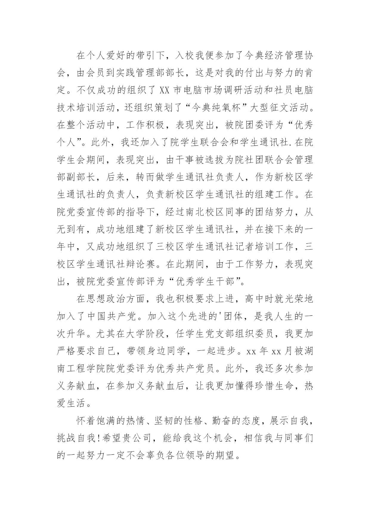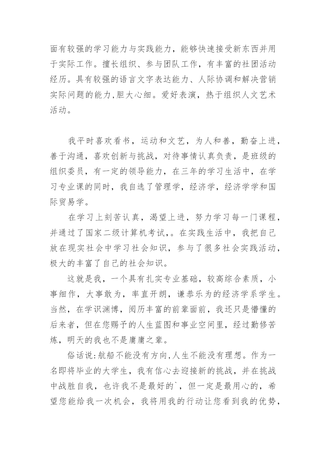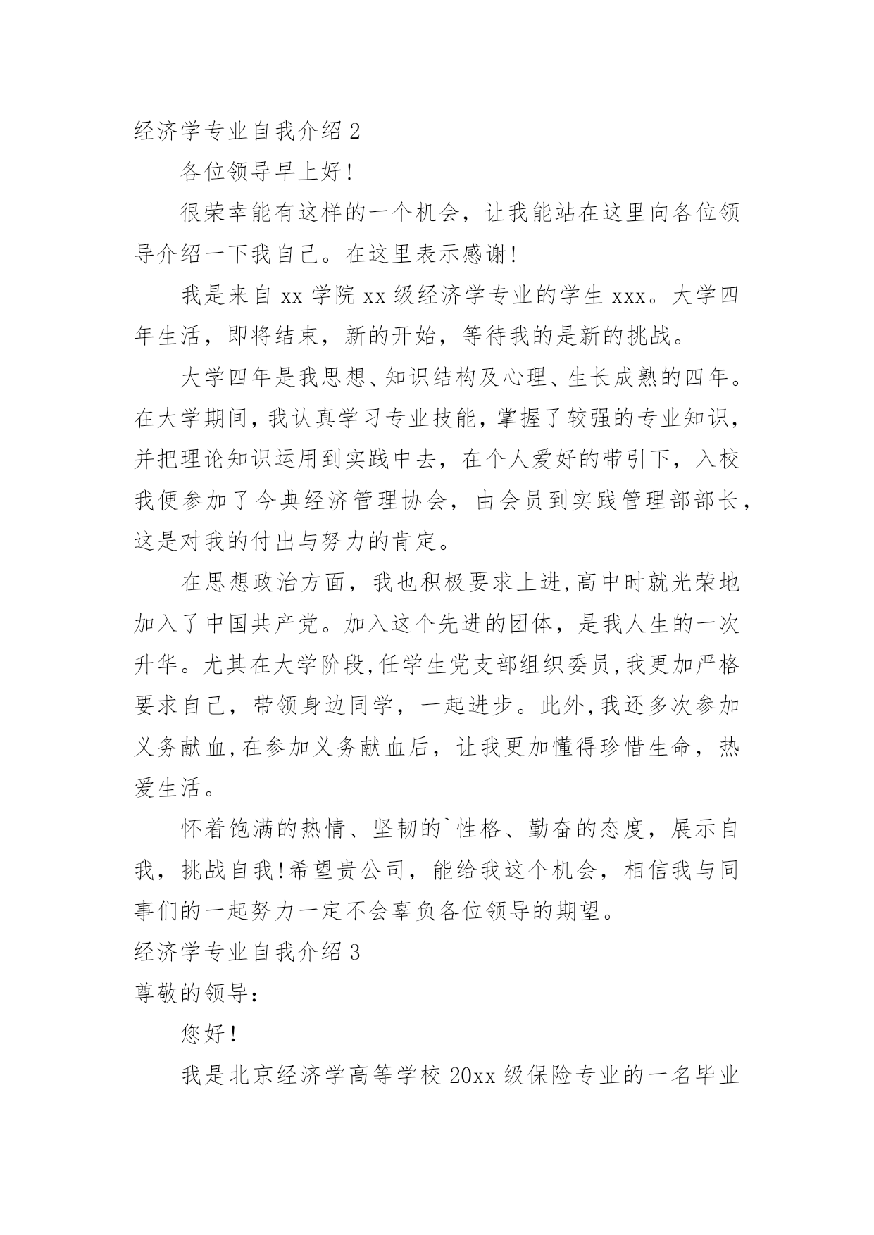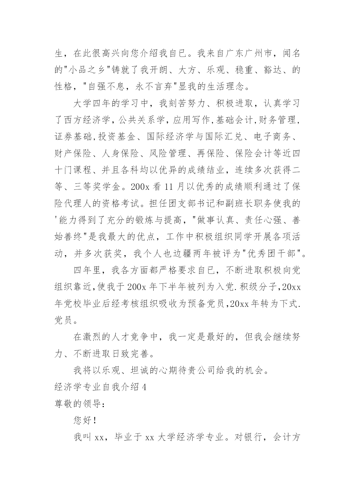 经济学专业自我介绍经济学专业自我介绍当去到一个新环境下,进行自我介绍是必不可少的,自我介绍可以给陌生人留下一个好的印象。你所见过的自我介绍是什么样的呢?以下是小编收集整理的经济学专业自我介绍,欢迎阅读与收藏。经济学专业自我介绍1各位领导好!很荣幸能有这样的一个机会,让我能站在这里向各位领导介绍一下我自己。在这里表示感谢!我是来自xx学院xx级经济学专业的学生小明。大学四年生活,即将结束,新的开始,等待我的是新的挑战。大学四年是我思想、知识结构及心理、生长成熟的四年。在大学期间,我认真学习专业技能,掌握了较强的专业知识,并把理论知识运用到实践中去,获得xx年xx月暑期“三下乡”社会实践活动论文一等奖和xx年xx月XX市第四届大学生科技创新竞赛一等奖。我在学好本专业的同时,并自学计算机知识,在熟练掌握各种基本软件的使用及硬件维护过程中,有独特的经验总结。顺利通过国家人事部组织的全国专业技术人员计算机应用能力考试。同时,我发扬团队精神,帮助其他同学,把自己好的学习经验无私的介绍给其他同学,共同发展,共同进步。在个人爱好的带引下,入校我便参加了今典经济管理协会,由会员到实践管理部部长,这是对我的付出与努力的肯定。不仅成功的组织了XX市电脑市场调研活动和社员电脑技术培训活动,还组织策划了“今典纯氧杯”大型征文活动。在整个活动中,工作积极,表现突出,被院团委评为“优秀个人”。此外,我还加入了院学生联合会和学生通讯社.在院学生会期间,表现突出,由干事被选拔为院社团联合会管理部副部长,后来,转而做学生通讯社负责人,作为新校区学生通讯社的负责人,负责新校区学生通讯社的组建工作。在院党委宣传部的指导下,经过南北校区同事的团结努力,从无到有,成功地组建了新校区学生通讯社,并在接下来的一年中,又成功地组织了三校区学生通讯社记者培训工作,三校区学生通讯社辩论赛。在此期间,由于工作努力,表现突出,被院党委宣传部评为“优秀学生干部”。在思想政治方面,我也积极要求上进,高中时就光荣地加入了中国共产党。加入这个先进的'团体,是我人生的一次升华。尤其在大学阶段,任学生党支部组织委员,我更加严格要求自己,带领身边同学,一起进步。xx年xx月被湖南工程学院院党委评为优秀共产党员。此外,我还多次参加义务献血,在参加义务献血后,让我更加懂得珍惜生命,热爱生活。怀着饱满的热情、坚韧的性格、勤奋的态度,展示自我,挑战自我!希望贵公司,能给我这个机会,相信我与同事们的一起努力一定不会辜负各位领导的期望。经济学专业自我介绍2各位领导早上好!很荣幸能有这样的一个机会,让我能站在这里向各位领导介绍一下我自己。在这里表示感谢!我是来自xx学院xx级经济学专业的学生xxx。大学四年生活,即将结束,新的开始,等待我的是新的挑战。大学四年是我思想、知识结构及心理、生长成熟的四年。在大学期间,我认真学习专业技能,掌握了较强的专业知识,并把理论知识运用到实践中去,在个人爱好的带引下,入校我便参加了今典经济管理协会,由会员到实践管理部部长,这是对我的付出与努力的肯定。在思想政治方面,我也积极要求上进,高中时就光荣地加入了中国共产党。加入这个先进的团体,是我人生的一次升华。尤其在大学阶段,任学生党支部组织委员,我更加严格要求自己,带领身边同学,一起进步。此外,我还多次参加义务献血,在参加义务献血后,让我更加懂得珍惜生命,热爱生活。怀着饱满的热情、坚韧的`性格、勤奋的态度,展示自我,挑战自我!希望贵公司,能给我这个机会,相信我与同事们的一起努力一定不会辜负各位领导的期望。经济学专业自我介绍3尊敬的领导:您好!我是北京经济学高等学校20xx级保险专业的一名毕业生,在此很高兴向您介绍我自已。我来自广东广州市,闻名的"小品之乡"铸就了我开朗、大方、乐观、稳重、豁达、的性格,"自强不息,永不言弃"显我的生活理念。大学四年的学习中,我刻苦努力、积极进取,认真学习了西方经济学,公共关系学,应用写作,基础会计,财务管理,证券基础,投资基金、国际经济学与国际汇兑、电子商务、财产保险、人身保险、风险管理、再保险、保险会计等近四十门课程、并且各科均以优异的成绩结业,连续多次获得二等、三等奖学金。200x看11月以优秀的成绩顺利通过了保险代理人的资格考试。担任团支部书记和副班长职务使我的'能力得到了充分的锻炼与提高,"做事认真、责任心强、善始善终"是我最大的优点,工作中积极组织同学开展各项活动,并多次获奖,我个人也边疆两年被评为"优秀团干部"。四年里,我各方面都严格要求自已,不断进取积极向党组织靠近,使我于200x年下半年被列为入党.积级分子,20xx年党校毕业后经考核组织吸收为预备党员,20xx年转为下式.党员。在激烈的人才竞争中,我一定是最好的,但我会继续努力、不断进取日致完善。我将以乐观、坦诚的心期待贵公司给我