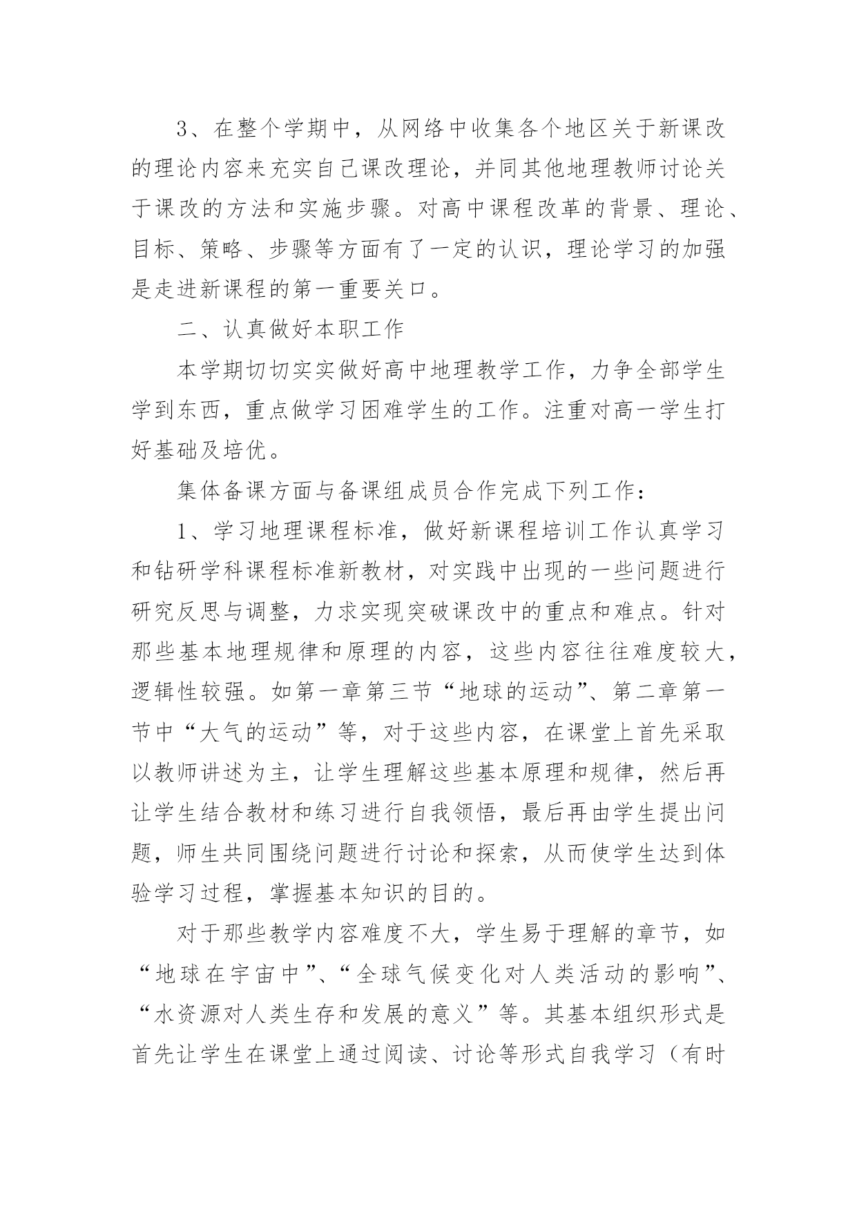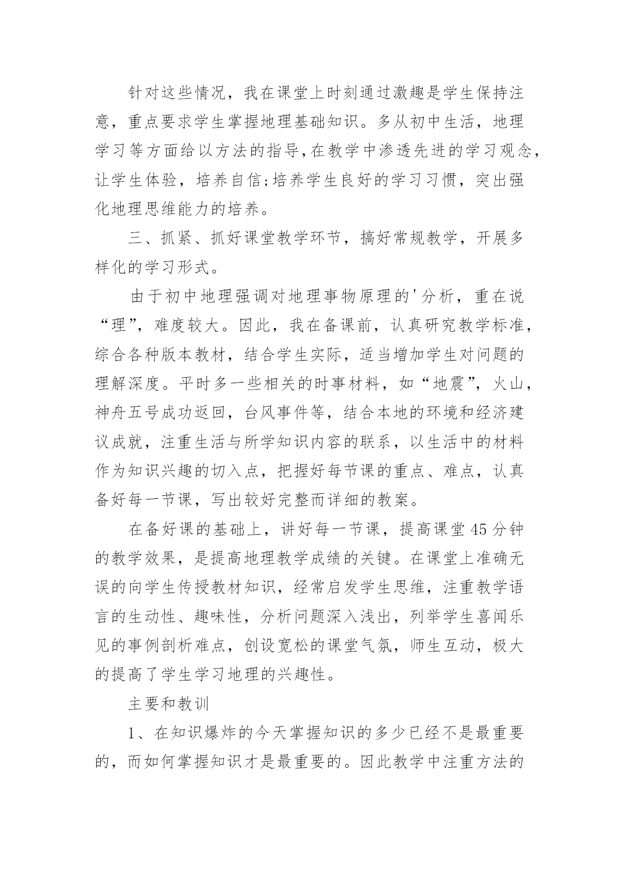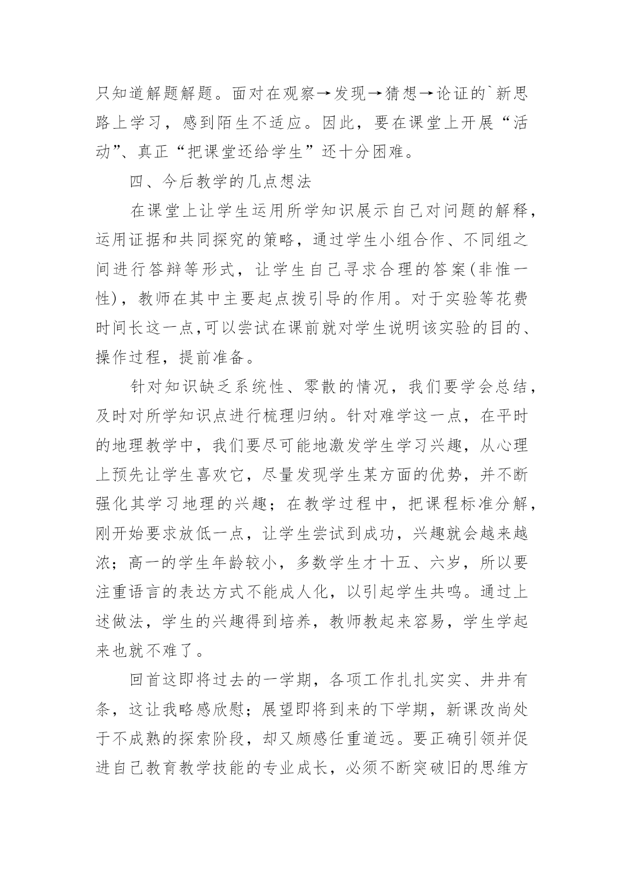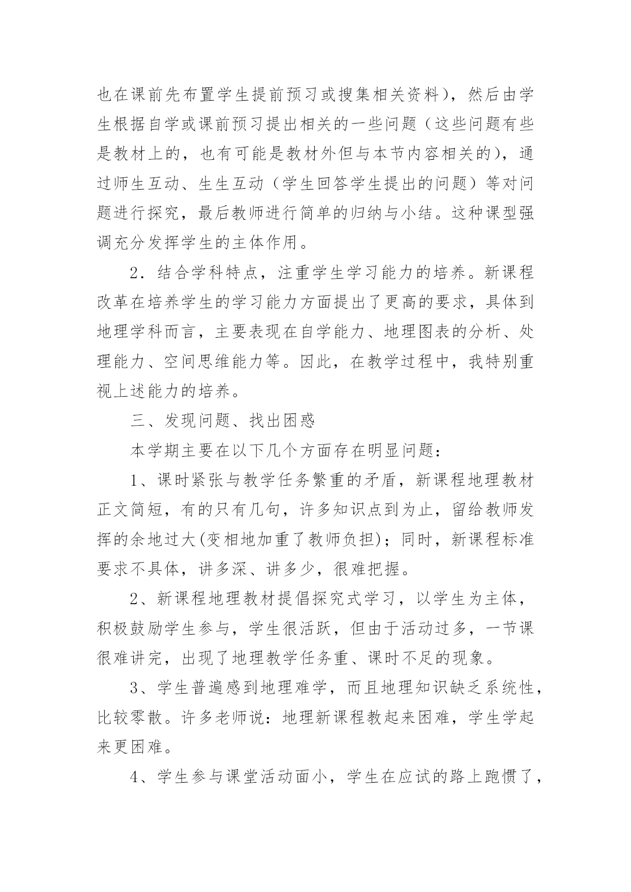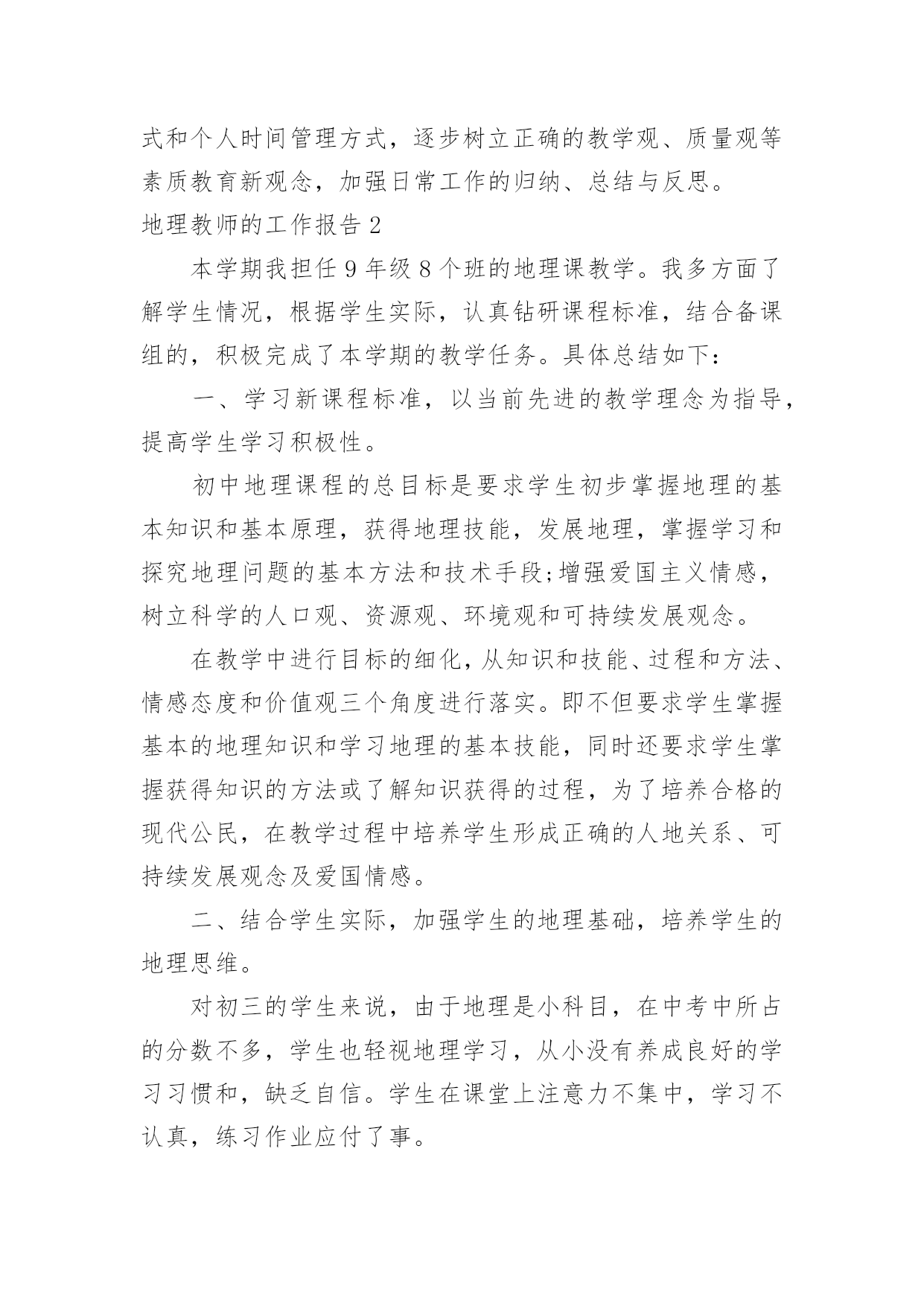 地理教师的工作报告地理教师的工作报告随着社会不断地进步,报告与我们愈发关系密切,其在写作上具有一定的窍门。那么什么样的报告才是有效的呢?以下是小编精心整理的地理教师的工作报告,欢迎大家借鉴与参考,希望对大家有所帮助。地理教师的工作报告1本学期我担任了四个班(1、2、3、4)的地理教学工作,在与诸位地理教师的协同合作下,明确职责,脚踏实地的工作,各项教学活动开展的井井有条,现将一学期的具体工作总结如下:一、前一阶段教学工作的回顾1、积极参加课改培训,加强理论学习、促进观念转变新课程改革对学校、教师和学生都提出了新的更高的要求,新课程改革背景下的教师必须加强学习,只有这样才能形成正确的教育观、学生观、教师观和质量观等。2、转变课堂教学模式、改变教学方法与手段。新课程注重“师生互动”、“充分发挥学生主体作用”等教学原则,虽然所带的五个班的学生普遍比较差,但在教学过程中我尽量改变过去教师“一言堂”的局面,设法调动学生积极参与学习,通过适时表扬和鼓励,增强学生的自信心。3、在整个学期中,从网络中收集各个地区关于新课改的理论内容来充实自己课改理论,并同其他地理教师讨论关于课改的方法和实施步骤。对高中课程改革的背景、理论、目标、策略、步骤等方面有了一定的认识,理论学习的加强是走进新课程的第一重要关口。二、认真做好本职工作本学期切切实实做好高中地理教学工作,力争全部学生学到东西,重点做学习困难学生的工作。注重对高一学生打好基础及培优。集体备课方面与备课组成员合作完成下列工作:1、学习地理课程标准,做好新课程培训工作认真学习和钻研学科课程标准新教材,对实践中出现的一些问题进行研究反思与调整,力求实现突破课改中的重点和难点。针对那些基本地理规律和原理的内容,这些内容往往难度较大,逻辑性较强。如第一章第三节“地球的运动”、第二章第一节中“大气的运动”等,对于这些内容,在课堂上首先采取以教师讲述为主,让学生理解这些基本原理和规律,然后再让学生结合教材和练习进行自我领悟,最后再由学生提出问题,师生共同围绕问题进行讨论和探索,从而使学生达到体验学习过程,掌握基本知识的目的。对于那些教学内容难度不大,学生易于理解的章节,如“地球在宇宙中”、“全球气候变化对人类活动的影响”、“水资源对人类生存和发展的意义”等。其基本组织形式是首先让学生在课堂上通过阅读、讨论等形式自我学习(有时也在课前先布置学生提前预习或搜集相关资料),然后由学生根据自学或课前预习提出相关的一些问题(这些问题有些是教材上的,也有可能是教材外但与本节内容相关的),通过师生互动、生生互动(学生回答学生提出的问题)等对问题进行探究,最后教师进行简单的归纳与小结。这种课型强调充分发挥学生的主体作用。2.结合学科特点,注重学生学习能力的培养。新课程改革在培养学生的学习能力方面提出了更高的要求,具体到地理学科而言,主要表现在自学能力、地理图表的分析、处理能力、空间思维能力等。因此,在教学过程中,我特别重视上述能力的培养。三、发现问题、找出困惑本学期主要在以下几个方面存在明显问题:1、课时紧张与教学任务繁重的矛盾,新课程地理教材正文简短,有的只有几句,许多知识点到为止,留给教师发挥的余地过大(变相地加重了教师负担);同时,新课程标准要求不具体,讲多深、讲多少,很难把握。2、新课程地理教材提倡探究式学习,以学生为主体,积极鼓励学生参与,学生很活跃,但由于活动过多,一节课很难讲完,出现了地理教学任务重、课时不足的现象。3、学生普遍感到地理难学,而且地理知识缺乏系统性,比较零散。许多老师说:地理新课程教起来困难,学生学起来更困难。4、学生参与课堂活动面小,学生在应试的路上跑惯了,只知道解题解题。面对在观察→发现→猜想→论证的`新思路上学习,感到陌生不适应。因此,要在课堂上开展“活动”、真正“把课堂还给学生”还十分困难。四、今后教学的几点想法在课堂上让学生运用所学知识展示自己对问题的解释,运用证据和共同探究的策略,通过学生小组合作、不同组之间进行答辩等形式,让学生自己寻求合理的答案(非惟一性),教师在其中主要起点拨引导的作用。对于实验等花费时间长这一点,可以尝试在课前就对学生说明该实验的目的、操作过程,提前准备。针对知识缺乏系统性、零散的情况,我们要学会总结,及时对所学知识点进行梳理归纳。针对难学这一点,在平时的地理教学中,我们要尽可能地激发学生学习兴趣,从心理上预先让学生喜欢它,尽量发现学生某方面的优势,并不断强化其学习地理的兴趣;在教学过程中,把课程标准分解,刚开始要求放低一点,让学生尝试到成功,兴趣就会越来越浓;高一的学生年龄较小,多数学生才十五、六岁,所以要注重语言的表达方式不能成人化,以引起学生共鸣。通过上述做法,学生的兴趣得到培养,教师教起来容易,学生学起来也就不难了。回首这即将过去的一学期,各项