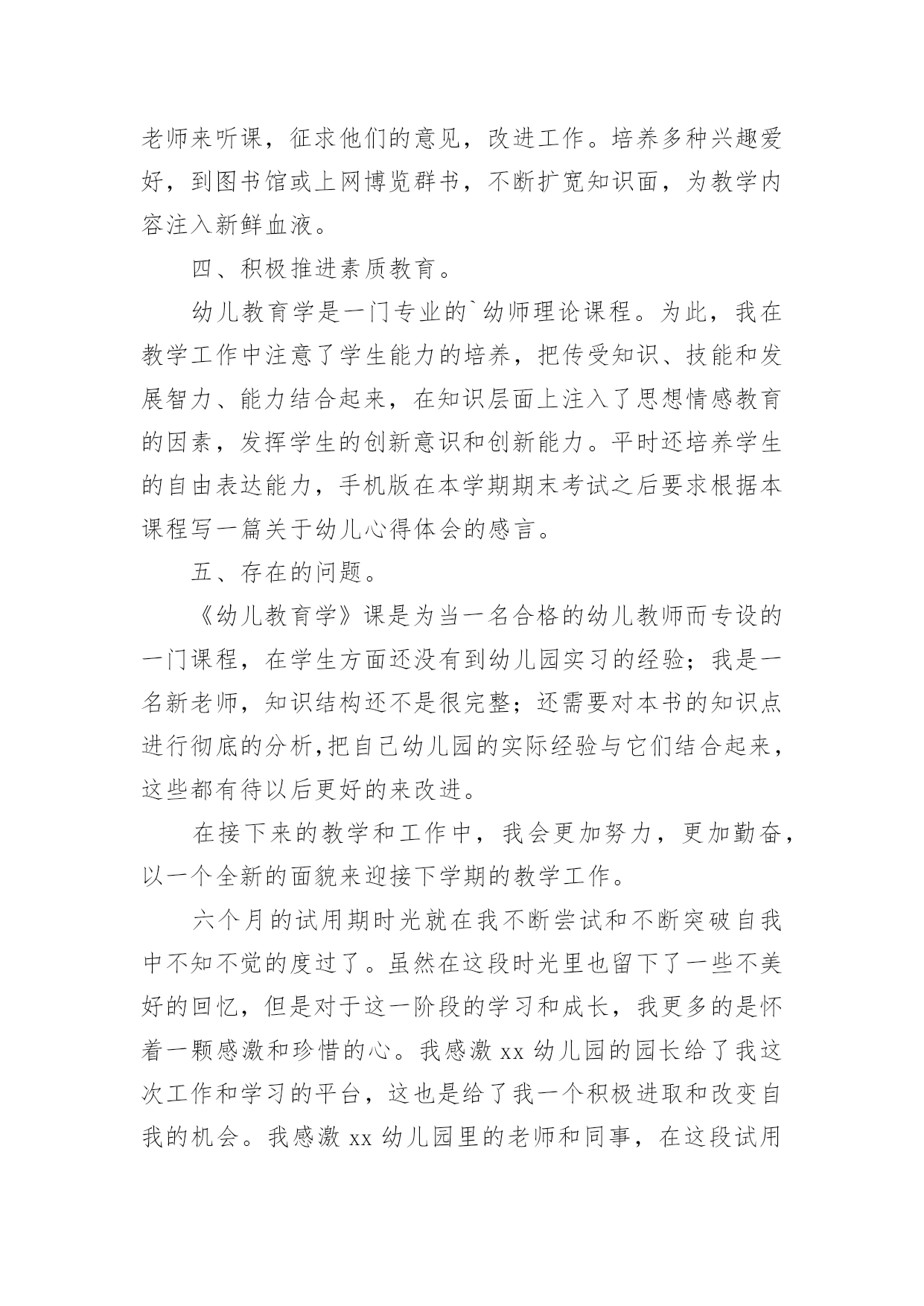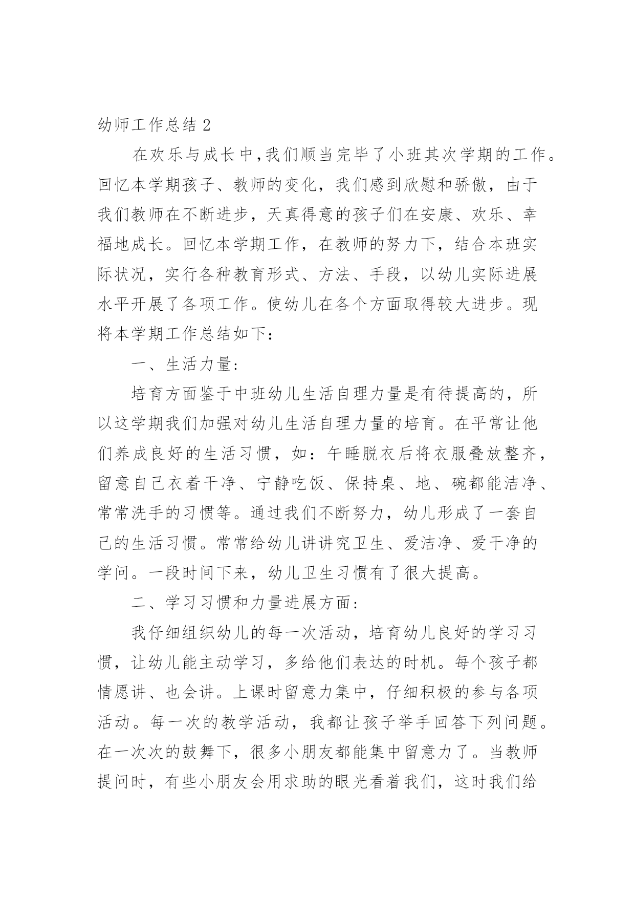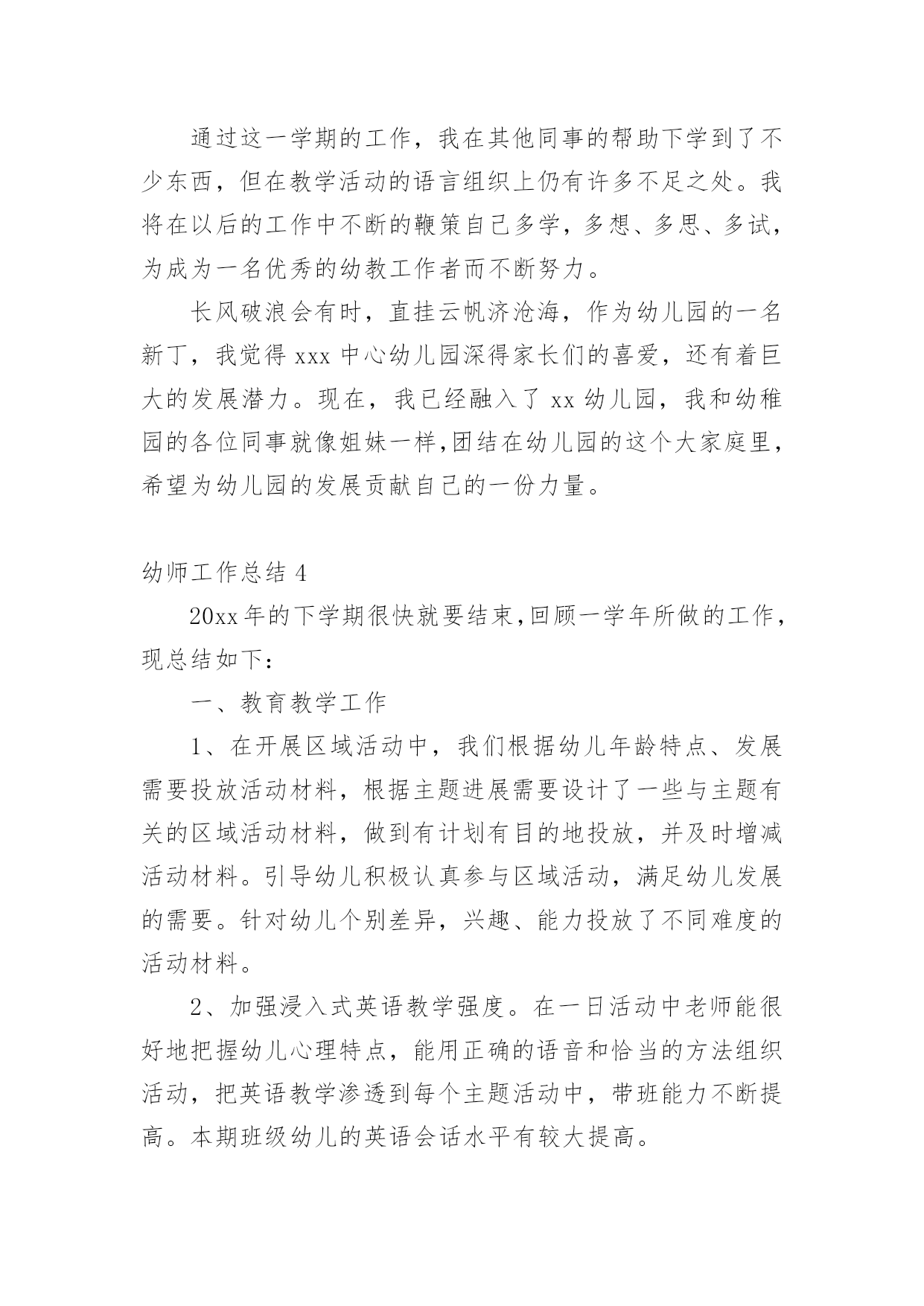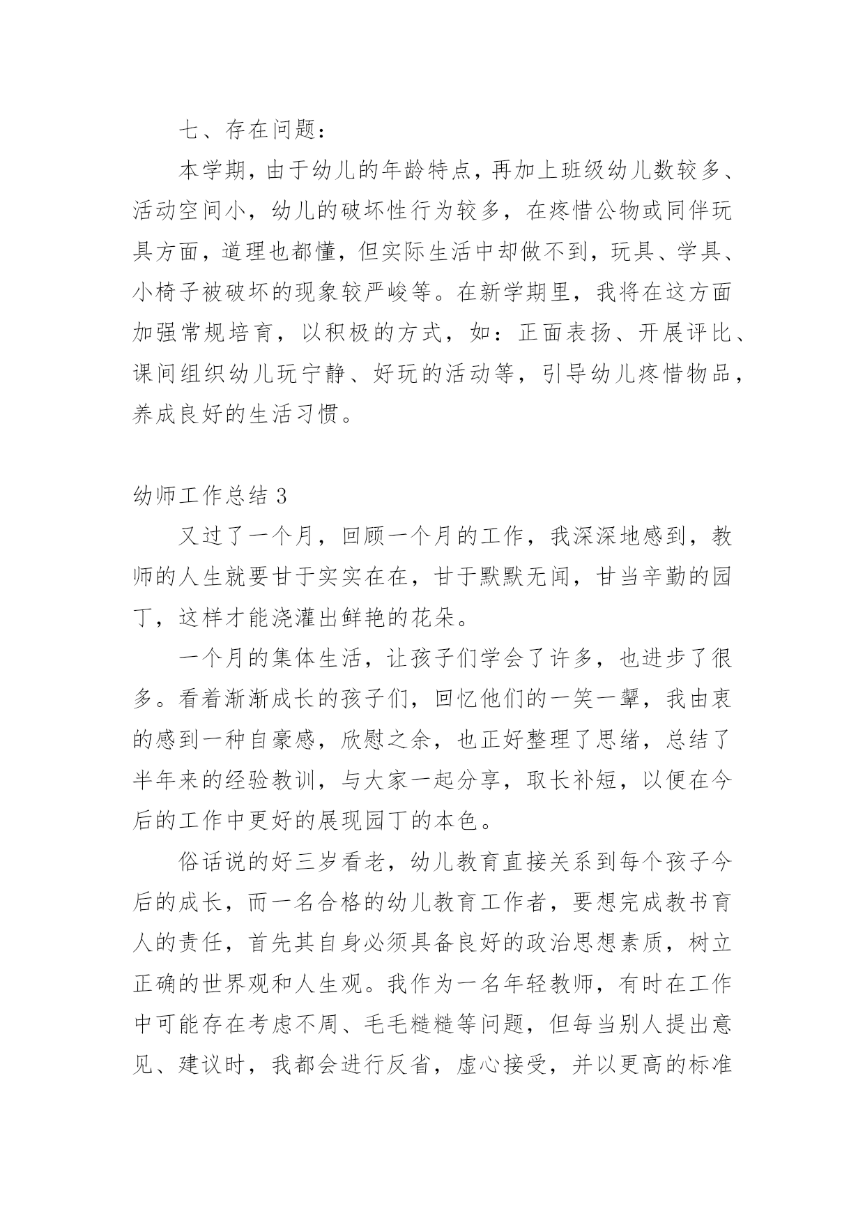 幼师工作总结幼师工作总结锦集[15篇]总结是指对某一阶段的工作、学习或思想中的经验或情况进行分析研究,做出带有规律性结论的书面材料,它可以使我们更有效率,是时候写一份总结了。总结怎么写才不会流于形式呢?以下是小编为大家整理的幼师工作总结,欢迎阅读,希望大家能够喜欢。幼师工作总结1我是刚来学校不久的一名新老师,在这辛苦而又忙碌的半一年里,使我自己成长了很多,在和同学们的相处中,让我感受到了学校的温暖和同学们的热情和拥戴,我感到非常的荣幸。20xx年,对我而言是一个新的开始和一个新的起点,而对同学们来说,从学习上,是一个大的转折和磨砺。作为一名中二的幼儿教育学老师,再加上我又是一名新老师,曾经有一定的迷茫感,但同时这也是一件好事,促使我用更多的时间去学习研究新的课题,探索新的幼儿市场发展的变化,以便能够更好的来传授学生。回首自己在中二这半年来的教学工作,在老教师的指导和帮助下,在与其他教师的交流和讨论中,教学还是比较成功的,对学生的指导及训练起到了很明显的作用,本学期即将结束,现在我对本学期的教学工作做以下总结:一、认真备课不但备教材备教法而且备学生,根据内容及学生的实际,了解教材的结构,重点与难点,掌握知识的逻辑,能运用自如;了解学生原有的知识的质量,他们的兴趣、需要、方法、习惯,学习新知识可能会有哪些困难,采取相应的预防措施;解决如何把已掌握的教材传授给学生,包括如何组织教材、如何安排每节课的活动。认真写好教案,每一课都做到“有备而来”,每堂课都在课前做好充分的准备。二、课堂上的情况组织好课堂教学,关注全体学生,注意信息反馈,特别注意调动学生的积极性,加强师生交流,充分体现学生的主导作用,让学生学得容易,学得轻松,学得愉快;注意精讲精练,在课堂上老师讲得尽量少,学生动口动脑尽量多;同时在每一堂课上都充分考虑每一个层次的学生学习需求和学习能力,让各个层次的学生都得到提高。课堂上讲练结合,布置好课后作业,作业少而精,减轻学生的负担。做好课后工作。认真批改作业,分析并记录学生的作业情况,将他们在作业过程出现的问题作出分类总结,进行透切的评讲,并针对有关情况及时改进教学方法,做到有放有失。三、平时在教学上,有疑必问,在各个章节的学习上都积极征求其他老师的意见,学习他们的方法。积极参与听课、评课,虚心向同行学习,博采众长,并邀请其他老师来听课,征求他们的意见,改进工作。培养多种兴趣爱好,到图书馆或上网博览群书,不断扩宽知识面,为教学内容注入新鲜血液。四、积极推进素质教育。幼儿教育学是一门专业的`幼师理论课程。为此,我在教学工作中注意了学生能力的培养,把传受知识、技能和发展智力、能力结合起来,在知识层面上注入了思想情感教育的因素,发挥学生的创新意识和创新能力。平时还培养学生的自由表达能力,手机版在本学期期末考试之后要求根据本课程写一篇关于幼儿心得体会的感言。五、存在的问题。《幼儿教育学》课是为当一名合格的幼儿教师而专设的一门课程,在学生方面还没有到幼儿园实习的经验;我是一名新老师,知识结构还不是很完整;还需要对本书的知识点进行彻底的分析,把自己幼儿园的实际经验与它们结合起来,这些都有待以后更好的来改进。在接下来的教学和工作中,我会更加努力,更加勤奋,以一个全新的面貌来迎接下学期的教学工作。六个月的试用期时光就在我不断尝试和不断突破自我中不知不觉的度过了。虽然在这段时光里也留下了一些不美好的回忆,但是对于这一阶段的学习和成长,我更多的是怀着一颗感激和珍惜的心。我感激xx幼儿园的园长给了我这次工作和学习的平台,这也是给了我一个积极进取和改变自我的机会。我感激xx幼儿园里的老师和同事,在这段试用期里对我主动亲近和不断鼓励,才能够让我卸下心中的防线,打开自己的心门,彻底的让自己融入xx幼儿园的这个大集体里。我也感激在这段时期里,xx幼儿园的小朋友给我带来的欢乐,让我觉得作为一名幼儿教师是一件十分幸福的事情。等等除此之外,我还有很多很多的感激,和更多的期待,所以,在面临我试用期即将结束的时候,我向领导提交了我这篇正式的转正工作总结。原本以为,在踏入社会工作以后,我们面临的工作环境都会是一些明争暗斗,勾心斗角的场所,但是在来到xx幼儿园里,给我的感受却是完全不一样的。我从我进入到学校的第一天开始,就已经感觉到了xx幼儿园里所给我带来的亲切和温暖。老师们都对我表示热烈的欢迎,热情的给我介绍班级里各个小朋友,和学校里的各种基础设施。小朋友们也是围着我团团转,弄的我一时都有些束手无策。但是我的内心却满是欢喜。面对这样一个愉悦和放松的工作环境,我工作起来也就没有感觉到太多的压力。但是对待我试用期的新工作,我始终还是保持着自己严谨而细致的工作态度。毕竟我每天的工作就是负责照顾好这群天真浪漫的小朋友,负责好他们的安全,教他们知识,教他们生活常识,帮助他们德智