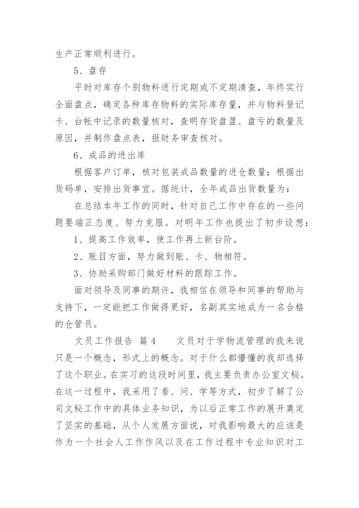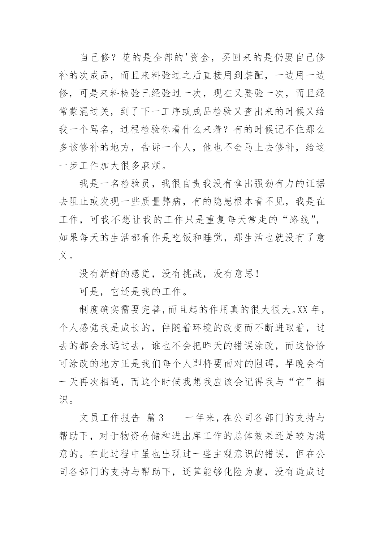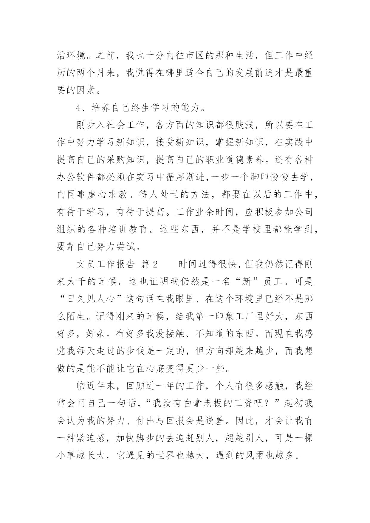 文员工作报告文员工作报告我们眼下的社会,越来越多的事务都会使用到报告,报告具有双向沟通性的特点。那么什么样的报告才是有效的呢?以下是小编帮大家整理的文员工作报告,仅供参考,大家一起来看看吧。文员工作报告篇1一、实习目的实习是学生从理论走向实践的重要一环,也是学生从学校走向生产岗位的第一步。为了将学生培养成为既具有理论知识,又具有一定实践认识的全方位的新一代人才,不能仅通过实验室的实验环节来培养,而是应当走入社会,真正走上第一线去了解、去认识具体的工作过程,只有这样才能达到教学目的。实习正是这样一个难得的锻炼机会。通过实习,学生应将学校所学的理论知识灵活地指导实际工作,并从中发现问题、分析问题、最终解决问题,针对实际工作过程,培养学生的思维、观察能力,进一步认识实际的生产设备、控制方法和处理过程等,以求知识点的融会贯通和知识面的扩大,并帮助学生养成遵章守纪的好习惯,为今后真正走上工作岗位打下较为扎实的基础。二、实习时间20xx年xx月xx日20xx年xx月xx日三、实习地点xx四、实习单位xx汽修厂五、单位简介xx汽修厂位于xx,公司主营的是汽车维修,兼卖汽车配件等。它所属的行业为:制造业、交通运输设备制造业、汽车制造、汽车修理。六、实习内容在此次的实习中,我担任的xx汽修厂的的采购文员。以下,是我每天工作的基本内容:1、负责完成集团公司下达的配件销售和利润指标以及工厂下达的配件销售任务。2、协调计划、采购、调度、入库、配送和库管(各)岗位(之间)的工作关系,明确工作流程,保证各环节工作的畅通,不断提高配件供应的满足率、准确率、完好率。3、建立采购供应的业务档案,掌握不同运输方式的运输天数、费用等,确定最佳采购方案。4、采购管理,适时、适量、适质、适价,与厂家保持良好的关系;按计划采购,特殊情况有权做临时调整。5、采购过程中,要强化验货工作,对配件的品牌、规格、数量等都要做到准确无误,认真完成配件的第一次检验工作。6、入库验收工作中,要协同计划员、库管员作好配件的第二次检验工作,对配件质量、品牌、规格、价格等问题作合理解释。7、对急件、零星采购件,要进行充分的询价、比价、议价,并按采购程序优先办理。8、接收其他临时工作。七、实习收获1.工作收获:1)工作敏感度有所提高,能够较积极地向领导汇报工作进度与结果;2)工作适应能力逐步增强,对后期安排的工作,现已得心应手;2.工作中存在的不足:工作细心度仍有所欠缺;在日常工作中,时常有些工作因为不够细心,从而浪费时间或是再做一遍。相信在接下来的工作中,一定会仔细、仔细、再仔细地来完成每项工作。八、实习总结从走出校园到步入社会,初出茅庐的我经历了一个改变的过程,由学校那个充满幻想的我,到靠近现实、逐渐成熟,融入社会竞争。下面,我就结合我的实际工作对本次实习做一个总结。1、勤奋努力,精益求精。要得到用人单位的信任,是需要一段时间的。所以在工作中养成吃苦耐劳、不怕困难、不怕挫折、踏踏实实、不遗余力的工作态度很重要。要敢于实践,勇于创新。在工作中改进方式,讲究方法。2、豁达开朗,宽以待人的气度,建立良好的人际关系。在人事工作当中,与各层次的人打交道很重要。如企业的员工、管理人员、特殊人员、求职者。在初次接触人事工作时,我也产生过诸多的不适应,也会出错。有时,自己认为已经把工作做好了,在上级眼里,也会有很多的不足之处,所以要虚心接受上级的建议,在工作中改进自己。在一个企业当中,建立良好的人际关系更重要。我也曾认为社会那么现实,人与人之间为了小小的利益,斤斤计较,害怕面对。但要了解社会,必须经历这个过程。企业在运行,各部门与部门之间的工作联系很关键,所以要学会做人,与各部门的工作人员建立良好的人际关系,在工作中相互沟通,接触与自己性格志向不同的人,“异中求同”,不在背后讲别人的坏话,不计较一时一事的得失。3、拥有良好的心态,学会自信。虽然我是成教生,但我们同样能打造出属于自己的天空。法国哲学家卢俊曾经说过:“自信心对于事业简直就是奇迹,有了他,你的才智才可以取之不尽,用之不竭。一个没有自信心的人,无论他有多大的才能,也不会有成功的.机会。”社会是个大舞台,其中溶入了不同的角色,只要我们有自己扎实的专业知识,有自己的一技之长,立足之本,同样能得到用人单位的肯定。另外,无论工作单位是在城市或郊区。我们都应该拥有积极向上、乐观的心理状态,要拥有一双发现美的眼睛,能够通过自己的努力去改变、去适应周围的生活环境。之前,我也十分向往市区的那种生活,但工作中经历的两个月来,我觉得在哪里适合自己的发展前途才是最重要的因素。4、培养自己终生学习的能力。刚步入社会工作,各方面的知识都很肤浅,所以要在工作中努力学习新知识,接受新知识,掌握新知识,在实践中提高自己的采购知识,提高自己的职业道德素养。还有各种办公软件都必