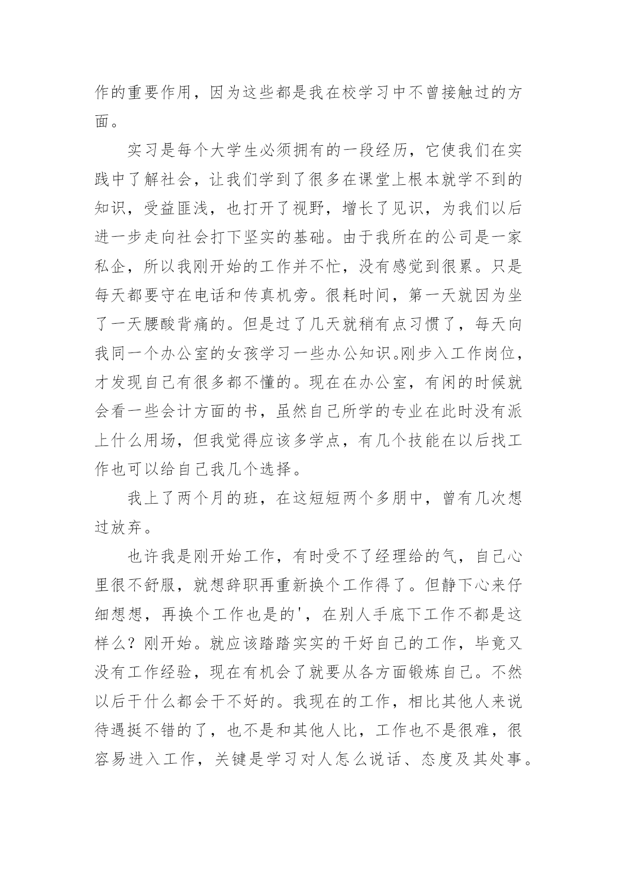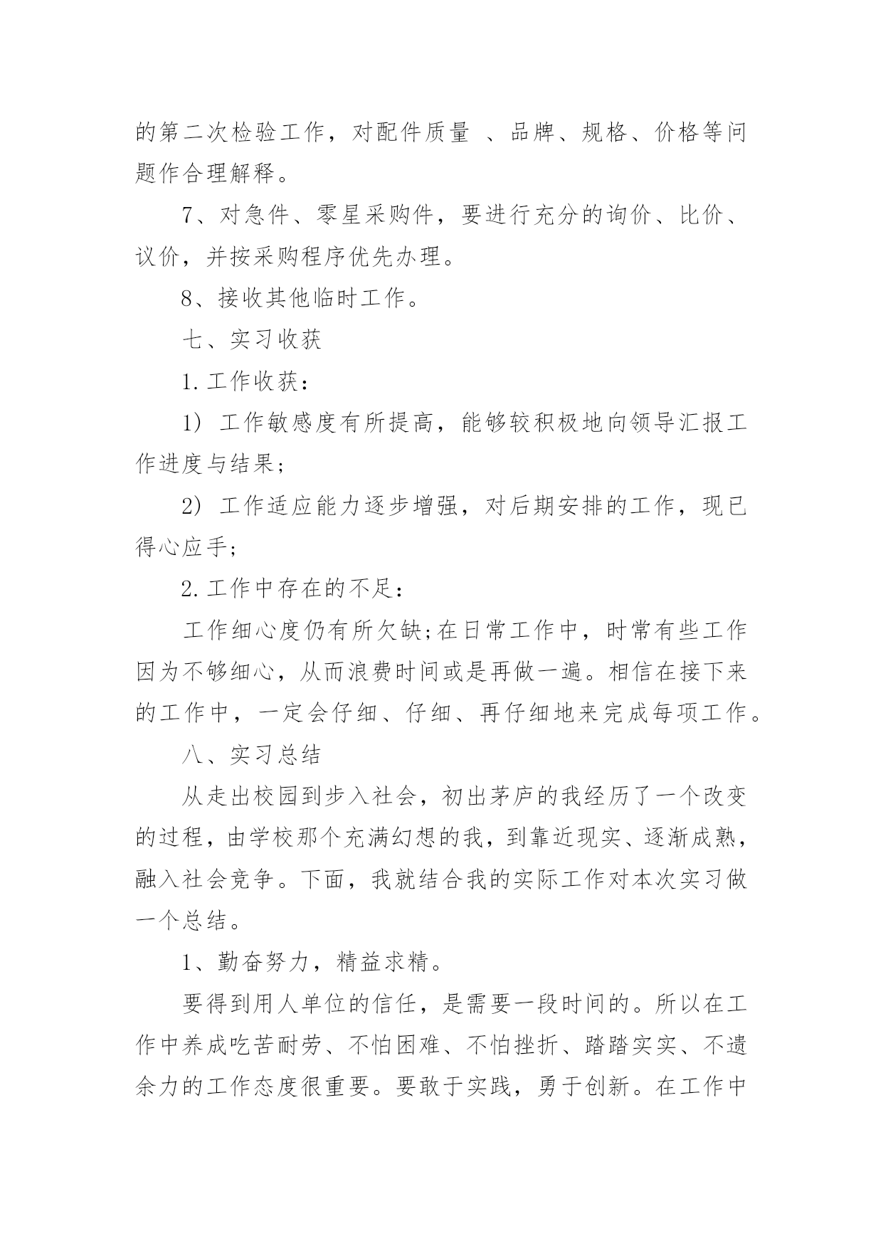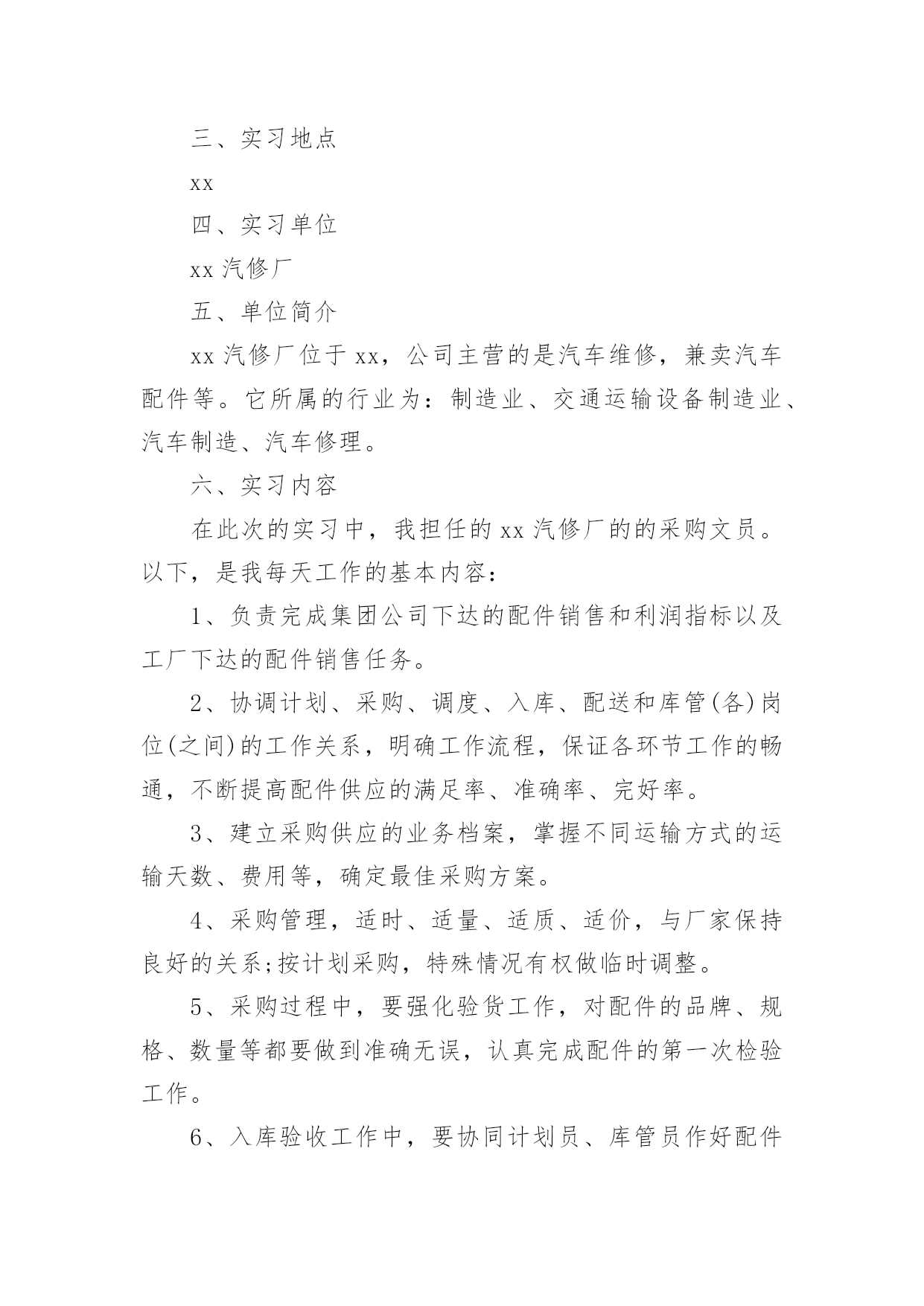 文员工作报告文员工作报告我们眼下的社会,越来越多的事务都会使用到报告,报告具有双向沟通性的特点。那么什么样的报告才是有效的呢?以下是小编帮大家整理的文员工作报告,仅供参考,大家一起来看看吧。文员工作报告篇1一、实习目的实习是学生从理论走向实践的重要一环,也是学生从学校走向生产岗位的第一步。为了将学生培养成为既具有理论知识,又具有一定实践认识的全方位的新一代人才,不能仅通过实验室的实验环节来培养,而是应当走入社会,真正走上第一线去了解、去认识具体的工作过程,只有这样才能达到教学目的。实习正是这样一个难得的锻炼机会。通过实习,学生应将学校所学的理论知识灵活地指导实际工作,并从中发现问题、分析问题、最终解决问题,针对实际工作过程,培养学生的思维、观察能力,进一步认识实际的生产设备、控制方法和处理过程等,以求知识点的融会贯通和知识面的扩大,并帮助学生养成遵章守纪的好习惯,为今后真正走上工作岗位打下较为扎实的基础。二、实习时间20xx年xx月xx日20xx年xx月xx日三、实习地点xx四、实习单位xx汽修厂五、单位简介xx汽修厂位于xx,公司主营的是汽车维修,兼卖汽车配件等。它所属的行业为:制造业、交通运输设备制造业、汽车制造、汽车修理。六、实习内容在此次的实习中,我担任的xx汽修厂的的采购文员。以下,是我每天工作的基本内容:1、负责完成集团公司下达的配件销售和利润指标以及工厂下达的配件销售任务。2、协调计划、采购、调度、入库、配送和库管(各)岗位(之间)的工作关系,明确工作流程,保证各环节工作的畅通,不断提高配件供应的满足率、准确率、完好率。3、建立采购供应的业务档案,掌握不同运输方式的运输天数、费用等,确定最佳采购方案。4、采购管理,适时、适量、适质、适价,与厂家保持良好的关系;按计划采购,特殊情况有权做临时调整。5、采购过程中,要强化验货工作,对配件的品牌、规格、数量等都要做到准确无误,认真完成配件的第一次检验工作。6、入库验收工作中,要协同计划员、库管员作好配件的第二次检验工作,对配件质量、品牌、规格、价格等问题作合理解释。7、对急件、零星采购件,要进行充分的询价、比价、议价,并按采购程序优先办理。8、接收其他临时工作。七、实习收获1.工作收获:1)工作敏感度有所提高,能够较积极地向领导汇报工作进度与结果;2)工作适应能力逐步增强,对后期安排的工作,现已得心应手;2.工作中存在的不足:工作细心度仍有所欠缺;在日常工作中,时常有些工作因为不够细心,从而浪费时间或是再做一遍。相信在接下来的工作中,一定会仔细、仔细、再仔细地来完成每项工作。八、实习总结从走出校园到步入社会,初出茅庐的我经历了一个改变的过程,由学校那个充满幻想的我,到靠近现实、逐渐成熟,融入社会竞争。下面,我就结合我的实际工作对本次实习做一个总结。1、勤奋努力,精益求精。要得到用人单位的信任,是需要一段时间的。所以在工作中养成吃苦耐劳、不怕困难、不怕挫折、踏踏实实、不遗余力的工作态度很重要。要敢于实践,勇于创新。在工作中改进方式,讲究方法。2、豁达开朗,宽以待人的气度,建立良好的人际关系。在人事工作当中,与各层次的人打交道很重要。如企业的员工、管理人员、特殊人员、求职者。在初次接触人事工作时,我也产生过诸多的不适应,也会出错。有时,自己认为已经把工作做好了,在上级眼里,也会有很多的不足之处,所以要虚心接受上级的建议,在工作中改进自己。在一个企业当中,建立良好的人际关系更重要。我也曾认为社会那么现实,人与人之间为了小小的利益,斤斤计较,害怕面对。但要了解社会,必须经历这个过程。企业在运行,各部门与部门之间的工作联系很关键,所以要学会做人,与各部门的工作人员建立良好的人际关系,在工作中相互沟通,接触与自己性格志向不同的人,“异中求同”,不在背后讲别人的坏话,不计较一时一事的得失。3、拥有良好的心态,学会自信。虽然我是成教生,但我们同样能打造出属于自己的天空。法国哲学家卢俊曾经说过:“自信心对于事业简直就是奇迹,有了他,你的才智才可以取之不尽,用之不竭。一个没有自信心的人,无论他有多大的才能,也不会有成功的.机会。”社会是个大舞台,其中溶入了不同的角色,只要我们有自己扎实的专业知识,有自己的一技之长,立足之本,同样能得到用人单位的肯定。另外,无论工作单位是在城市或郊区。我们都应该拥有积极向上、乐观的心理状态,要拥有一双发现美的眼睛,能够通过自己的努力去改变、去适应周围的生活环境。之前,我也十分向往市区的那种生活,但工作中经历的两个月来,我觉得在哪里适合自己的发展前途才是最重要的因素。4、培养自己终生学习的能力。刚步入社会工作,各方面的知识都很肤浅,所以要在工作中努力学习新知识,接受新知识,掌握新知识,在实践中提高自己的采购知识,提高自己的职业道德素养。还有各种办公软件都必