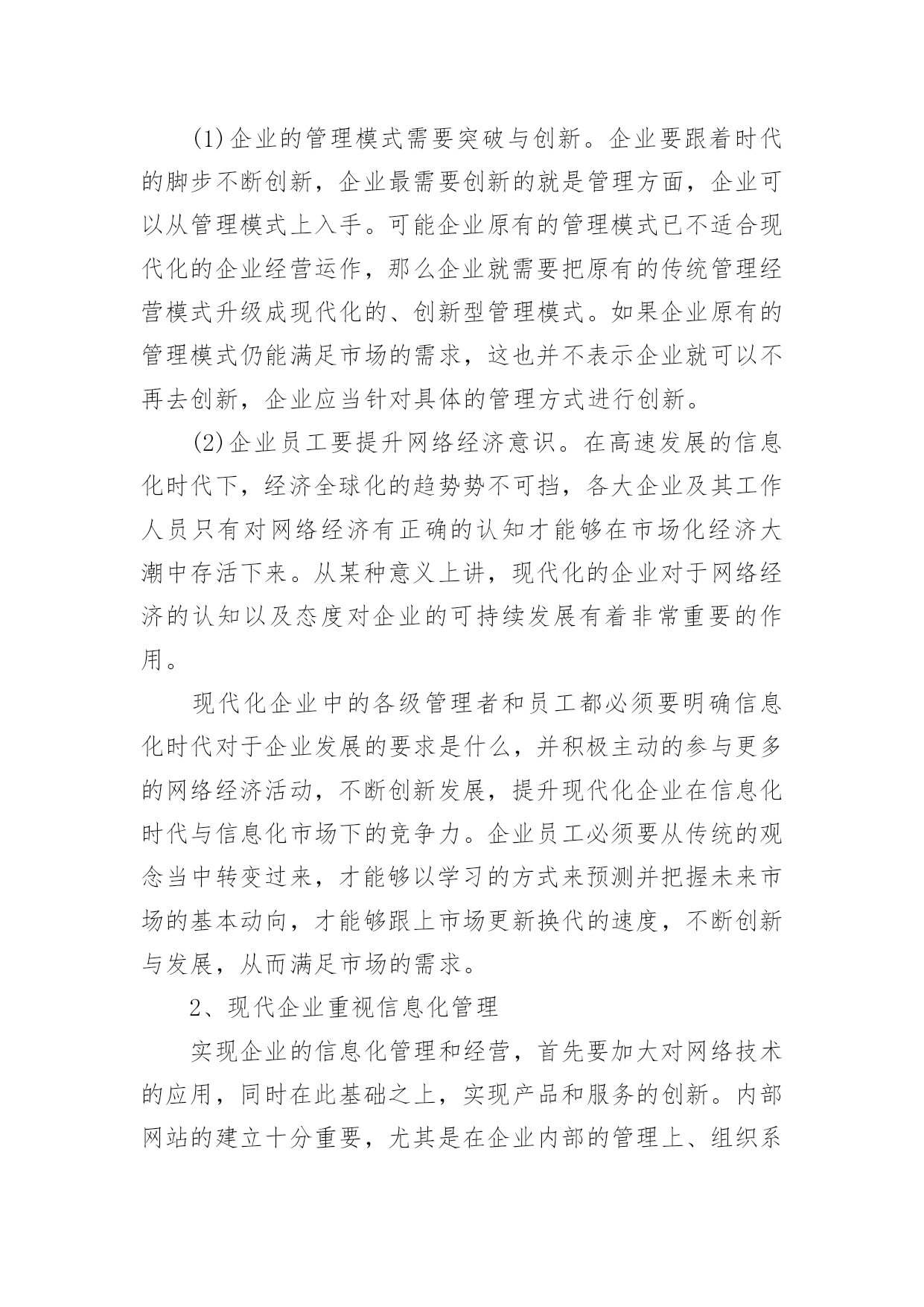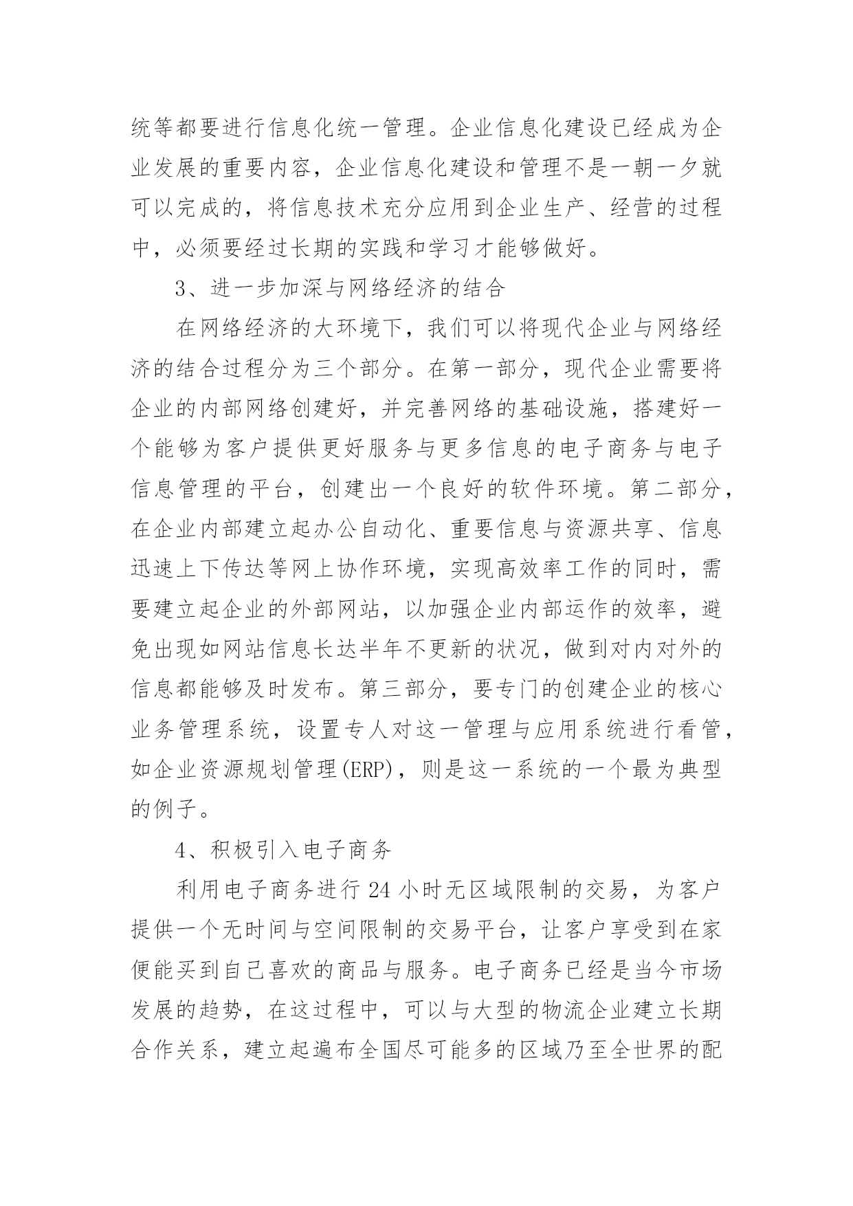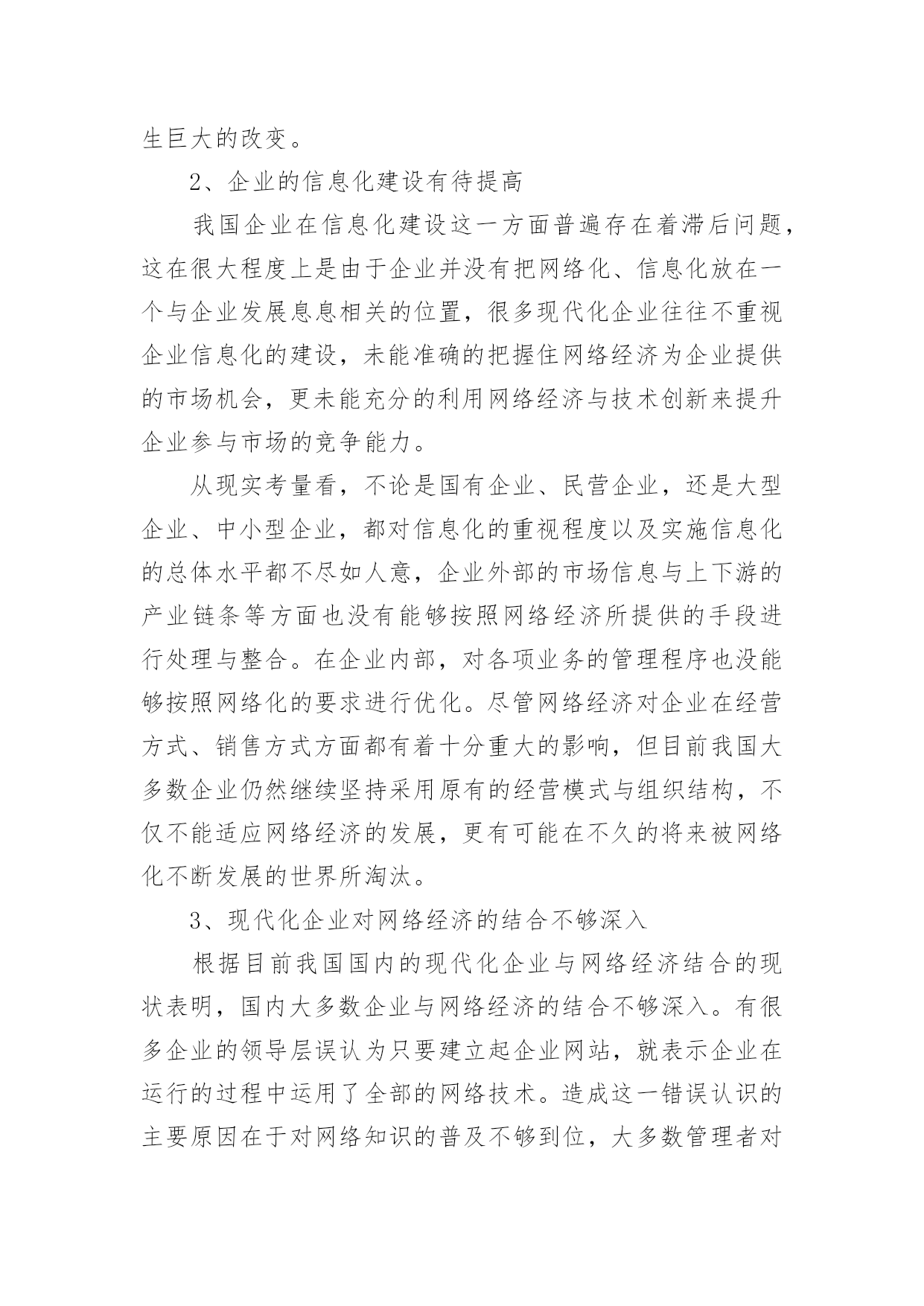 网络经济对企业管理的影响论文网络经济对企业管理的影响论文在平时的学习、工作中,大家都尝试过写论文吧,借助论文可以有效提高我们的写作水平。为了让您在写论文时更加简单方便,下面是小编整理的网络经济对企业管理的影响论文,仅供参考,欢迎大家阅读。网络经济对当今社会的影响深远且广泛,尤其是对于现代企业的运行。随着网络技术的不断发展,信息技术步伐的不断加快,网络经济的力量会得到进一步的展现。摘要:无处不在的网络让人们生活也越来越便利,而当网络渗入市场经济的领域后就形成了一种新的经济模式——网络经济。网络经济对企业的运营以及发展模式、生产方式、管理与组织结构有着很大的影响,越来越多的企业管理人员开始重视网络经济,因为企业对网络经济的认知以及态度会对企业的生存以及发展有着决定性的影响,本文就网络经济这一新兴经济模式对现代企业管理的影响进行探究。关键词:网络经济;企业管理;影响网络经济之所以以网络为前缀,是因为其信息性,网络经济是现今网络急剧发展的信息化时代的产物,是一种新兴的经济形态或者说是一种新的生产方式。而网络经济的运营是需要相应的驱动条件,驱动条件往往是信息化时代的知识要素。网络经济运行的基础是信息产业,其核心是信息化知识,并以网络信息为载体,将服务人员与服务的目标两者间的距离缩短。一、现代企业管理在网络经济环境下存在的问题互联网技术的发展也相应地对企业生存和发展造成了压力,尤其是现代企业还尚未深刻认识到网络经济的内容,于是导致企业未能加快信息化的建设,最为重要的是企业与网络经济直接的结合力度不够。1、企业对网络经济的影响认识不够全面随着经济的不断发展与全球化步伐的不断加快,越来越多的企业开始意识到网络经济的重要性,但在我国仍有不少企业的经营者没有能够真正的理解网络经济的内涵,对网络经济的影响认识不够全面,没能准确的意识到网络经济给企业所带来的冲击与挑战。更有不少企业经营者、企业家坚持认为,网络经济只会对高科技的新兴产业产生冲击与影响,而不会对传统产业型企业产生影响。这种观点显然是错误的。随着科学技术的不断发展,互联网应用的不断深入,目前企业内部有着大量的商业活动采用网络方式进行,网络经济已经对目前企业价值链上的各个环节都产生了不容忽视的重大影响,受到影响的企业不仅仅只是高科技的新兴产业,对传统企业的影响更加不可小觑。随着目前经济全球化的不断发展,网络经济的不断进步,很有可能会在不久的将来对现代企业管理的基本运作模式产生巨大的改变。2、企业的信息化建设有待提高我国企业在信息化建设这一方面普遍存在着滞后问题,这在很大程度上是由于企业并没有把网络化、信息化放在一个与企业发展息息相关的位置,很多现代化企业往往不重视企业信息化的建设,未能准确的把握住网络经济为企业提供的市场机会,更未能充分的利用网络经济与技术创新来提升企业参与市场的竞争能力。从现实考量看,不论是国有企业、民营企业,还是大型企业、中小型企业,都对信息化的重视程度以及实施信息化的总体水平都不尽如人意,企业外部的市场信息与上下游的产业链条等方面也没有能够按照网络经济所提供的手段进行处理与整合。在企业内部,对各项业务的管理程序也没能够按照网络化的要求进行优化。尽管网络经济对企业在经营方式、销售方式方面都有着十分重大的影响,但目前我国大多数企业仍然继续坚持采用原有的经营模式与组织结构,不仅不能适应网络经济的发展,更有可能在不久的将来被网络化不断发展的世界所淘汰。3、现代化企业对网络经济的结合不够深入根据目前我国国内的现代化企业与网络经济结合的现状表明,国内大多数企业与网络经济的结合不够深入。有很多企业的领导层误认为只要建立起企业网站,就表示企业在运行的过程中运用了全部的网络技术。造成这一错误认识的主要原因在于对网络知识的普及不够到位,大多数管理者对网络经济的理解与认识存在偏差。有很多企业建立了网站之后,并不对网站进行管理与维护,而是将其忽略。有相关研究资料表明,在对我国五百家企业的网站抽样调查中,有高达85%的企业网站有长达半年的时间未对网站所发布的内容进行更新,更有高达90%的企业网站上只发布了企业产品的介绍以及总经理等高级管理层的图片,企业网站的建设千篇一律,没有任何新意。利用网络对企业进行宣传是一种能在很多方面实现共赢的途径,但相当一部分企业在建立起自己的网站后疏于管理与宣传,即使有的网站做到了宣传工作,但其宣传方式缺乏策略性,因此得到的效果往往不够理想。众所周知,现代企业与网络经济相结合,所得到的终极产物便是电子商务。电子商务以服务为先,面向顾客,旨在让顾客能够足不出户的享受到企业为其提供的最优秀的产品与服务。因此,将现代企业与网络经济相结合,不能只单单的将其理解为是电脑、网络、建立网站等方面,更需要企业能够充分利用信息技术,将开发、生产、管理、销售、物流等各个方面的每一个环