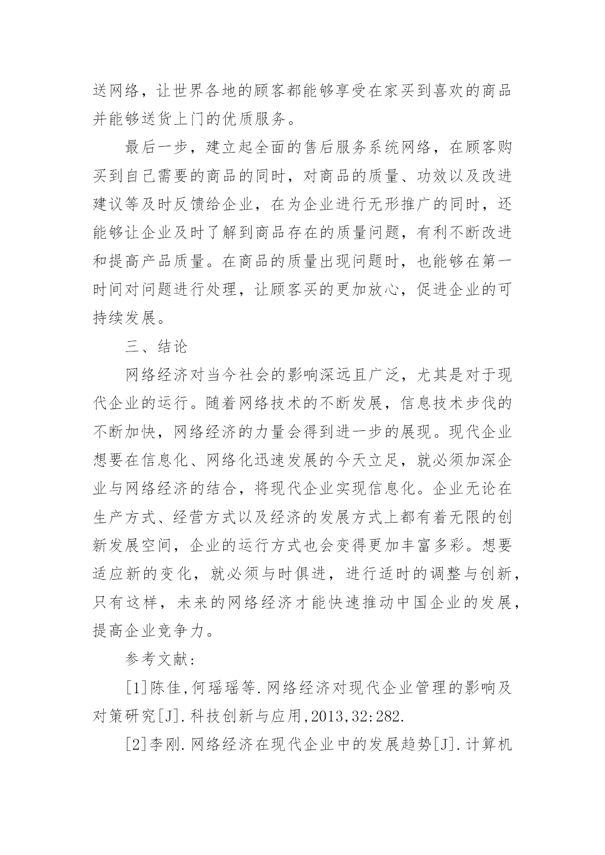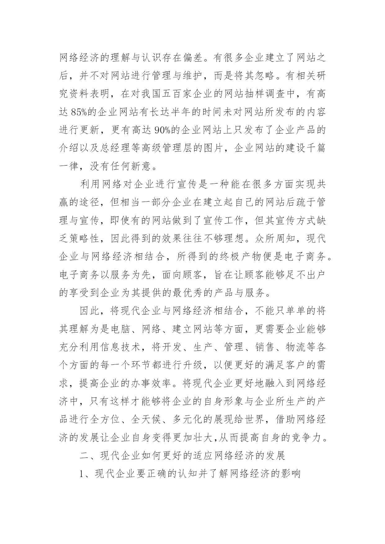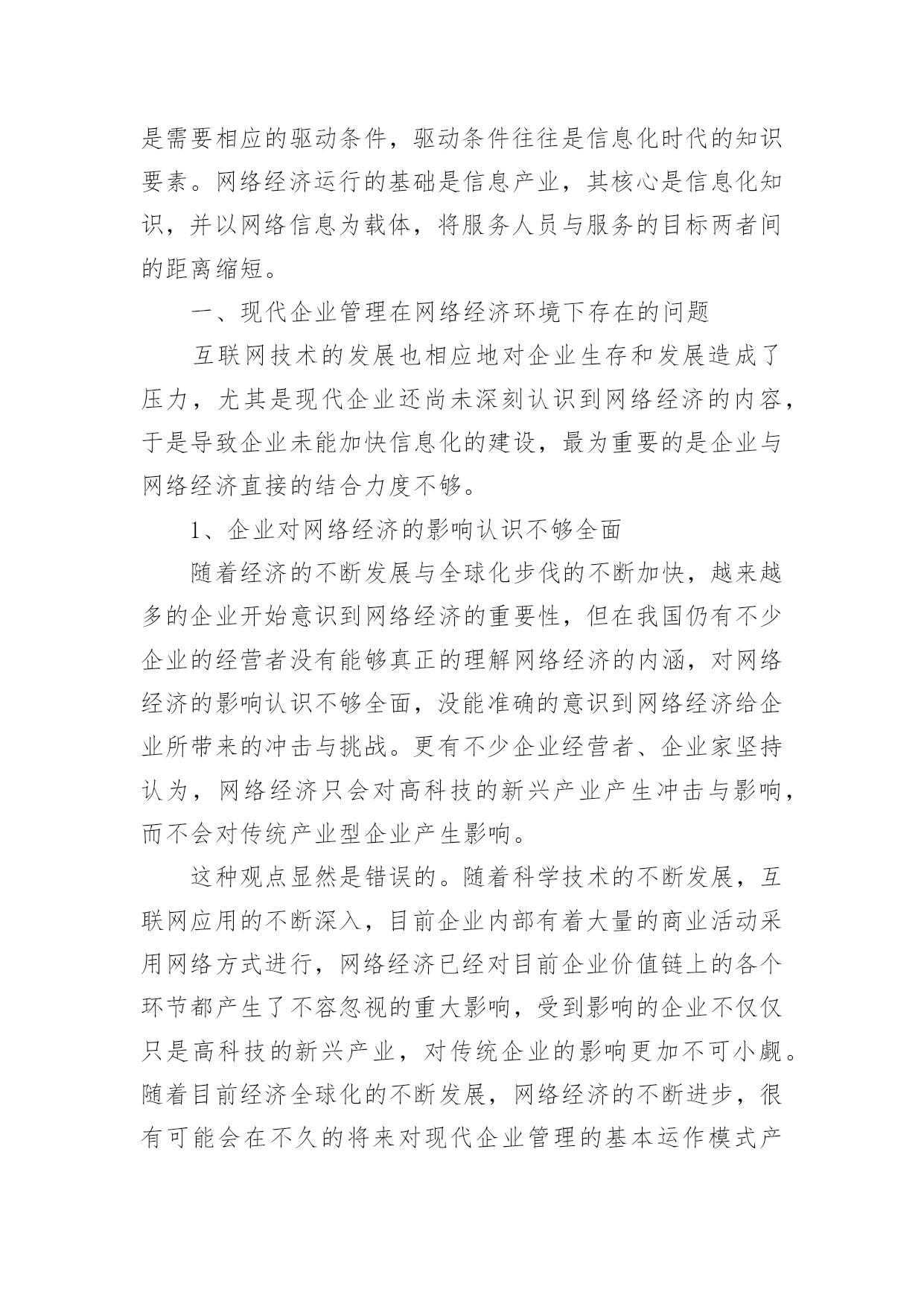 网络经济对企业管理的影响论文网络经济对企业管理的影响论文在平时的学习、工作中,大家都尝试过写论文吧,借助论文可以有效提高我们的写作水平。为了让您在写论文时更加简单方便,下面是小编整理的网络经济对企业管理的影响论文,仅供参考,欢迎大家阅读。网络经济对当今社会的影响深远且广泛,尤其是对于现代企业的运行。随着网络技术的不断发展,信息技术步伐的不断加快,网络经济的力量会得到进一步的展现。摘要:无处不在的网络让人们生活也越来越便利,而当网络渗入市场经济的领域后就形成了一种新的经济模式——网络经济。网络经济对企业的运营以及发展模式、生产方式、管理与组织结构有着很大的影响,越来越多的企业管理人员开始重视网络经济,因为企业对网络经济的认知以及态度会对企业的生存以及发展有着决定性的影响,本文就网络经济这一新兴经济模式对现代企业管理的影响进行探究。关键词:网络经济;企业管理;影响网络经济之所以以网络为前缀,是因为其信息性,网络经济是现今网络急剧发展的信息化时代的产物,是一种新兴的经济形态或者说是一种新的生产方式。而网络经济的运营是需要相应的驱动条件,驱动条件往往是信息化时代的知识要素。网络经济运行的基础是信息产业,其核心是信息化知识,并以网络信息为载体,将服务人员与服务的目标两者间的距离缩短。一、现代企业管理在网络经济环境下存在的问题互联网技术的发展也相应地对企业生存和发展造成了压力,尤其是现代企业还尚未深刻认识到网络经济的内容,于是导致企业未能加快信息化的建设,最为重要的是企业与网络经济直接的结合力度不够。1、企业对网络经济的影响认识不够全面随着经济的不断发展与全球化步伐的不断加快,越来越多的企业开始意识到网络经济的重要性,但在我国仍有不少企业的经营者没有能够真正的理解网络经济的内涵,对网络经济的影响认识不够全面,没能准确的意识到网络经济给企业所带来的冲击与挑战。更有不少企业经营者、企业家坚持认为,网络经济只会对高科技的新兴产业产生冲击与影响,而不会对传统产业型企业产生影响。这种观点显然是错误的。随着科学技术的不断发展,互联网应用的不断深入,目前企业内部有着大量的商业活动采用网络方式进行,网络经济已经对目前企业价值链上的各个环节都产生了不容忽视的重大影响,受到影响的企业不仅仅只是高科技的新兴产业,对传统企业的影响更加不可小觑。随着目前经济全球化的不断发展,网络经济的不断进步,很有可能会在不久的将来对现代企业管理的基本运作模式产生巨大的改变。2、企业的信息化建设有待提高我国企业在信息化建设这一方面普遍存在着滞后问题,这在很大程度上是由于企业并没有把网络化、信息化放在一个与企业发展息息相关的位置,很多现代化企业往往不重视企业信息化的建设,未能准确的把握住网络经济为企业提供的市场机会,更未能充分的利用网络经济与技术创新来提升企业参与市场的竞争能力。从现实考量看,不论是国有企业、民营企业,还是大型企业、中小型企业,都对信息化的重视程度以及实施信息化的总体水平都不尽如人意,企业外部的市场信息与上下游的产业链条等方面也没有能够按照网络经济所提供的手段进行处理与整合。在企业内部,对各项业务的管理程序也没能够按照网络化的要求进行优化。尽管网络经济对企业在经营方式、销售方式方面都有着十分重大的影响,但目前我国大多数企业仍然继续坚持采用原有的经营模式与组织结构,不仅不能适应网络经济的发展,更有可能在不久的将来被网络化不断发展的世界所淘汰。3、现代化企业对网络经济的结合不够深入根据目前我国国内的现代化企业与网络经济结合的现状表明,国内大多数企业与网络经济的结合不够深入。有很多企业的领导层误认为只要建立起企业网站,就表示企业在运行的过程中运用了全部的网络技术。造成这一错误认识的主要原因在于对网络知识的普及不够到位,大多数管理者对网络经济的理解与认识存在偏差。有很多企业建立了网站之后,并不对网站进行管理与维护,而是将其忽略。有相关研究资料表明,在对我国五百家企业的网站抽样调查中,有高达85%的企业网站有长达半年的时间未对网站所发布的内容进行更新,更有高达90%的企业网站上只发布了企业产品的介绍以及总经理等高级管理层的图片,企业网站的建设千篇一律,没有任何新意。利用网络对企业进行宣传是一种能在很多方面实现共赢的途径,但相当一部分企业在建立起自己的网站后疏于管理与宣传,即使有的网站做到了宣传工作,但其宣传方式缺乏策略性,因此得到的效果往往不够理想。众所周知,现代企业与网络经济相结合,所得到的终极产物便是电子商务。电子商务以服务为先,面向顾客,旨在让顾客能够足不出户的享受到企业为其提供的最优秀的产品与服务。因此,将现代企业与网络经济相结合,不能只单单的将其理解为是电脑、网络、建立网站等方面,更需要企业能够充分利用信息技术,将开发、生产、管理、销售、物流等各个方面的每一个环
