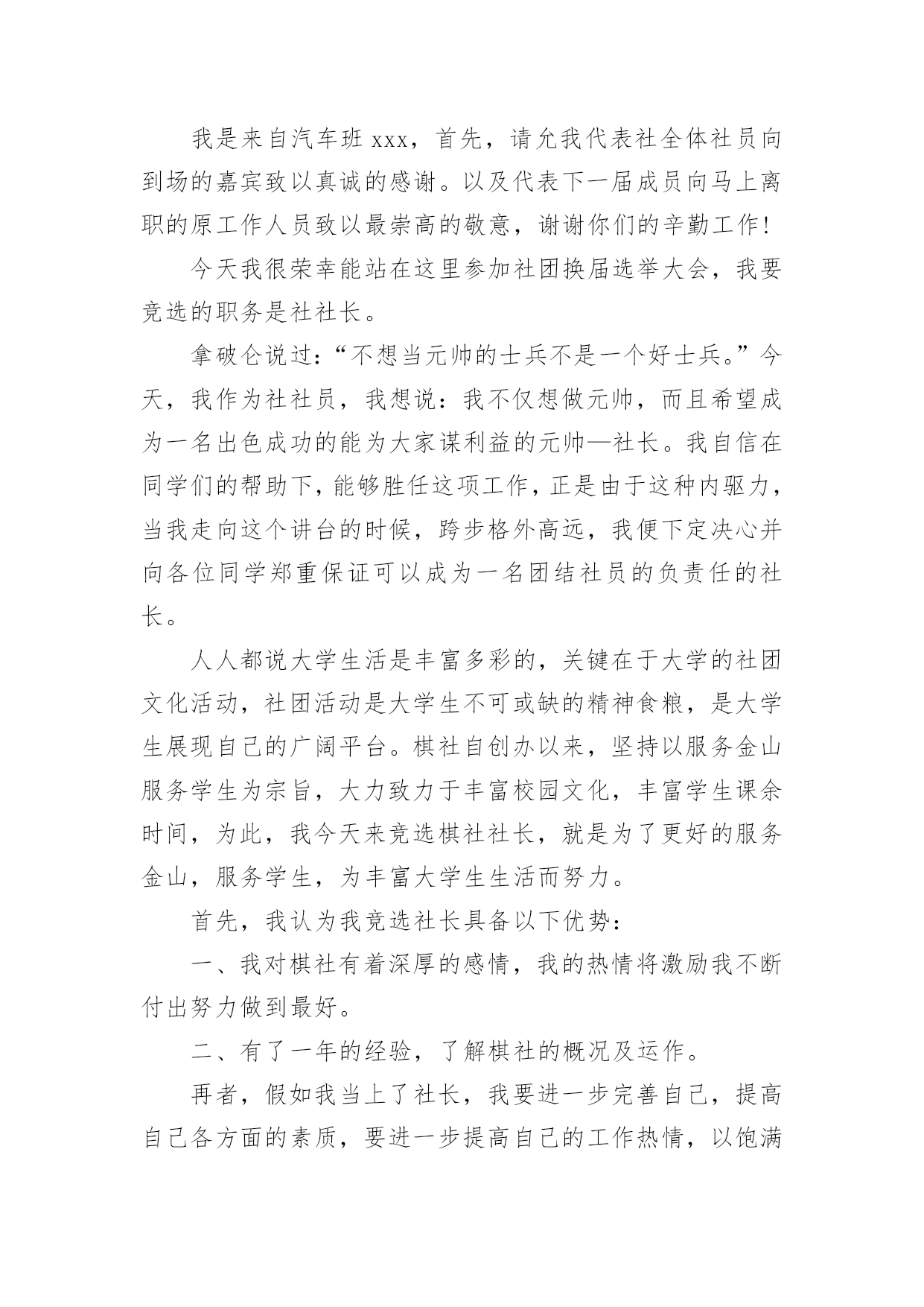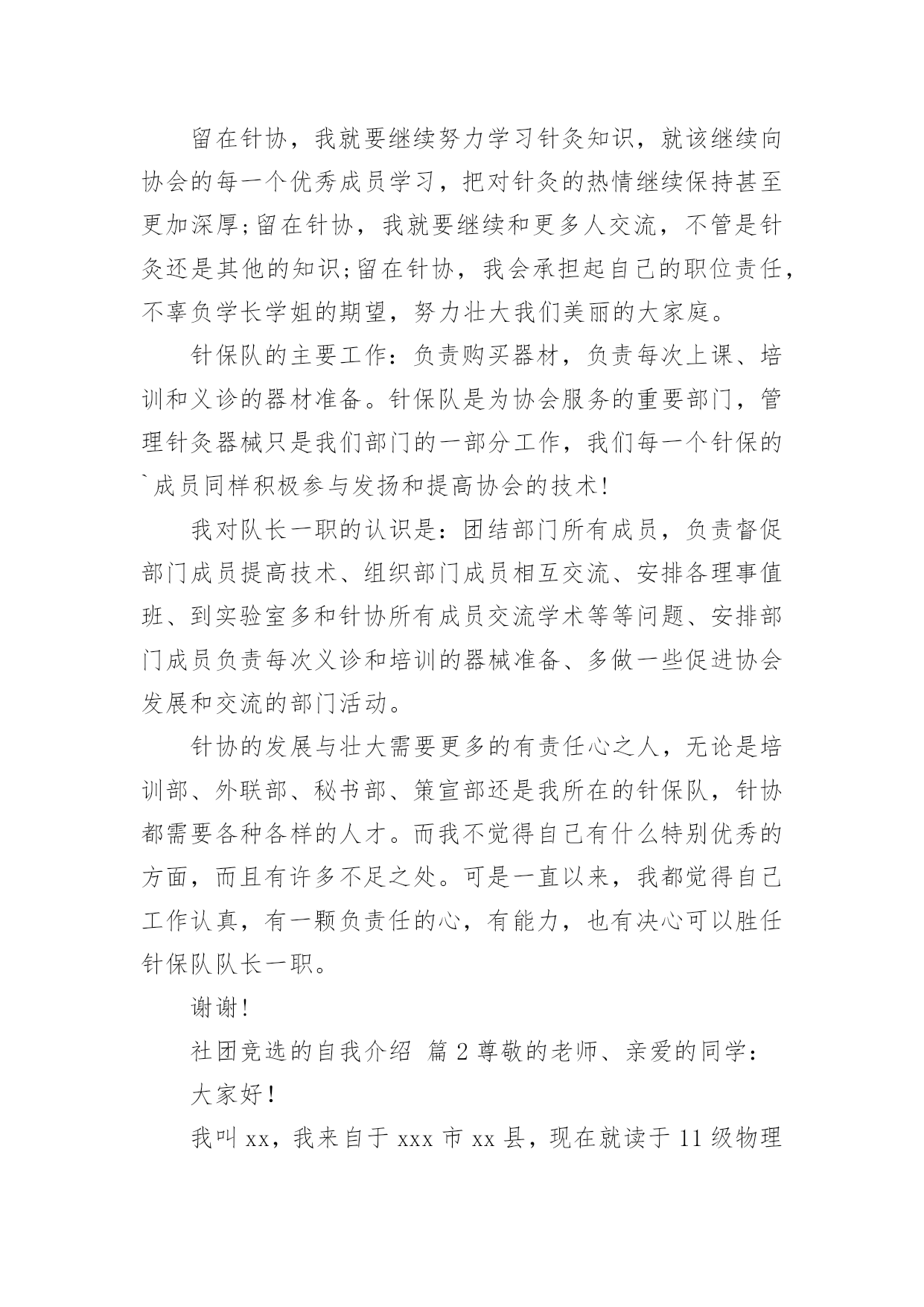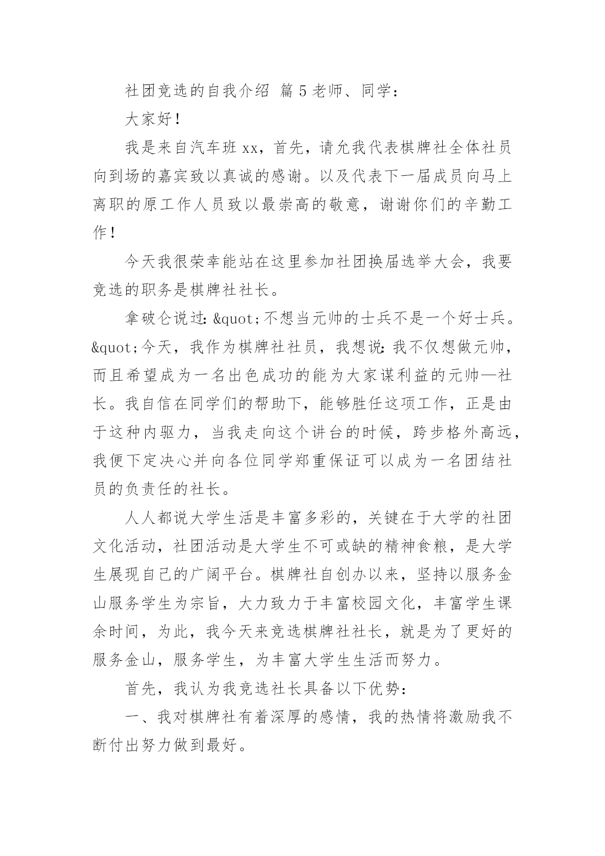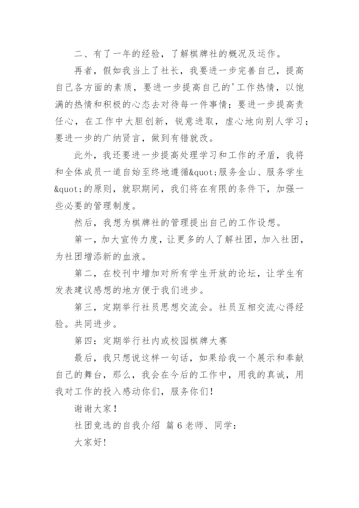 社团竞选的自我介绍社团竞选的自我介绍(精选21篇)当来到一个陌生环境中,时常要进行自己介绍,自己介绍有助于自己宣传、自己展示。怎么写自己介绍才能避免踩雷呢?以下是小编为大家收集的社团竞选的自己介绍,欢迎阅读,希望大家能够喜欢。社团竞选的自我介绍篇1尊敬的会长以及各位学长学姐、各位同学:大家下午好!我是来自针保队的xxx,认识我的人基本上都会叫我旺仔,专业是康复治疗学。我要竞选的职位是针保队队长。我觉得自己最大的特点是随和。我会懂得尊重他人的想法,积极与他人交流,遇到他人有事会积极帮忙,就算自己不懂什么也会有一份心意。在一个协会里,我认为沟通是最重要的,要是我们每一个成员都可以积极交流,并且与其他协会也积极合作,就像针协这个大家庭一样会越来越好。过去一年里,我在针保队一直工作积极、认真,也许有时候会有点马虎,可是我会不断地改进,只要是有用的建议和批评我都乐于接受,并且付诸实践。与人合作的时候我会努力完成所负的任务,并有想法地做到最好。其实和他人共事是一件很快乐的事,我乐意去在一个团队里分享自己的经验,一起为共同的目标而努力。人无完人,我相信自己可以不断地进步。留在针协,我就要继续努力学习针灸知识,就该继续向协会的每一个优秀成员学习,把对针灸的热情继续保持甚至更加深厚;留在针协,我就要继续和更多人交流,不管是针灸还是其他的知识;留在针协,我会承担起自己的职位责任,不辜负学长学姐的期望,努力壮大我们美丽的大家庭。针保队的主要工作:负责购买器材,负责每次上课、培训和义诊的器材准备。针保队是为协会服务的重要部门,管理针灸器械只是我们部门的一部分工作,我们每一个针保的`成员同样积极参与发扬和提高协会的技术!我对队长一职的认识是:团结部门所有成员,负责督促部门成员提高技术、组织部门成员相互交流、安排各理事值班、到实验室多和针协所有成员交流学术等等问题、安排部门成员负责每次义诊和培训的器械准备、多做一些促进协会发展和交流的部门活动。针协的发展与壮大需要更多的有责任心之人,无论是培训部、外联部、秘书部、策宣部还是我所在的针保队,针协都需要各种各样的人才。而我不觉得自己有什么特别优秀的方面,而且有许多不足之处。可是一直以来,我都觉得自己工作认真,有一颗负责任的心,有能力,也有决心可以胜任针保队队长一职。谢谢!社团竞选的自我介绍篇2尊敬的老师、亲爱的同学:大家好!我叫xx,我来自于xxx市xx县,现在就读于11级物理教育班,在班上担任班长一职,同时我在我们心路文学社的编辑部,另外我还在校团委社团联合部。我是一个乐观、积极进取、认真负责、活泼开朗的人,平时喜欢唱歌、打乒乓球等。我今天所参加竞选的是社长一职,我相信经过我大一,一年努力和以前积累的经验,我有信心带领我们心路展望未来,让心路的明天更加美好!当然,我也有许多不足之处,如果大家给我当社长这一职,我一定会更加努力的去完善和改正,我当社长的目的是,提高自己的总合素质、丰富自己的大学生活和认识更多的朋友,以便于将来毕业以后能很快的适应复杂多变的社会。没有目标或理想的人生是空虚的,是盲目的,当然我不是这样的人,我希望在大学期间把自己的综合素质提高,做一个对社会有用的人。而不是像一部分同学一样:除了上课外就是,吃了睡或天天过两个人的生活。我之所以参加心路,是因为我喜爱心路,希望得到锻炼学到东西,经过一年学习和锻炼,我感觉我当初选择心路是正确的',所以我希望大家给我一个机会担任社长,让我得到更多的锻炼,如果我能成功竞选,我将退出校团委的社团联合部和辞去班长一职,让更多的人的到锻炼。我会努力的把心路办得更加美好,让每一个心路充分发挥各自所长,在我们社团充分得到锻炼,让大家感觉当初的选择没错。当然,我也会不断的跟老师、同学学习,举办许多健康、积极有意的活动,让大家感觉,以我是心路人而骄傲。如果我今天没成功竞选,我也不会气累的,我以后会更加努力的学习和工作。来吧!尊敬的老师、亲爱的同学!请投出你们那神圣的一票支持我吧!谢谢大家!社团竞选的自我介绍篇3大家好!我是五一班的xxx。在这春暖花开、生机勃勃的新学期里,我幸运地成为了演讲社团的一员,并且十分荣幸地参加本次社长竞选。我很清楚,我们在座的同学个个都很厉害,有的能歌善舞,有的'伶牙俐齿,有的品学兼优……但我充分相信自己的能力。妈妈常对我说:"一个人如果连自己都不相信,那么他就没有资格做任何事,即使做了,也很难成功!"我之所以能够站在这里,是由于我的自信!竞选社长,是一种荣誉,更是一种责任。我知道这条路上有许多挑战,但我自信我有能力担起这副担子,因为我的热情,我的毅力,我实事求是的学习态度。如果我有幸当选,我将以良好的精神状态担负起这份责任,和同学们一起努力,练就一副好口才。最后,我真诚希望老师和同学们能给我这次展示能力的机会,支持我,请