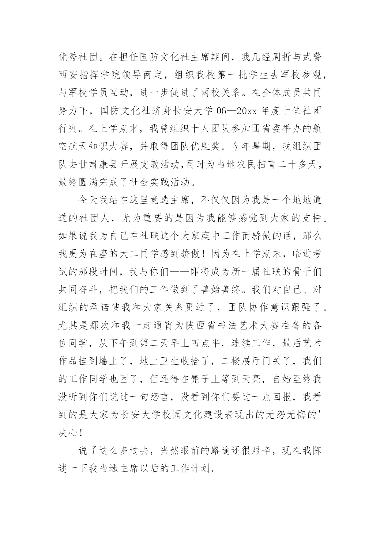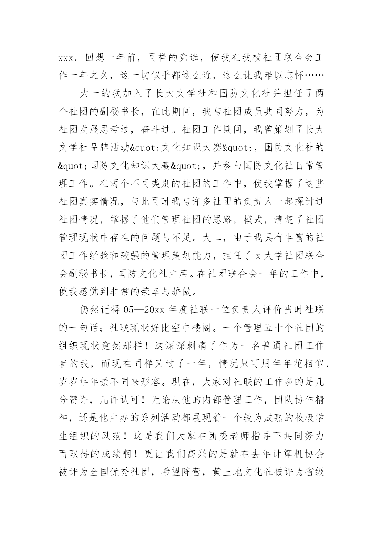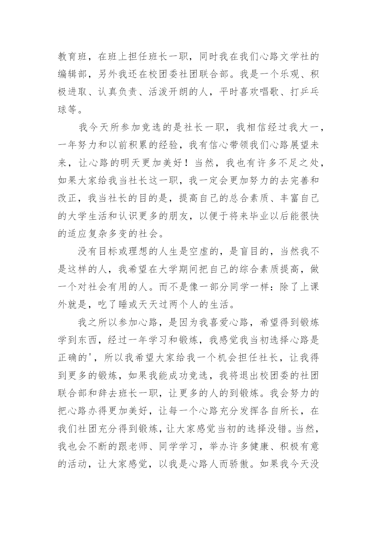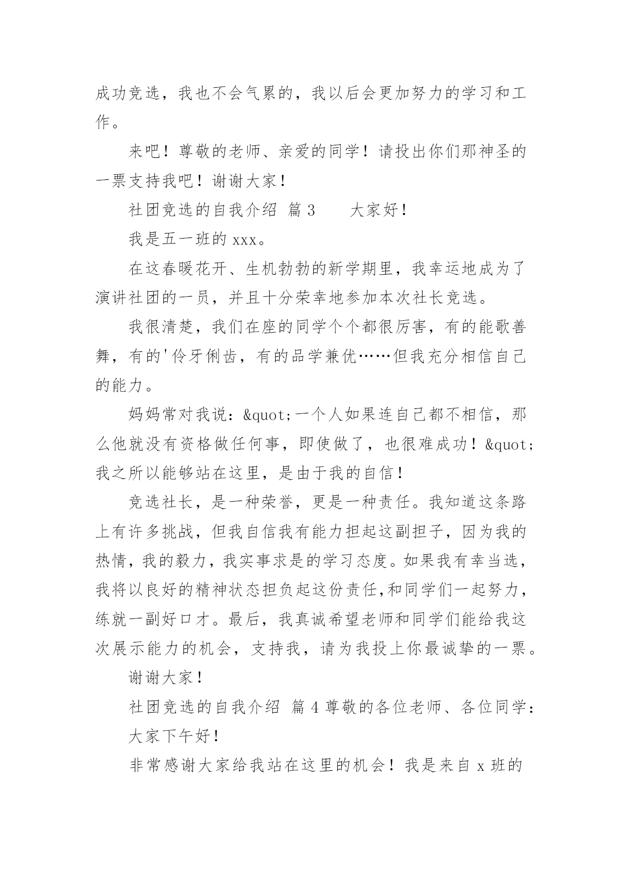 社团竞选的自我介绍社团竞选的自我介绍(精选21篇)当来到一个陌生环境中,时常要进行自己介绍,自己介绍有助于自己宣传、自己展示。怎么写自己介绍才能避免踩雷呢?以下是小编为大家收集的社团竞选的自己介绍,欢迎阅读,希望大家能够喜欢。社团竞选的自我介绍篇1尊敬的会长以及各位学长学姐、各位同学:大家下午好!我是来自针保队的xxx,认识我的人基本上都会叫我旺仔,专业是康复治疗学。我要竞选的职位是针保队队长。我觉得自己最大的特点是随和。我会懂得尊重他人的想法,积极与他人交流,遇到他人有事会积极帮忙,就算自己不懂什么也会有一份心意。在一个协会里,我认为沟通是最重要的,要是我们每一个成员都可以积极交流,并且与其他协会也积极合作,就像针协这个大家庭一样会越来越好。过去一年里,我在针保队一直工作积极、认真,也许有时候会有点马虎,可是我会不断地改进,只要是有用的建议和批评我都乐于接受,并且付诸实践。与人合作的时候我会努力完成所负的任务,并有想法地做到最好。其实和他人共事是一件很快乐的事,我乐意去在一个团队里分享自己的经验,一起为共同的目标而努力。人无完人,我相信自己可以不断地进步。留在针协,我就要继续努力学习针灸知识,就该继续向协会的每一个优秀成员学习,把对针灸的热情继续保持甚至更加深厚;留在针协,我就要继续和更多人交流,不管是针灸还是其他的知识;留在针协,我会承担起自己的职位责任,不辜负学长学姐的期望,努力壮大我们美丽的大家庭。针保队的主要工作:负责购买器材,负责每次上课、培训和义诊的器材准备。针保队是为协会服务的重要部门,管理针灸器械只是我们部门的一部分工作,我们每一个针保的`成员同样积极参与发扬和提高协会的技术!我对队长一职的认识是:团结部门所有成员,负责督促部门成员提高技术、组织部门成员相互交流、安排各理事值班、到实验室多和针协所有成员交流学术等等问题、安排部门成员负责每次义诊和培训的器械准备、多做一些促进协会发展和交流的部门活动。针协的发展与壮大需要更多的有责任心之人,无论是培训部、外联部、秘书部、策宣部还是我所在的针保队,针协都需要各种各样的人才。而我不觉得自己有什么特别优秀的方面,而且有许多不足之处。可是一直以来,我都觉得自己工作认真,有一颗负责任的心,有能力,也有决心可以胜任针保队队长一职。谢谢!社团竞选的自我介绍篇2尊敬的老师、亲爱的同学:大家好!我叫xx,我来自于xxx市xx县,现在就读于11级物理教育班,在班上担任班长一职,同时我在我们心路文学社的编辑部,另外我还在校团委社团联合部。我是一个乐观、积极进取、认真负责、活泼开朗的人,平时喜欢唱歌、打乒乓球等。我今天所参加竞选的是社长一职,我相信经过我大一,一年努力和以前积累的经验,我有信心带领我们心路展望未来,让心路的明天更加美好!当然,我也有许多不足之处,如果大家给我当社长这一职,我一定会更加努力的去完善和改正,我当社长的目的是,提高自己的总合素质、丰富自己的大学生活和认识更多的朋友,以便于将来毕业以后能很快的适应复杂多变的社会。没有目标或理想的人生是空虚的,是盲目的,当然我不是这样的人,我希望在大学期间把自己的综合素质提高,做一个对社会有用的人。而不是像一部分同学一样:除了上课外就是,吃了睡或天天过两个人的生活。我之所以参加心路,是因为我喜爱心路,希望得到锻炼学到东西,经过一年学习和锻炼,我感觉我当初选择心路是正确的',所以我希望大家给我一个机会担任社长,让我得到更多的锻炼,如果我能成功竞选,我将退出校团委的社团联合部和辞去班长一职,让更多的人的到锻炼。我会努力的把心路办得更加美好,让每一个心路充分发挥各自所长,在我们社团充分得到锻炼,让大家感觉当初的选择没错。当然,我也会不断的跟老师、同学学习,举办许多健康、积极有意的活动,让大家感觉,以我是心路人而骄傲。如果我今天没成功竞选,我也不会气累的,我以后会更加努力的学习和工作。来吧!尊敬的老师、亲爱的同学!请投出你们那神圣的一票支持我吧!谢谢大家!社团竞选的自我介绍篇3大家好!我是五一班的xxx。在这春暖花开、生机勃勃的新学期里,我幸运地成为了演讲社团的一员,并且十分荣幸地参加本次社长竞选。我很清楚,我们在座的同学个个都很厉害,有的能歌善舞,有的'伶牙俐齿,有的品学兼优……但我充分相信自己的能力。妈妈常对我说:"一个人如果连自己都不相信,那么他就没有资格做任何事,即使做了,也很难成功!"我之所以能够站在这里,是由于我的自信!竞选社长,是一种荣誉,更是一种责任。我知道这条路上有许多挑战,但我自信我有能力担起这副担子,因为我的热情,我的毅力,我实事求是的学习态度。如果我有幸当选,我将以良好的精神状态担负起这份责任,和同学们一起努力,练就一副好口才。最后,我真诚希望老师和同学们能给我这次展示能力的机会,支持我,请