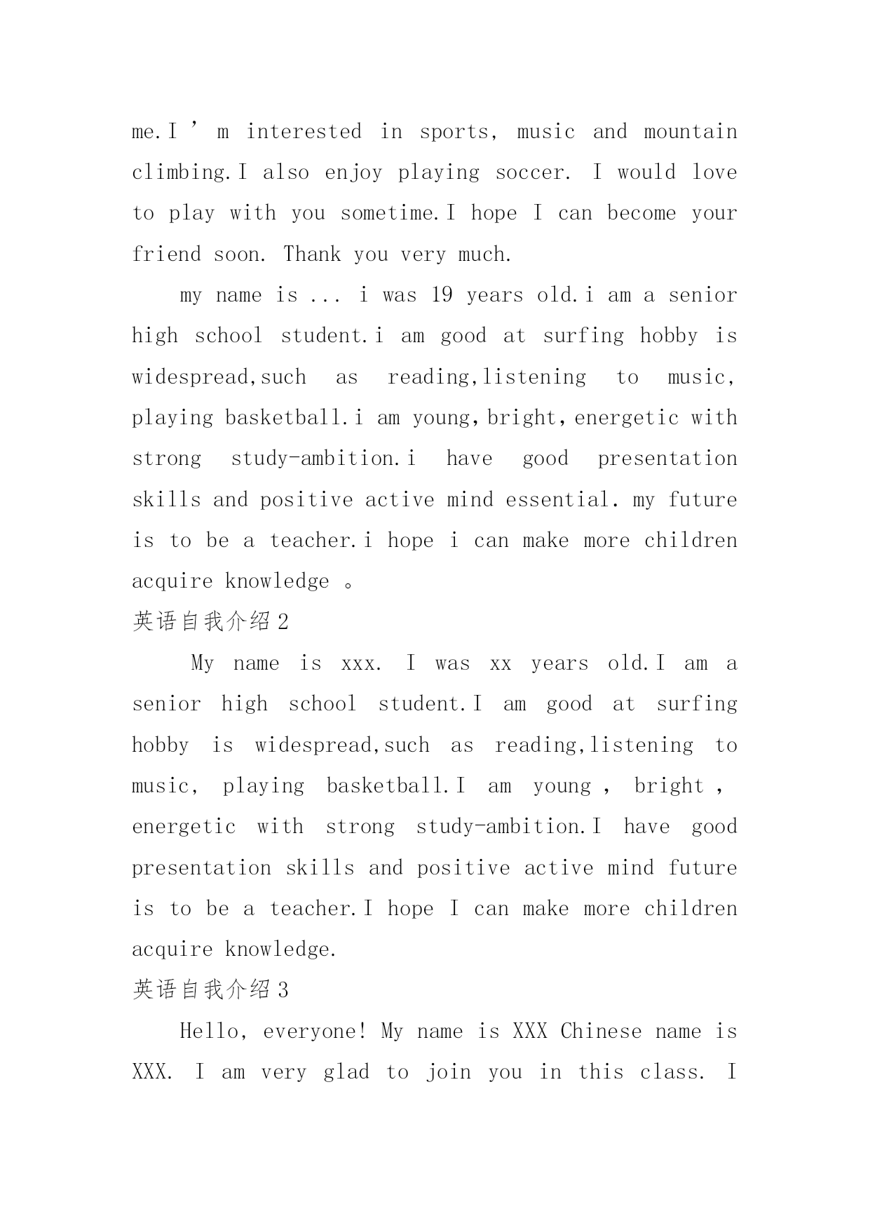 英语自我介绍英语自我介绍必备13篇初到一个新的环境,可能需要我们进行自我介绍,自我介绍可以唤起他人对我们的兴趣。那要怎么写好自我介绍呢?下面是小编精心整理的英语自我介绍,仅供参考,大家一起来看看吧。英语自我介绍1MynameisChinesenameisxxx.Iamverygladtojoinyouinthisclass.Ijustgraduatedfromseniorhighschool.IlikeBritainverymuch,soifIcouldstudyinBritainoneday,Iwouldbeveryhappy.ButmyEnglishisnotverygoodnow.SoI’dliketoimprovemyEnglishinthisclass.AndverygladtoseeourteacherMr/Mrs.Thankyou.Helloeverybody.MynameisStone.IcomefromGuangdongprovinceinChina.IamveryhappytocomeheretostudywithIarrivedatthisschoolthreedaysago,Ifellinlovewithissobeautifulandexcitinghere,andeveryoneiskindtomeespeciallyclassfeelsjustlikeonebigfamilytome.I’minterestedinsports,musicandmountainclimbing.Ialsoenjoyplayingsoccer.Iwouldlovetoplaywithyousometime.IhopeIcanbecomeyourfriendsoon.Thankyouverymuch.mynameis...iwas19yearsold.iamaseniorhighschoolstudent.iamgoodatsurfinghobbyiswidespread,suchasreading,listeningtomusic,playingbasketball.iamyoung,bright,energeticwithstrongstudy-ambition.ihavegoodpresentationskillsandpositiveactivemindessential.myfutureistobeateacher.ihopeicanmakemorechildrenacquireknowledge。英语自我介绍2Mynameisxxx.Iwasxxyearsold.Iamaseniorhighschoolstudent.Iamgoodatsurfinghobbyiswidespread,suchasreading,listeningtomusic,playingbasketball.Iamyoung,bright,energeticwithstrongstudy-ambition.Ihavegoodpresentationskillsandpositiveactivemindfutureistobeateacher.IhopeIcanmakemorechildrenacquireknowledge.英语自我介绍3Hello,everyone!MynameisXXXChinesenameisXXX.Iamverygladtojoinyouinthisclass.Ijustgraduatedfromseniorhighschool.IlikeBritainverymuch,soifIcouldstudyinBritainoneday,Iwouldbeveryhappy.ButmyEnglishisnotverygoodnow.SoI'dliketoimprovemyEnglishinthisclass.AndverygladtoseeourteacherMrXXX/MrsXXX.Thankyou.英语自我介绍4Helloeverybody.MynameisStone.IcomefromGuangdongprovinceinChina.IamveryhappytocomeheretostudywithIarrivedatthisschoolthreedaysago,Ifellinlovewithissobeautifulandexcitinghere,andeveryoneiskindtomeeeciallyclassfeelsjustlikeonebigfamilytome.I’minterestedinorts,musicandmountainclimbing.Ialsoenjoyplayingsoccer