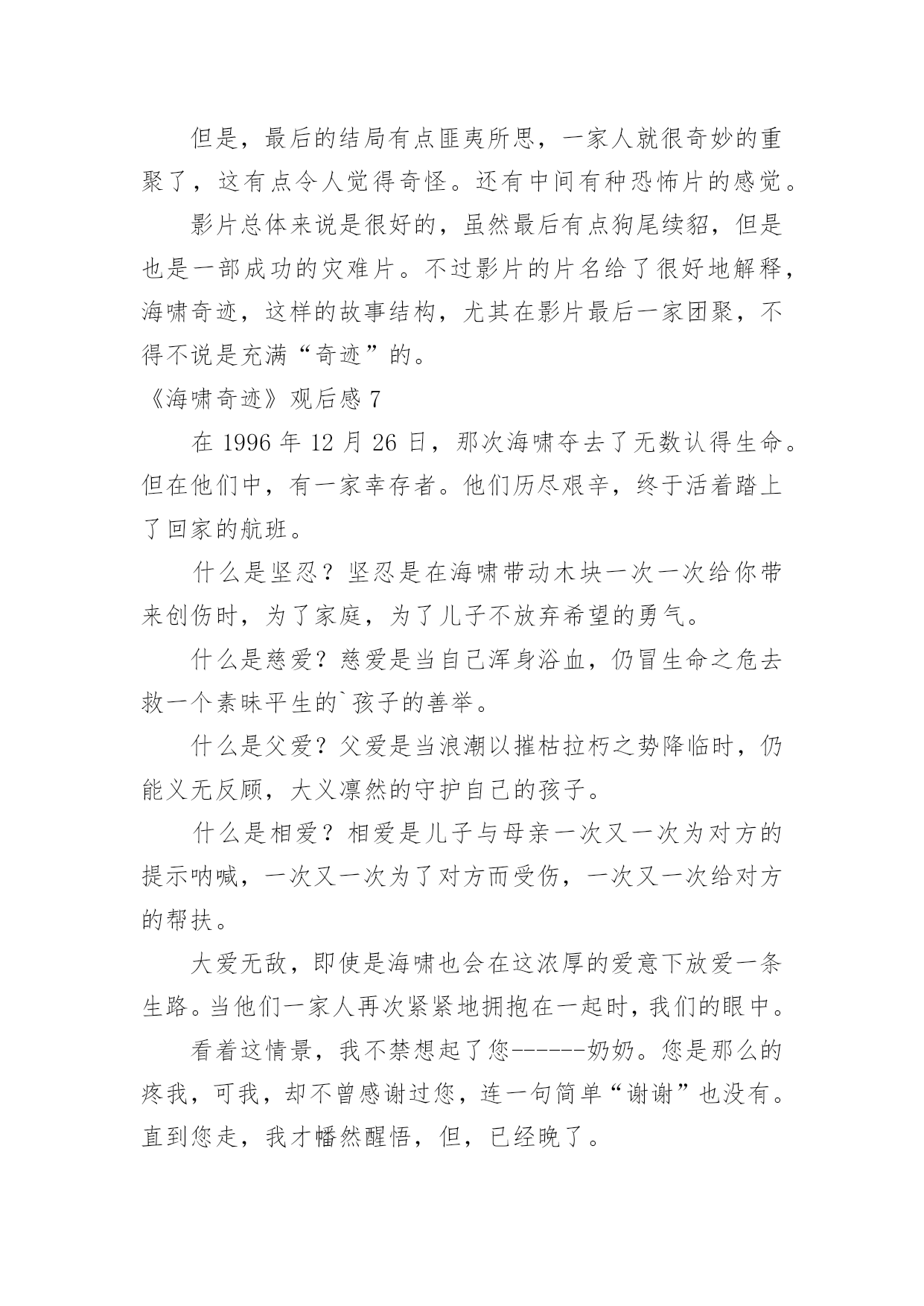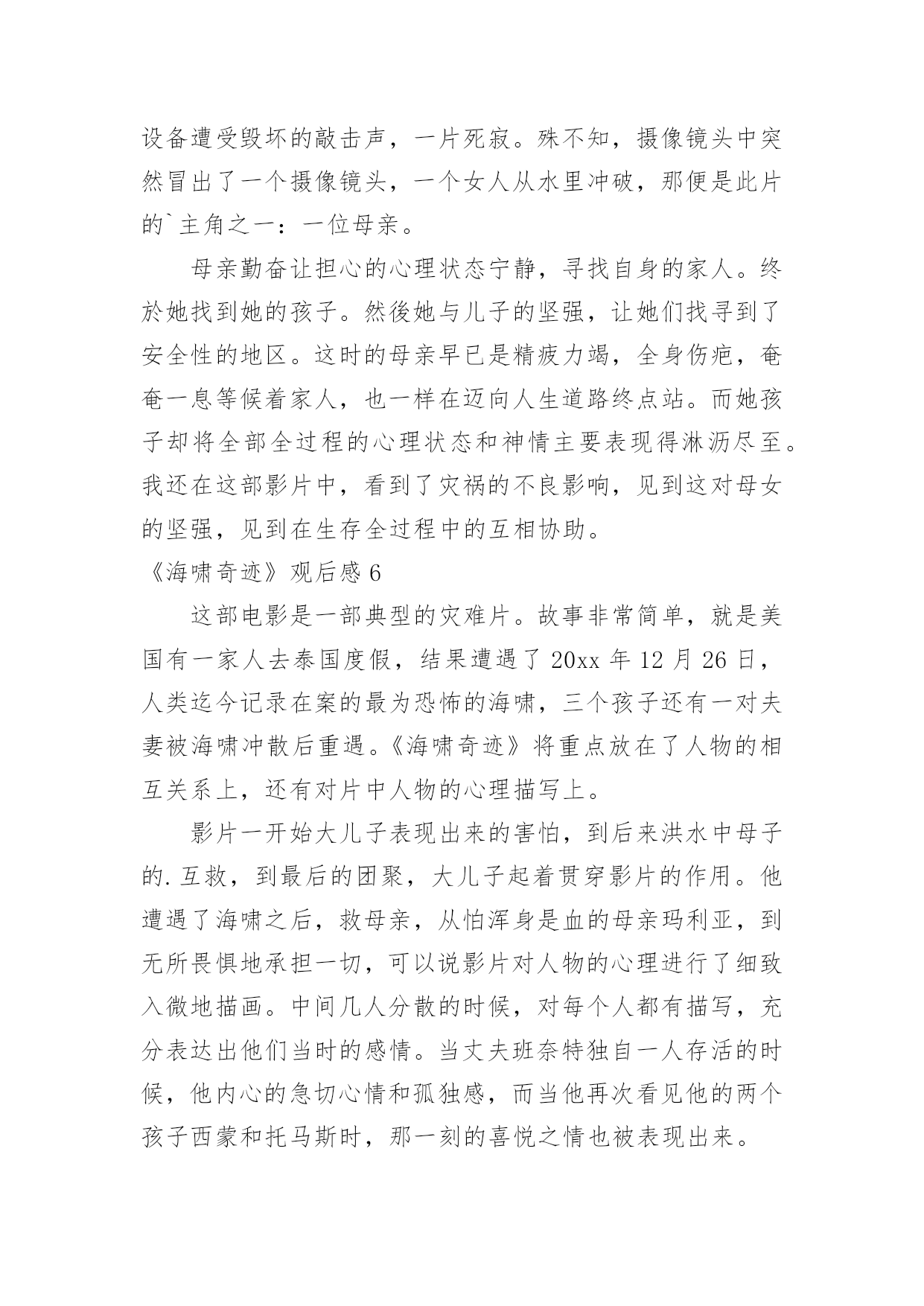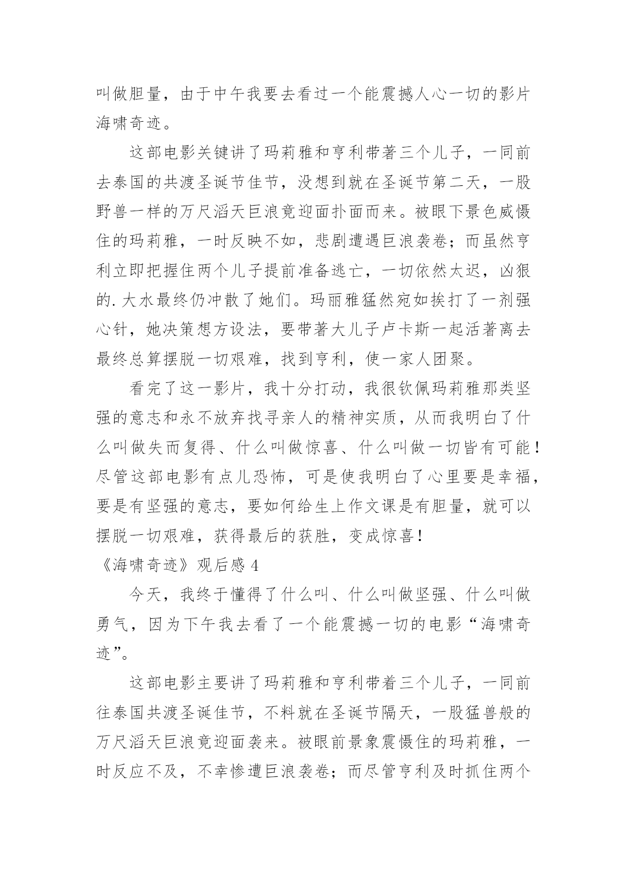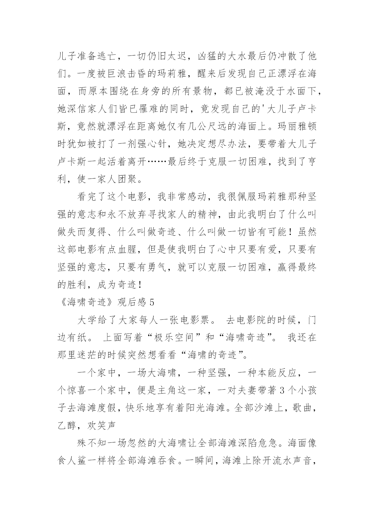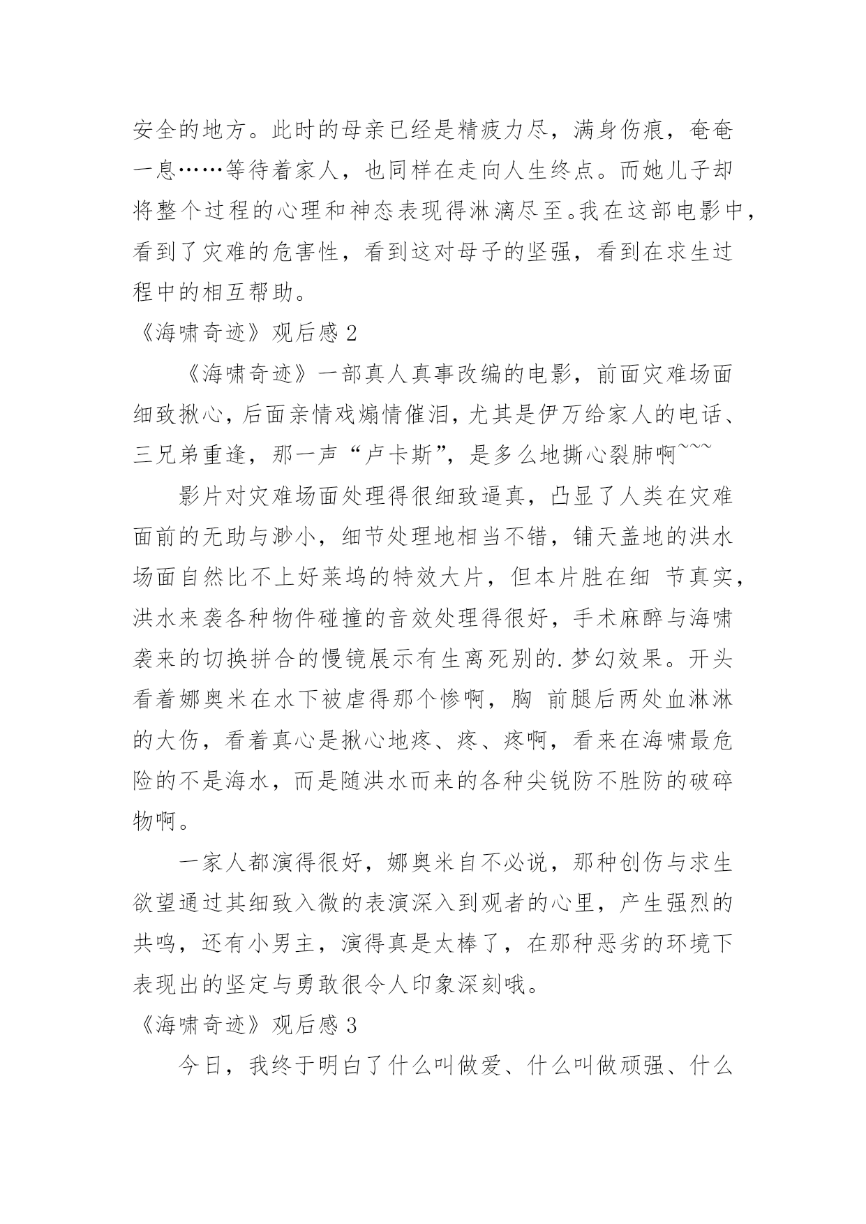 《海啸奇迹》观后感《海啸奇迹》观后感看完某一作品后,相信大家一定领会了不少东西,这时候最关键的观后感不能忘了。那么观后感到底应该怎么写呢?以下是小编为大家整理的《海啸奇迹》观后感,仅供参考,希望能够帮助到大家。《海啸奇迹》观后感1学校给了我们每个人一张的电影票,我去电影院的时候门上有一张纸,上面写着《极乐空间》和《海啸奇迹》,我在那里犹豫不决的时候突然心血来潮决定看《海啸奇迹》一个家庭,一场海啸,一种坚强,一种本能,一个奇迹一个家庭,就是主角这一家,一对夫妻带着3个小孩去海边度假,快乐地享受着阳光沙滩。整个沙滩上,音乐,酒精,欢笑声……然而一场突然的海啸让整个海滩陷入危难。海水像食人鲨一样将整个海滩吞噬。瞬间,海滩上除了流水的声音,设施遭到破坏的撞击声,一片死寂。然而,镜头中突然出现了了一个镜头,一个女人从水中冲出,那就是本片的主角之一:一位母亲。母亲努力让害怕的.心理平静,找寻自己的家人。终於她找到了她的儿子。然後她和儿子的坚强,让他们找寻到了安全的地方。此时的母亲已经是精疲力尽,满身伤痕,奄奄一息……等待着家人,也同样在走向人生终点。而她儿子却将整个过程的心理和神态表现得淋漓尽至。我在这部电影中,看到了灾难的危害性,看到这对母子的坚强,看到在求生过程中的相互帮助。《海啸奇迹》观后感2《海啸奇迹》一部真人真事改编的电影,前面灾难场面细致揪心,后面亲情戏煽情催泪,尤其是伊万给家人的电话、三兄弟重逢,那一声“卢卡斯”,是多么地撕心裂肺啊~~~影片对灾难场面处理得很细致逼真,凸显了人类在灾难面前的无助与渺小,细节处理地相当不错,铺天盖地的洪水场面自然比不上好莱坞的特效大片,但本片胜在细节真实,洪水来袭各种物件碰撞的音效处理得很好,手术麻醉与海啸袭来的切换拼合的慢镜展示有生离死别的.梦幻效果。开头看着娜奥米在水下被虐得那个惨啊,胸前腿后两处血淋淋的大伤,看着真心是揪心地疼、疼、疼啊,看来在海啸最危险的不是海水,而是随洪水而来的各种尖锐防不胜防的破碎物啊。一家人都演得很好,娜奥米自不必说,那种创伤与求生欲望通过其细致入微的表演深入到观者的心里,产生强烈的共鸣,还有小男主,演得真是太棒了,在那种恶劣的环境下表现出的坚定与勇敢很令人印象深刻哦。《海啸奇迹》观后感3今日,我终于明白了什么叫做爱、什么叫做顽强、什么叫做胆量,由于中午我要去看过一个能震撼人心一切的影片海啸奇迹。这部电影关键讲了玛莉雅和亨利带著三个儿子,一同前去泰国的共渡圣诞节佳节,没想到就在圣诞节第二天,一股野兽一样的万尺滔天巨浪竟迎面扑面而来。被眼下景色威慑住的玛莉雅,一时反映不如,悲剧遭遇巨浪袭卷;而虽然亨利立即把握住两个儿子提前准备逃亡,一切依然太迟,凶狠的.大水最终仍冲散了她们。玛丽雅猛然宛如挨打了一剂强心针,她决策想方设法,要带著大儿子卢卡斯一起活著离去最终总算摆脱一切艰难,找到亨利,使一家人团聚。看完了这一影片,我十分打动,我很钦佩玛莉雅那类坚强的意志和永不放弃找寻亲人的精神实质,从而我明白了什么叫做失而复得、什么叫做惊喜、什么叫做一切皆有可能!尽管这部电影有点儿恐怖,可是使我明白了心里要是幸福,要是有坚强的意志,要如何给生上作文课是有胆量,就可以摆脱一切艰难,获得最后的获胜,变成惊喜!《海啸奇迹》观后感4今天,我终于懂得了什么叫、什么叫做坚强、什么叫做勇气,因为下午我去看了一个能震撼一切的电影“海啸奇迹”。这部电影主要讲了玛莉雅和亨利带着三个儿子,一同前往泰国共渡圣诞佳节,不料就在圣诞节隔天,一股猛兽般的万尺滔天巨浪竟迎面袭来。被眼前景象震慑住的玛莉雅,一时反应不及,不幸惨遭巨浪袭卷;而尽管亨利及时抓住两个儿子准备逃亡,一切仍旧太迟,凶猛的大水最后仍冲散了他们。一度被巨浪击昏的玛莉雅,醒来后发现自己正漂浮在海面,而原本围绕在身旁的所有景物,都已被淹没于水面下,她深信家人们皆已罹难的同时,竟发现自己的'大儿子卢卡斯,竟然就漂浮在距离她仅有几公尺远的海面上。玛丽雅顿时犹如被打了一剂强心针,她决定想尽办法,要带着大儿子卢卡斯一起活着离开……最后终于克服一切困难,找到了亨利,使一家人团聚。看完了这个电影,我非常感动,我很佩服玛莉雅那种坚强的意志和永不放弃寻找家人的精神,由此我明白了什么叫做失而复得、什么叫做奇迹、什么叫做一切皆有可能!虽然这部电影有点血腥,但是使我明白了心中只要有爱,只要有坚强的意志,只要有勇气,就可以克服一切困难,赢得最终的胜利,成为奇迹!《海啸奇迹》观后感5大学给了大家每人一张电影票。去电影院的时候,门边有纸。上面写着“极乐空间”和“海啸奇迹”。我还在那里迷茫的时候突然想看看“海啸的奇迹”。一个家中,一场大海啸,一种坚强,一种本能反应,一个惊喜一个家中,便是主角这一家,一对夫妻带著3个小孩子去海滩度假,快乐地享有着阳光海滩。全部沙滩上,歌曲,乙醇,