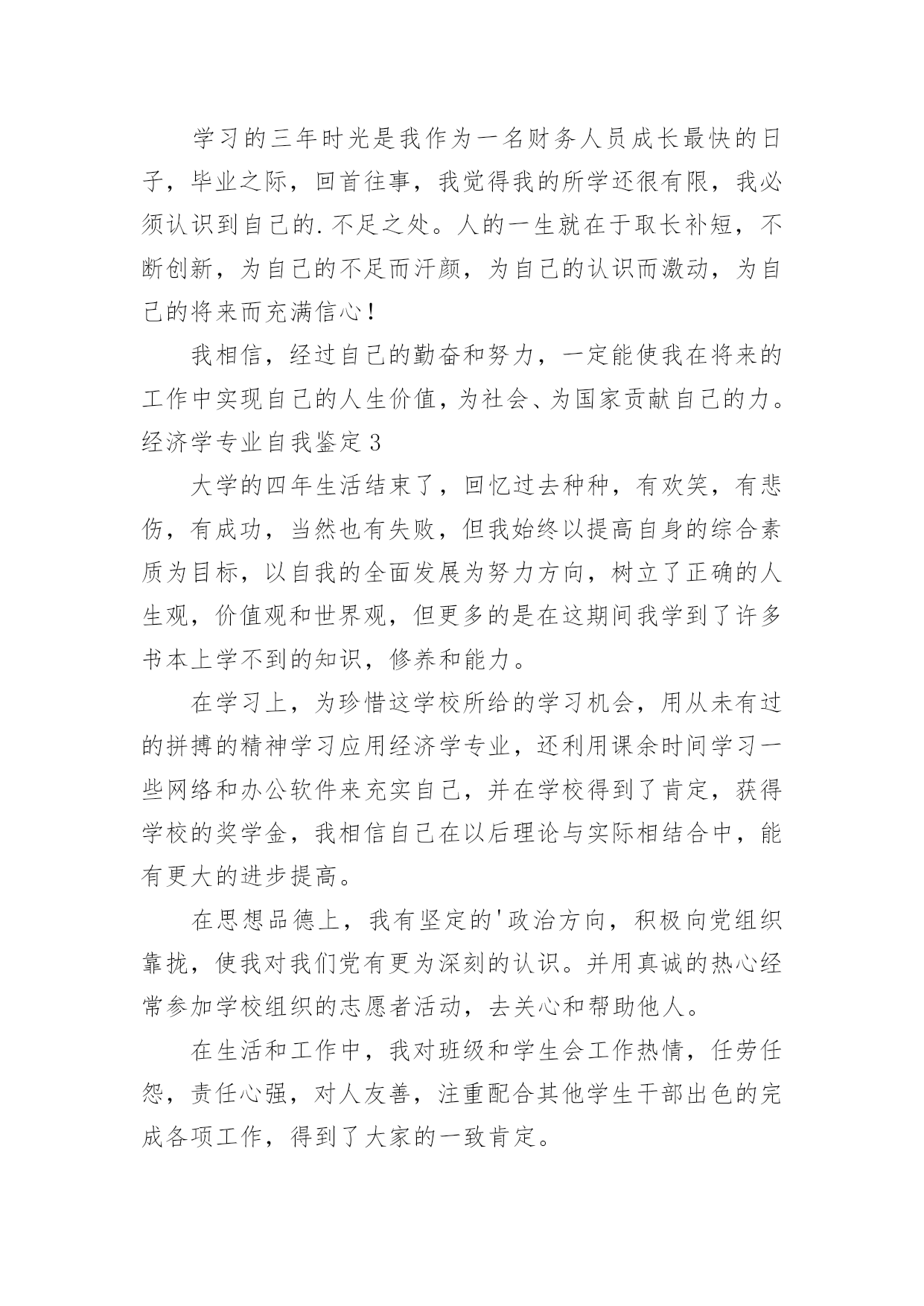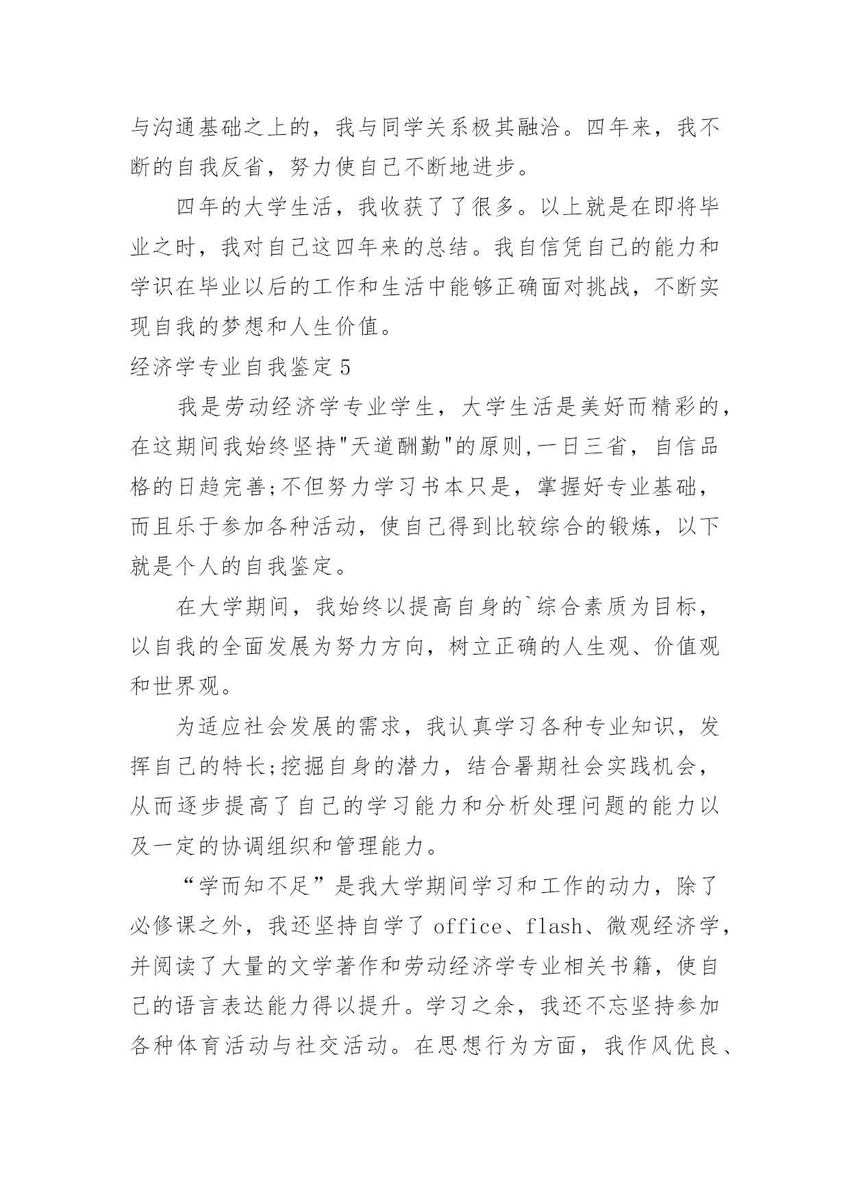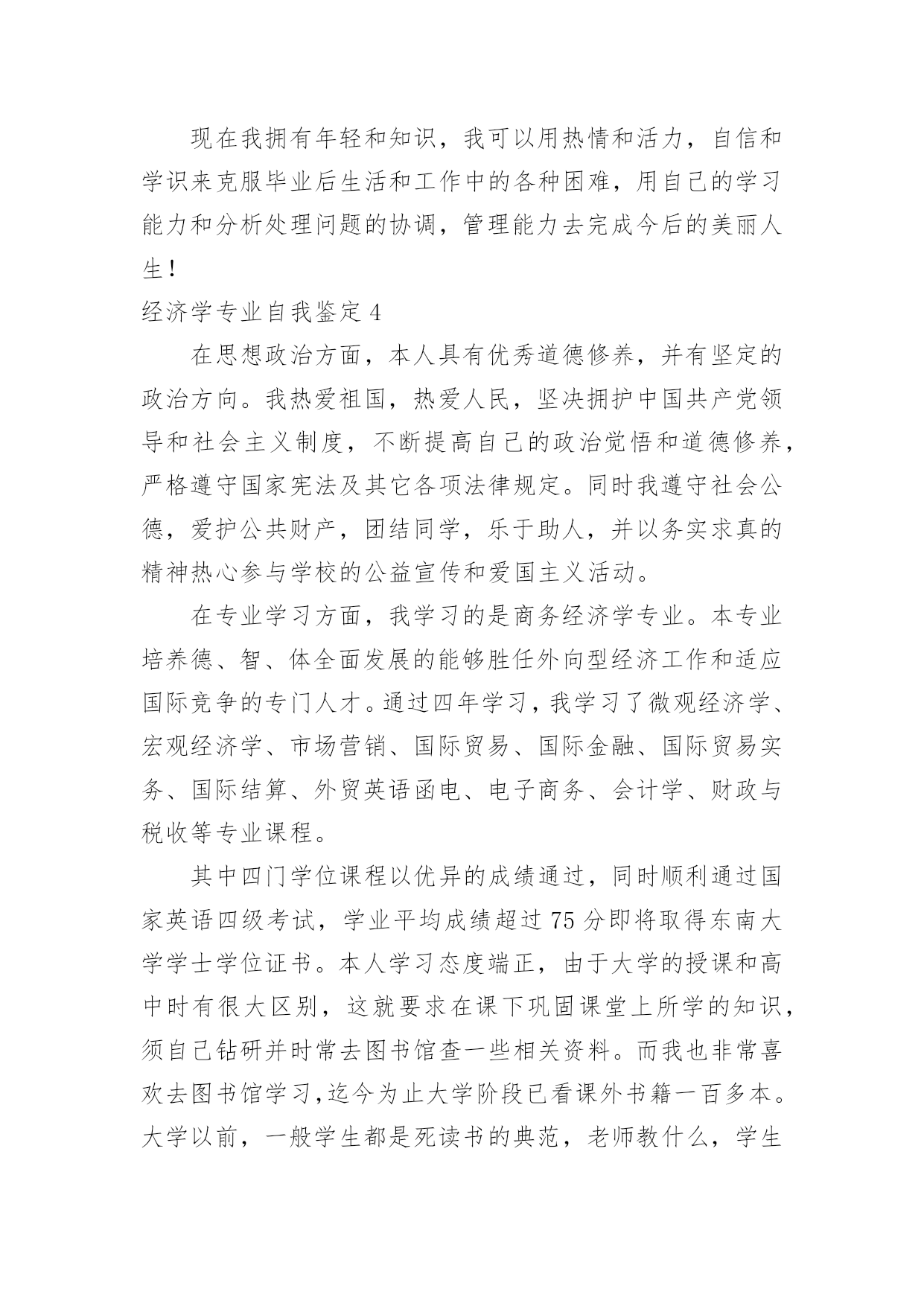经济学专业自我鉴定经济学专业自我鉴定自我鉴定是个人对一个时期的学习或工作进行自我总结,它可以帮助我们有寻找学习和工作中的规律,因此好好准备一份自我鉴定吧。但是却发现不知道该写些什么,下面是小编收集整理的经济学专业自我鉴定,欢迎阅读,希望大家能够喜欢。经济学专业自我鉴定1本人觉得自己做事认真负责,有较强的工作责任感,做事有始有终;比较能够吃苦耐劳,任劳任怨,不畏艰难也要将工作尽力做好;敢于求实创新,有创新意识和一定的创造能力;爱岗敬业,能和工作伙伴和谐相处,并且有一定的组织协调能力,有较强的团队意识,为了公司的利益共同努力工作;有较强的承受压力的'能力,面对失败和挫折能够较好处理好自己的情绪,自我感觉是一个比较坚强的人;生活上较提倡节俭,热爱参与集体活动,热爱生活。通过四年的大学生活,我学到了很多知识,更重要的是有了较快掌握一种新事物的能力。思想变得成熟了许多,性格更坚毅了。认识了许多老师和同学,建立起友谊,并在与他们的交往中提升了自身素质,认清了自身的一些短处并尽力改正。社会实践能力也有很大提高,为将来走向社会奠定了基础。四年的校园生活和社会实践活动,我不断的挑战自我、充实自己,为实现人生的价值打下坚实的基础,我自信经过了生活的磨练和自我的修养,我已是一个能适应社会要求的新时代大学生,我坚信在将来的工作岗位上我能做得更好。经济学专业自我鉴定2我怀着无比激动的心情考入了渴望已久的xx函授大专班,进行学习三年的经济管理专业。三年的专科函授生活已接近尾声,虽然我们都是已经走上工作岗位的学生,不能象全日制学生那样全天候的在母校学习、生活,但这种工作、学习、实践、再学习、再实践的学习模式,使我受益匪浅。回顾这三年的学习历程,感受颇多。在这里,教师的博学,同学的真诚,虽说已经都是工作了的人,但那般情景,那份纯洁,真仿佛让我一下子回到了学生时代,本人自小就接受长辈和老师的良好思想道德教育,严格要求自己,为人诚实,勤奋好学,不断求上进,在这三年里,使自己变得更加坚强。作为一名会计专业人员,本人热爱本专业并为其投入了巨大的热情和精力。本人思想积极上进,性格开朗,生活作风严谨,责任心强,办事沉稳、执着,能吃苦耐劳,适应性强,具有良好的心理素质。本人积极要求上进,热爱祖国。在学习过程中,我注重理论与实际相结合,使我在以后的工作和学习中努力增加。结合工作实践和党校学习,在尾声快要结束时我换来的是一份成熟和宁静。回首过去,总结过去的日子,感慨万分。学习的三年时光是我作为一名财务人员成长最快的日子,毕业之际,回首往事,我觉得我的所学还很有限,我必须认识到自己的.不足之处。人的一生就在于取长补短,不断创新,为自己的不足而汗颜,为自己的认识而激动,为自己的将来而充满信心!我相信,经过自己的勤奋和努力,一定能使我在将来的工作中实现自己的人生价值,为社会、为国家贡献自己的力。经济学专业自我鉴定3大学的四年生活结束了,回忆过去种种,有欢笑,有悲伤,有成功,当然也有失败,但我始终以提高自身的综合素质为目标,以自我的全面发展为努力方向,树立了正确的人生观,价值观和世界观,但更多的是在这期间我学到了许多书本上学不到的知识,修养和能力。在学习上,为珍惜这学校所给的学习机会,用从未有过的拼搏的精神学习应用经济学专业,还利用课余时间学习一些网络和办公软件来充实自己,并在学校得到了肯定,获得学校的奖学金,我相信自己在以后理论与实际相结合中,能有更大的进步提高。在思想品德上,我有坚定的'政治方向,积极向党组织靠拢,使我对我们党有更为深刻的认识。并用真诚的热心经常参加学校组织的志愿者活动,去关心和帮助他人。在生活和工作中,我对班级和学生会工作热情,任劳任怨,责任心强,对人友善,注重配合其他学生干部出色的完成各项工作,得到了大家的一致肯定。现在我拥有年轻和知识,我可以用热情和活力,自信和学识来克服毕业后生活和工作中的各种困难,用自己的学习能力和分析处理问题的协调,管理能力去完成今后的美丽人生!经济学专业自我鉴定4在思想政治方面,本人具有优秀道德修养,并有坚定的政治方向。我热爱祖国,热爱人民,坚决拥护中国共产党领导和社会主义制度,不断提高自己的政治觉悟和道德修养,严格遵守国家宪法及其它各项法律规定。同时我遵守社会公德,爱护公共财产,团结同学,乐于助人,并以务实求真的精神热心参与学校的公益宣传和爱国主义活动。在专业学习方面,我学习的是商务经济学专业。本专业培养德、智、体全面发展的能够胜任外向型经济工作和适应国际竞争的专门人才。通过四年学习,我学习了微观经济学、宏观经济学、市场营销、国际贸易、国际金融、国际贸易实务、国际结算、外贸英语函电、电子商务、会计学、财政与税收等专业课程。其中四门学位课程以优异的成绩通过,同时顺利通过国家英语四级考试,学业平均成绩超过75分即将取得东南大学学士学