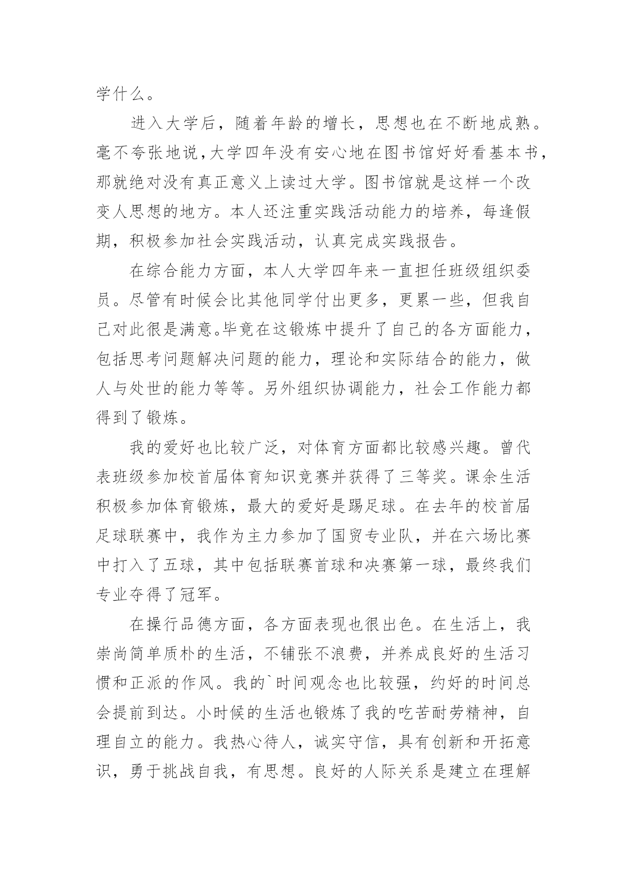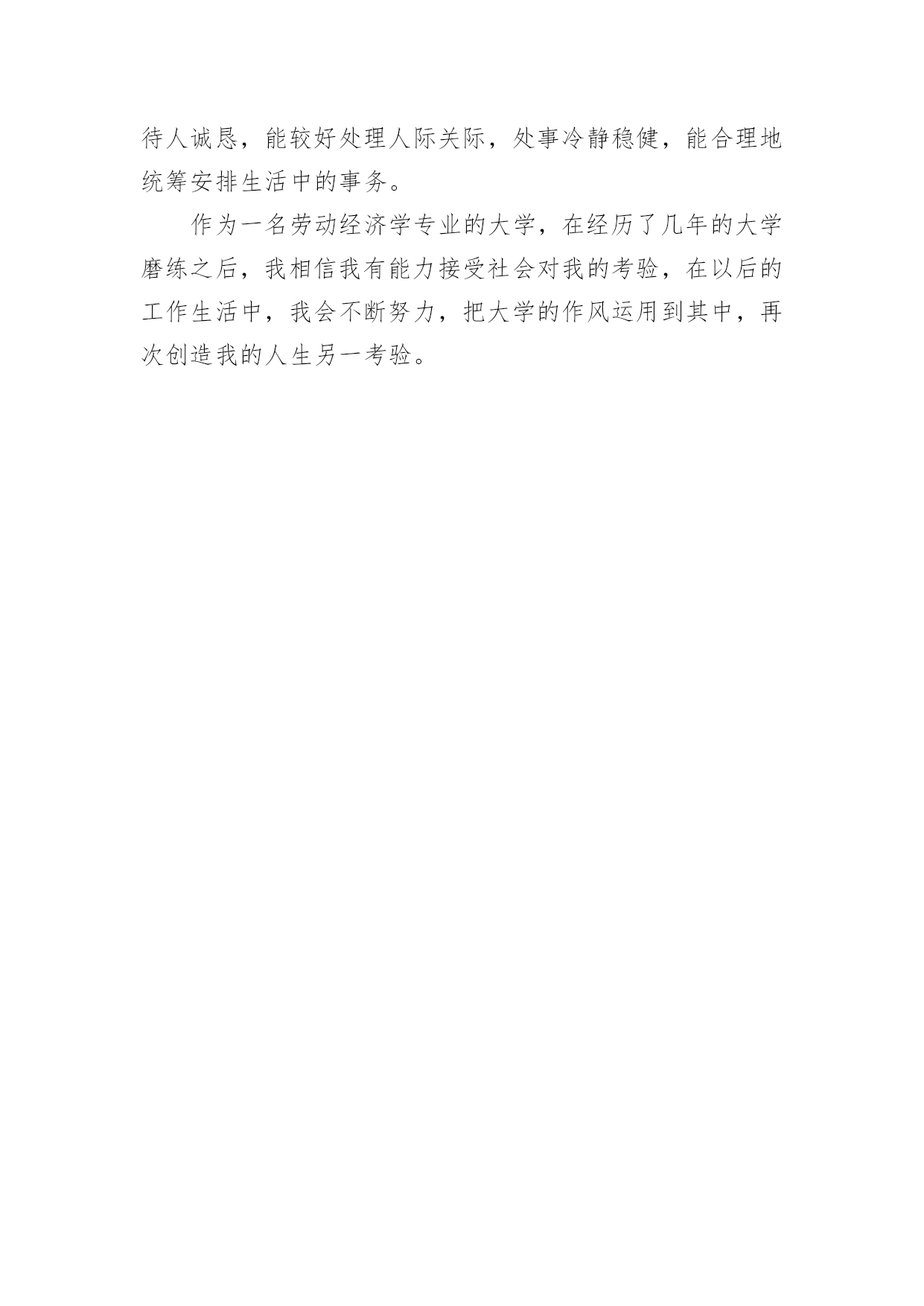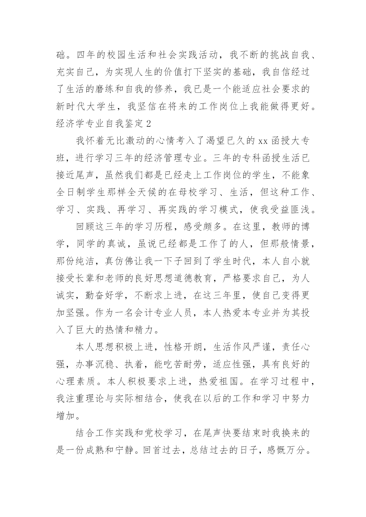 经济学专业自我鉴定经济学专业自我鉴定自我鉴定是个人对一个时期的学习或工作进行自我总结,它可以帮助我们有寻找学习和工作中的规律,因此好好准备一份自我鉴定吧。但是却发现不知道该写些什么,下面是小编收集整理的经济学专业自我鉴定,欢迎阅读,希望大家能够喜欢。经济学专业自我鉴定1本人觉得自己做事认真负责,有较强的工作责任感,做事有始有终;比较能够吃苦耐劳,任劳任怨,不畏艰难也要将工作尽力做好;敢于求实创新,有创新意识和一定的创造能力;爱岗敬业,能和工作伙伴和谐相处,并且有一定的组织协调能力,有较强的团队意识,为了公司的利益共同努力工作;有较强的承受压力的'能力,面对失败和挫折能够较好处理好自己的情绪,自我感觉是一个比较坚强的人;生活上较提倡节俭,热爱参与集体活动,热爱生活。通过四年的大学生活,我学到了很多知识,更重要的是有了较快掌握一种新事物的能力。思想变得成熟了许多,性格更坚毅了。认识了许多老师和同学,建立起友谊,并在与他们的交往中提升了自身素质,认清了自身的一些短处并尽力改正。社会实践能力也有很大提高,为将来走向社会奠定了基础。四年的校园生活和社会实践活动,我不断的挑战自我、充实自己,为实现人生的价值打下坚实的基础,我自信经过了生活的磨练和自我的修养,我已是一个能适应社会要求的新时代大学生,我坚信在将来的工作岗位上我能做得更好。经济学专业自我鉴定2我怀着无比激动的心情考入了渴望已久的xx函授大专班,进行学习三年的经济管理专业。三年的专科函授生活已接近尾声,虽然我们都是已经走上工作岗位的学生,不能象全日制学生那样全天候的在母校学习、生活,但这种工作、学习、实践、再学习、再实践的学习模式,使我受益匪浅。回顾这三年的学习历程,感受颇多。在这里,教师的博学,同学的真诚,虽说已经都是工作了的人,但那般情景,那份纯洁,真仿佛让我一下子回到了学生时代,本人自小就接受长辈和老师的良好思想道德教育,严格要求自己,为人诚实,勤奋好学,不断求上进,在这三年里,使自己变得更加坚强。作为一名会计专业人员,本人热爱本专业并为其投入了巨大的热情和精力。本人思想积极上进,性格开朗,生活作风严谨,责任心强,办事沉稳、执着,能吃苦耐劳,适应性强,具有良好的心理素质。本人积极要求上进,热爱祖国。在学习过程中,我注重理论与实际相结合,使我在以后的工作和学习中努力增加。结合工作实践和党校学习,在尾声快要结束时我换来的是一份成熟和宁静。回首过去,总结过去的日子,感慨万分。学习的三年时光是我作为一名财务人员成长最快的日子,毕业之际,回首往事,我觉得我的所学还很有限,我必须认识到自己的.不足之处。人的一生就在于取长补短,不断创新,为自己的不足而汗颜,为自己的认识而激动,为自己的将来而充满信心!我相信,经过自己的勤奋和努力,一定能使我在将来的工作中实现自己的人生价值,为社会、为国家贡献自己的力。经济学专业自我鉴定3大学的四年生活结束了,回忆过去种种,有欢笑,有悲伤,有成功,当然也有失败,但我始终以提高自身的综合素质为目标,以自我的全面发展为努力方向,树立了正确的人生观,价值观和世界观,但更多的是在这期间我学到了许多书本上学不到的知识,修养和能力。在学习上,为珍惜这学校所给的学习机会,用从未有过的拼搏的精神学习应用经济学专业,还利用课余时间学习一些网络和办公软件来充实自己,并在学校得到了肯定,获得学校的奖学金,我相信自己在以后理论与实际相结合中,能有更大的进步提高。在思想品德上,我有坚定的'政治方向,积极向党组织靠拢,使我对我们党有更为深刻的认识。并用真诚的热心经常参加学校组织的志愿者活动,去关心和帮助他人。在生活和工作中,我对班级和学生会工作热情,任劳任怨,责任心强,对人友善,注重配合其他学生干部出色的完成各项工作,得到了大家的一致肯定。现在我拥有年轻和知识,我可以用热情和活力,自信和学识来克服毕业后生活和工作中的各种困难,用自己的学习能力和分析处理问题的协调,管理能力去完成今后的美丽人生!经济学专业自我鉴定4在思想政治方面,本人具有优秀道德修养,并有坚定的政治方向。我热爱祖国,热爱人民,坚决拥护中国共产党领导和社会主义制度,不断提高自己的政治觉悟和道德修养,严格遵守国家宪法及其它各项法律规定。同时我遵守社会公德,爱护公共财产,团结同学,乐于助人,并以务实求真的精神热心参与学校的公益宣传和爱国主义活动。在专业学习方面,我学习的是商务经济学专业。本专业培养德、智、体全面发展的能够胜任外向型经济工作和适应国际竞争的专门人才。通过四年学习,我学习了微观经济学、宏观经济学、市场营销、国际贸易、国际金融、国际贸易实务、国际结算、外贸英语函电、电子商务、会计学、财政与税收等专业课程。其中四门学位课程以优异的成绩通过,同时顺利通过国家英语四级考试,学业平均成绩超过75分即将取得东南大学学士学