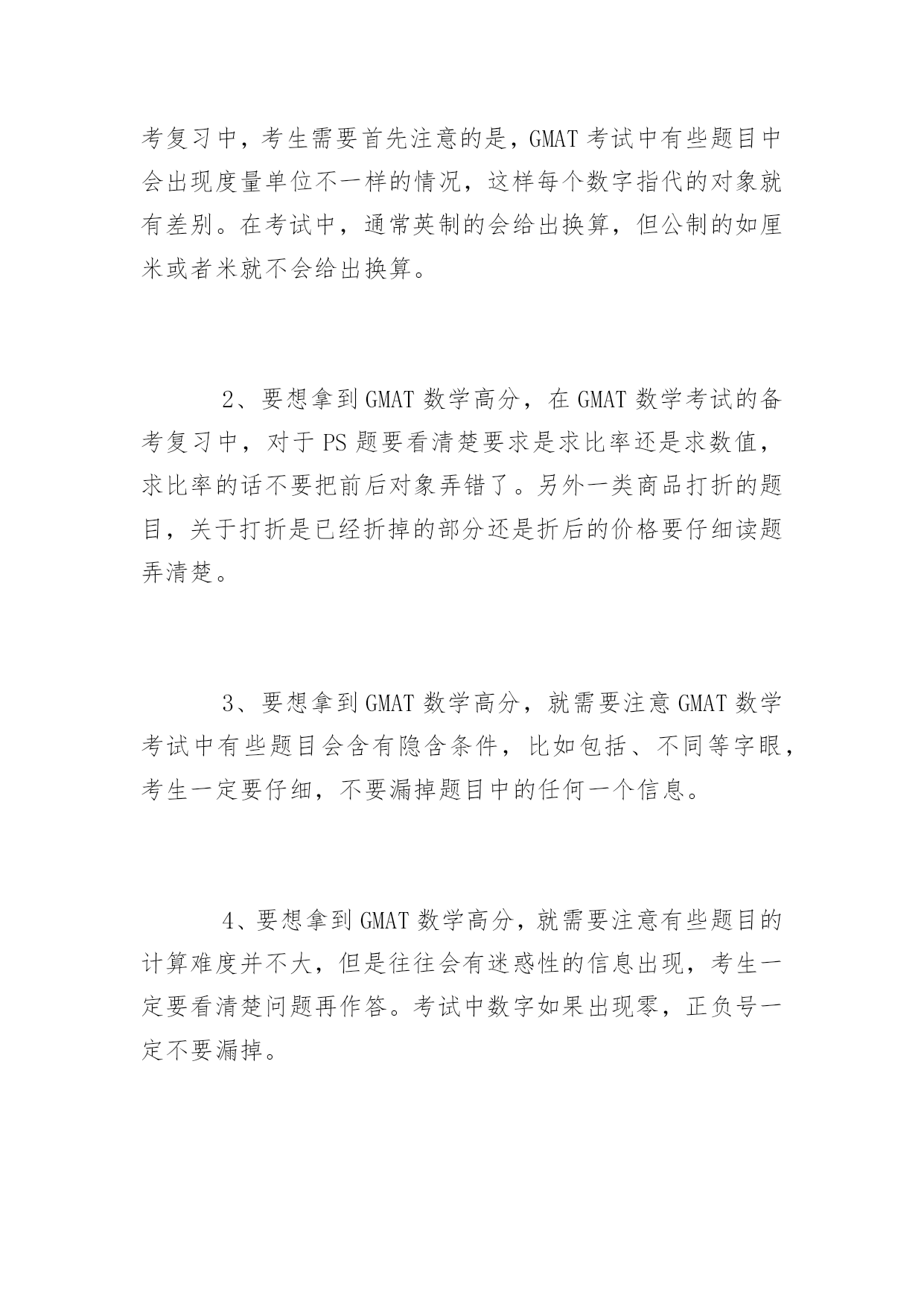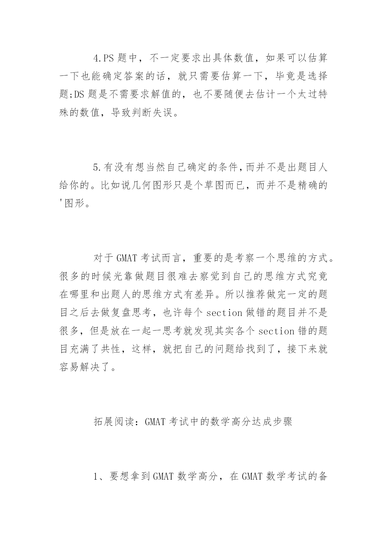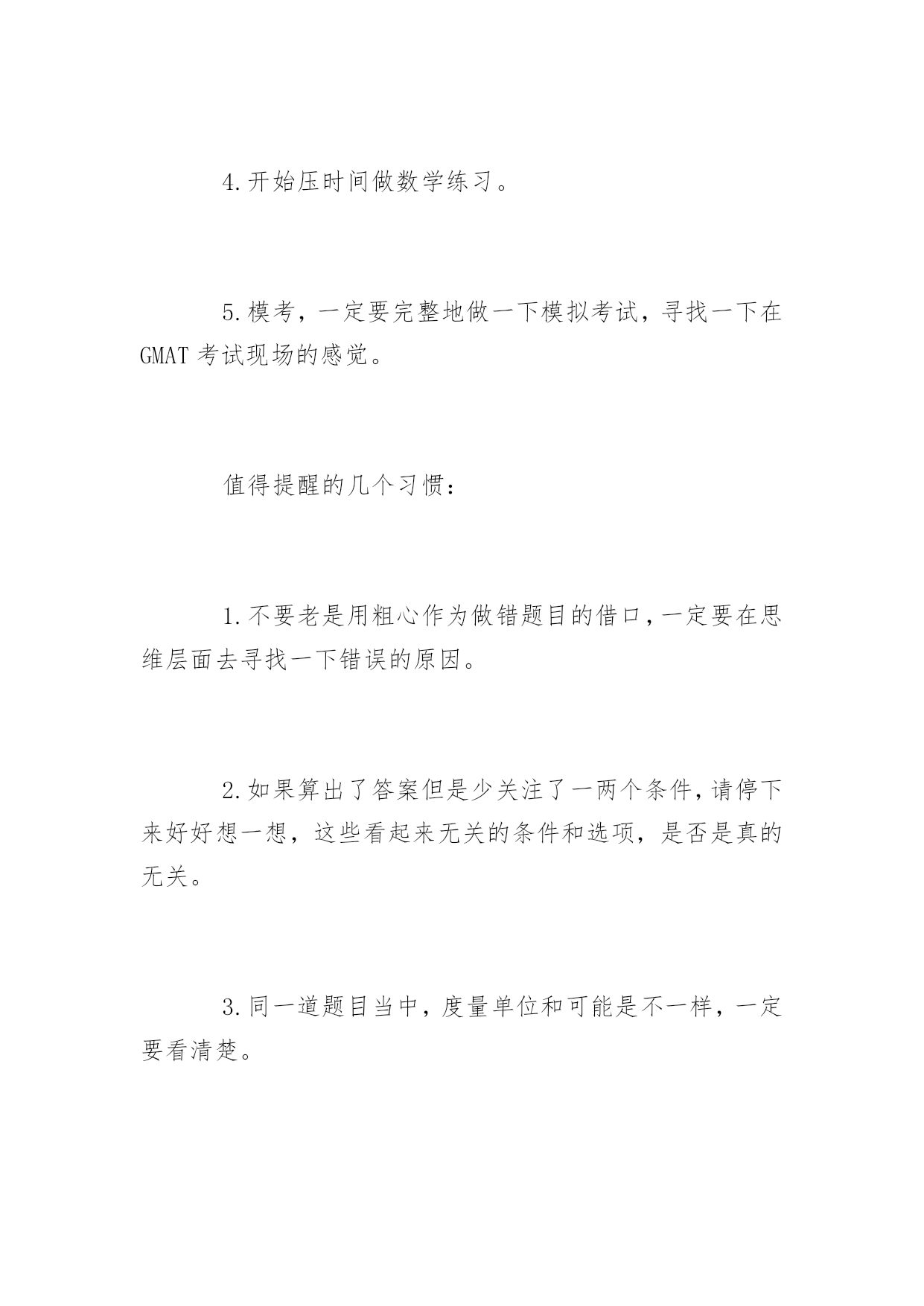 浅谈GMAT考试的数学复习浅谈GMAT考试的数学复习在本文中小编要和大家一起来谈谈GMAT考试中数学复习的方法和注意事项,希望可以帮助到大家。总体复习步骤:1.先花一定的时间复习熟悉GMAT数学的术语,保证不会因为看不懂或理解错了题目而把题目做错了。2.花一点时间,做一定量的题目,亲身体会一下GMAT数学题的命题特点。3.如果难题有一些困难,这个阶段用一些参考资料,学习一下前人的总结。当然,这个阶段不要占用复习中的大量时间。毕竟考试分数中的部分,并不是这些偏难怪题。4.开始压时间做数学练习。5.模考,一定要完整地做一下模拟考试,寻找一下在GMAT考试现场的感觉。值得提醒的几个习惯:1.不要老是用粗心作为做错题目的借口,一定要在思维层面去寻找一下错误的原因。2.如果算出了答案但是少关注了一两个条件,请停下来好好想一想,这些看起来无关的条件和选项,是否是真的无关。3.同一道题目当中,度量单位和可能是不一样,一定要看清楚。4.PS题中,不一定要求出具体数值,如果可以估算一下也能确定答案的话,就只需要估算一下,毕竟是选择题;DS题是不需要求解值的,也不要随便去估计一个太过特殊的数值,导致判断失误。5.有没有想当然自己确定的条件,而并不是出题目人给你的。比如说几何图形只是个草图而已,而并不是精确的'图形。对于GMAT考试而言,重要的是考察一个思维的方式。很多的时候光靠做题目很难去察觉到自己的思维方式究竟在哪里和出题人的思维方式有差异。所以推荐做完一定的题目之后去做复盘思考,也许每个section做错的题目并不是很多,但是放在一起一思考就发现其实各个section错的题目充满了共性,这样,就把自己的问题给找到了,接下来就容易解决了。拓展阅读:GMAT考试中的数学高分达成步骤1、要想拿到GMAT数学高分,在GMAT数学考试的备考复习中,考生需要首先注意的是,GMAT考试中有些题目中会出现度量单位不一样的情况,这样每个数字指代的对象就有差别。在考试中,通常英制的会给出换算,但公制的如厘米或者米就不会给出换算。2、要想拿到GMAT数学高分,在GMAT数学考试的备考复习中,对于PS题要看清楚要求是求比率还是求数值,求比率的话不要把前后对象弄错了。另外一类商品打折的题目,关于打折是已经折掉的部分还是折后的价格要仔细读题弄清楚。3、要想拿到GMAT数学高分,就需要注意GMAT数学考试中有些题目会含有隐含条件,比如包括、不同等字眼,考生一定要仔细,不要漏掉题目中的任何一个信息。4、要想拿到GMAT数学高分,就需要注意有些题目的计算难度并不大,但是往往会有迷惑性的信息出现,考生一定要看清楚问题再作答。考试中数字如果出现零,正负号一定不要漏掉。5、要想拿到GMAT数学高分,就需要注意GMAT考试中有些题目需要用到平时的常识,比如树的影子的题目就是用到相似三角形,实际问题中的人员分配、汽车数量都不会出现分数,所以要答出整数解。6、要想拿到GMAT数学高分,就需要注意有一些GMAT数学题目要求比取值范围的大小,在解答时一定要考虑-1、0、1分开的这些区间,不能只把0作为分界点来考虑,那样很不全面,因为很多都是分数的。7、要想拿到GMAT数学高分,就需要注意有些题目会涉及到关于整数条件的给出,对于这类题目,考生千万不要想当然得自己为题目添加条件。在解答题目时一定要仔细看清楚,题目中是否提到了整数,如果题目中没有提到整数,一定不要妄自断定这就是整数,即使给出的条件也是整数,一定要按照题目的要求进行作答。8、要想拿到GMAT数学高分,就需要注意在准备按CONFIRM键的时候一定要再审视一下自己刚才做过的题目,有时会发现一些明显的错误。上述八点就是小编总结的GMAT数学高分达成经验。GMAT数学题难度较低,但要想在GMAT考试中拿到高分却也并不容易。狮子搏兔还尽全力,考生在面对简单的GMAT数学也需尽力复习,这样才能保证考生拿到高分。